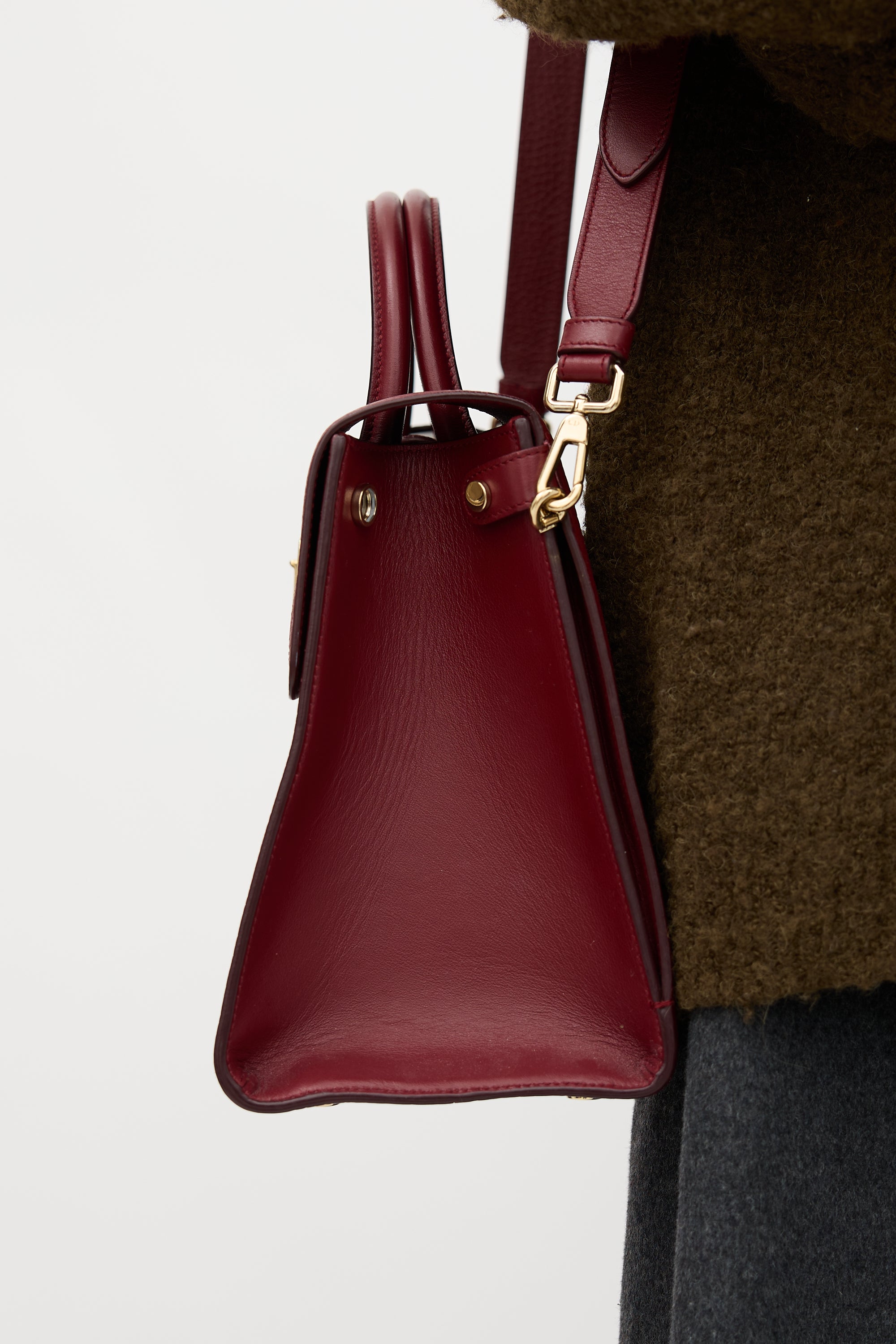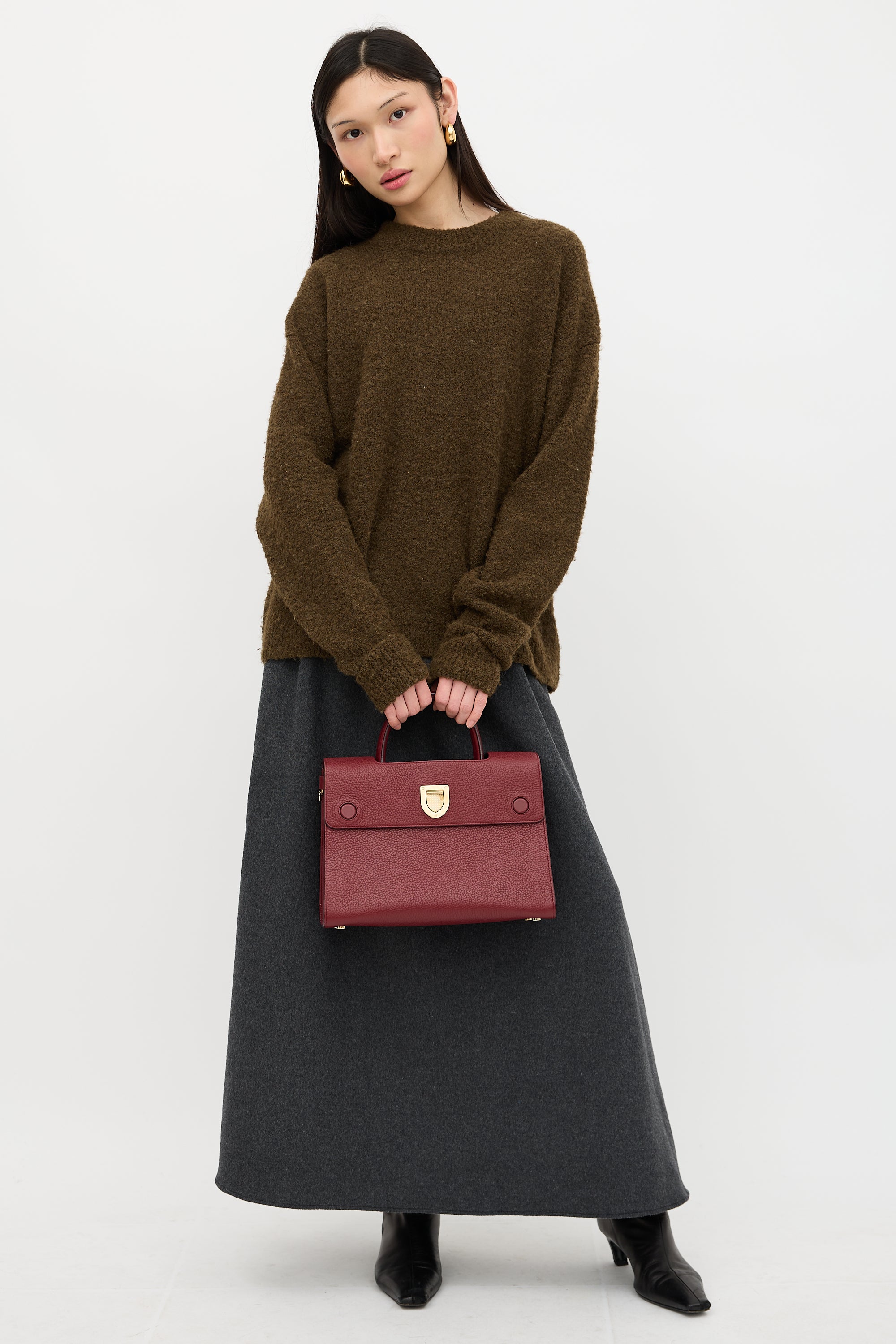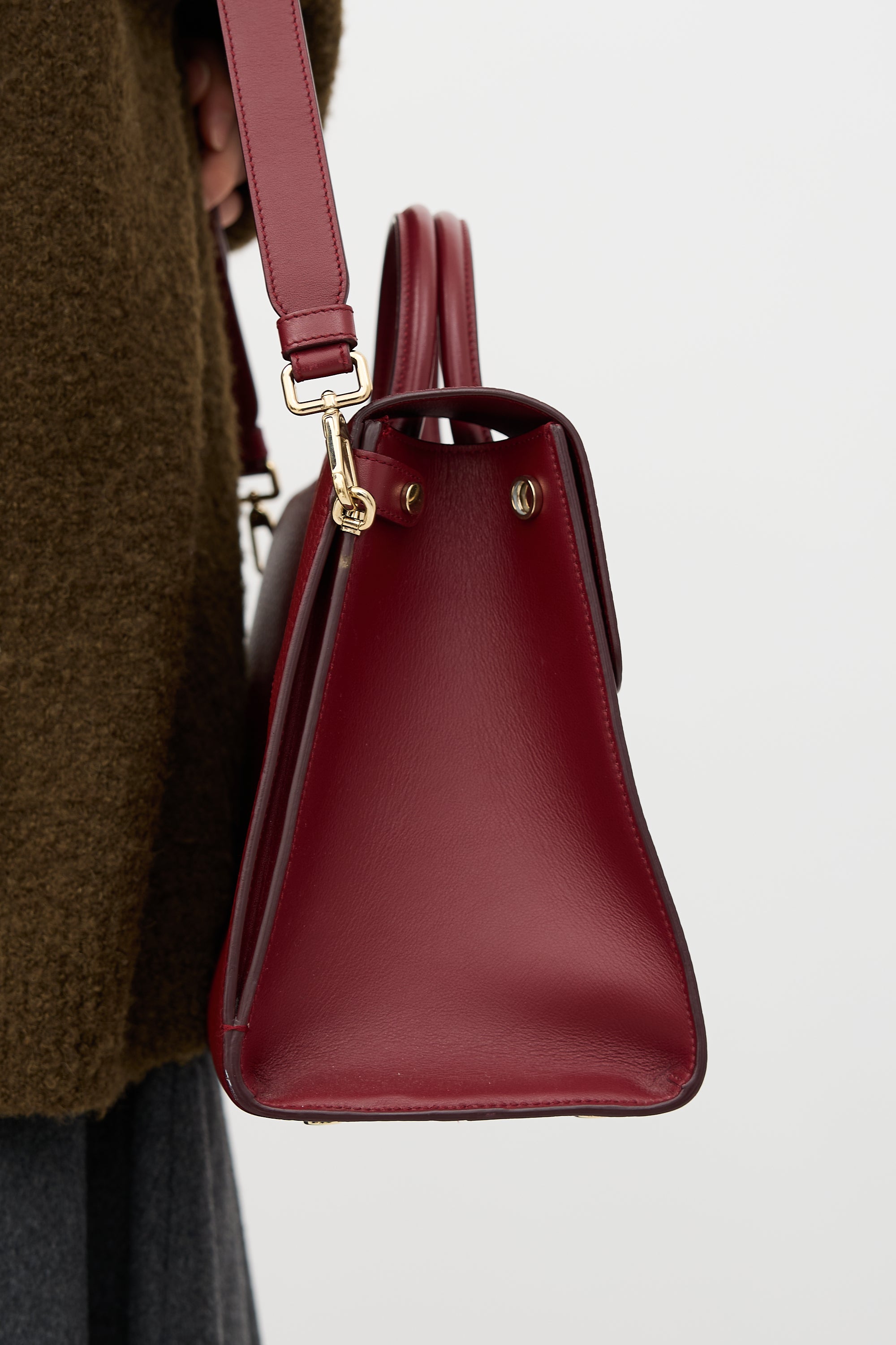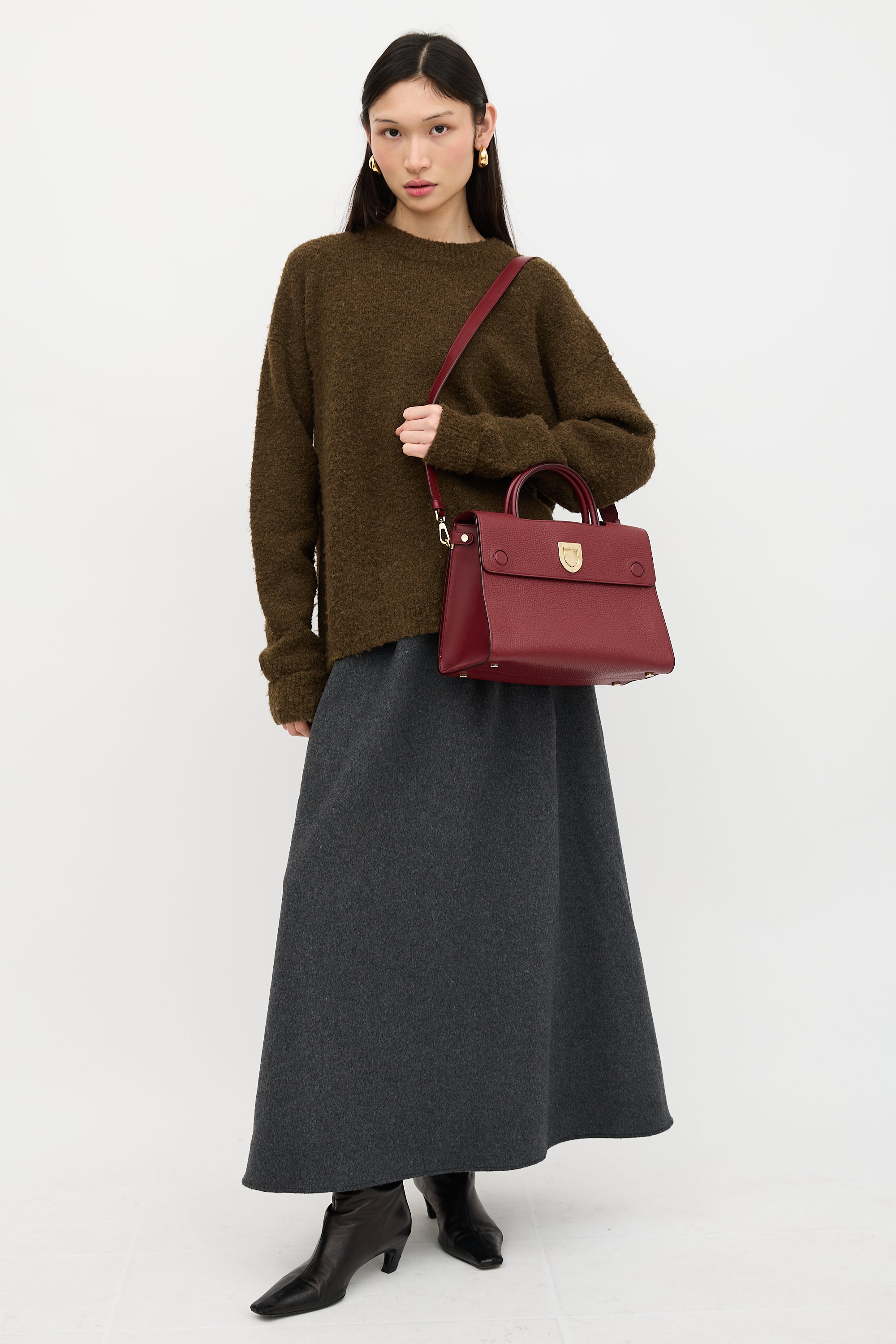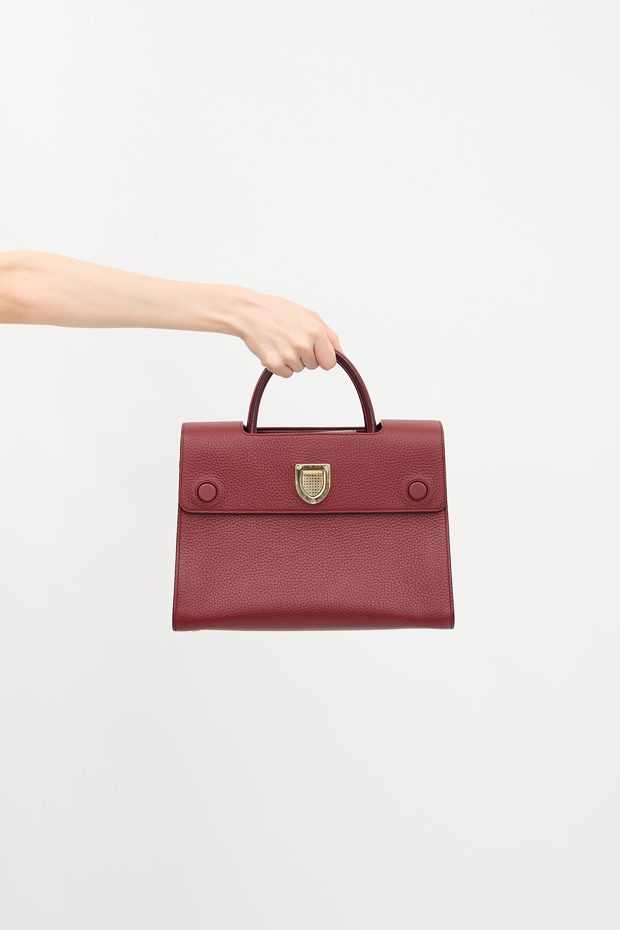 Pre-owned Dior burgundy pebbled leather Diorever bag featuring gold tone hardware, dual rolled top handles, front flap with cutout top and magnetic closures, debossed logo hardware at front face, detachable and adjustable shoulder strap, four feet at face, interior flap, and one main compartment with three slip pockets.