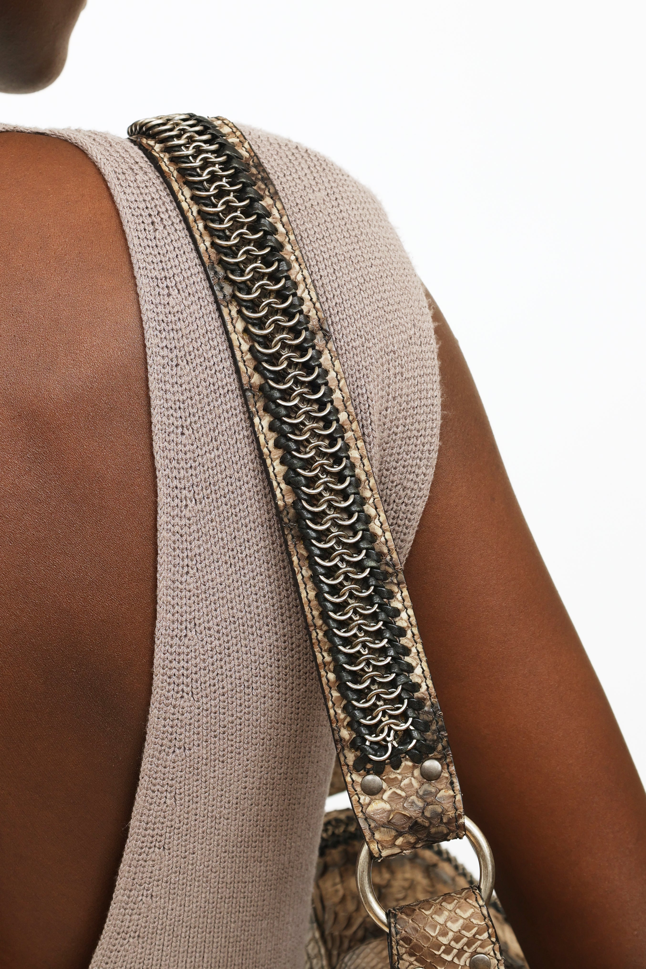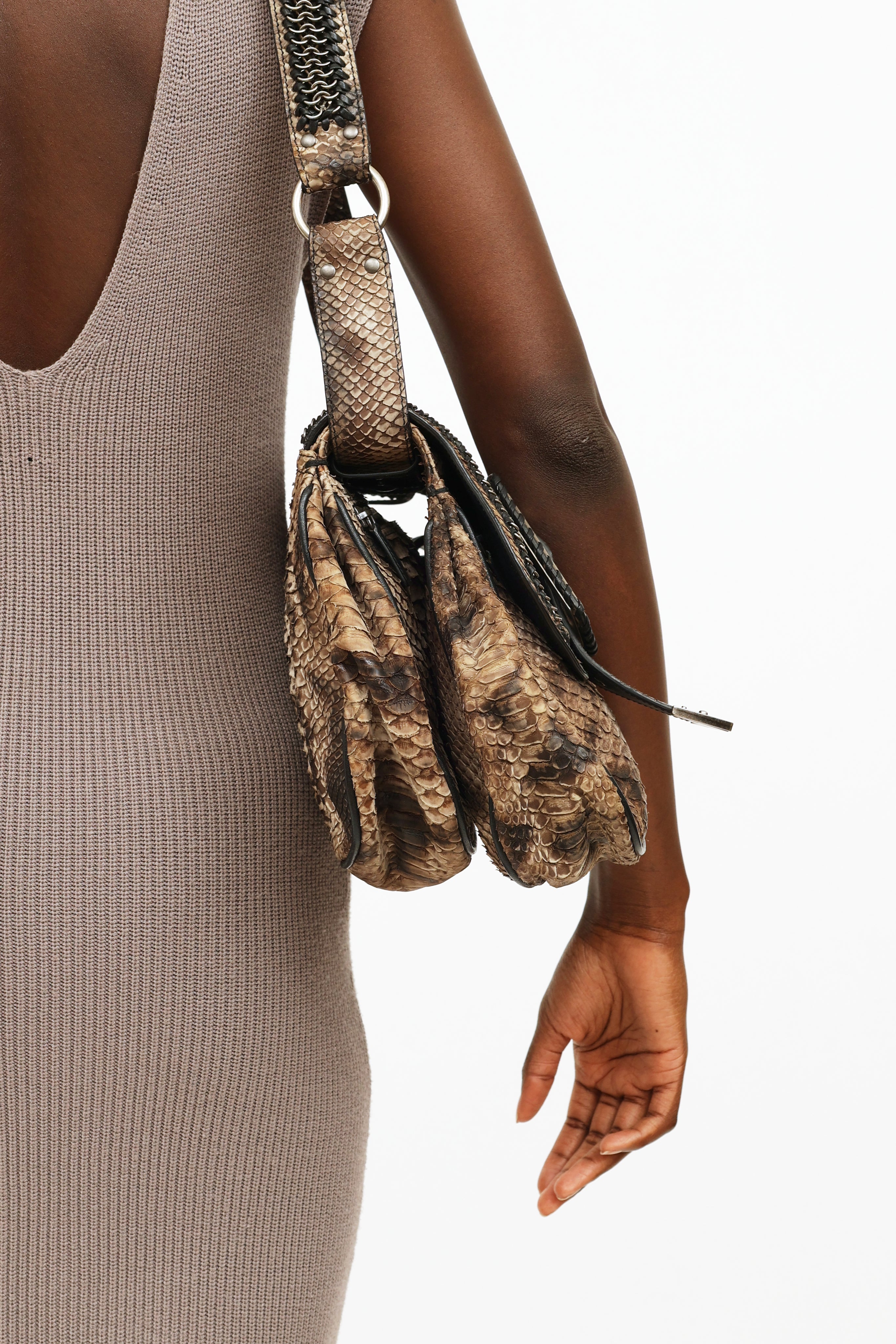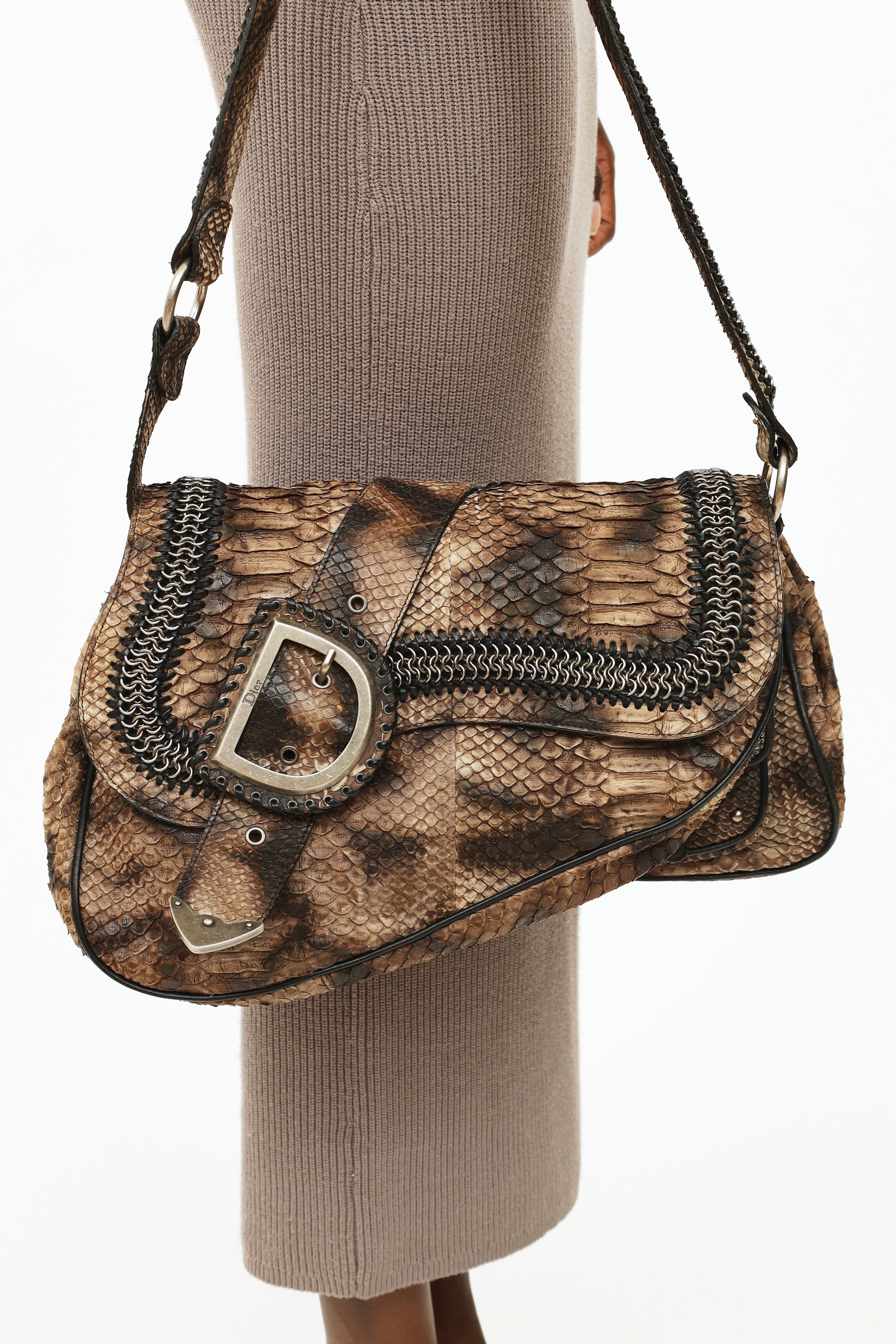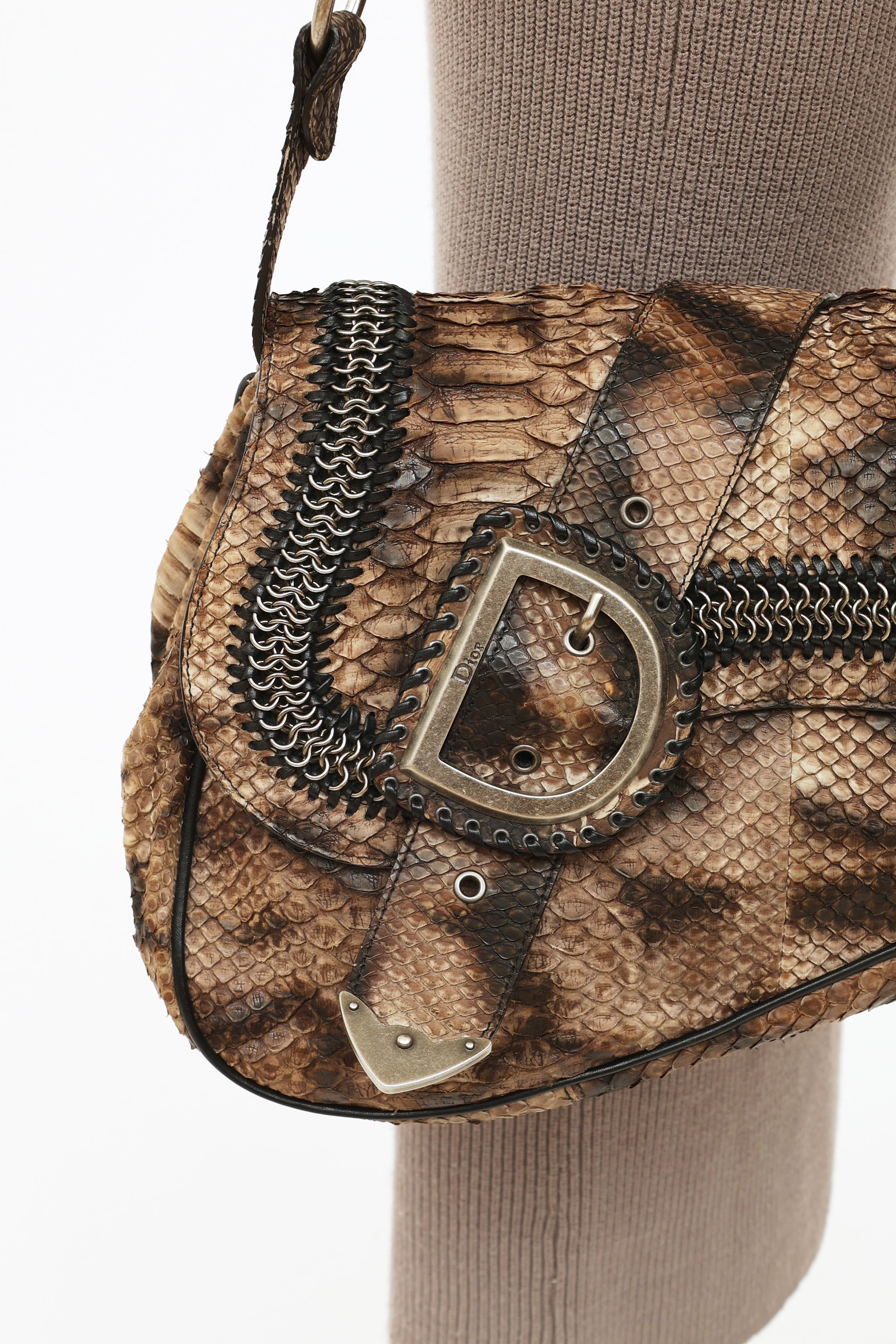Pre-owned Dior embossed and printed gaucho double saddle bag featuring brown and taupe embossed exterior, fold-over saddle flap with leather and metal chainmail trim, faux "D" tang buckle with magnetic snap button closure, zipped pocket, secondary fold-over flap with zipped pocket compartment, cell phone pocket with snap button closure, adjustable shoulder strap with additional chainmail trim and gunmetal hardware.