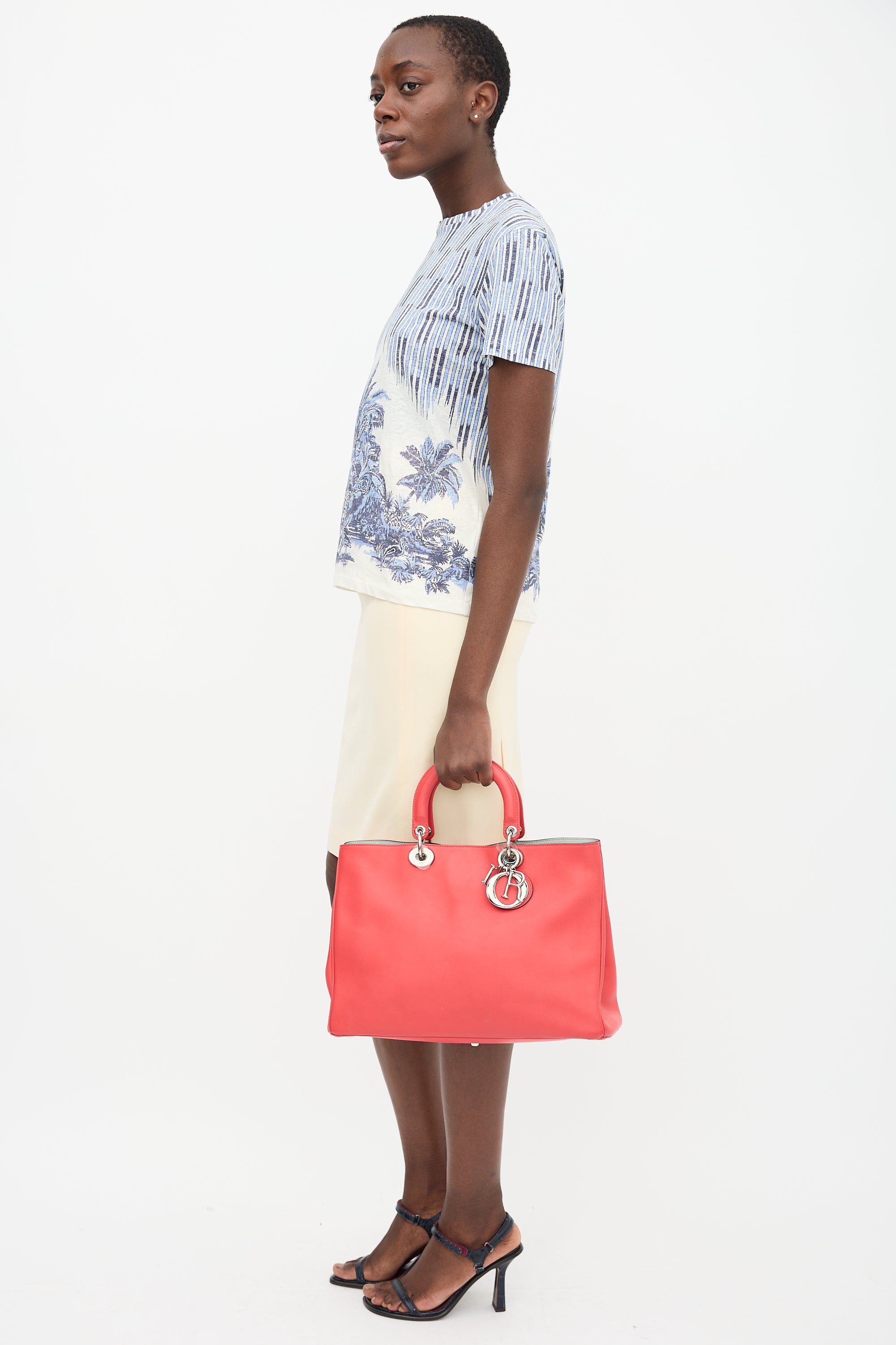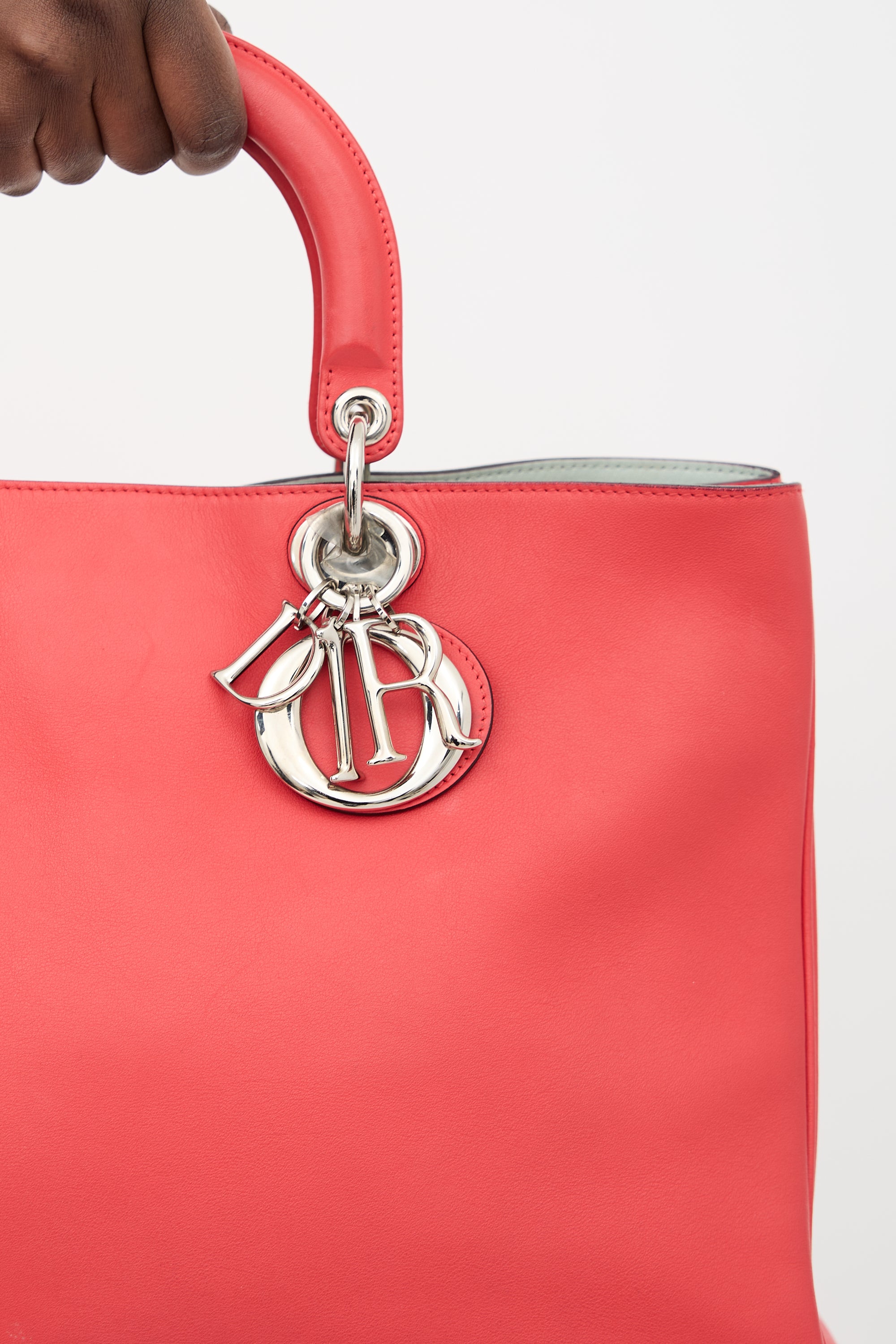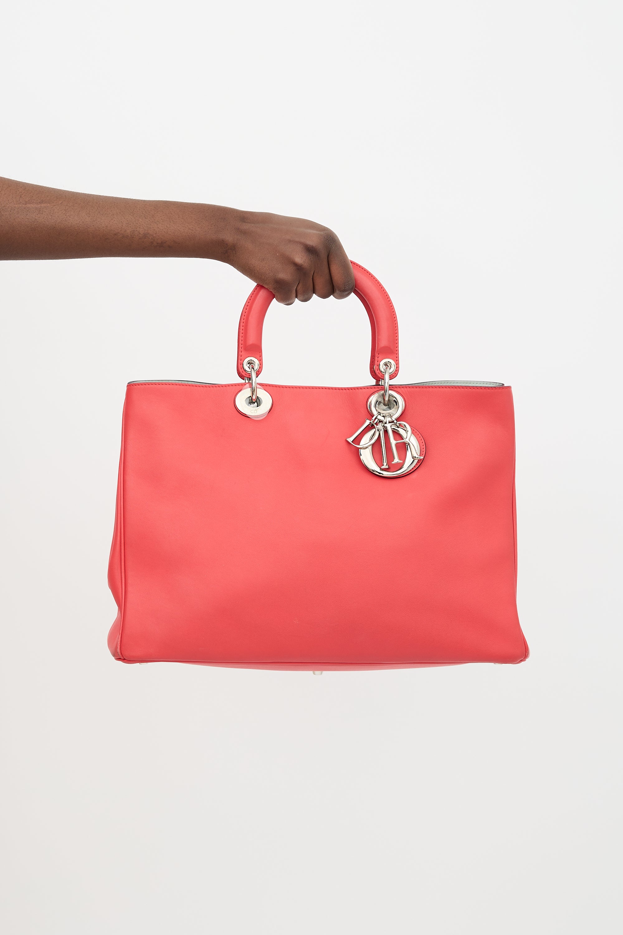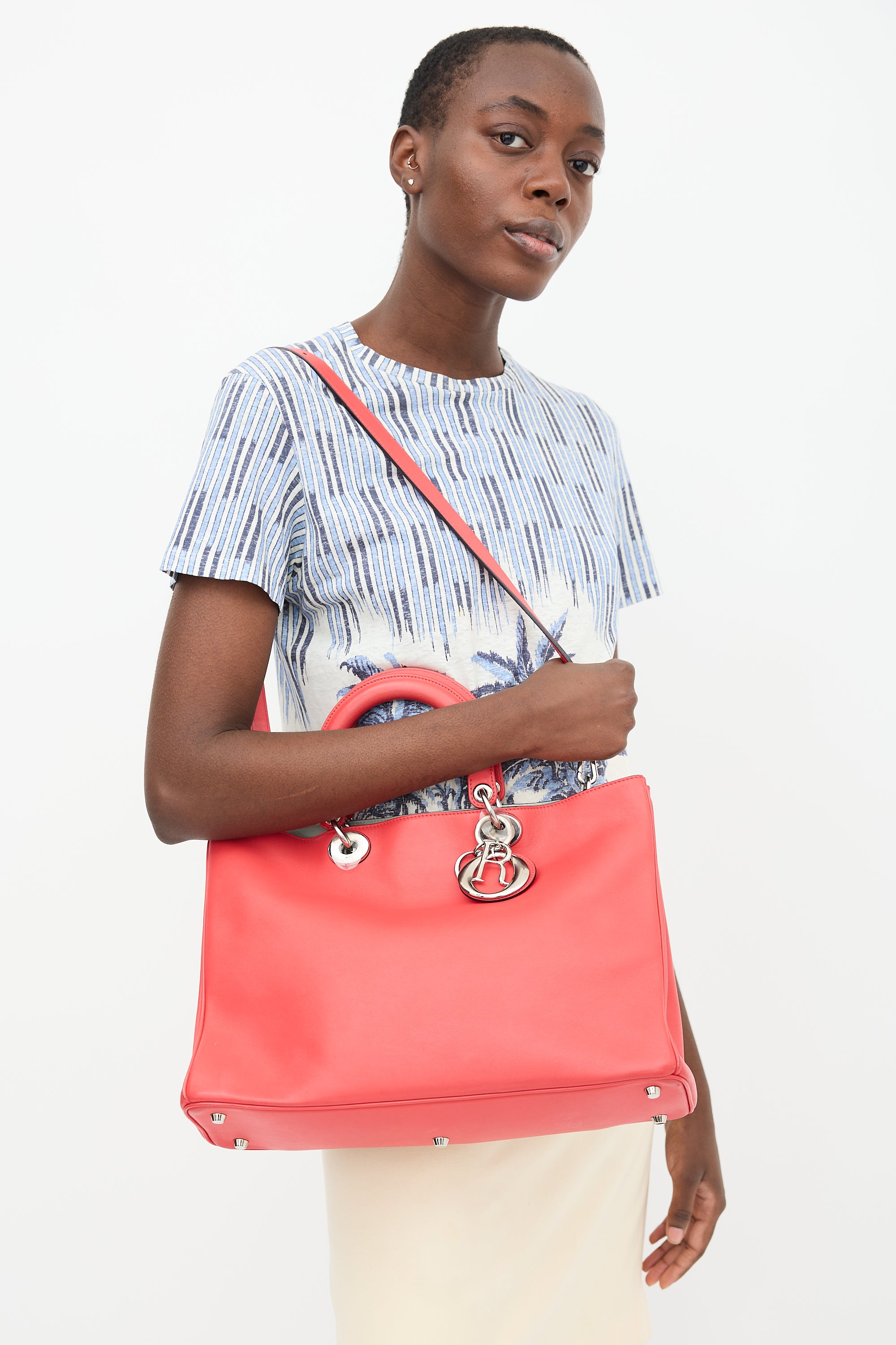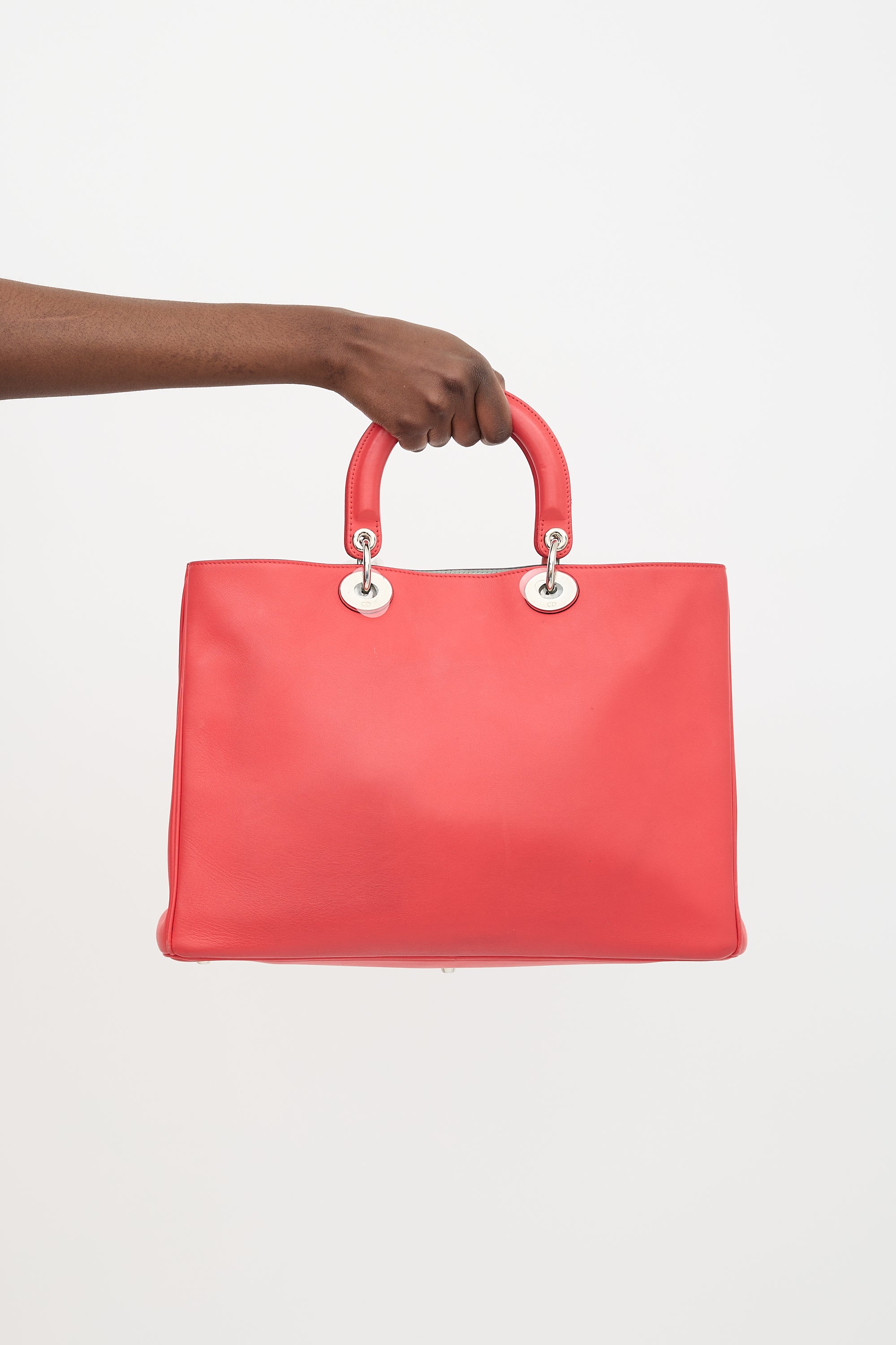 Pre-owned Dior red leather Large Diorissimo bag featuring silver tone hardware, five protective feet at base, dual flat top handles, adjustable sides with snap button fastenings, "D.I.O.R." charms at handle, detachable and adjustable shoulder strap, top magnetic snap closure, and one main compartment with two slip pockets and detachable zip pouch.