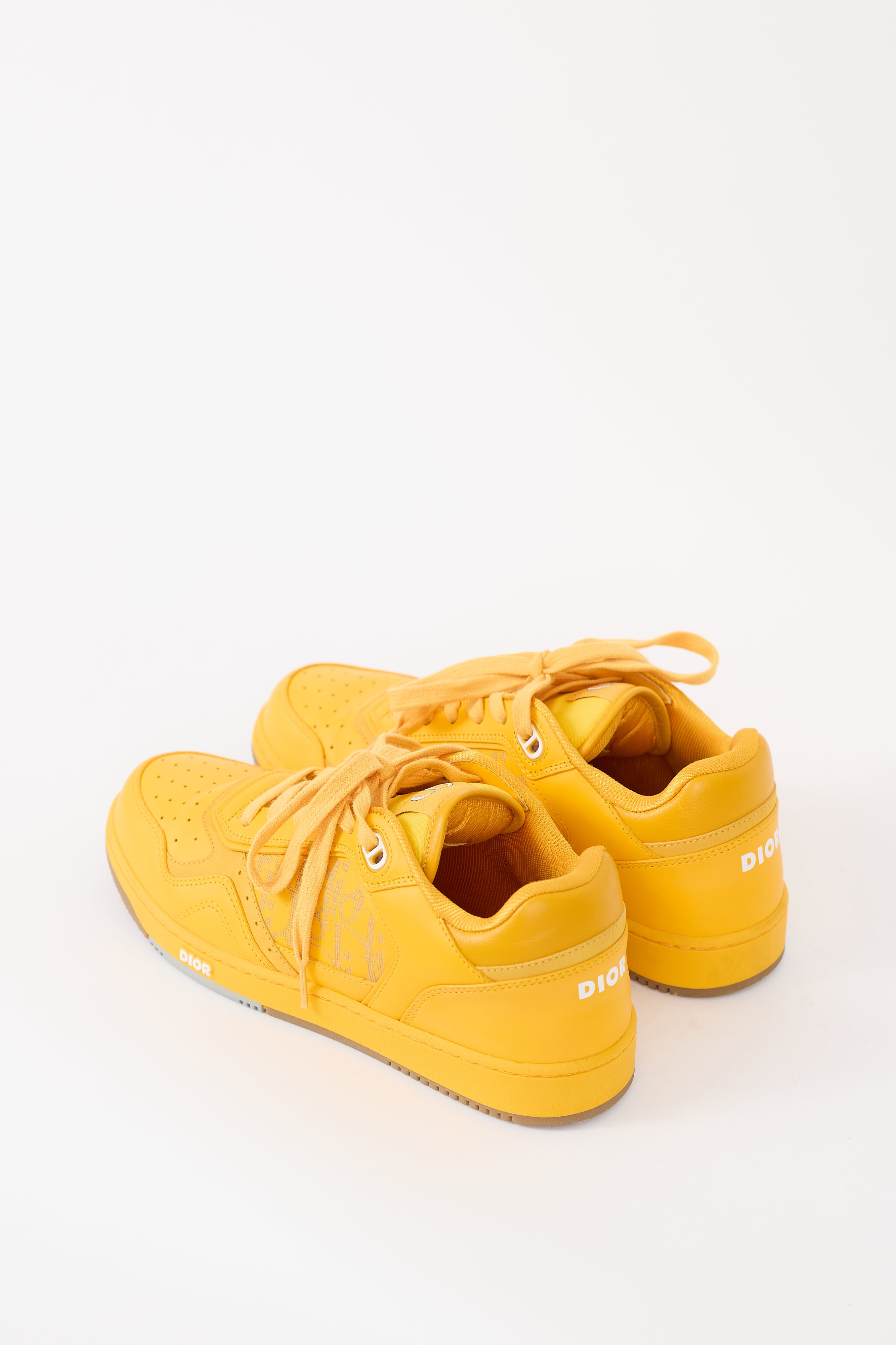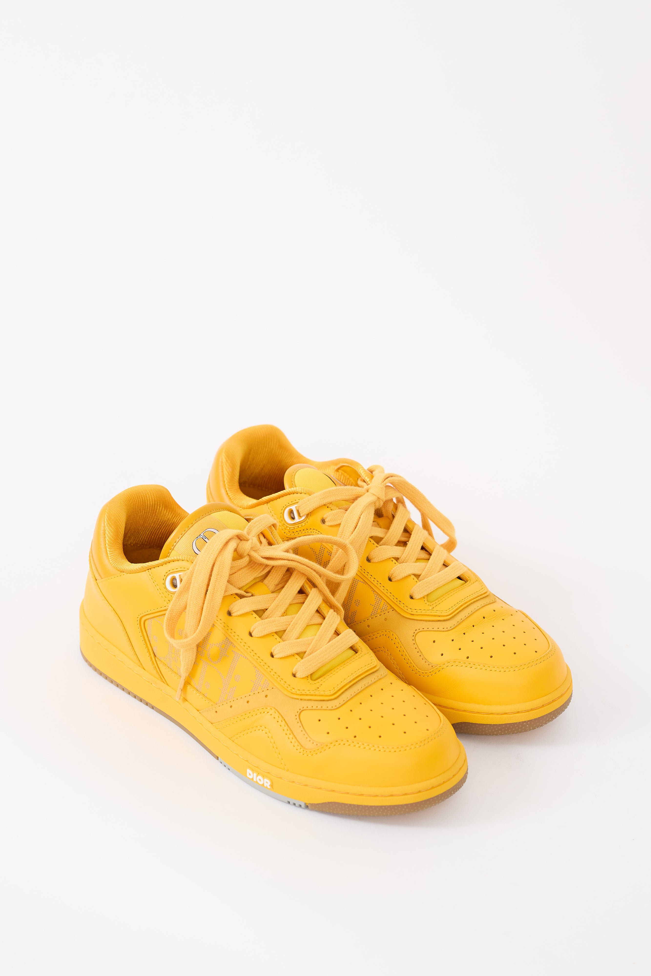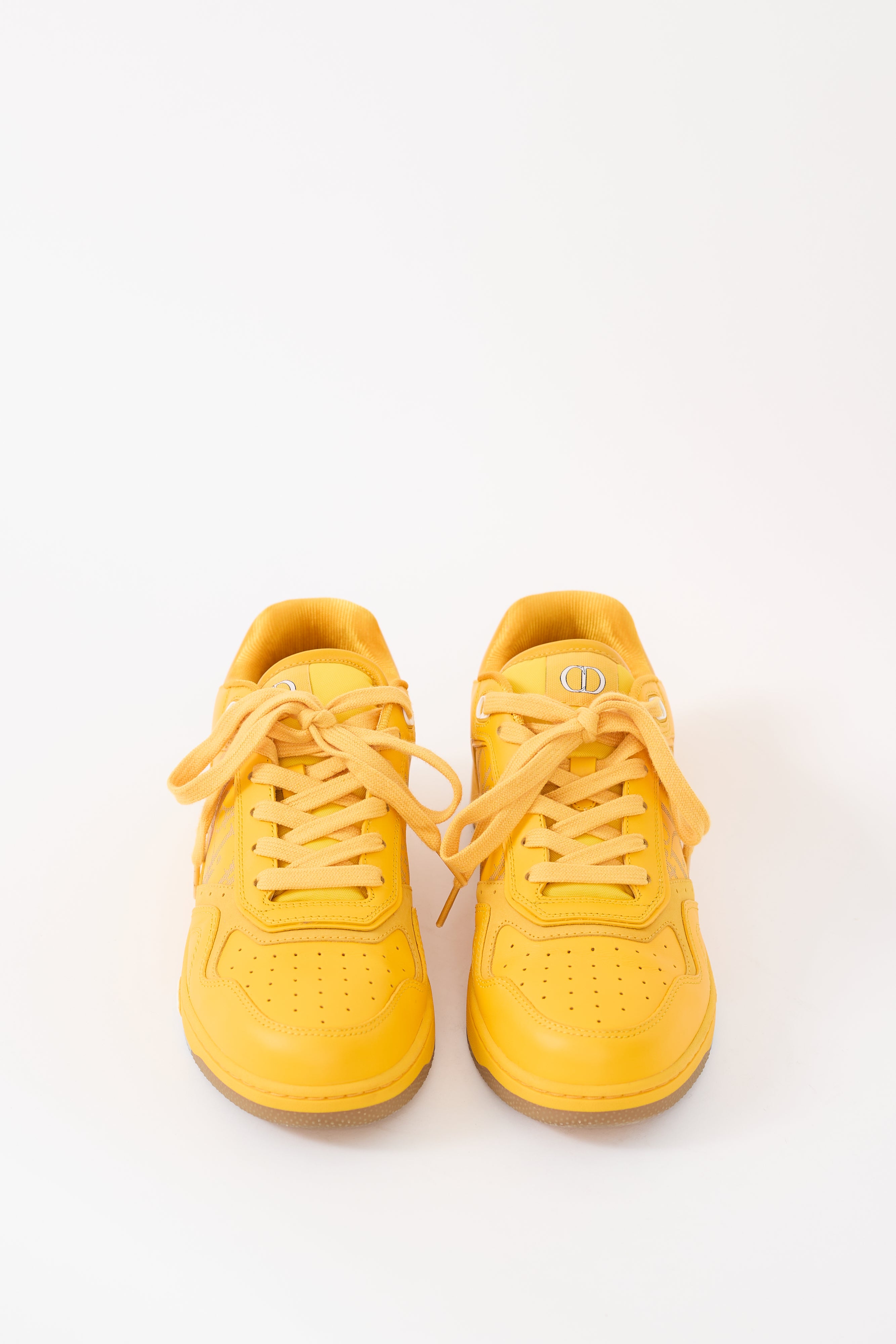Pre-owned Dior yellow leather B27 World Tour sneakers featuring rounded toe, lace up front, Dior Oblique Galaxy monogram at sides, CD logo tab at tongue, and white rubberized logo at outer midsole and back of heel. Comes with extra set of laces and dust bag.
