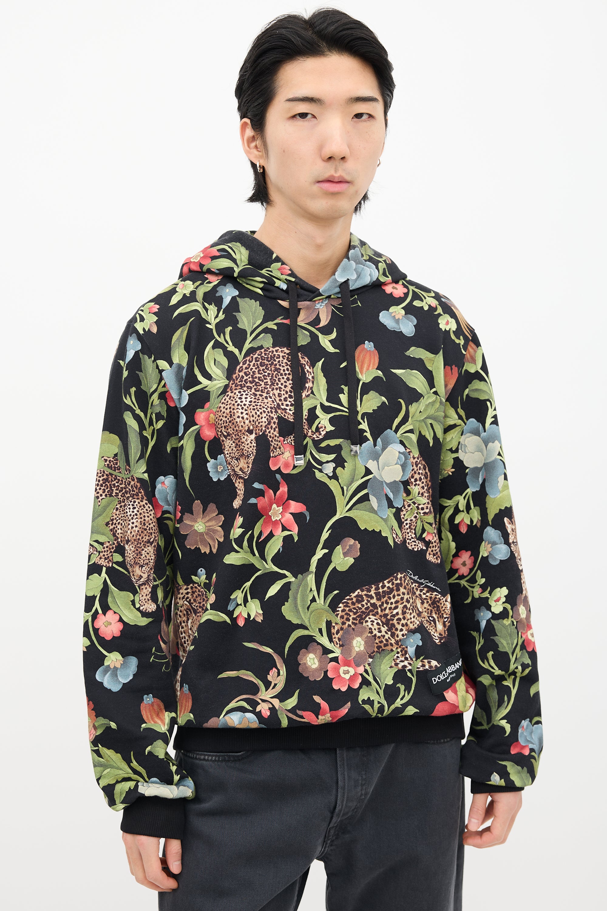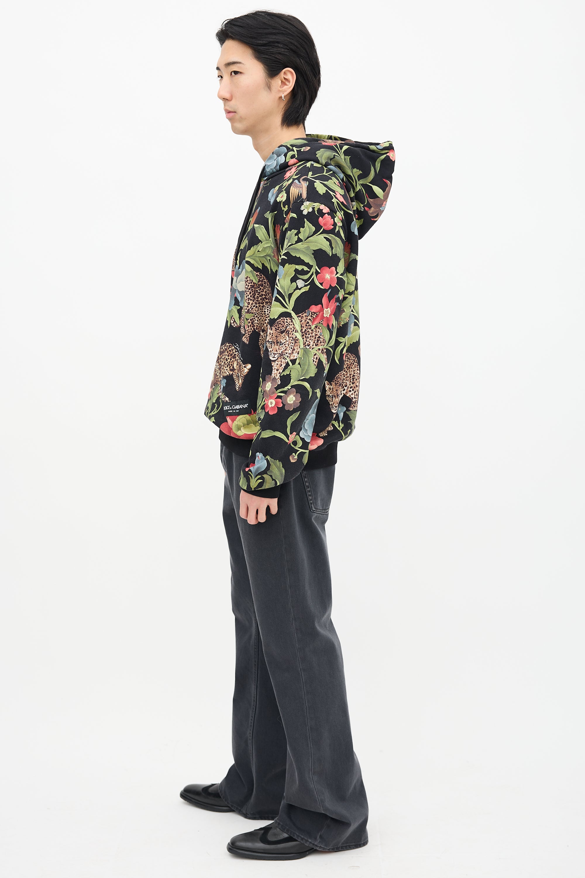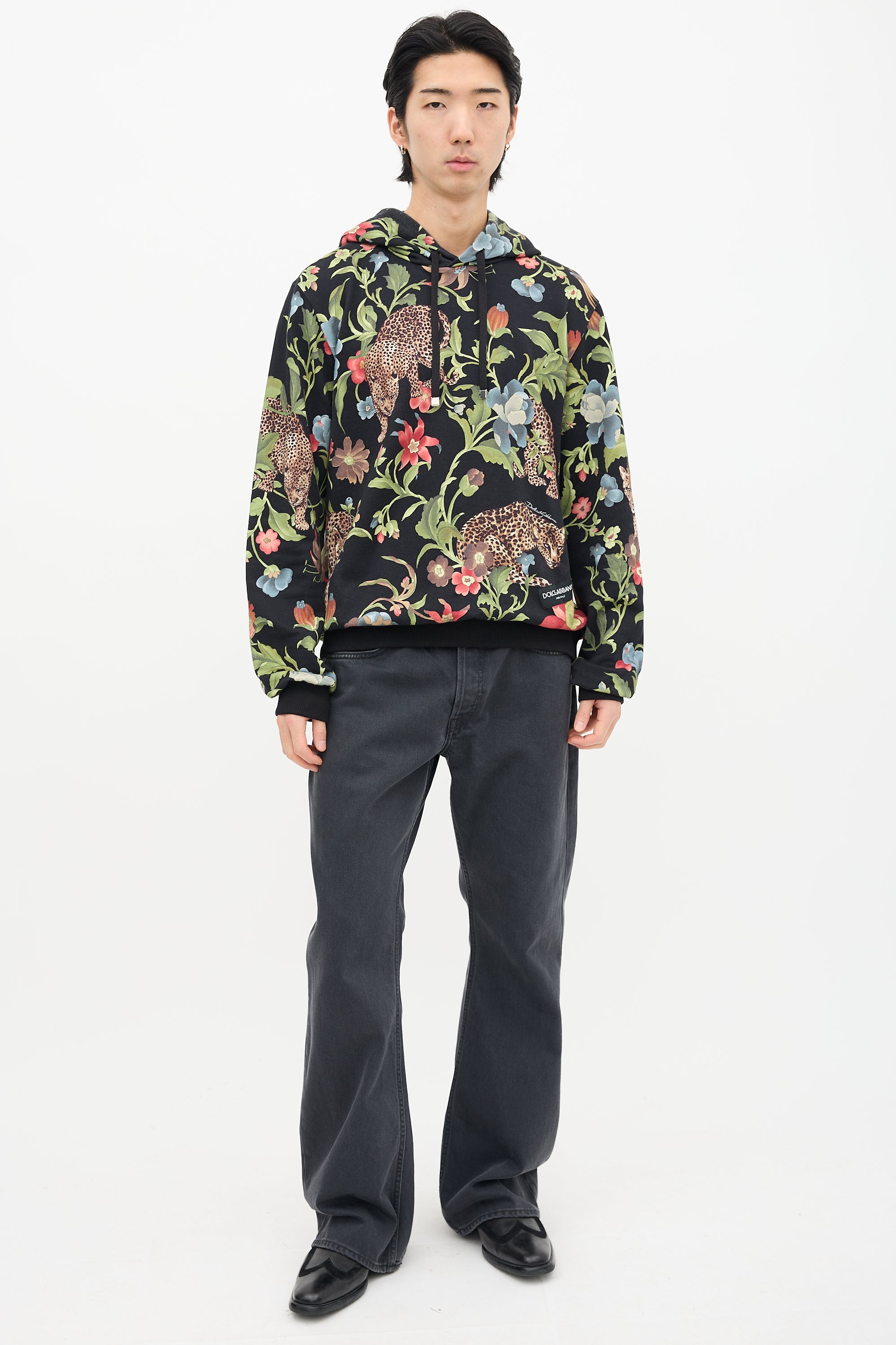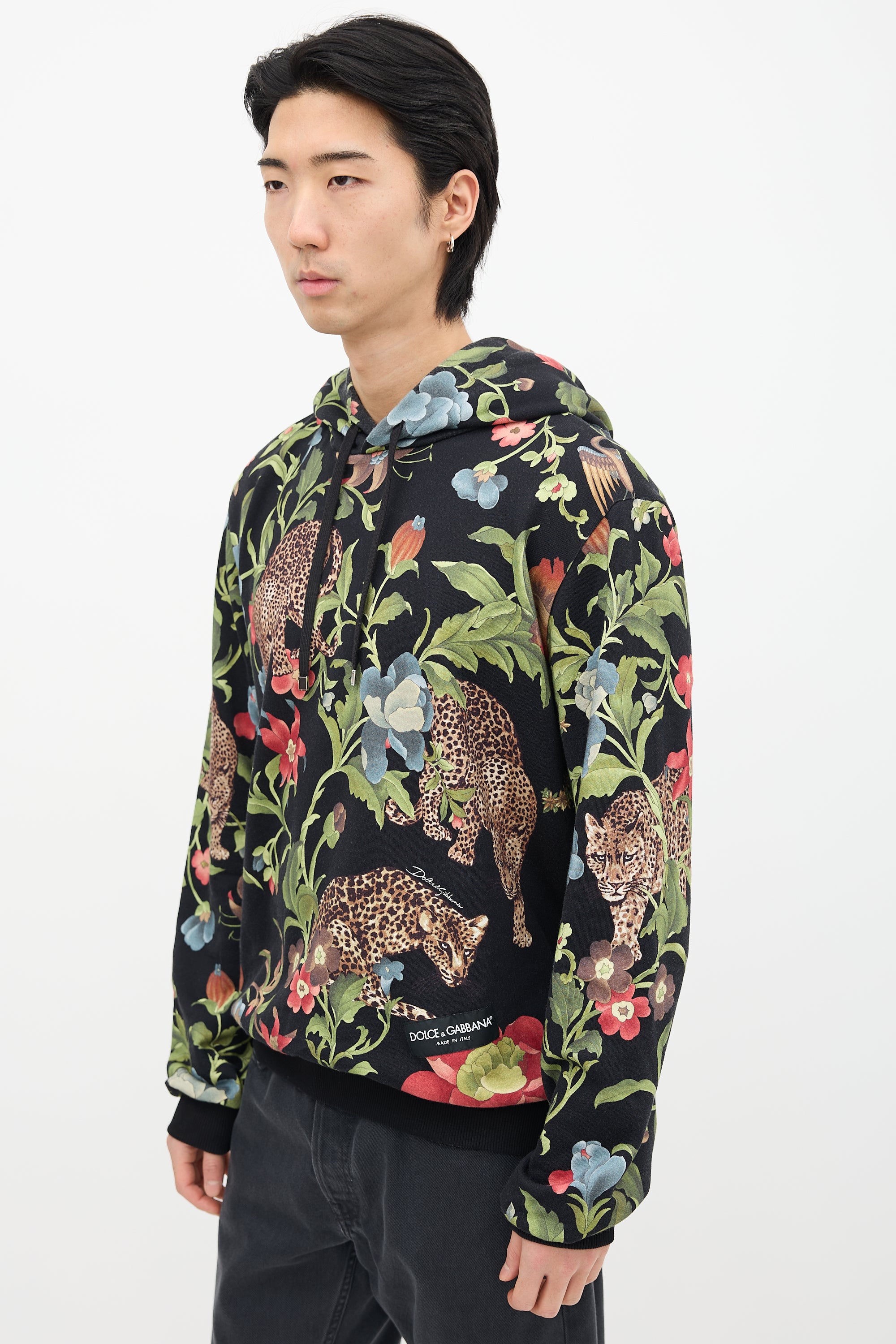 Pre-owned Dolce & Gabbana black hoodie featuring multicolour floral and jaguar motif print, drawstring hood, logo tab at left hem, and ribbed hem and cuffs.