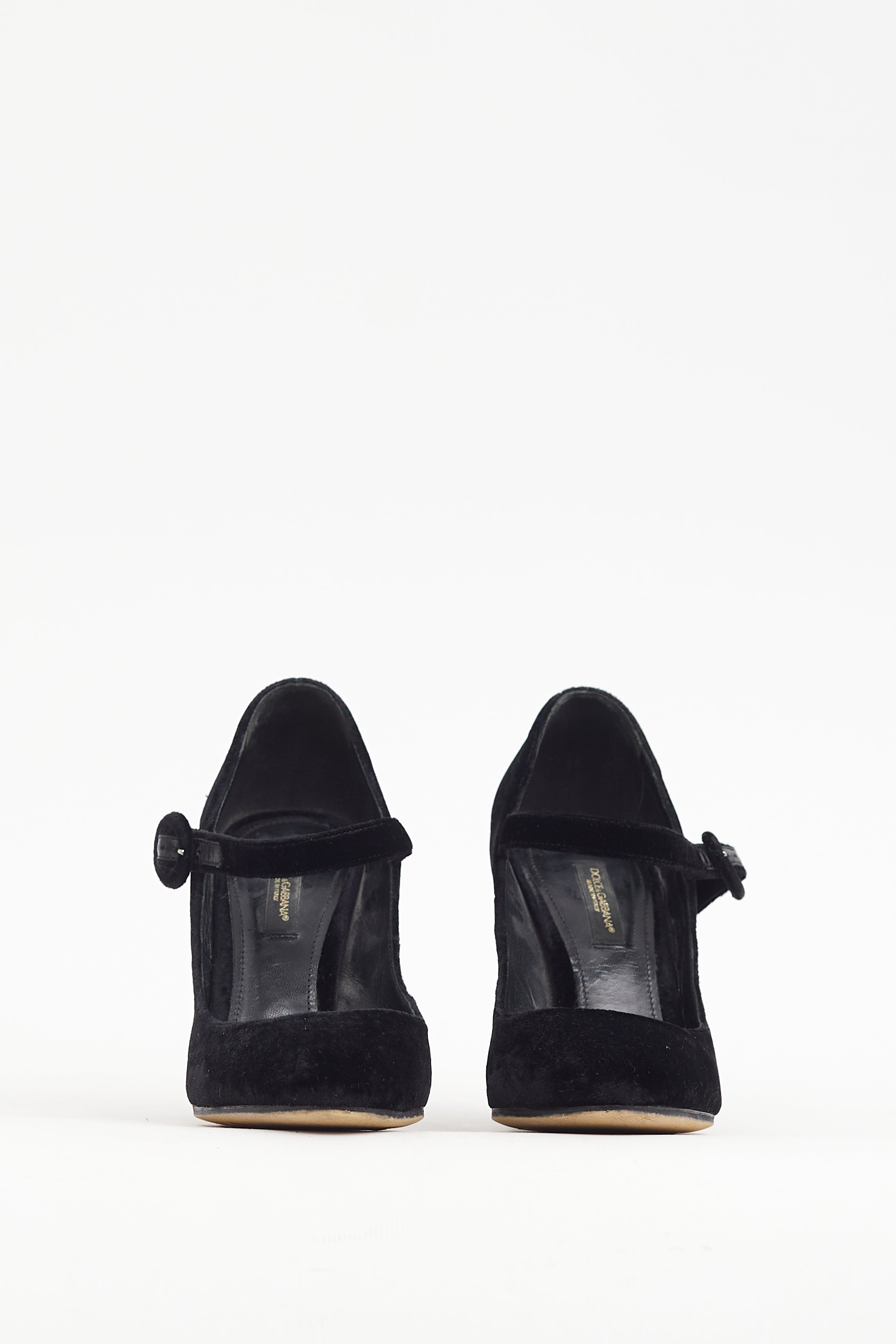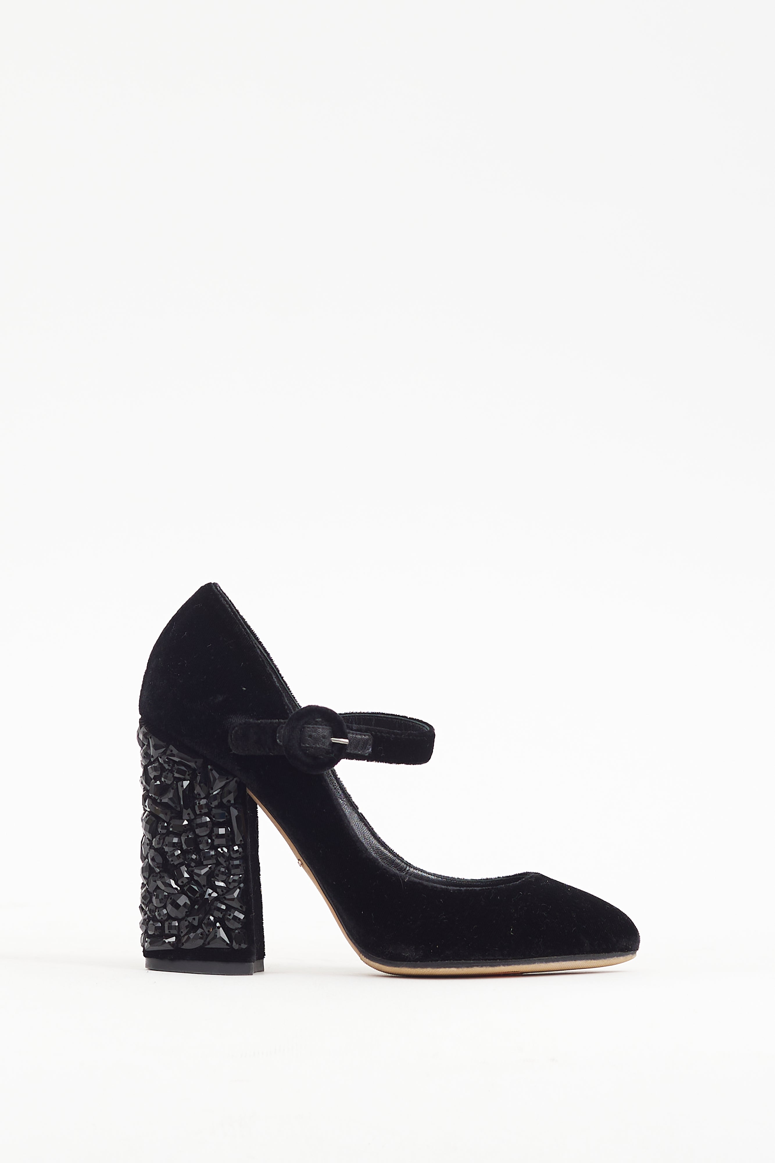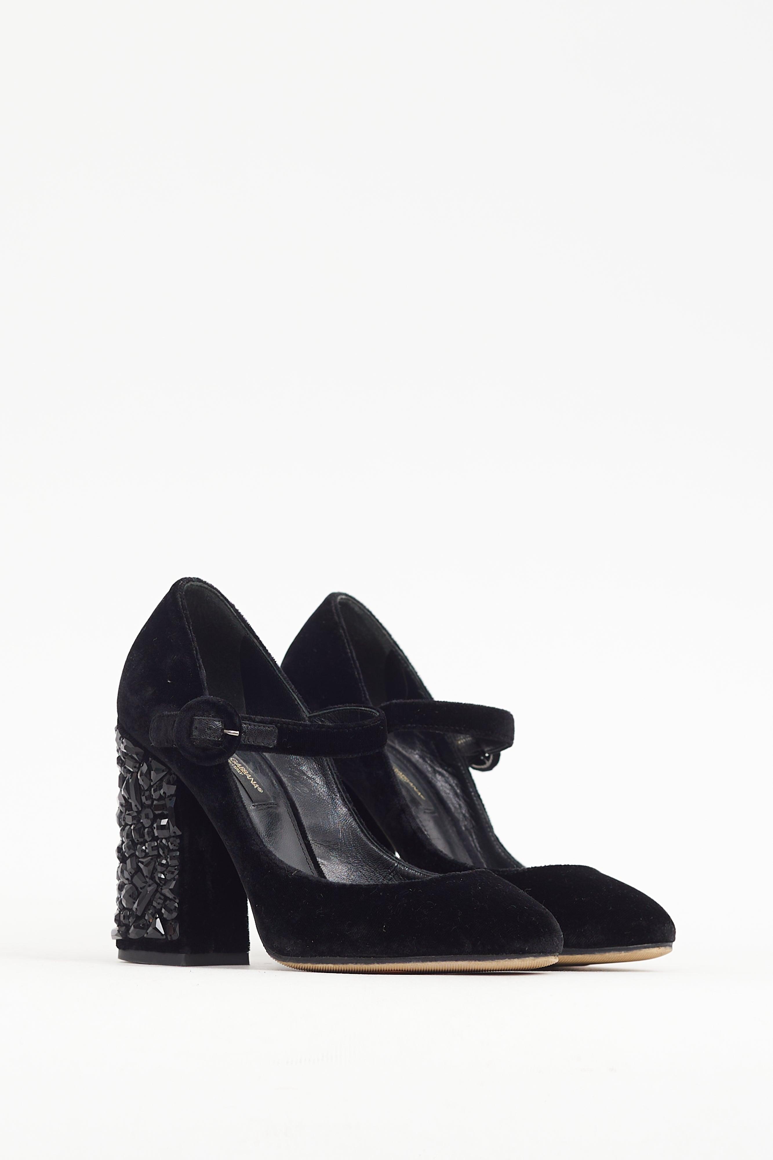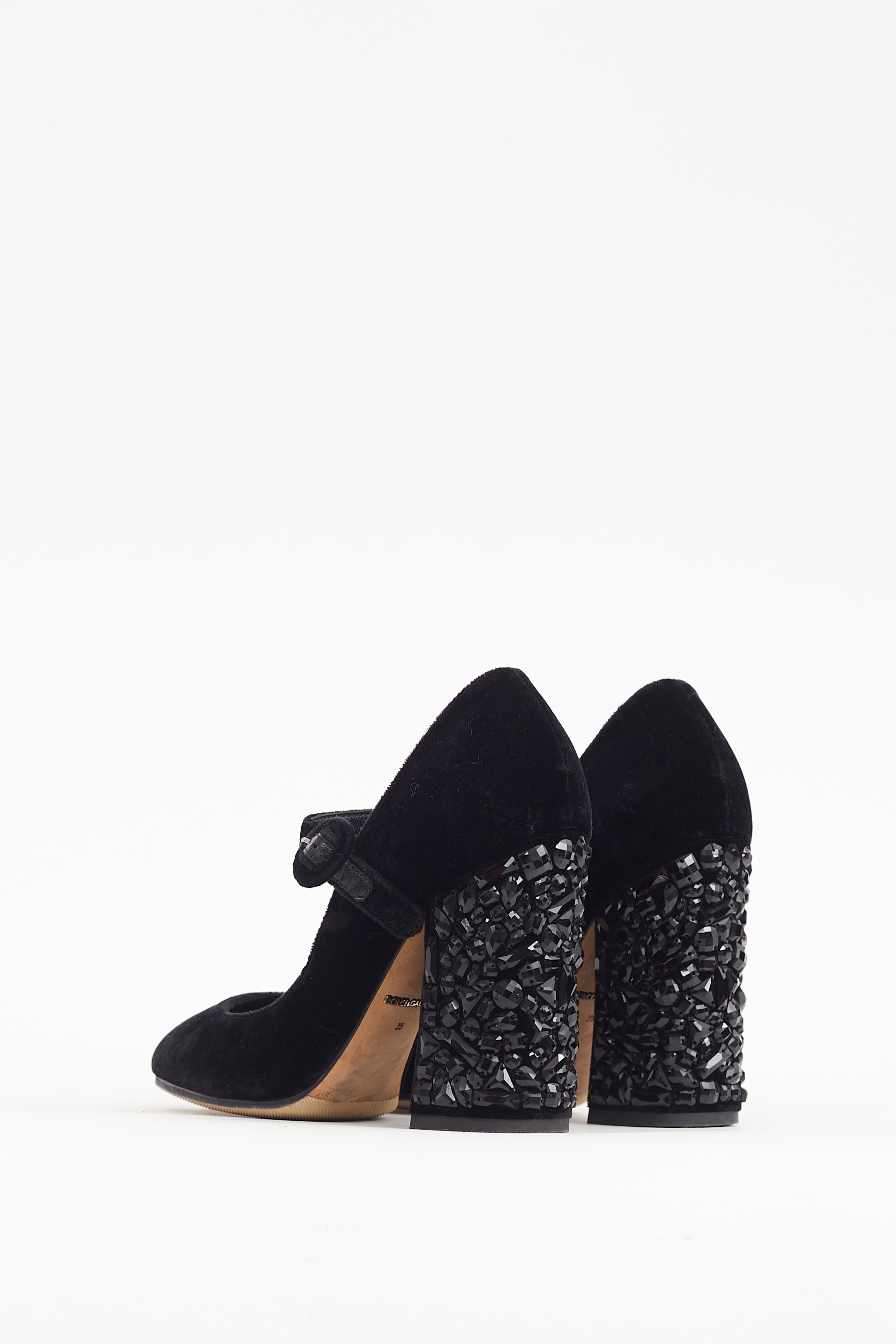 Pre-owned Dolce & Gabbana black mary jane heels featuring an almond toe, velvet uppers, buckled strap at throat, and a crystal embellished block heel.