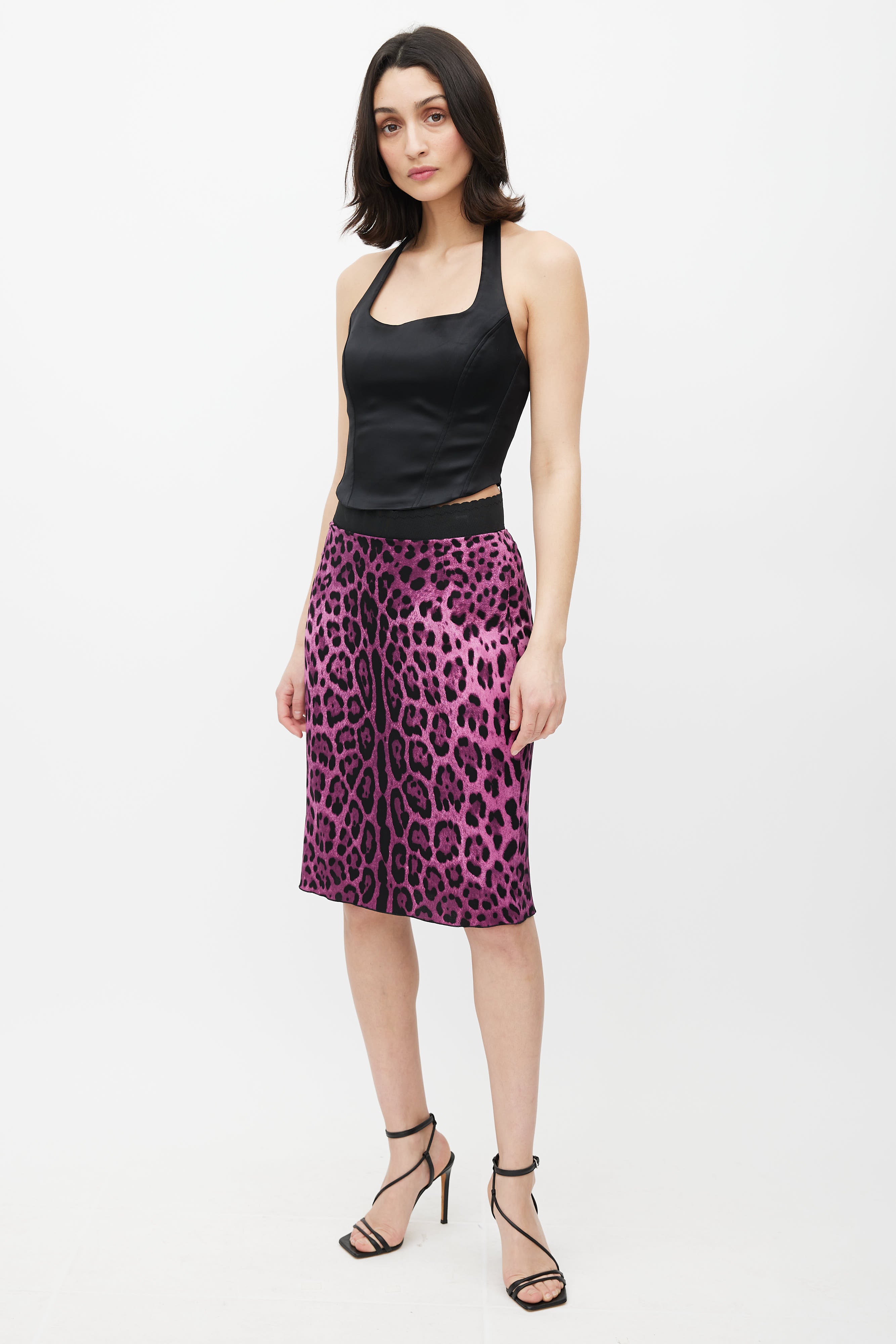 Pre-owned Dolce & Gabbana purple silk skirt featuring a black leopard pattern throughout, elasticized waist, and zip closure at back. Clipped to fit model.