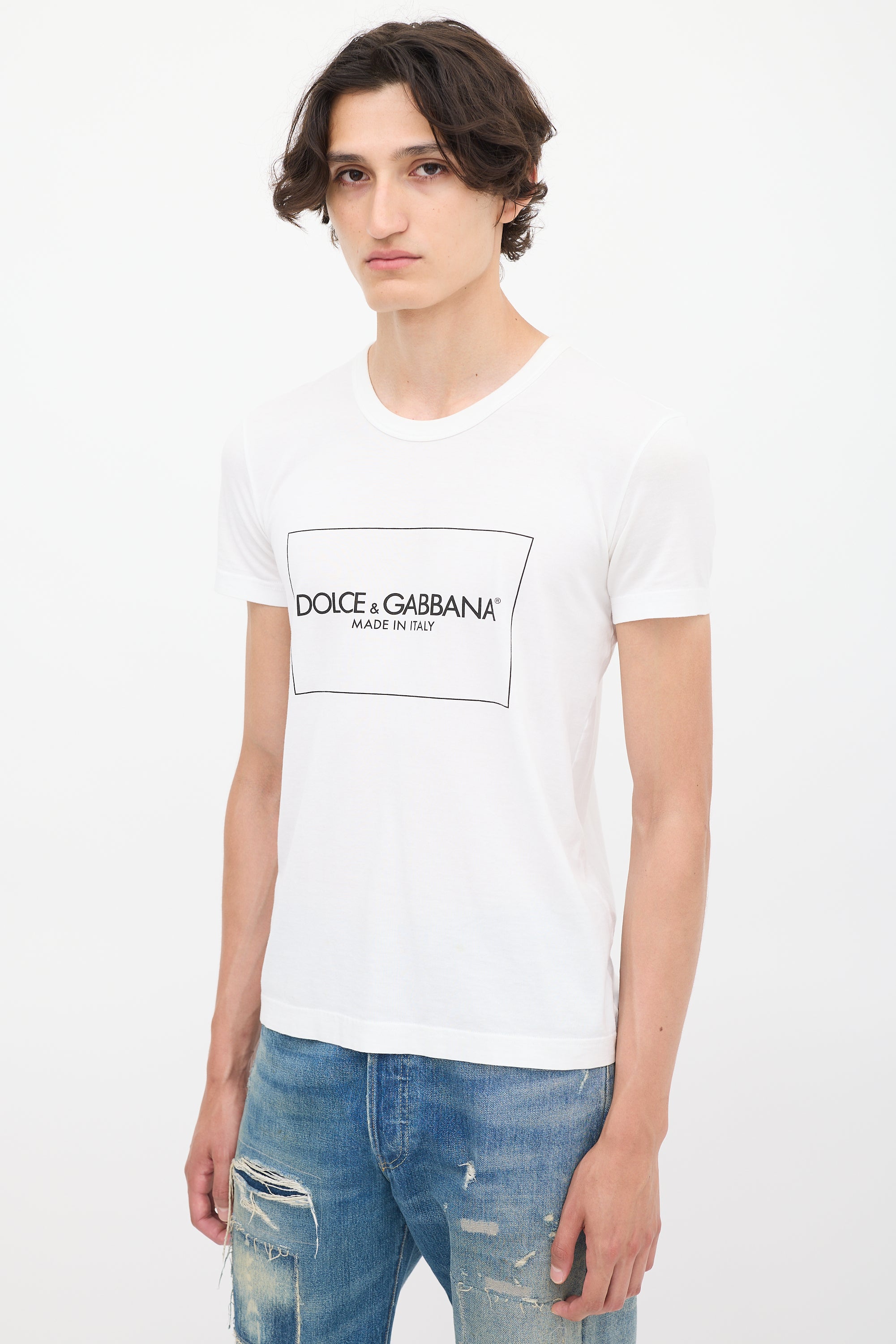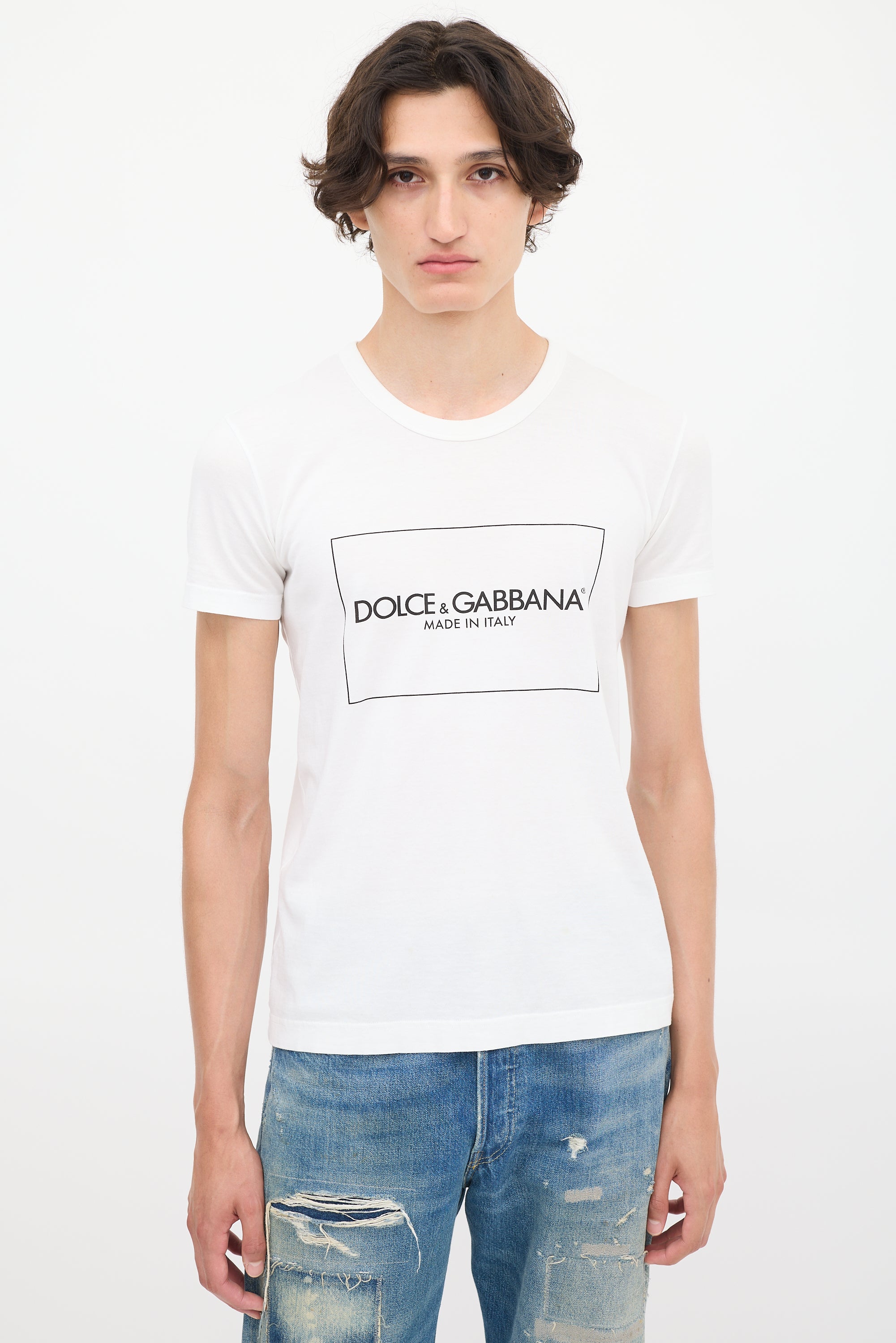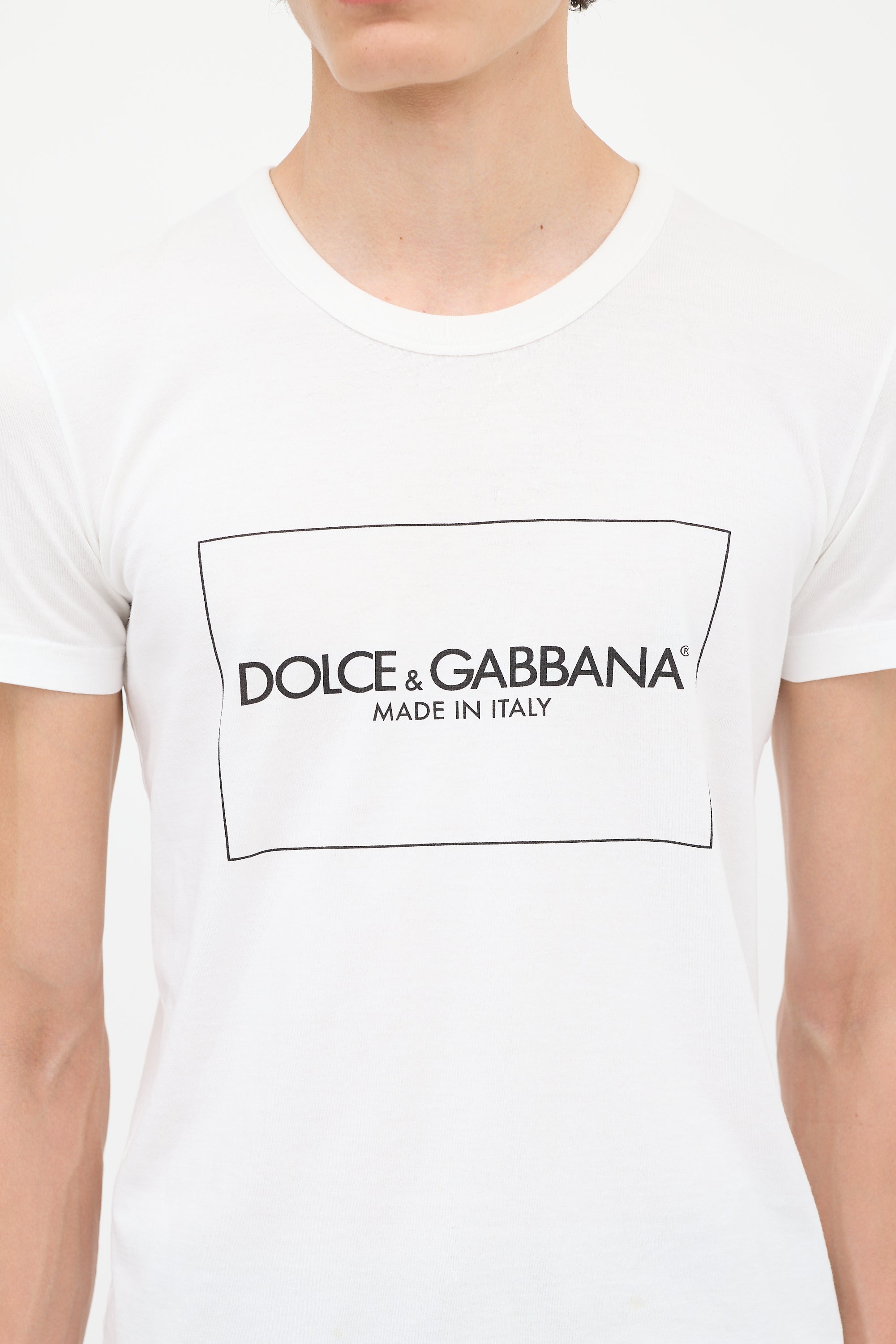 Pre-owned Dolce & Gabbana white T-shirt featuring a round neck, even hem, short sleeves, black box logo at front, and sparkly silver tone label at back neck.