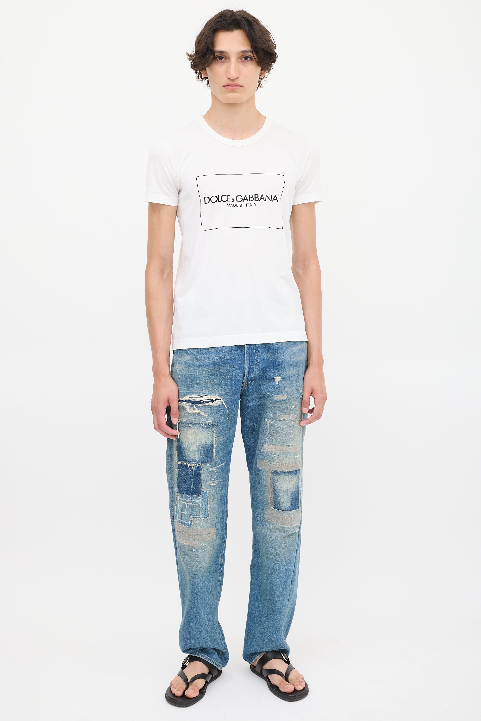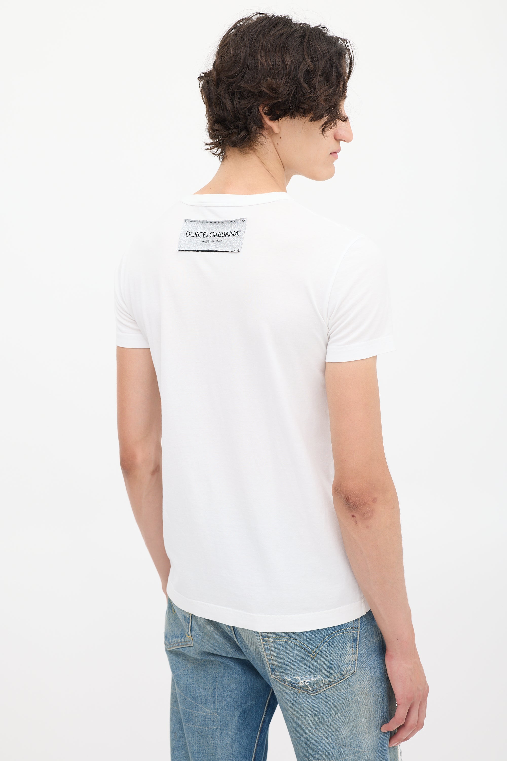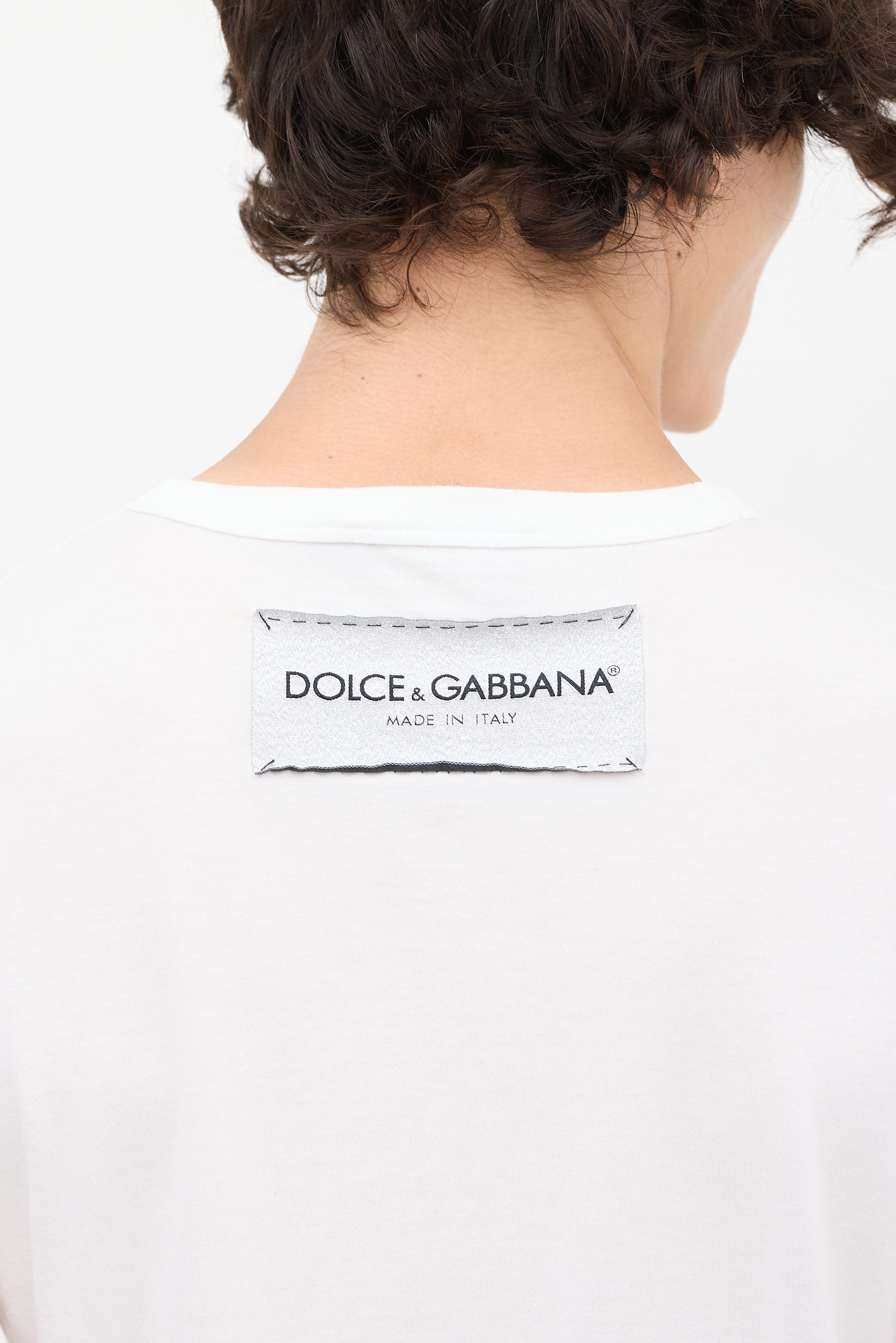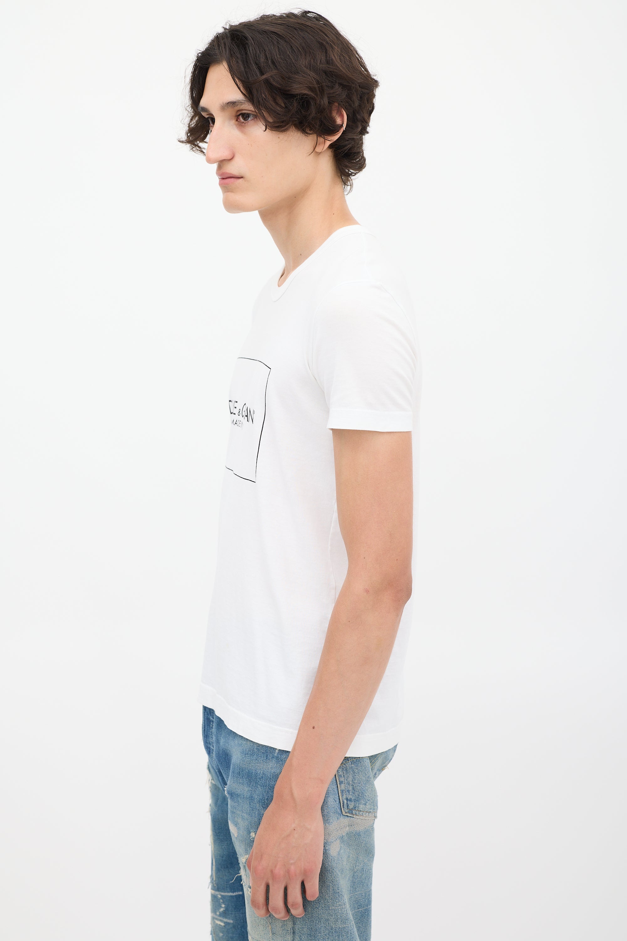 Pre-owned Dolce & Gabbana white T-shirt featuring a round neck, even hem, short sleeves, black box logo at front, and sparkly silver tone label at back neck.