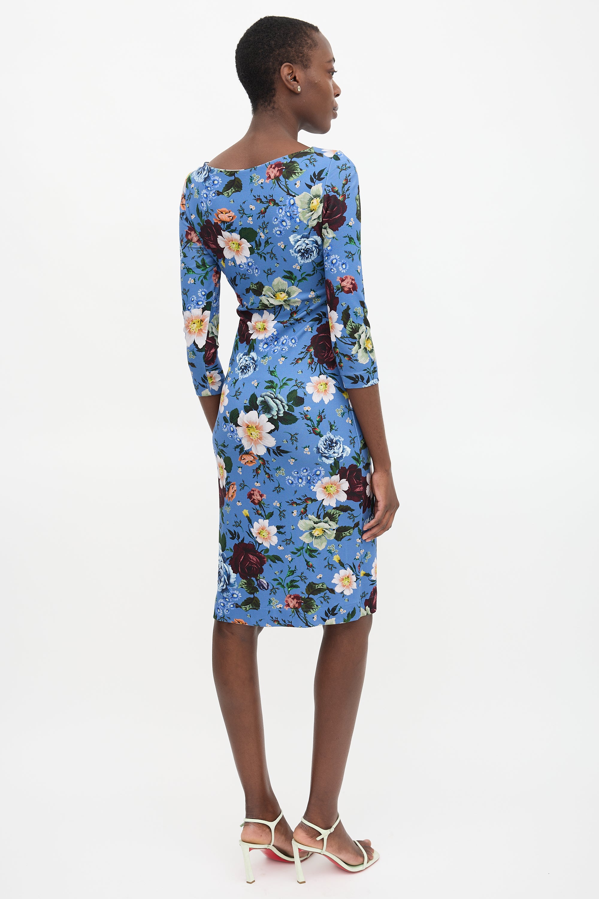 Pre-owned Erdem blue floral Reese midi sheath dress featuring a bateau neckline and fitted silhouette.