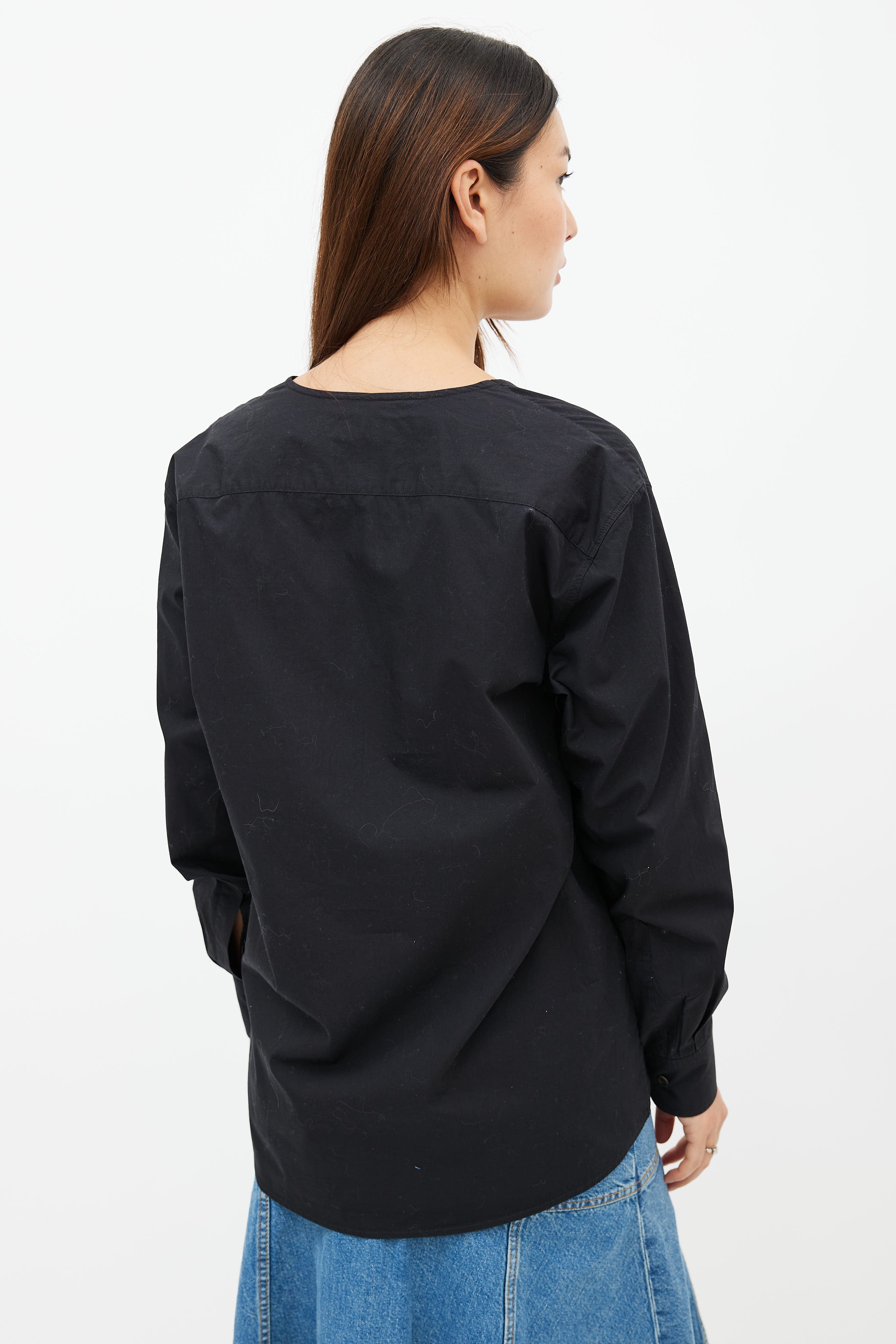 Pre-owned Dries Van Noten shirt in black featuring V-neckline, long sleeves, and buttoned cuffs.