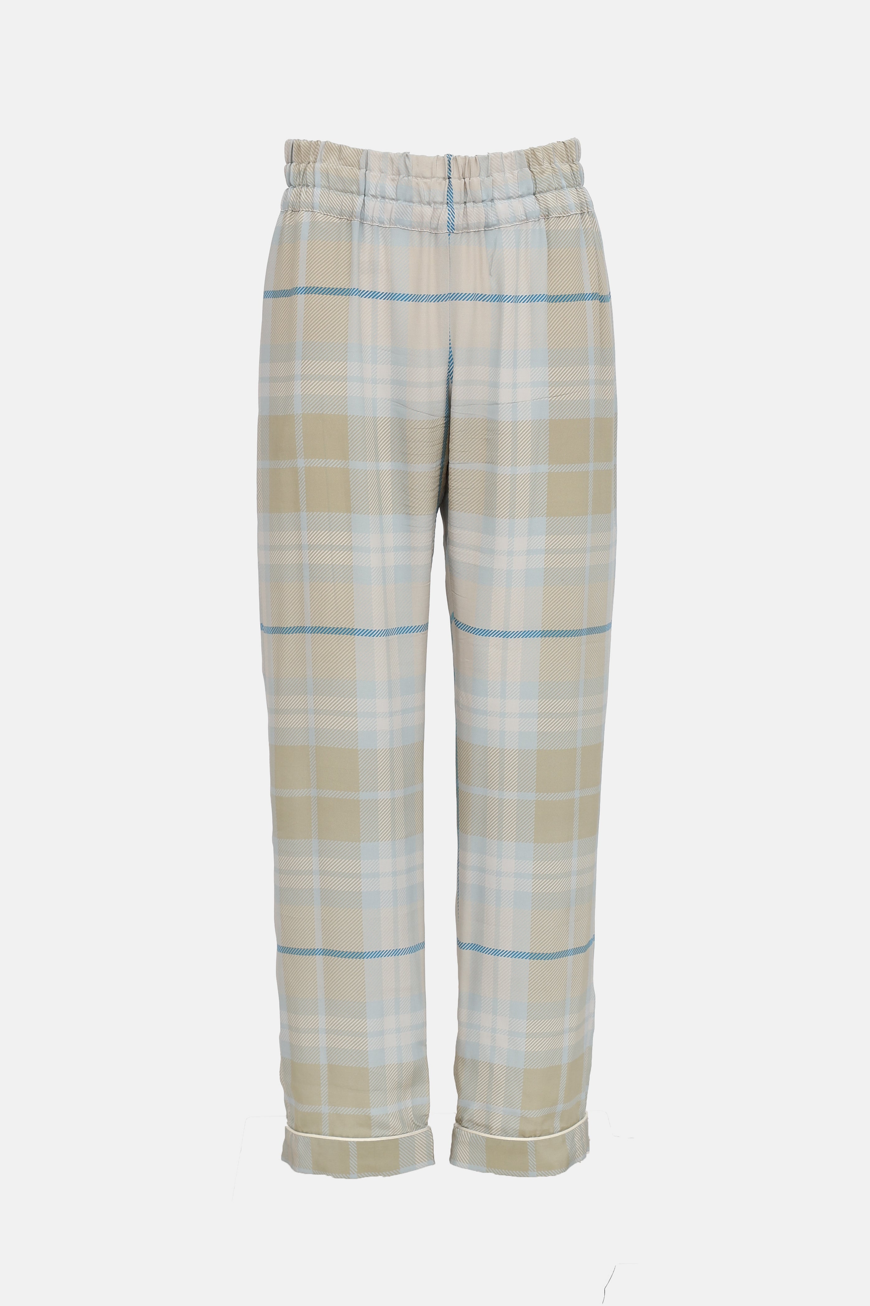 Pre-owned Dries Van Noten blue and multicolor check silk pants featuring elasticized waistband, slit pockets at hip, and patch pockets at back.