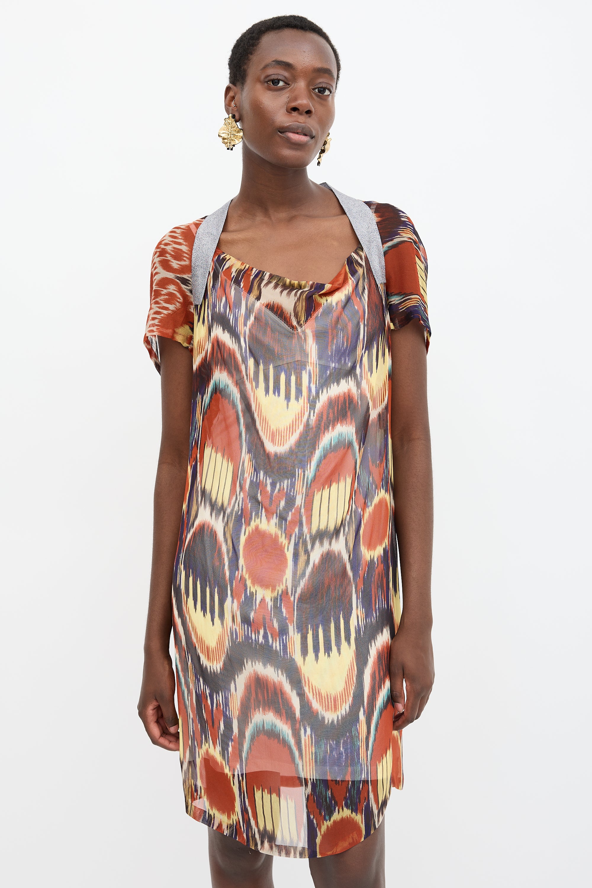 Pre-owned Dries Van Noten Spring/Summer 2010 multicolour silk midi dress featuring ikat print, cowl neckline, and contrast dot print trim. Unlined.