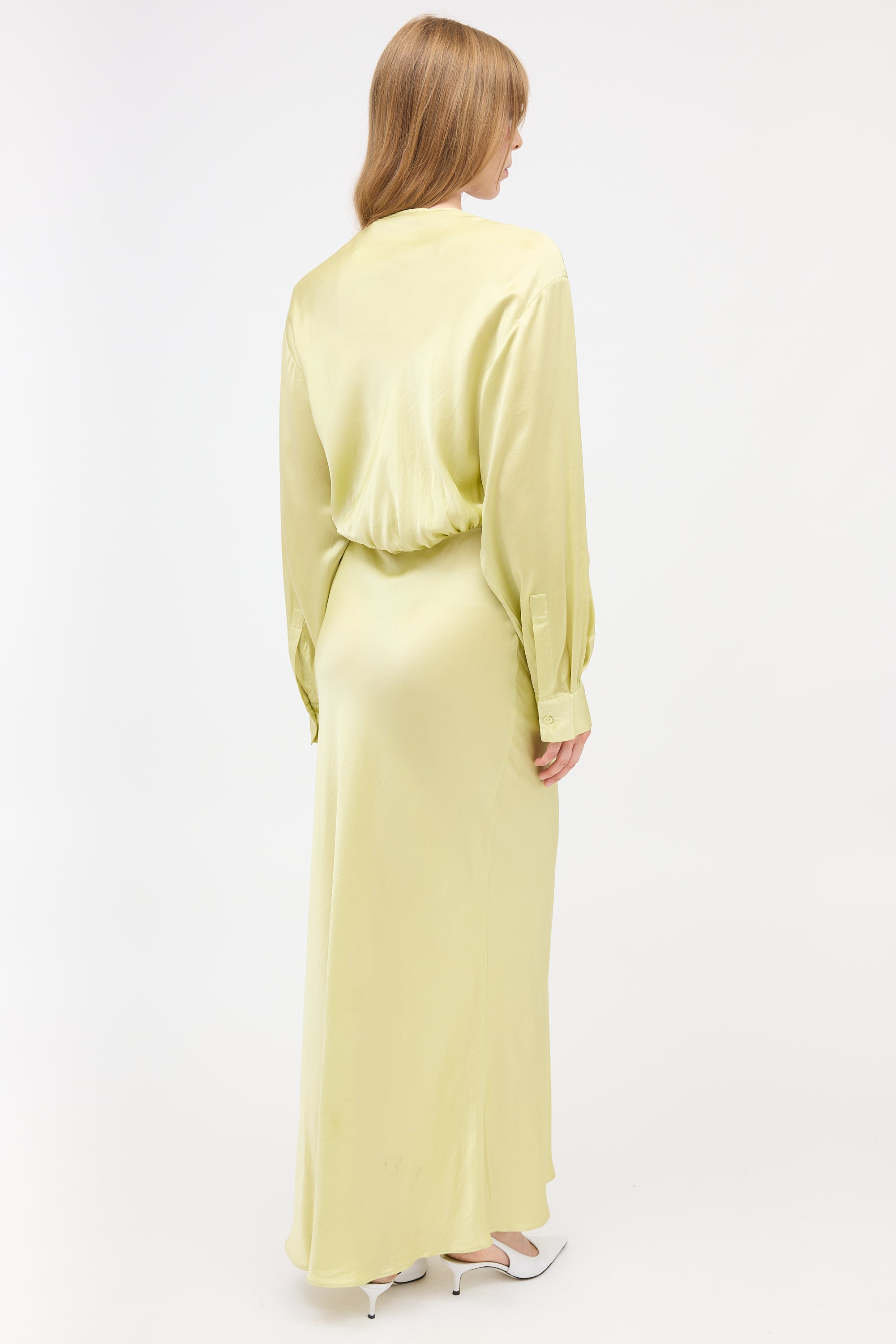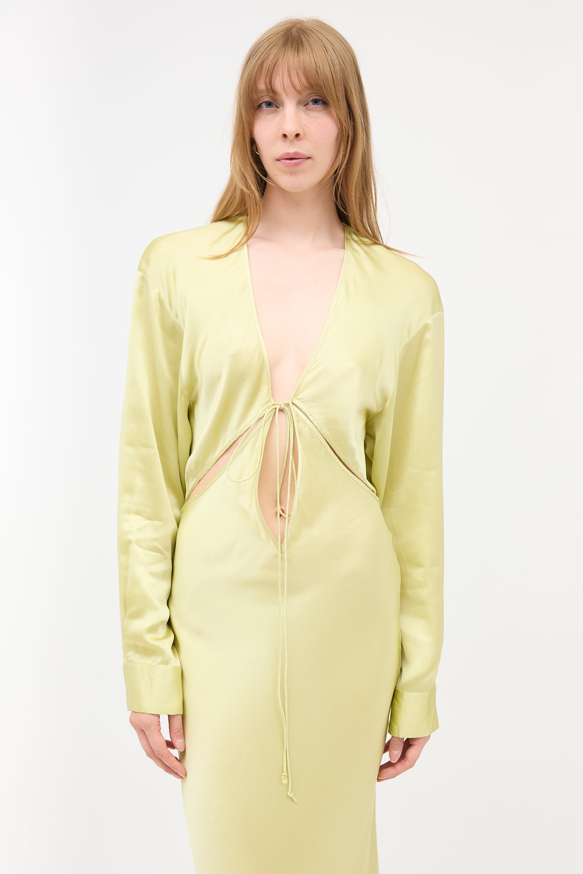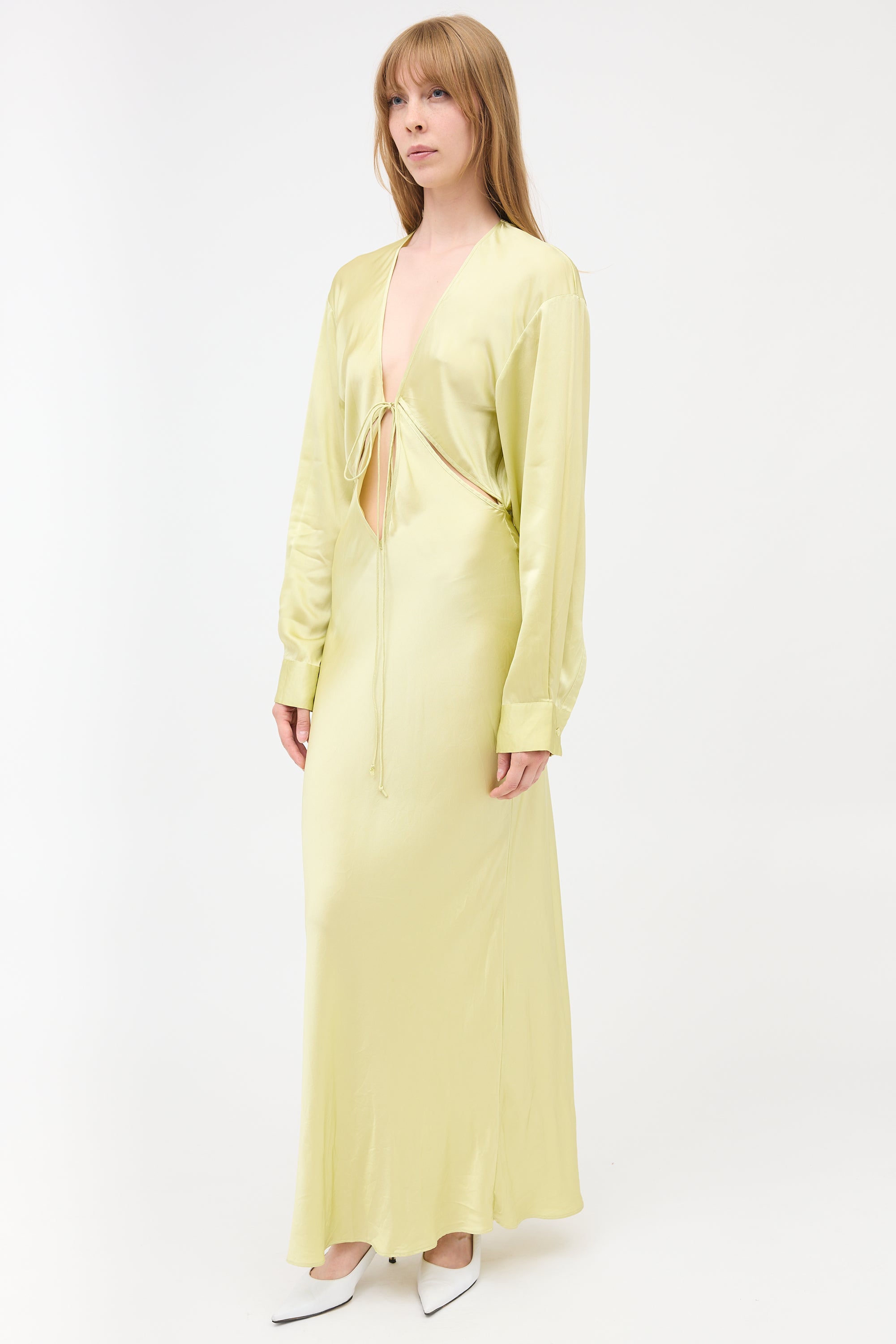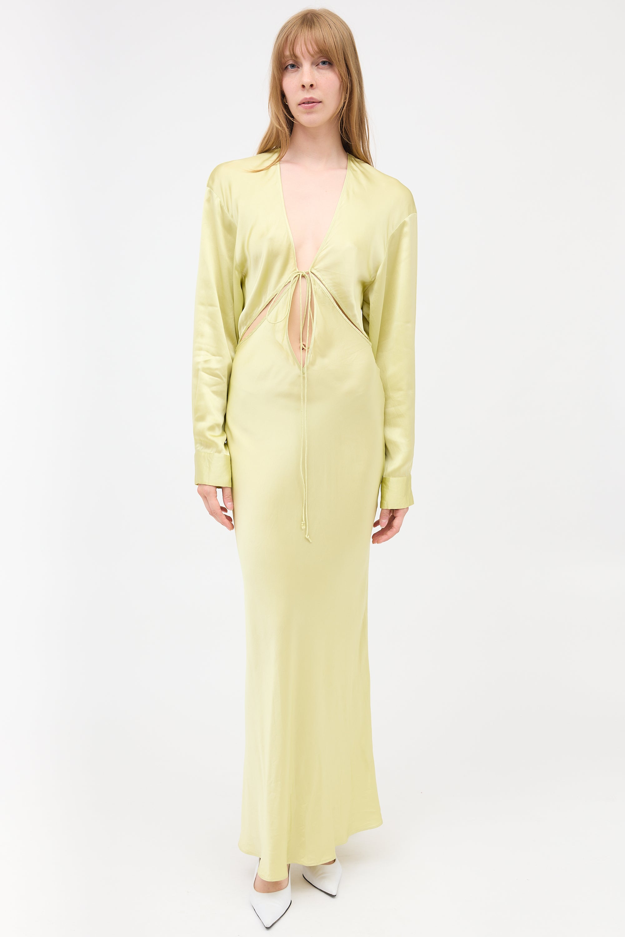 Pre-owned Christopher Esber green silk maxi dress featuring a plunge neckline with self-tie closure, cutouts at waist, long sleeves with buttoned cuffs.