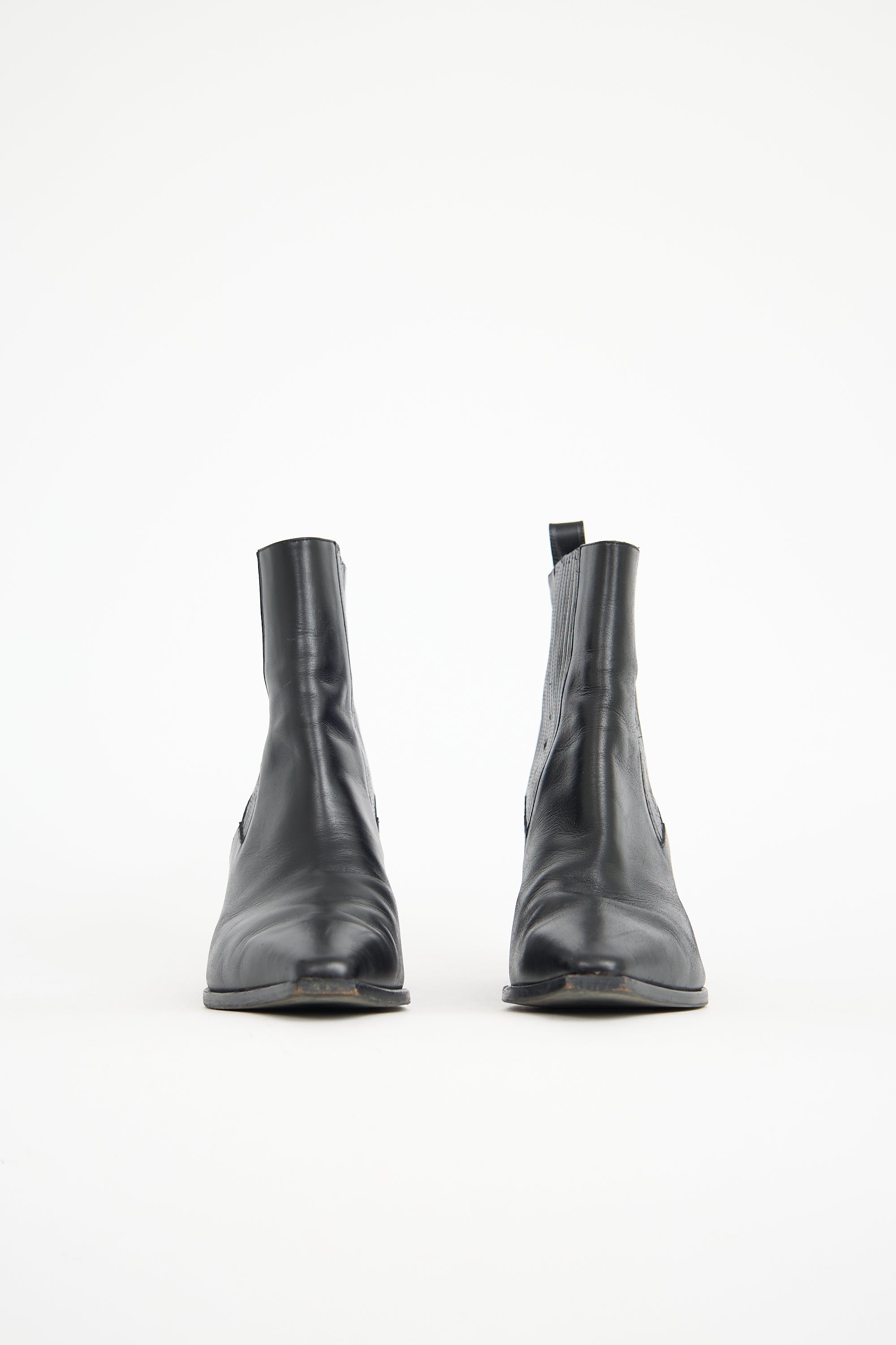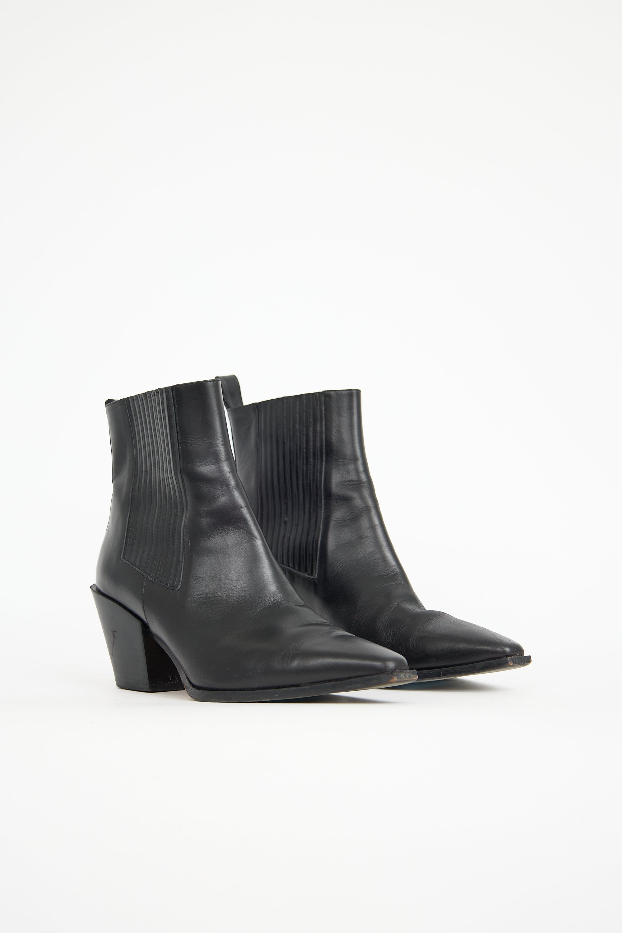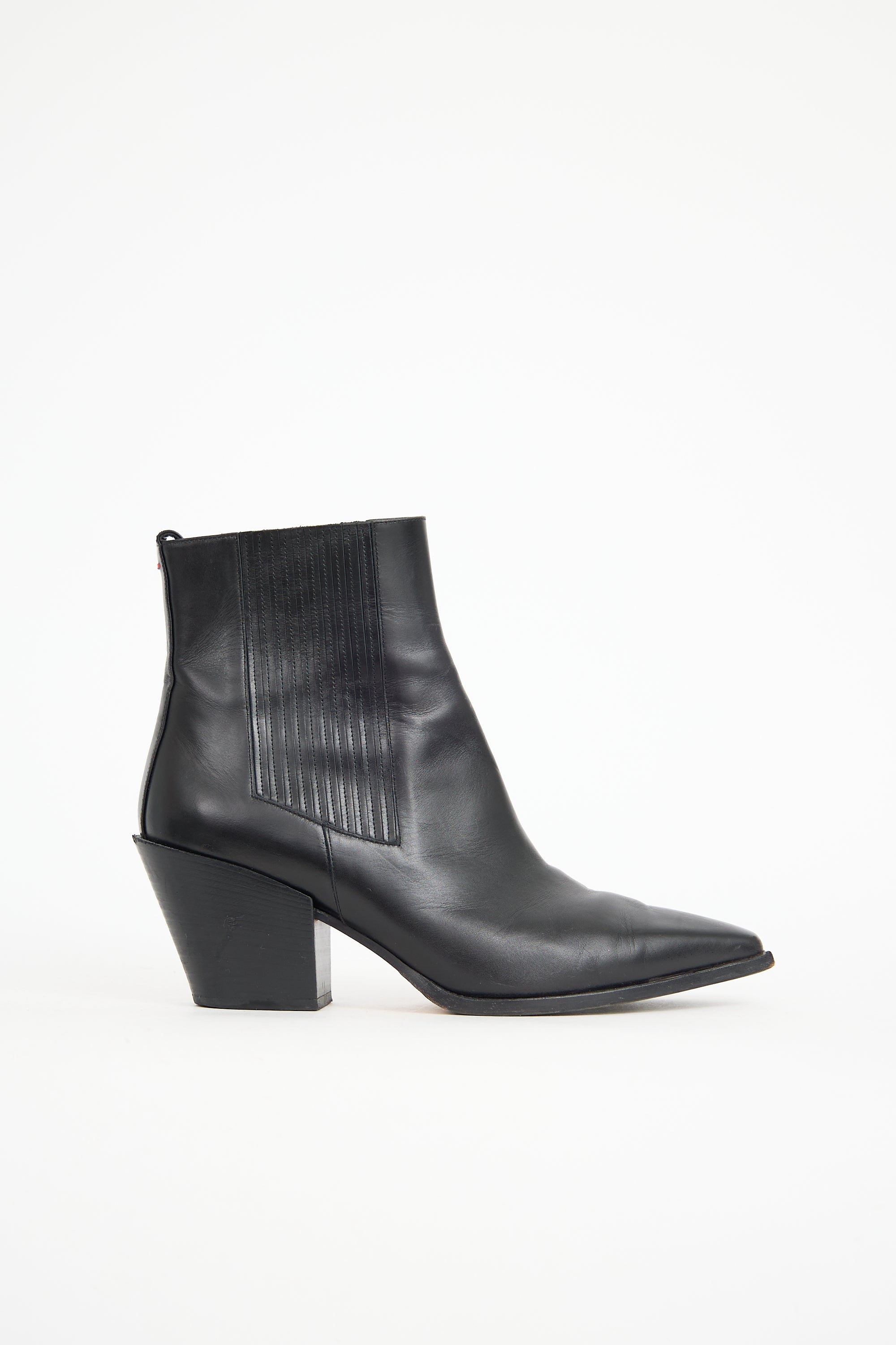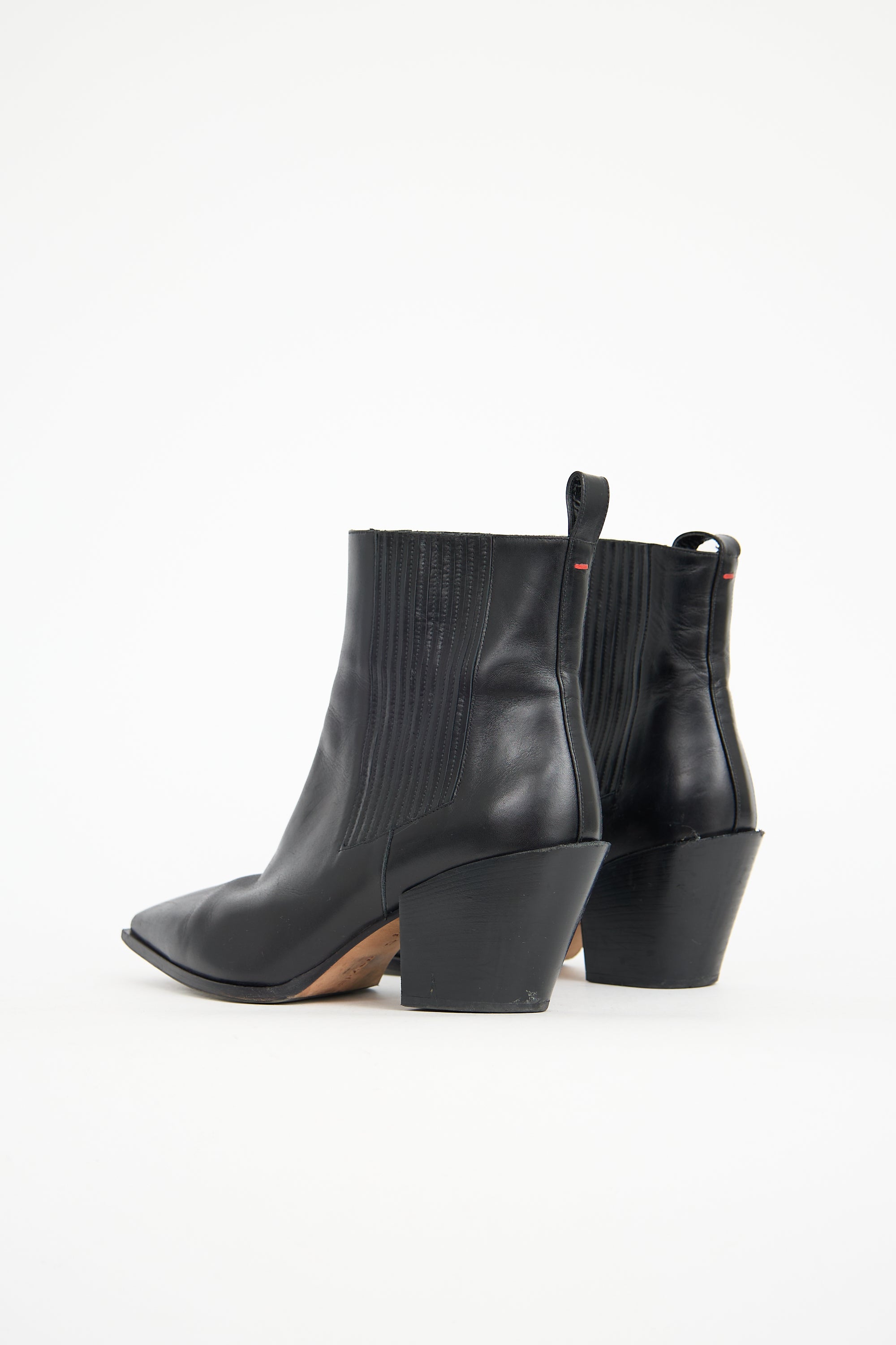 Pre-owned Aeydē black leather Belinda boots featuring pointed toe, covered elastic side panels, pull tab at counter, pull on entry, and tonal wooden Cuban heel.