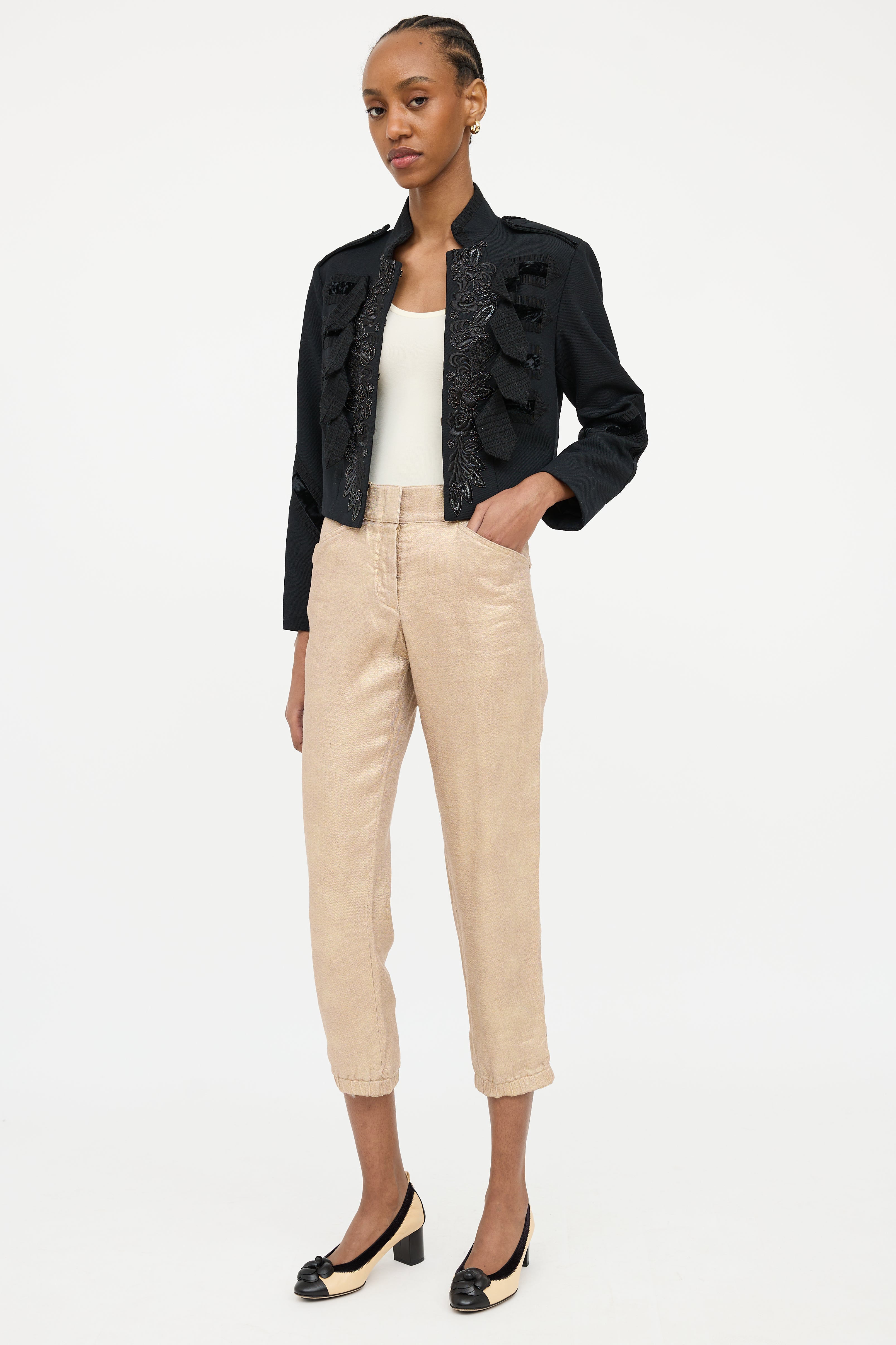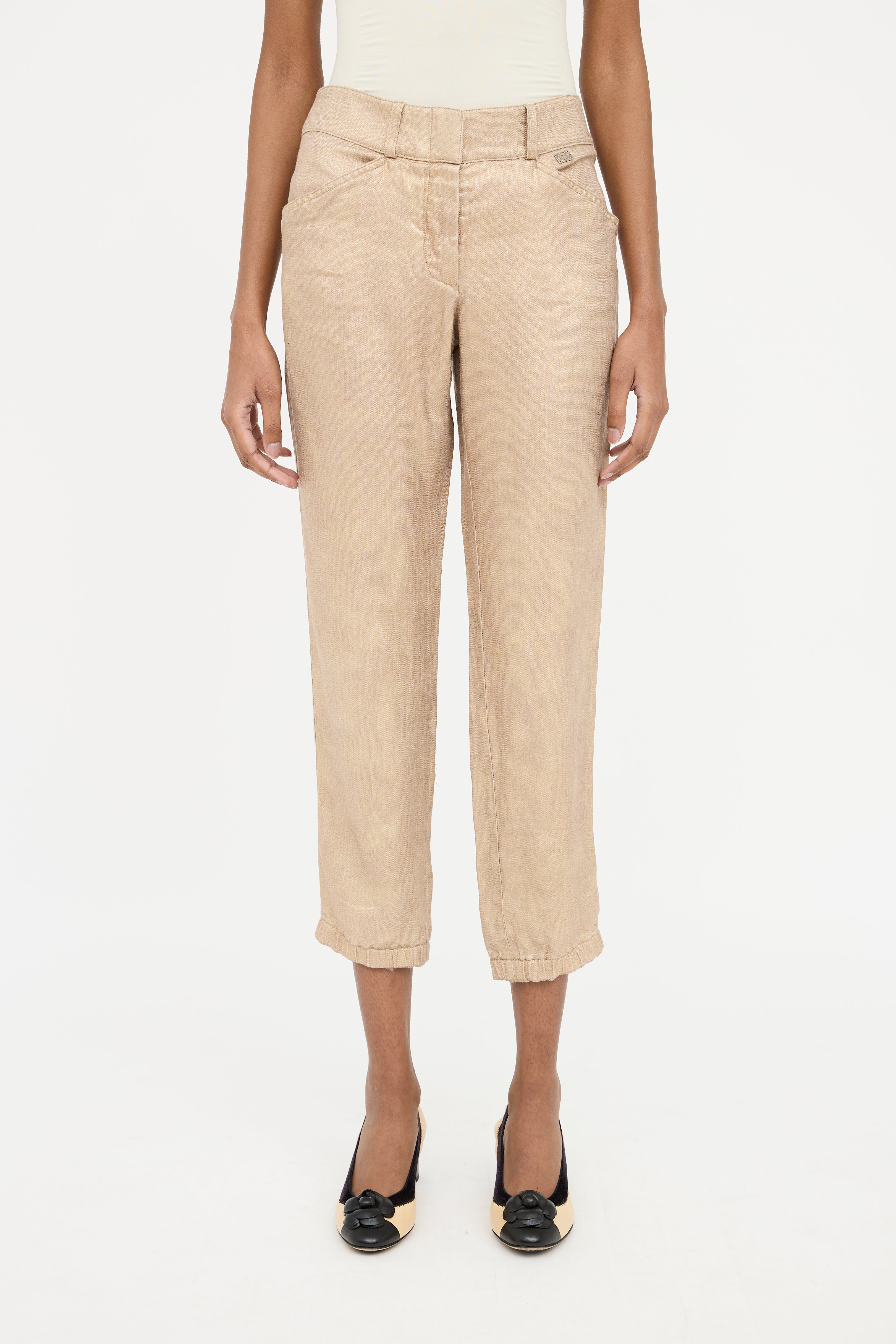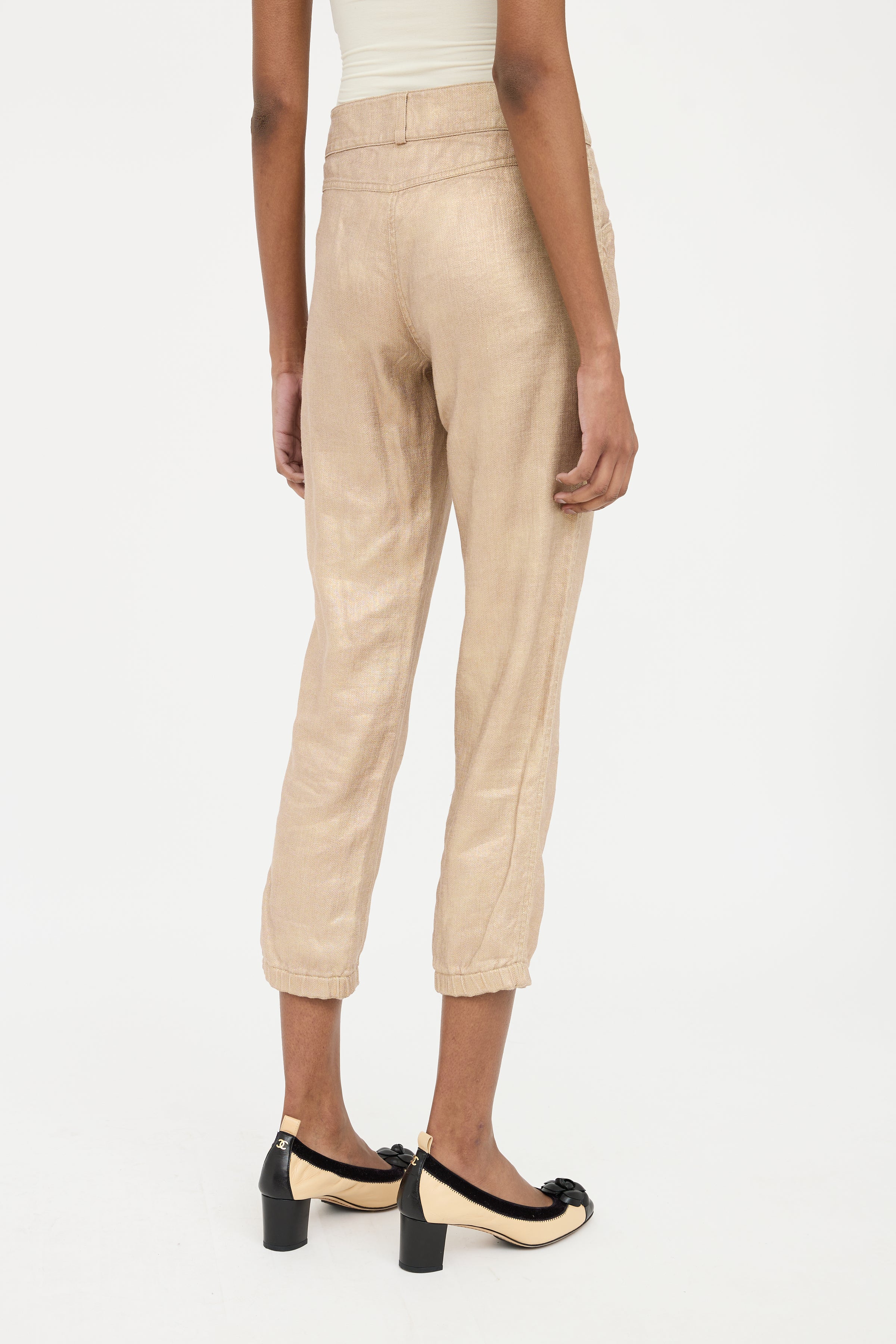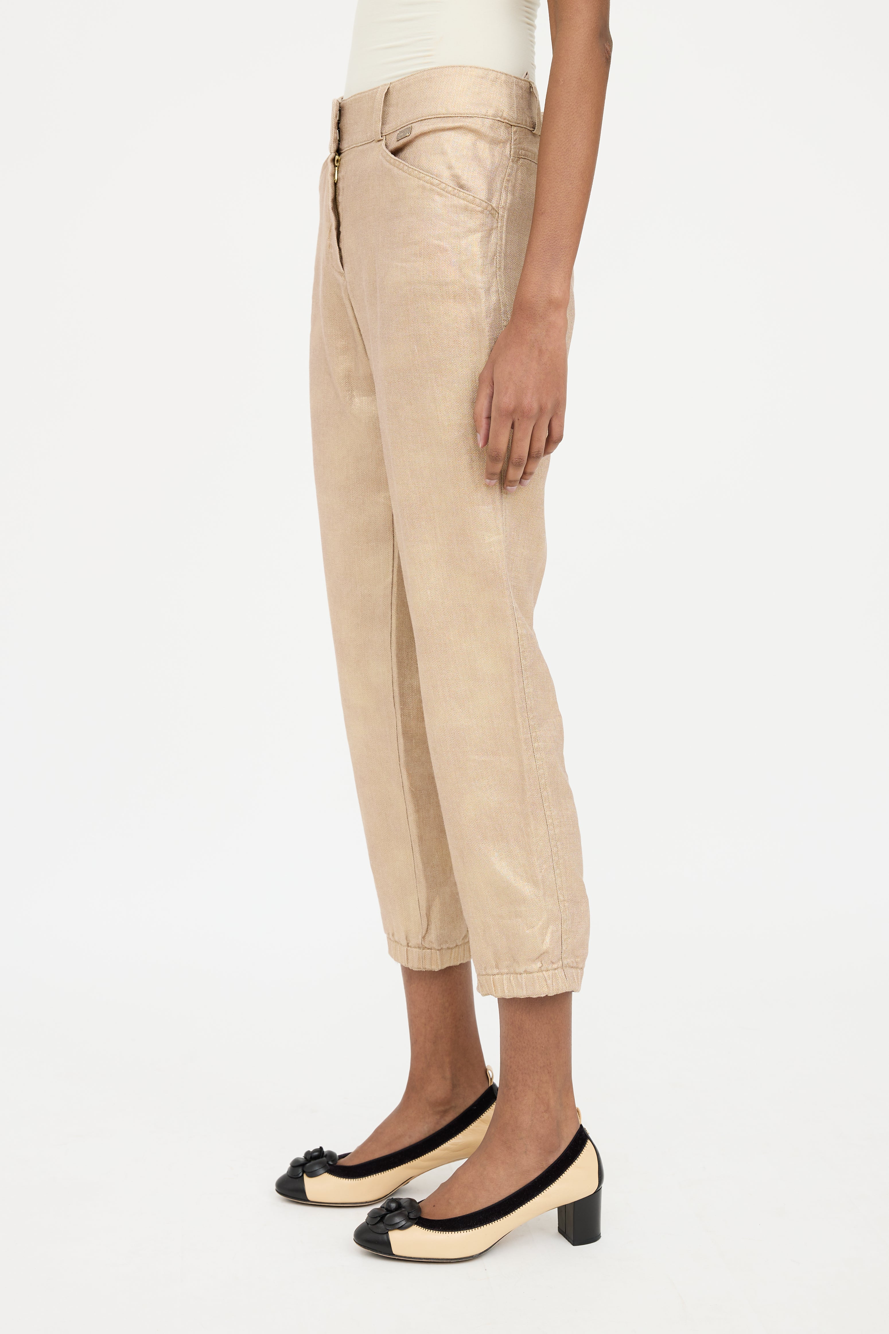 Pre-owned Chanel Spring/Summer 2005 gold pants featuring linen and silk blend, jogger style with elastic cinched ankle, clasp and zip closure, dual slip pockets on hip, Chanel hardware plaque on left pocket and belt loops on waist.