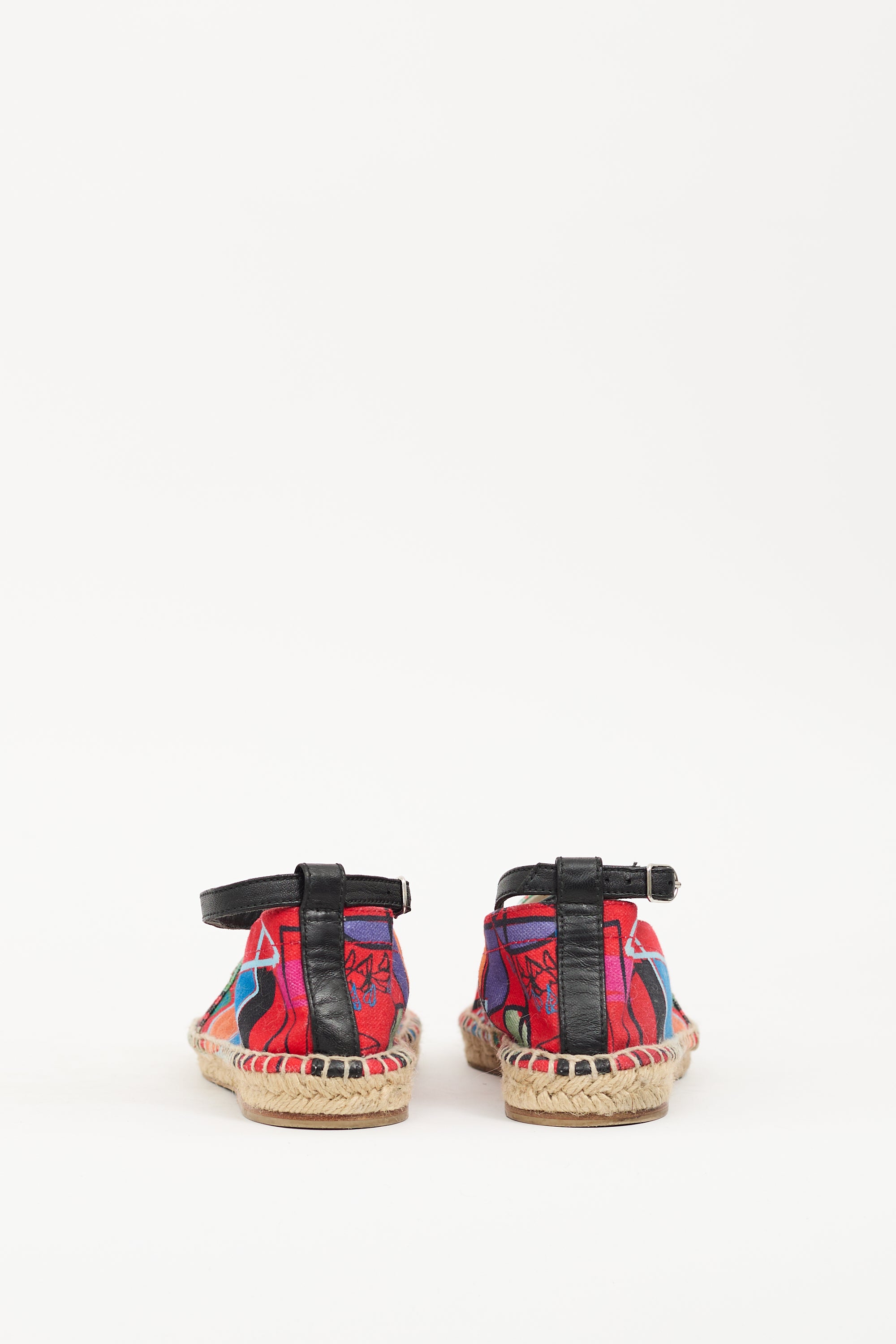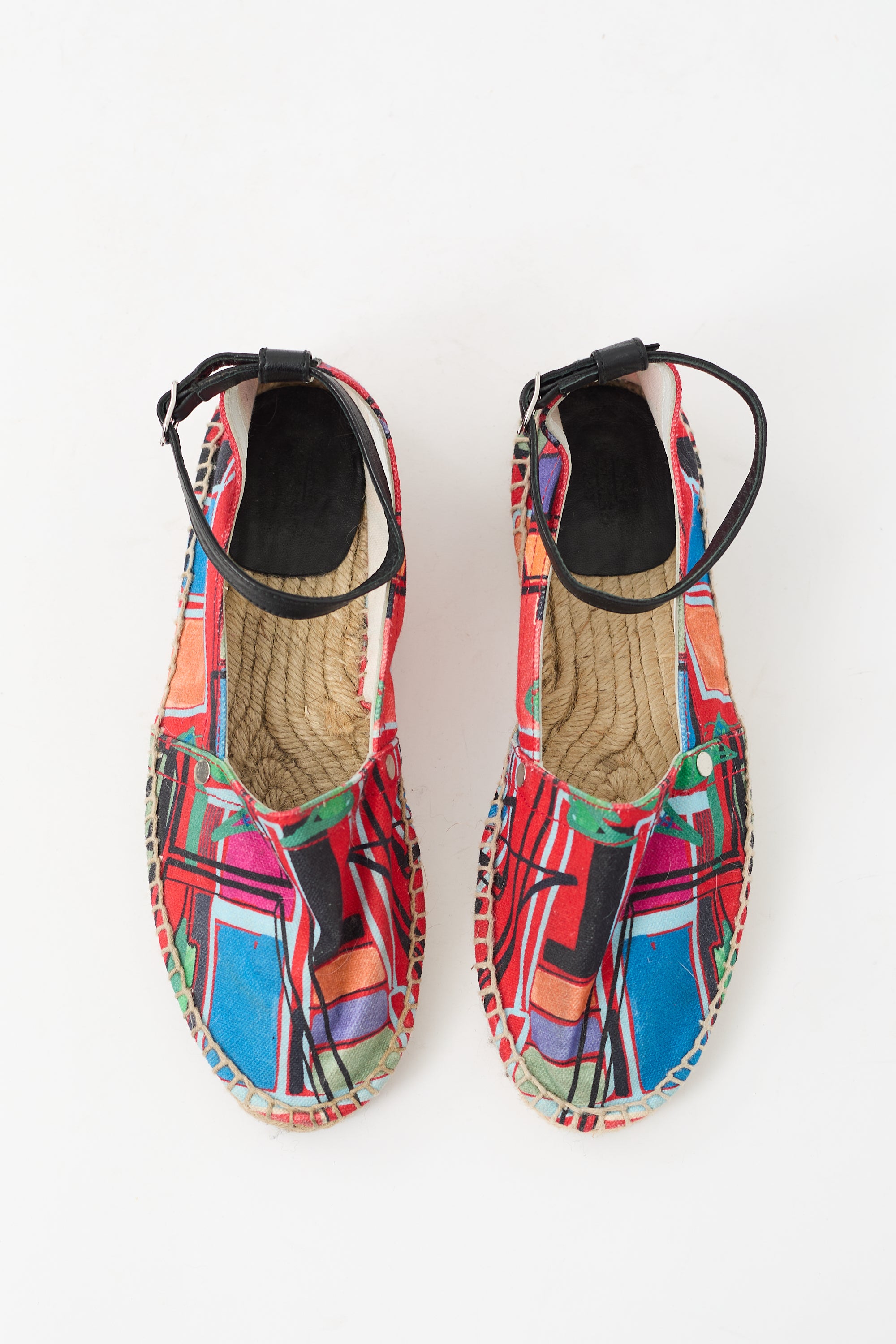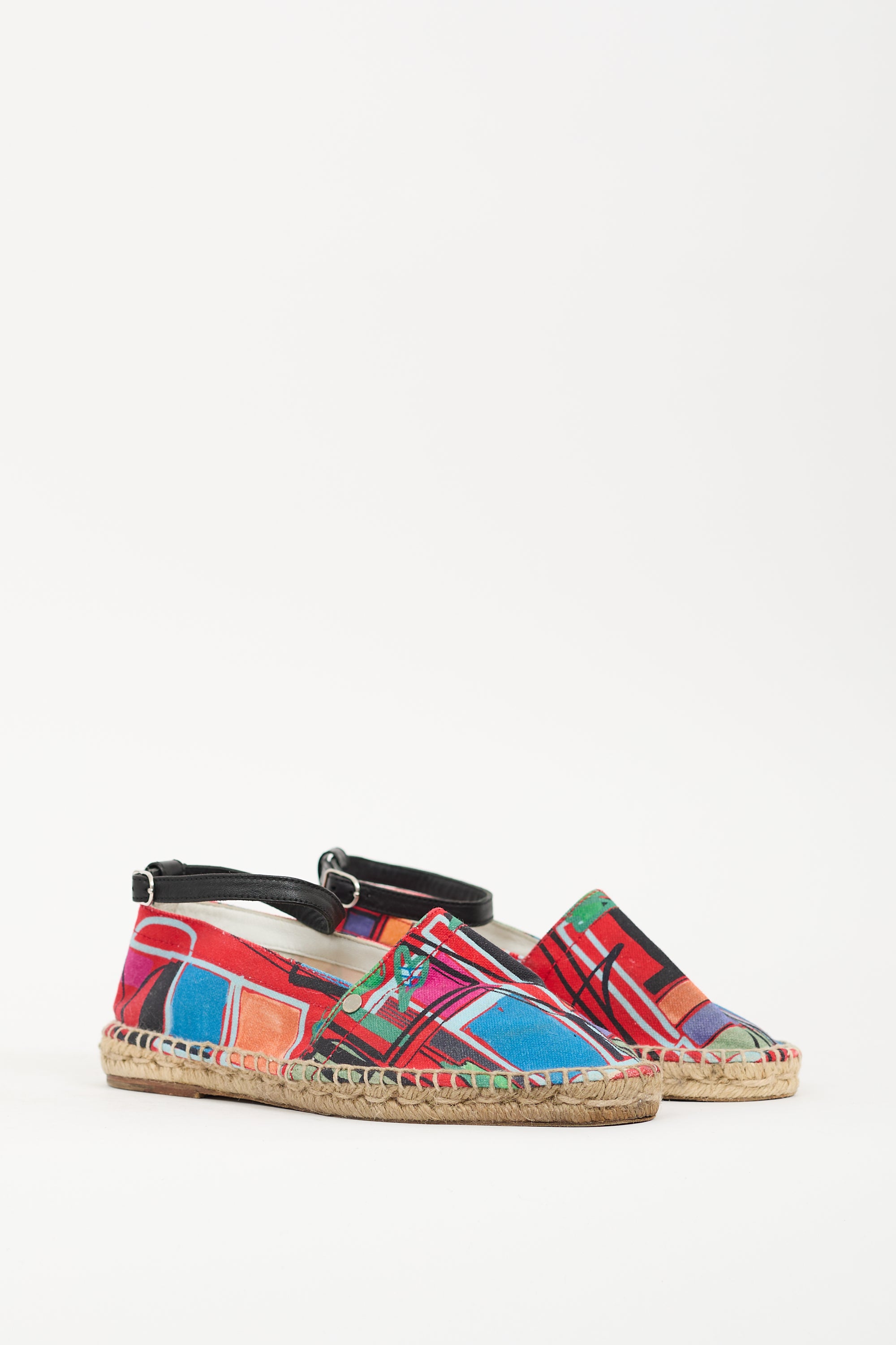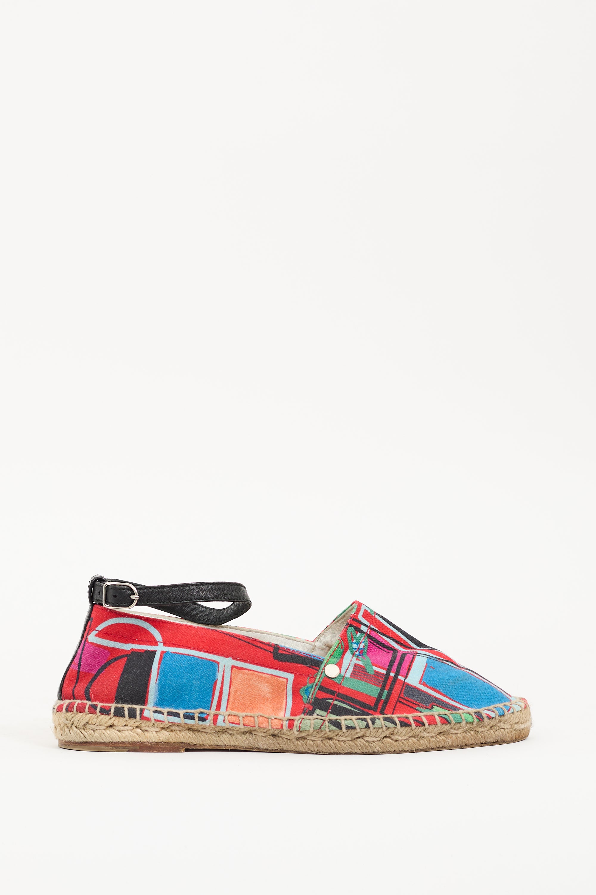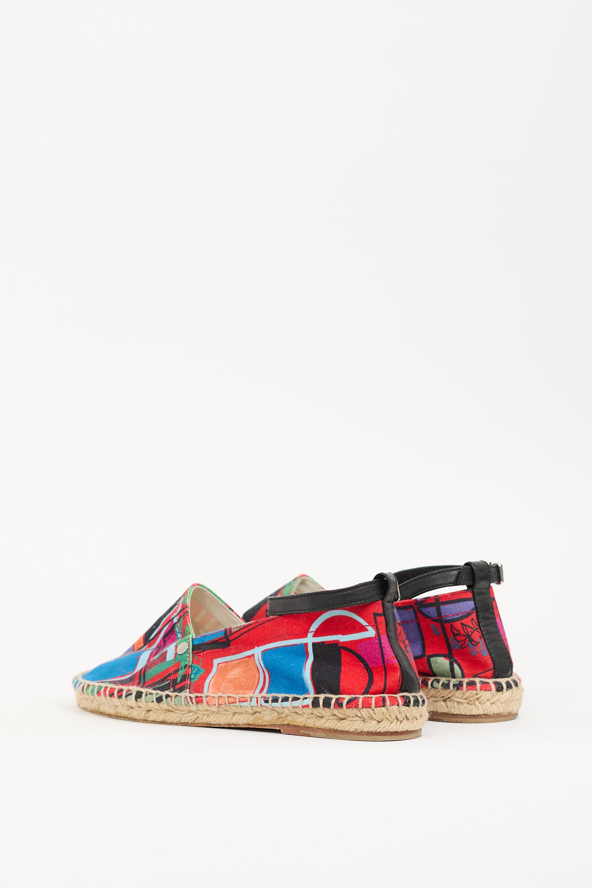 Pre-owned Hermès multicolour canvas Malaga espadrille flats featuring rounded toe, silver tone logo hardware at side, adjustable ankle strap, and jute wrapped midsole.