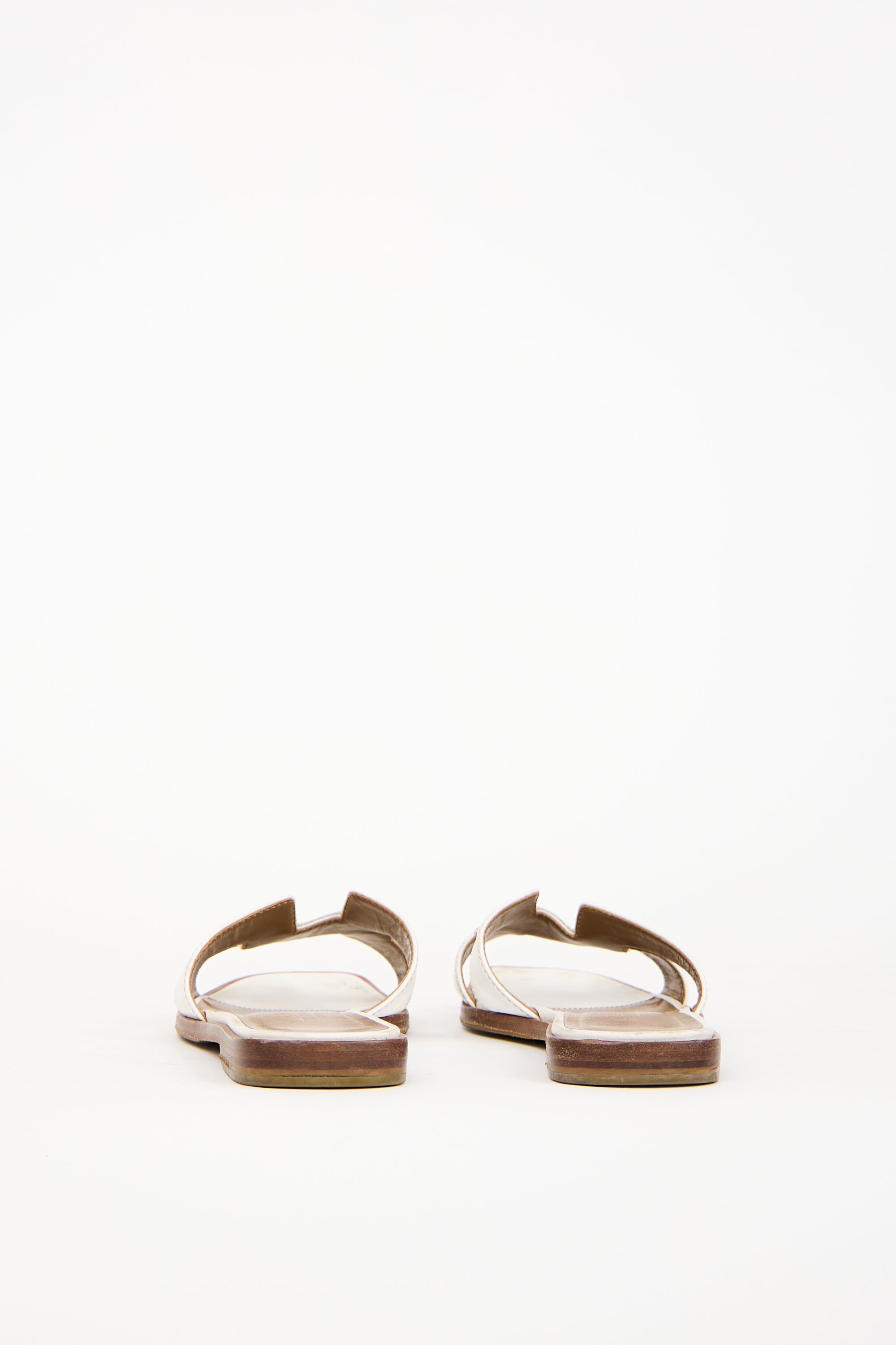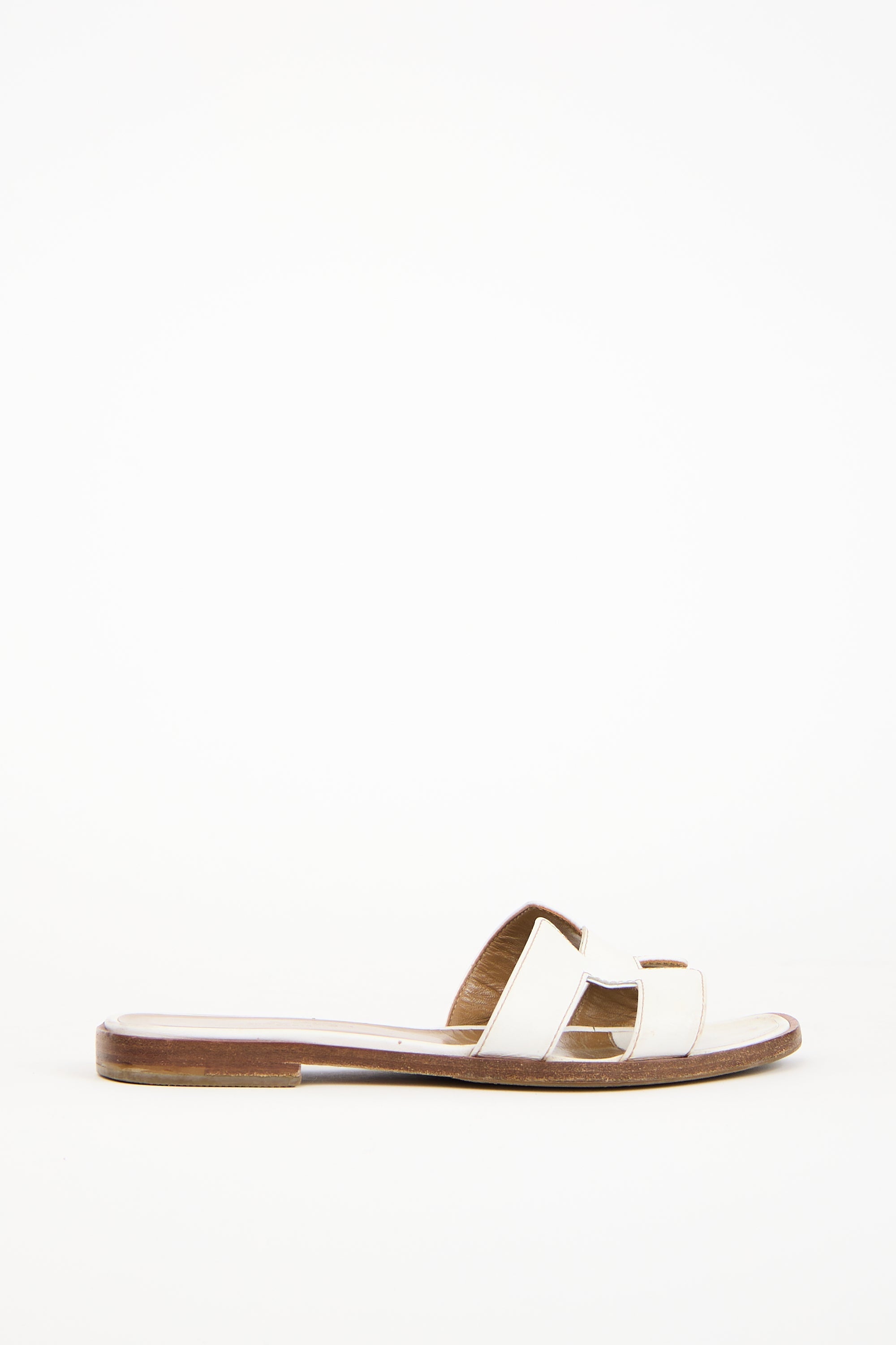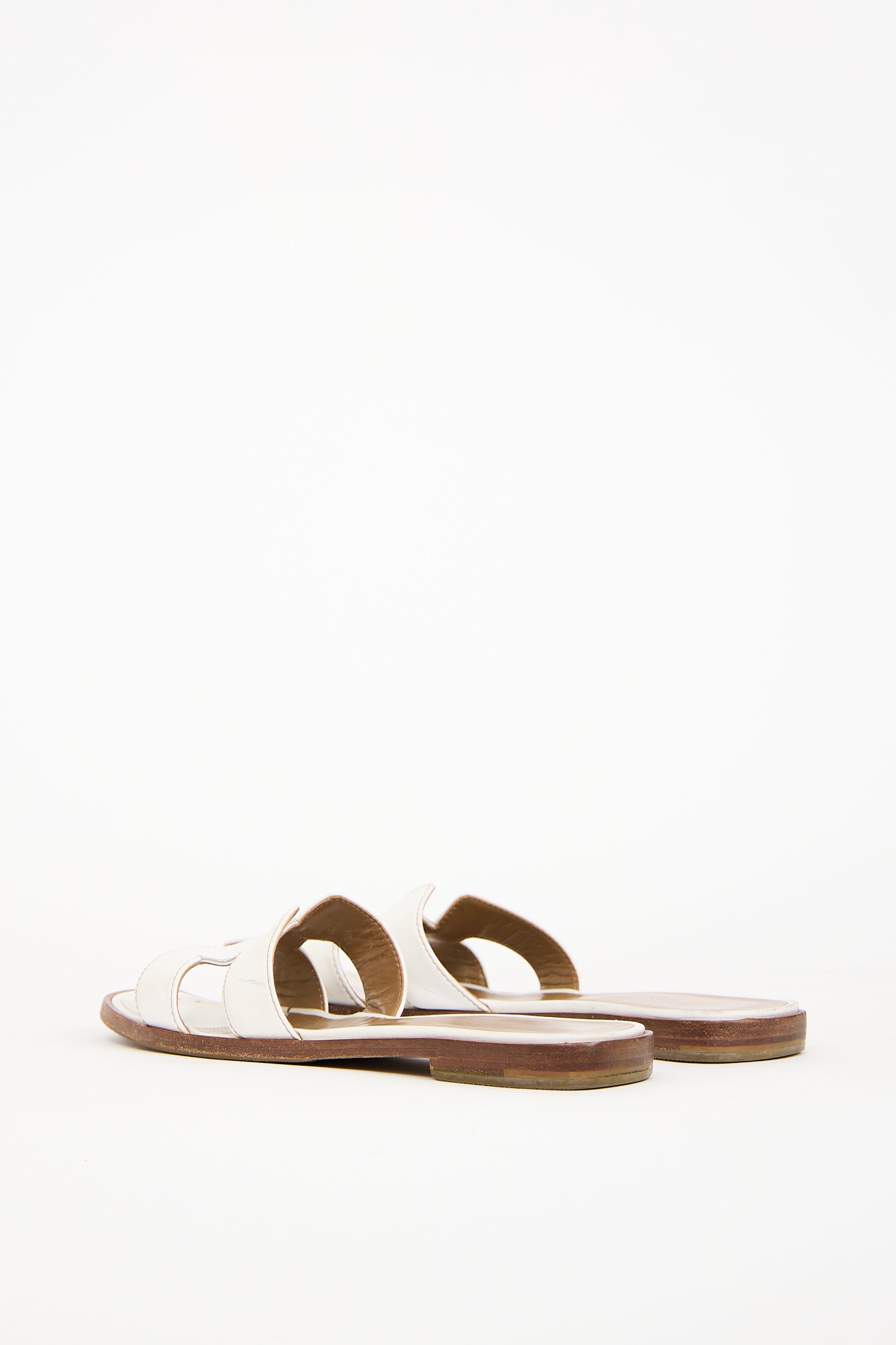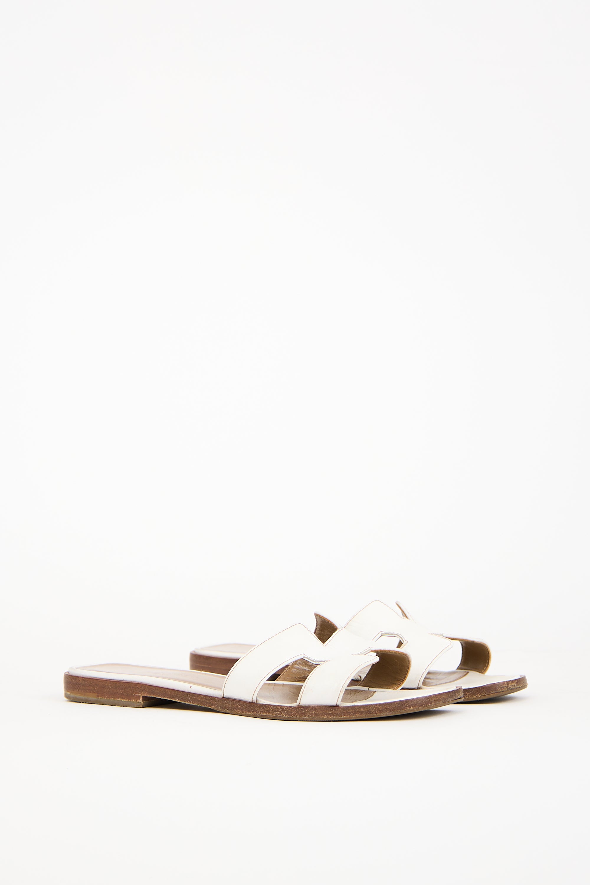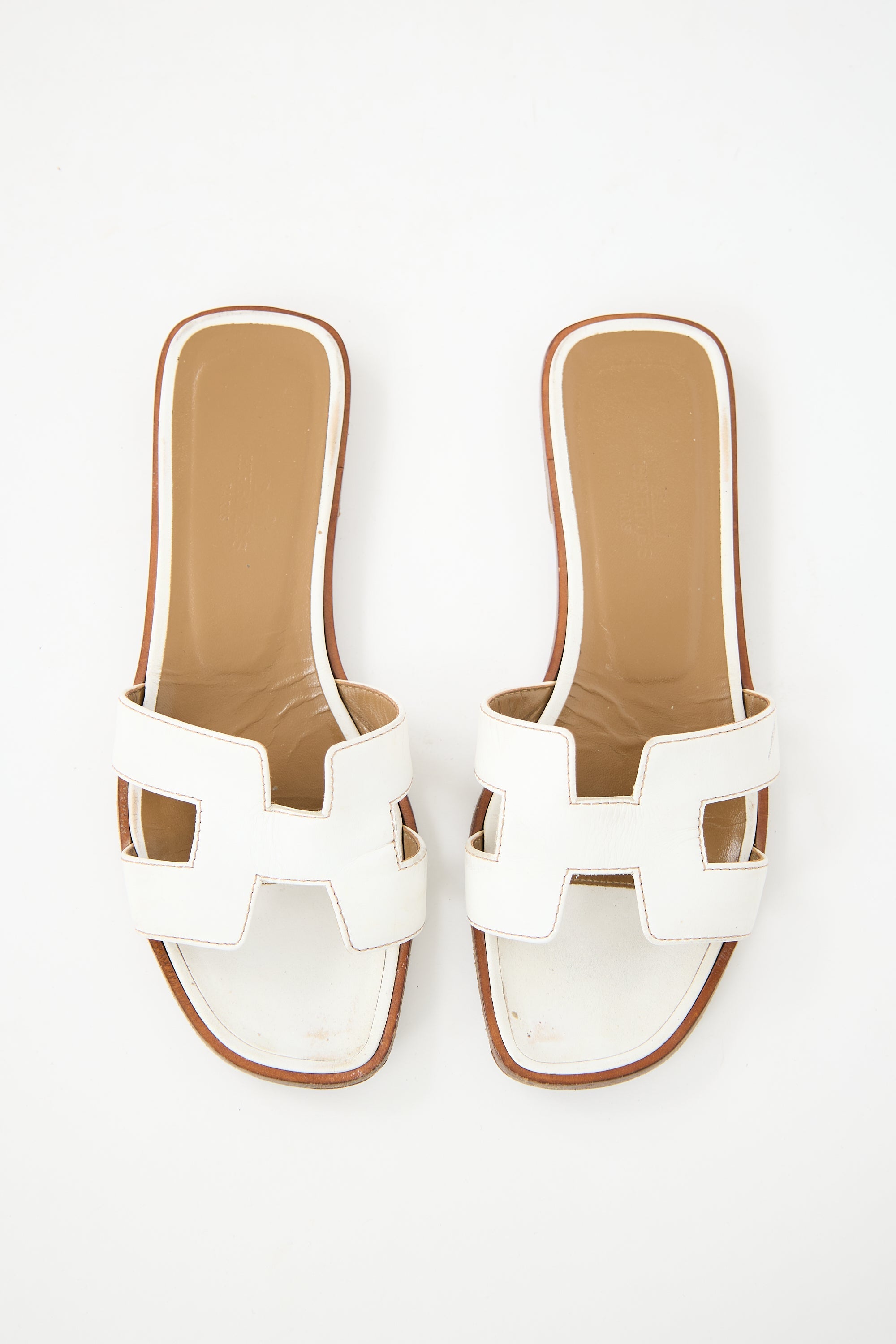 Pre-owned Hermès white havane leather Oran sandals featuring cut out "H" at vamp, tapered square toe, leather insole, and short stacked heel. Includes original dust bag.