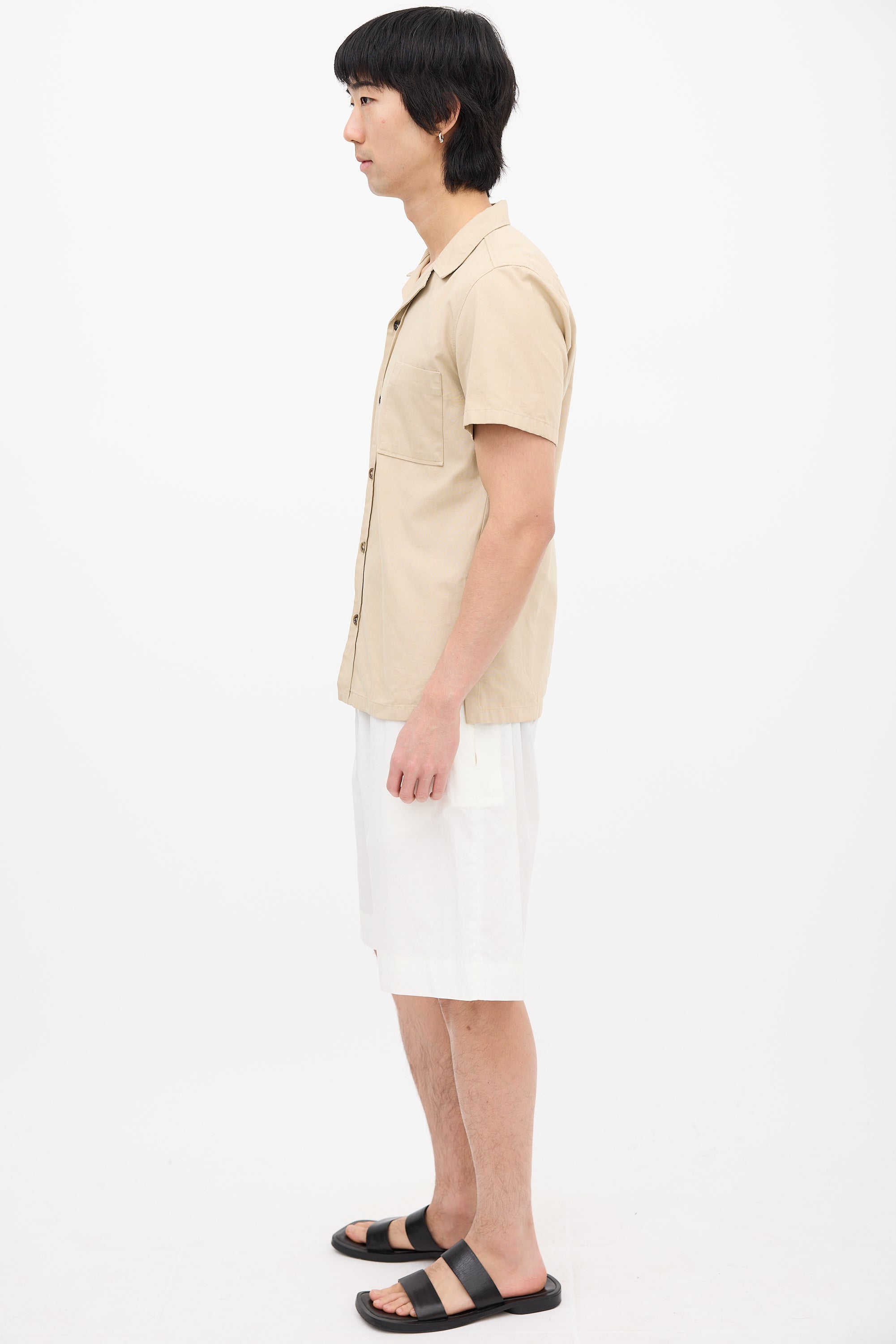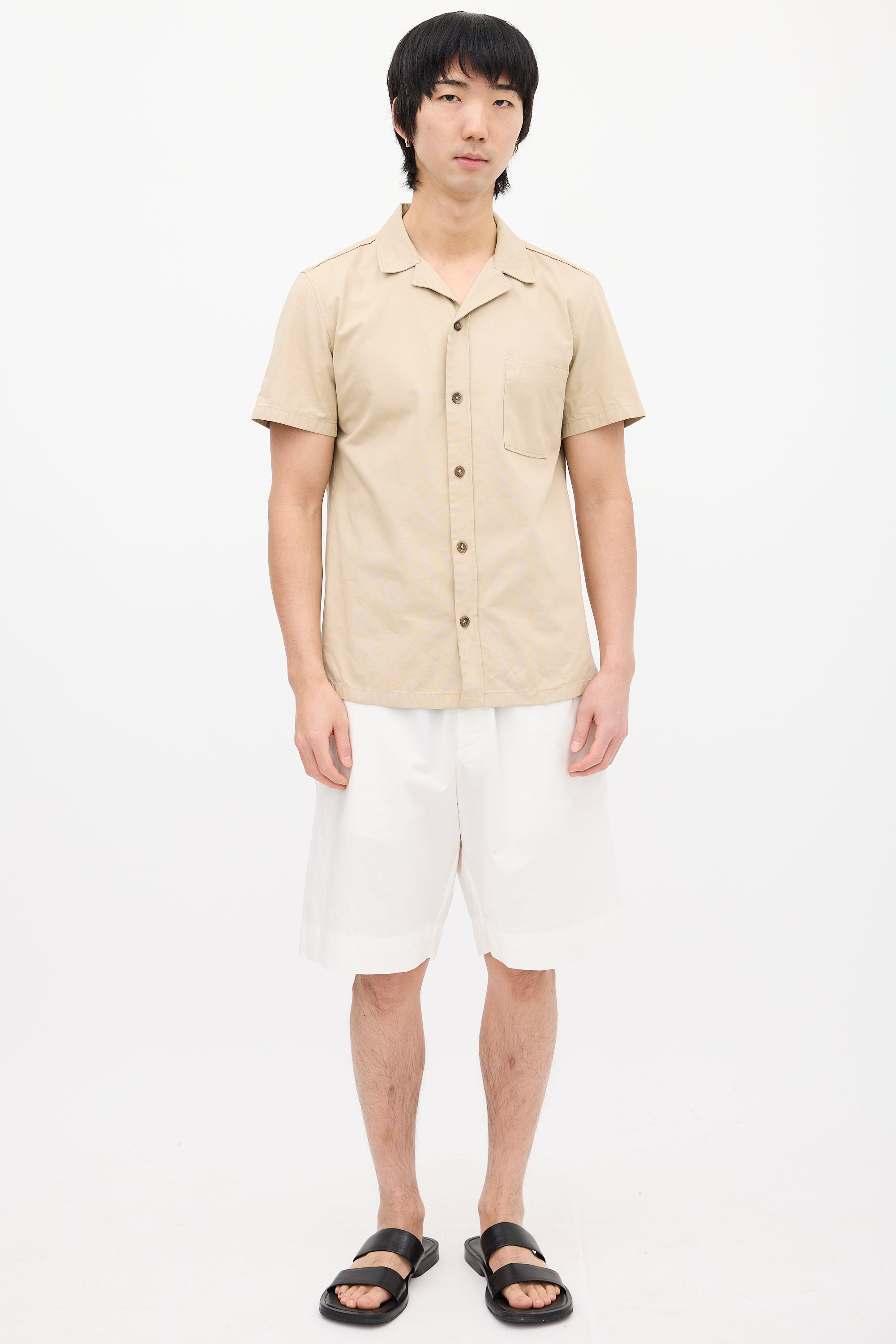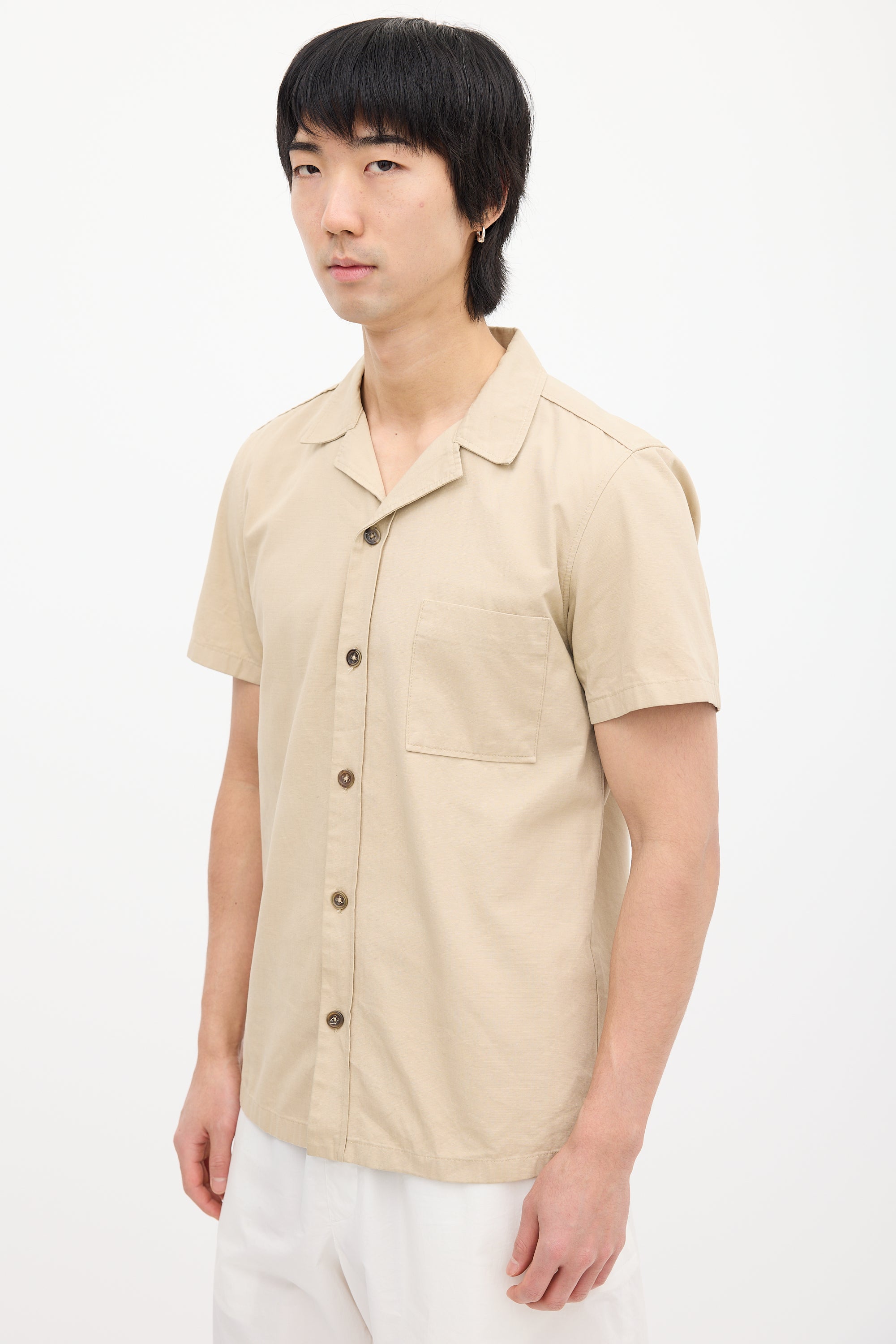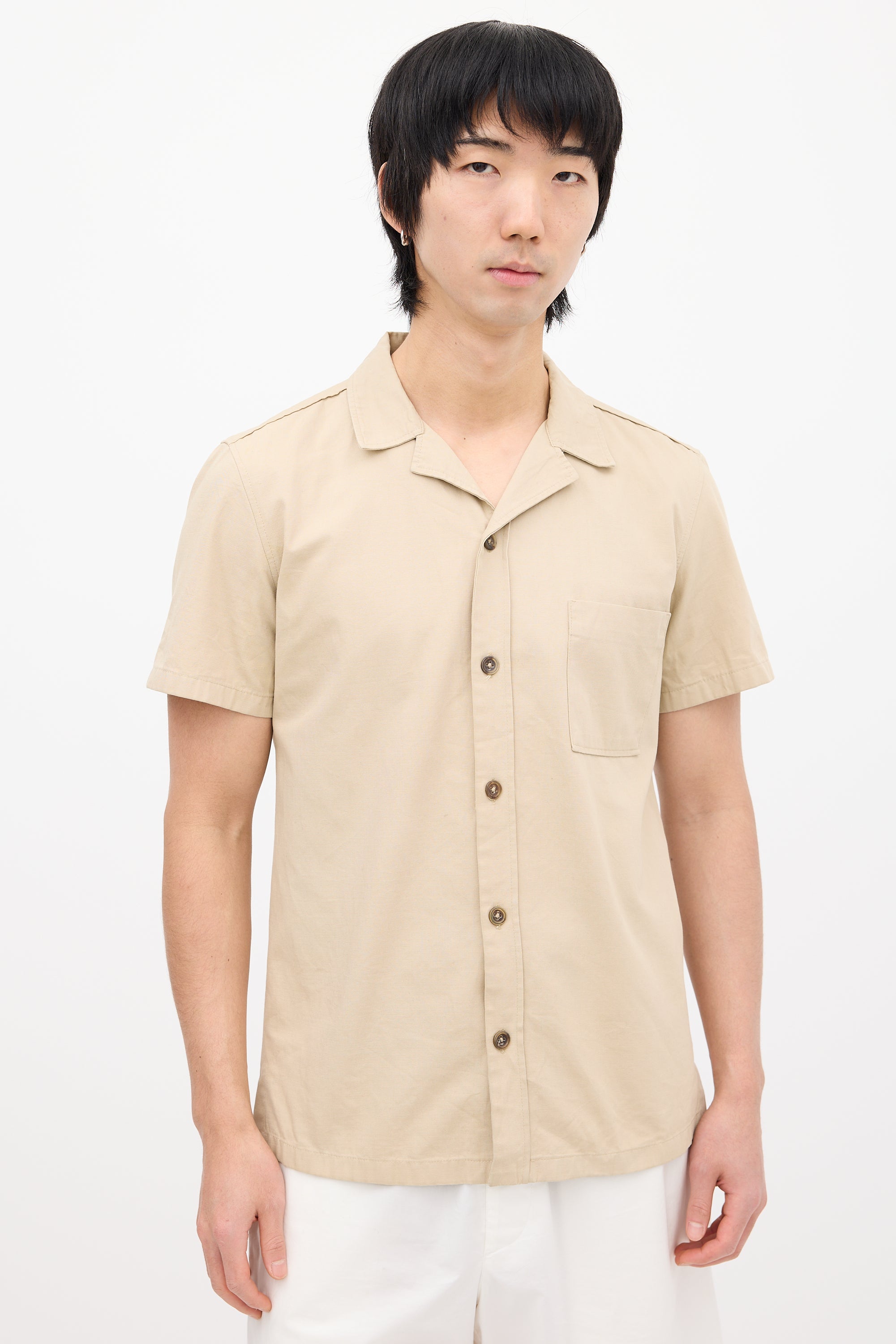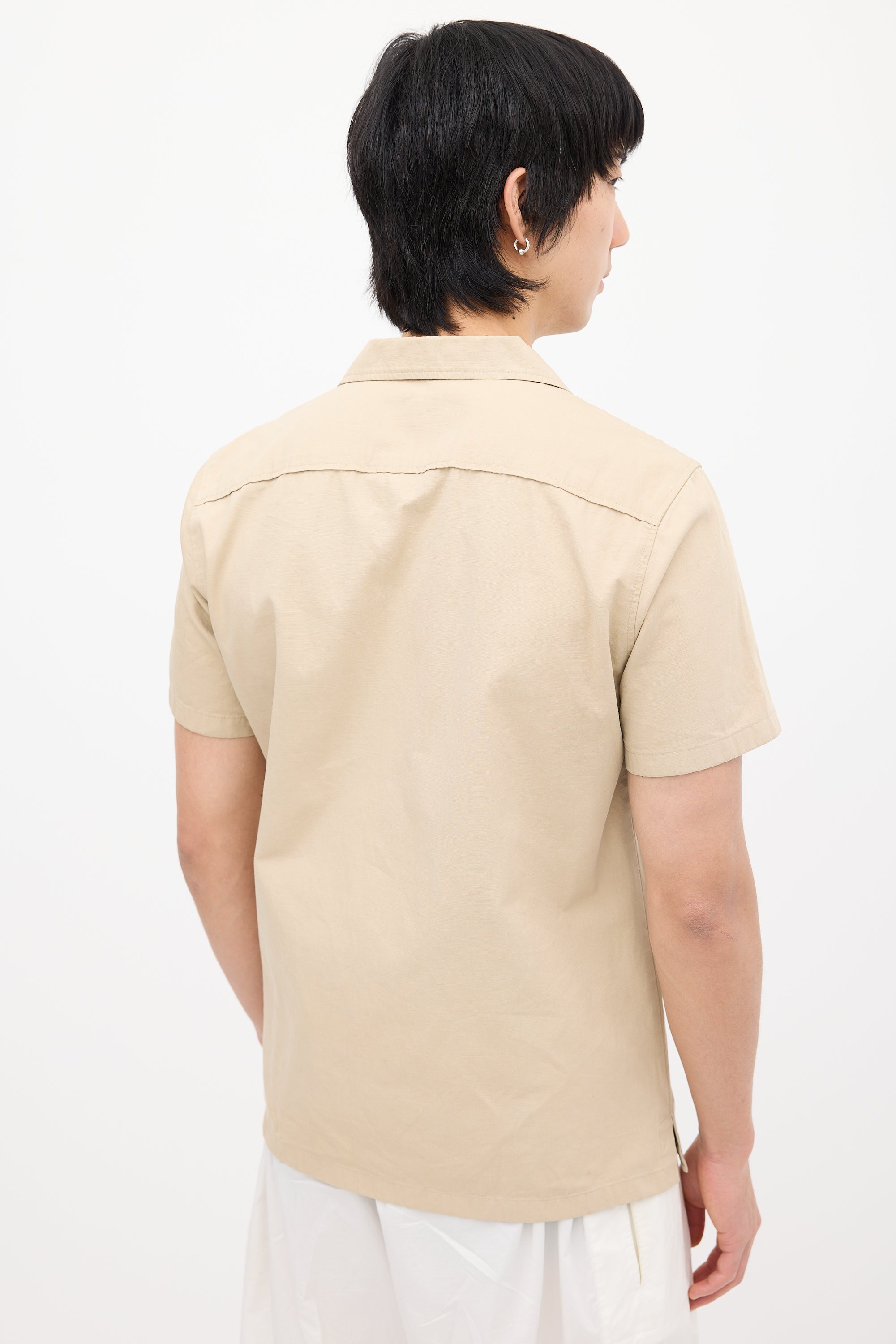 Pre-owned Jil Sander beige shirt featuring a convertible collar, button up front closure, patch pocket at left chest, and short sleeves.