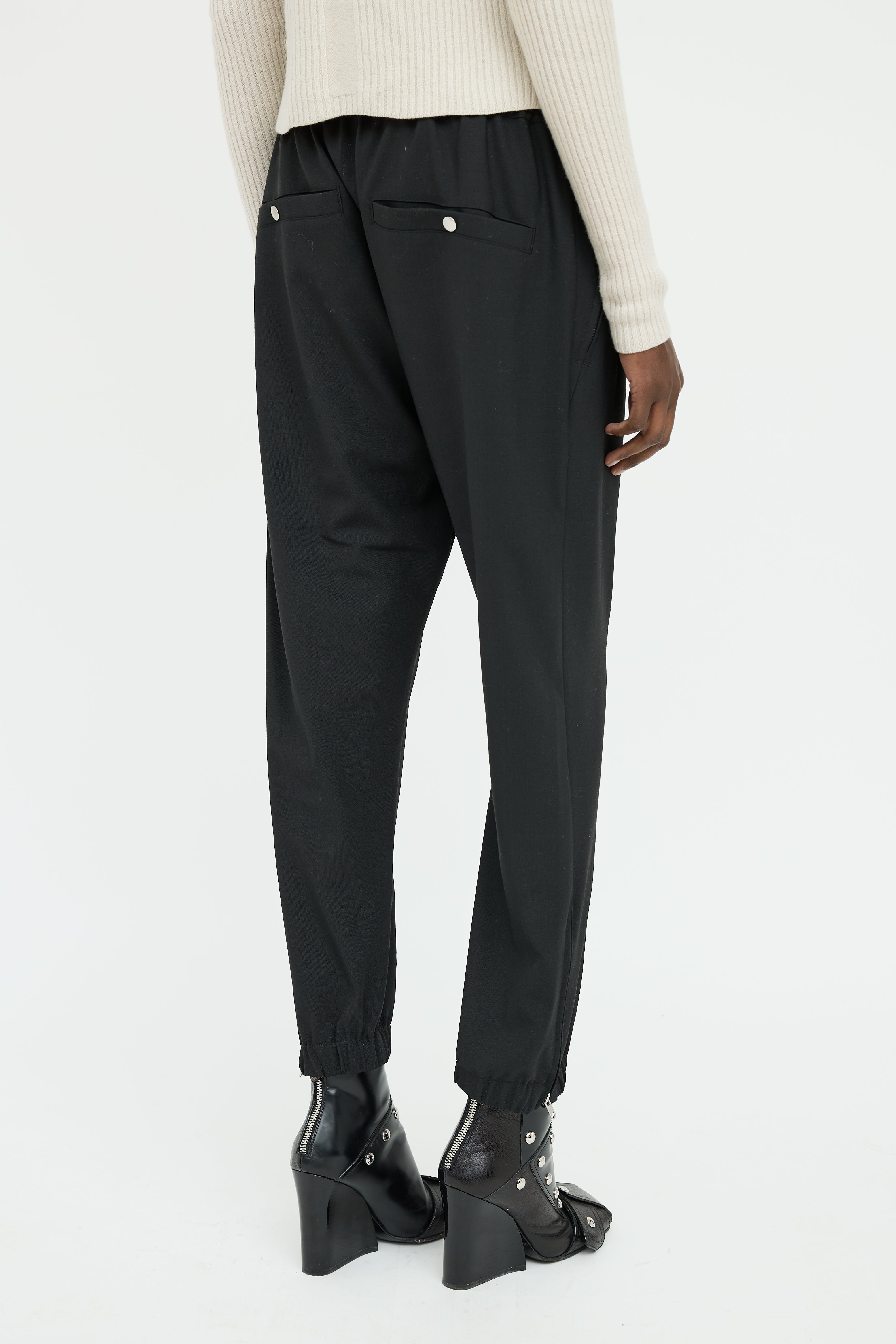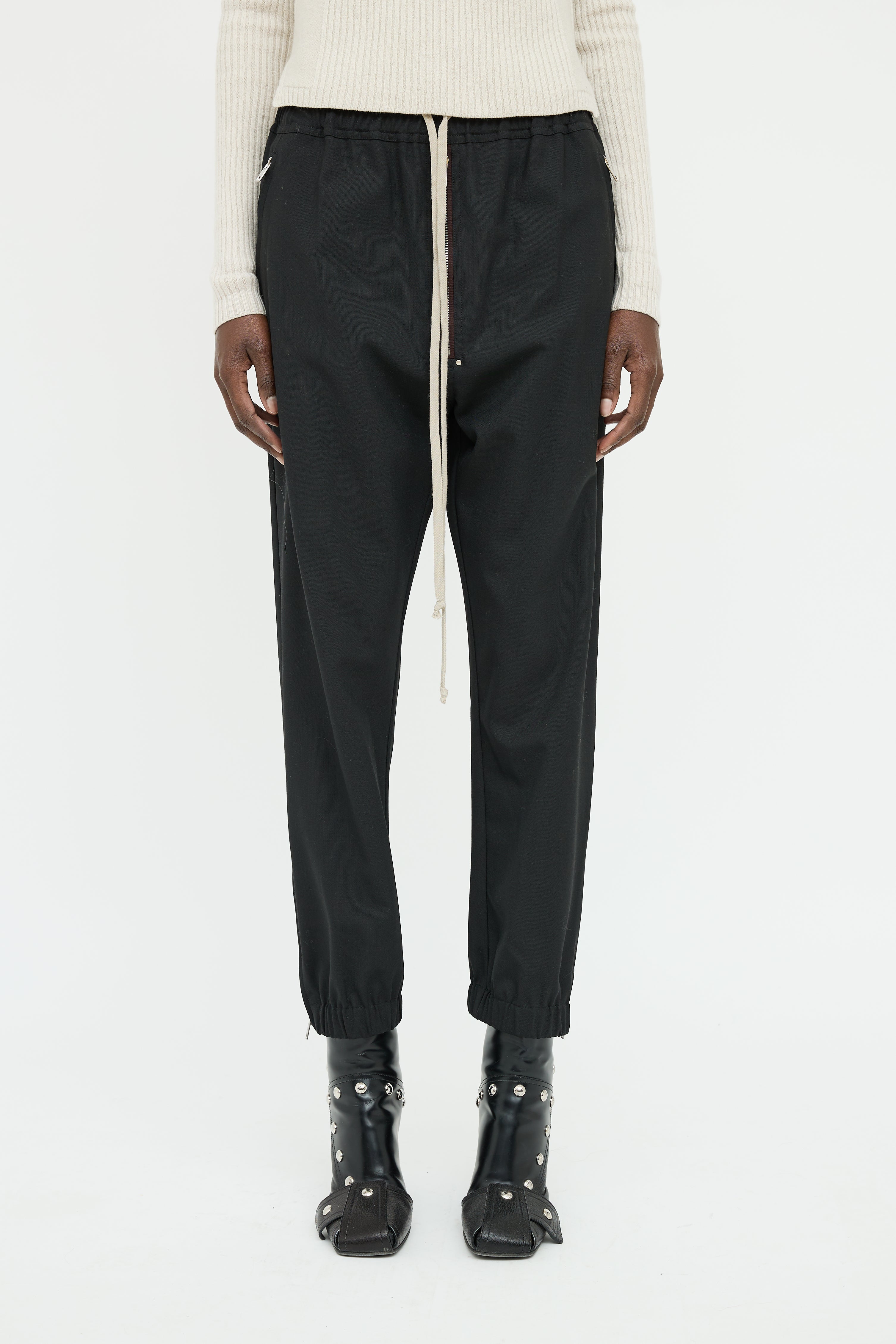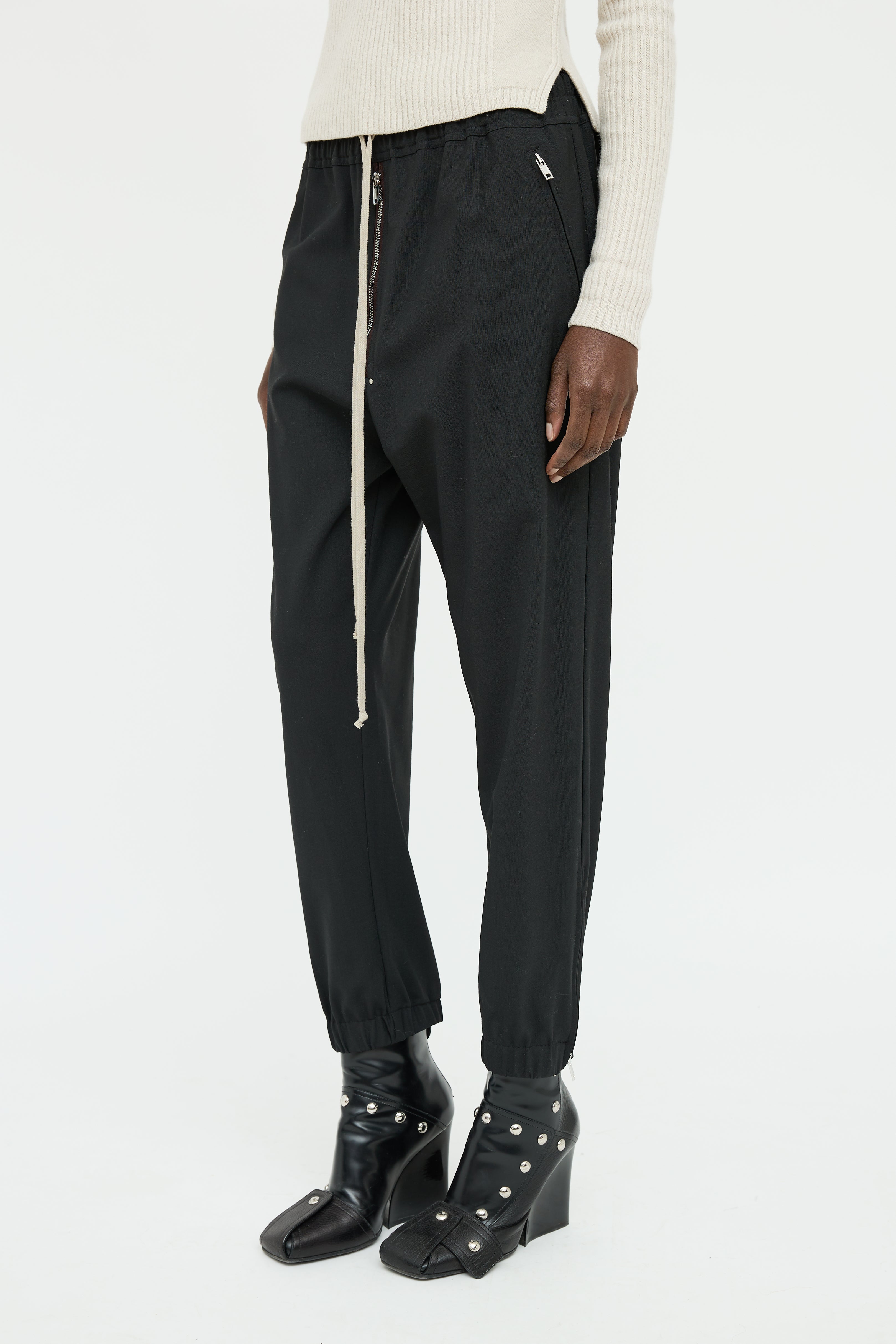 Pre-owned Rick Owens black F/W 2020 pants featuring elastic waist with drawstring, drop seat styling, dual zip pockets on hip, zip front, zip ankle with elastic cuff and snap button pockets on back.