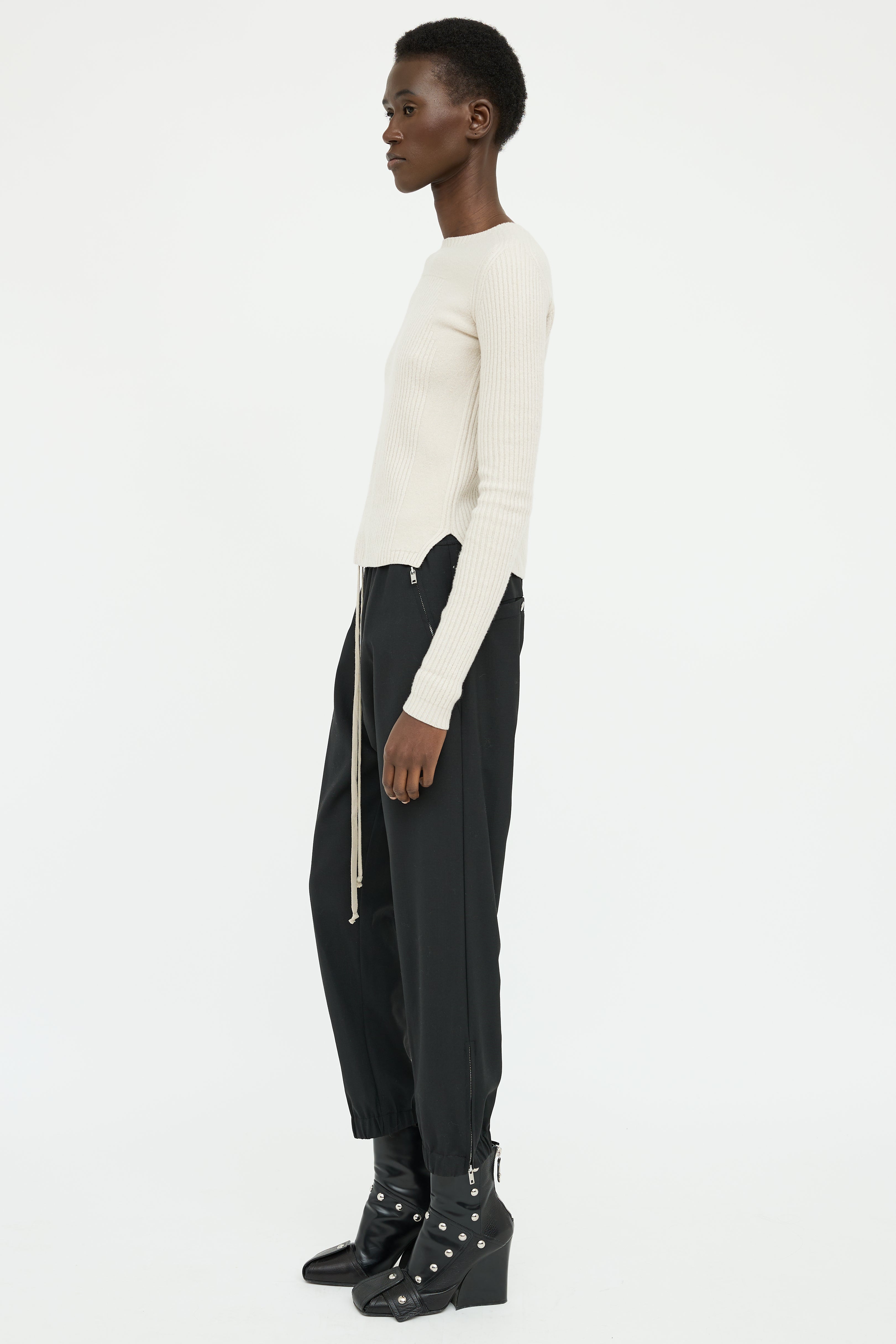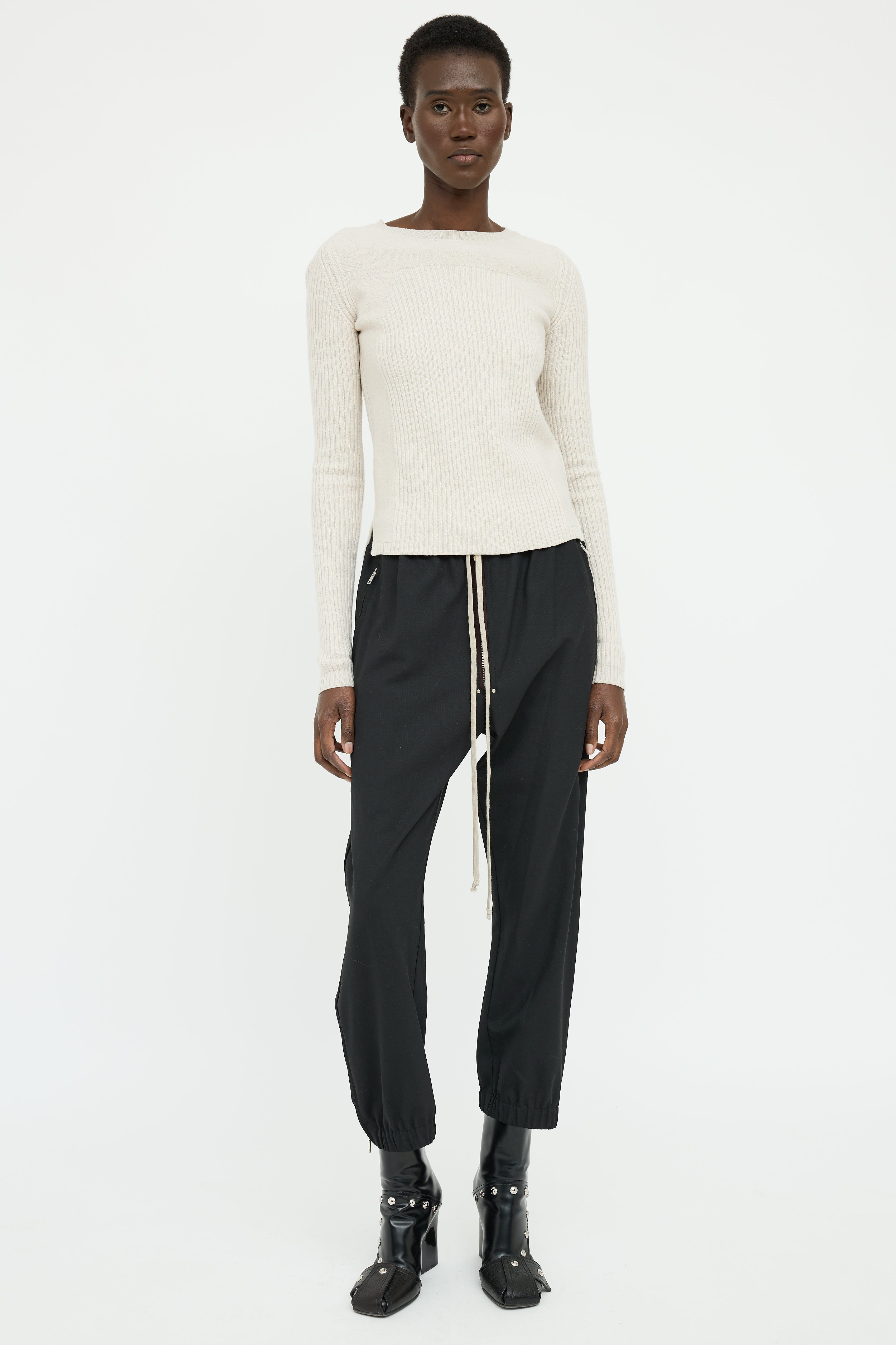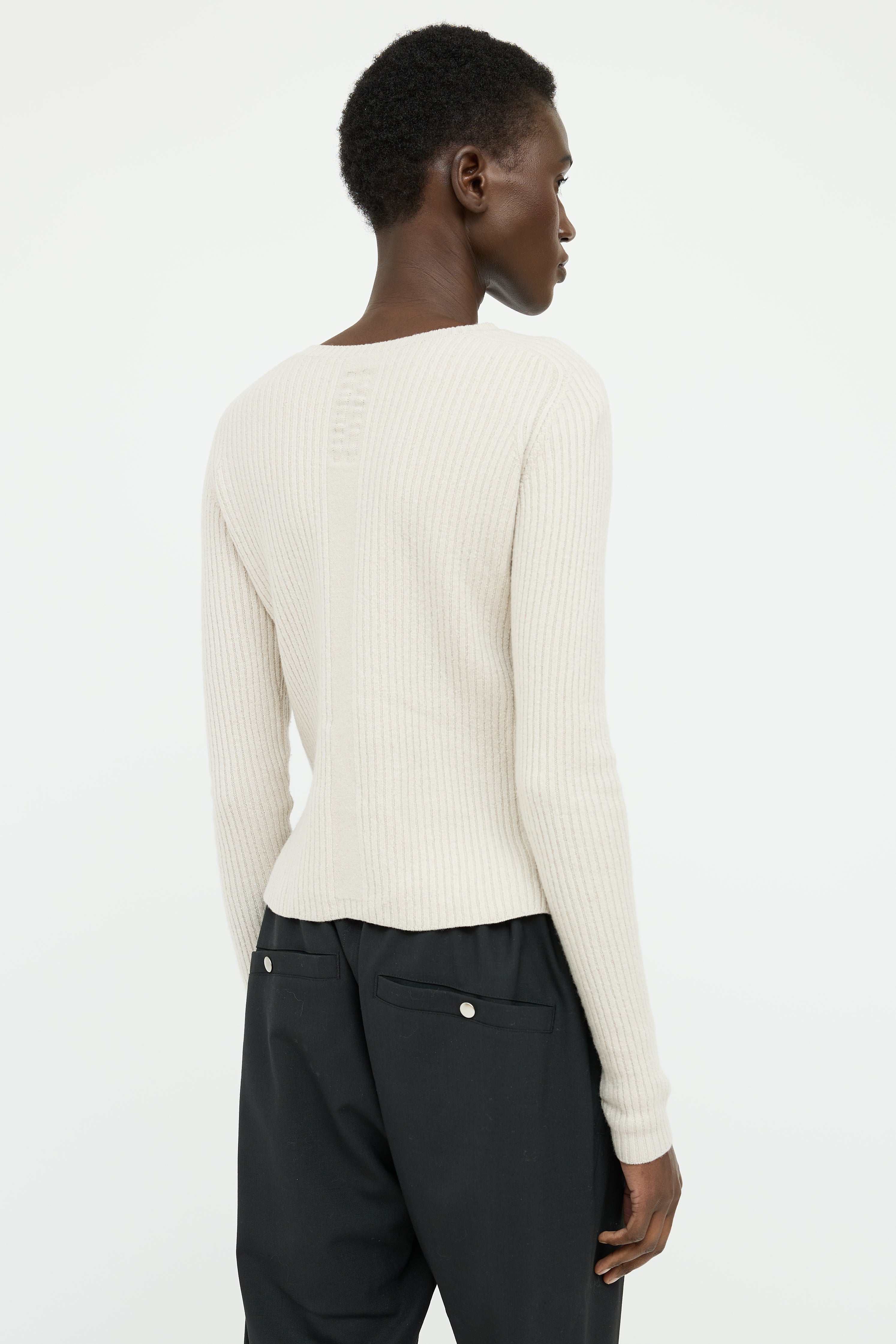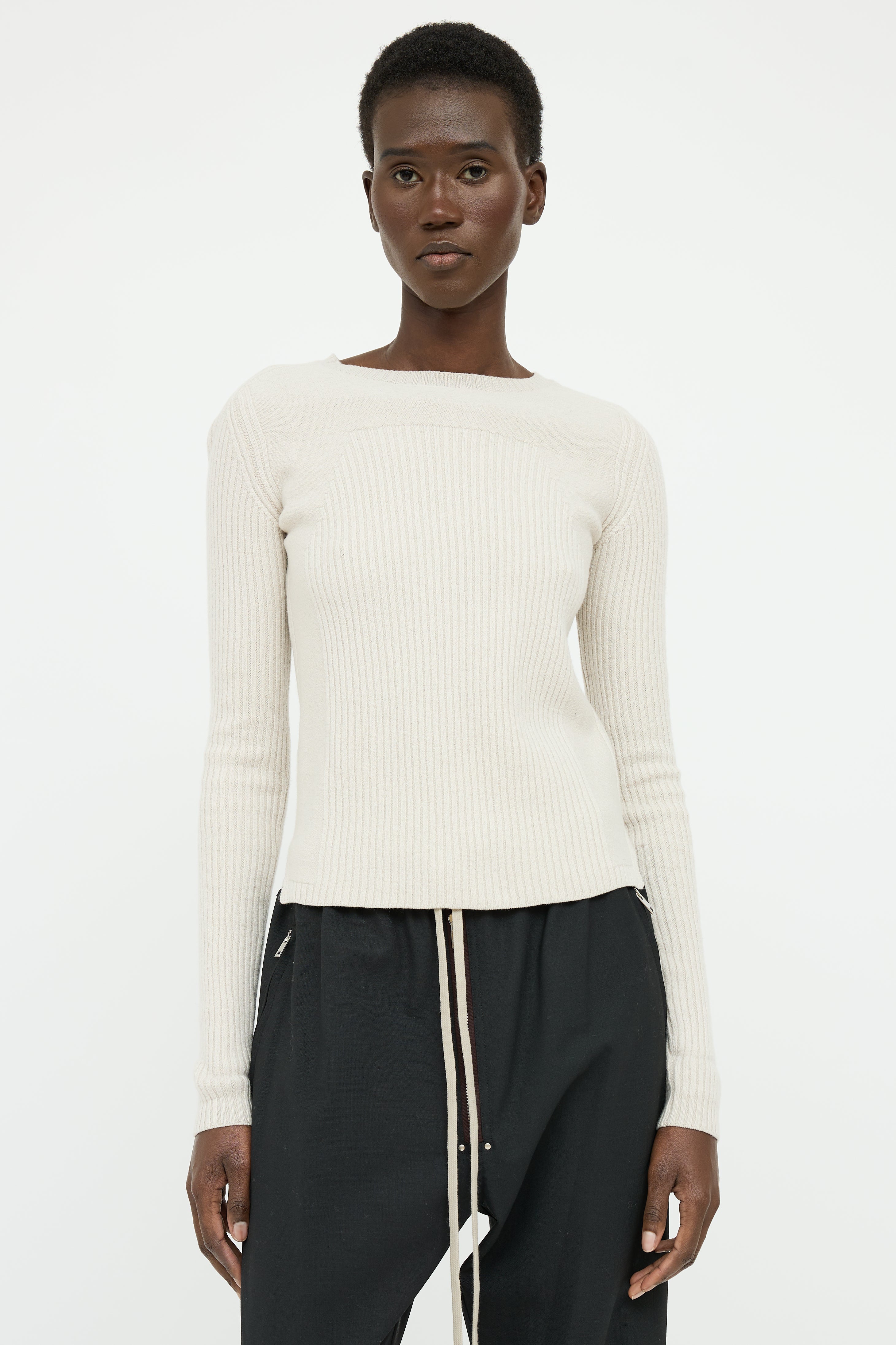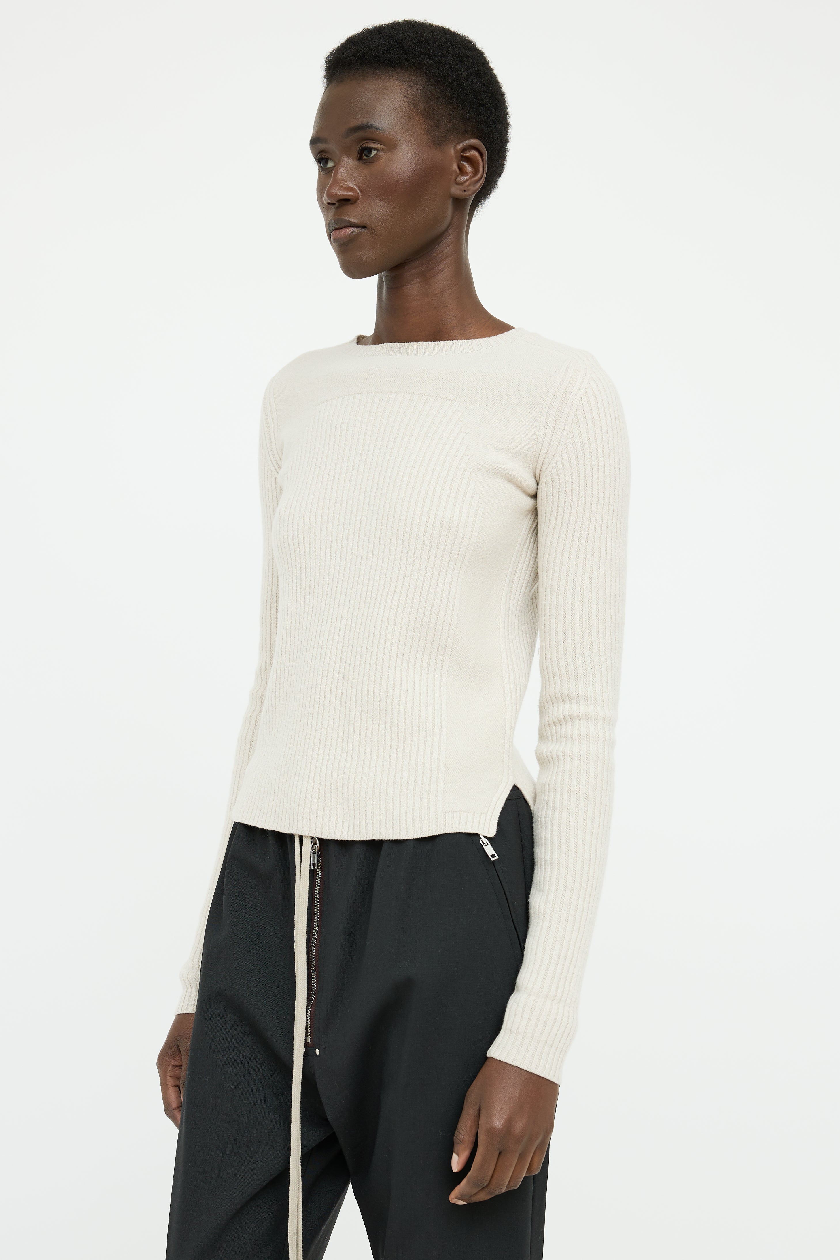 Pre-owned Rick Owens S/S 2020 Cream Lana long sleeve wool ribbed sweater featuring round neck and dual slit on hem.