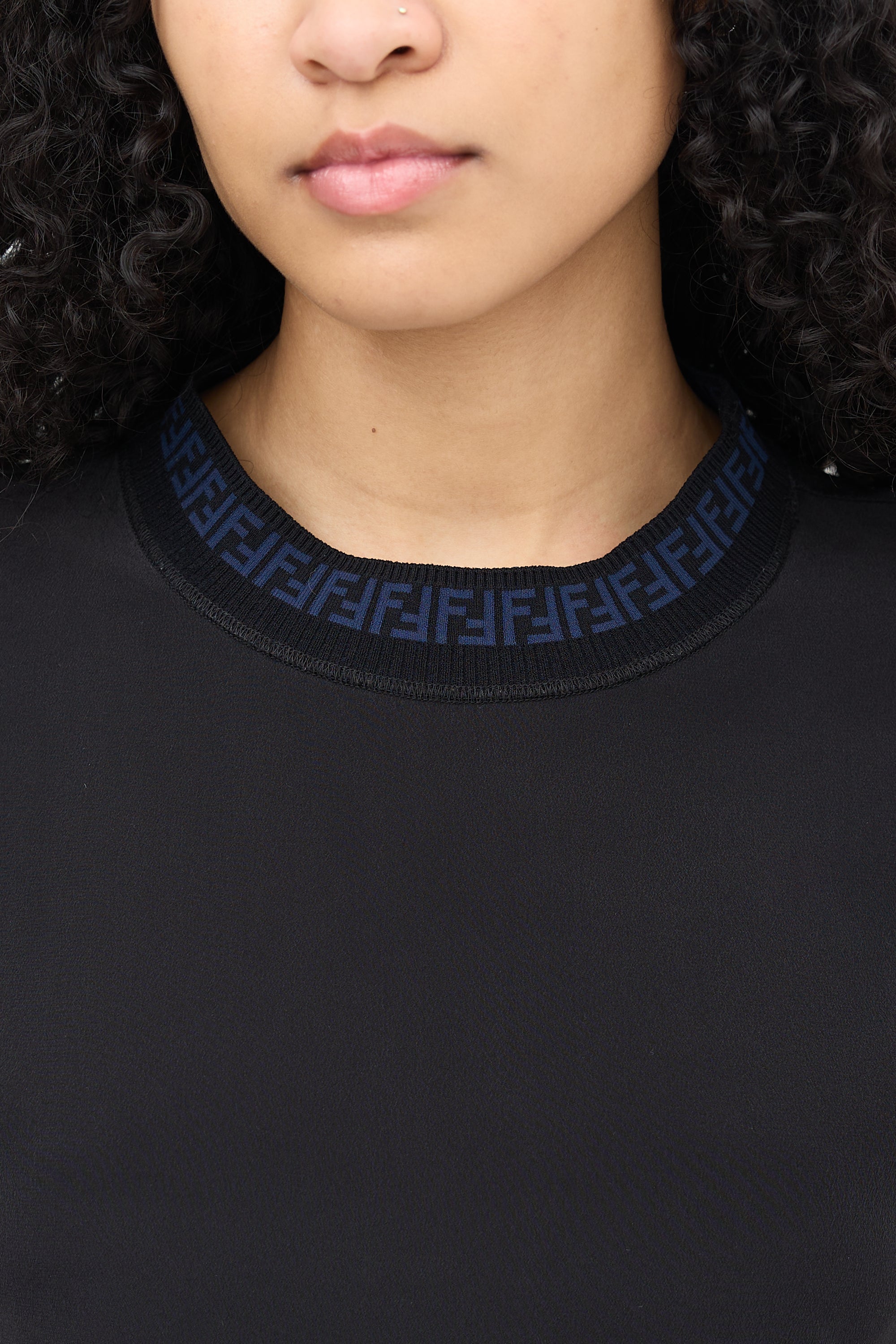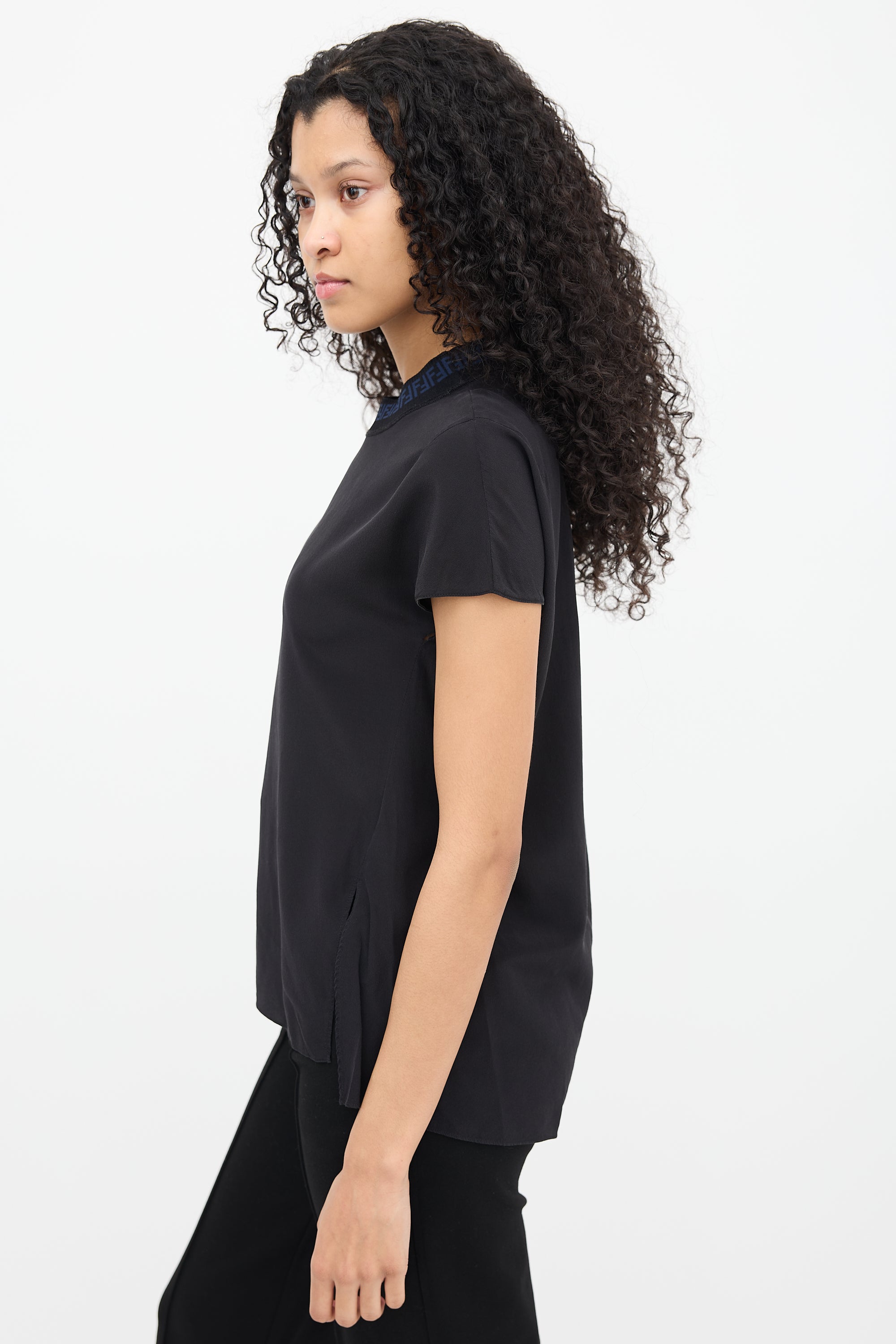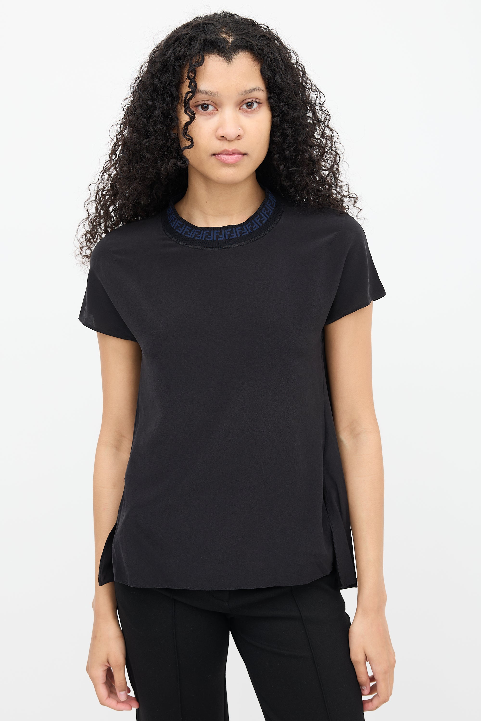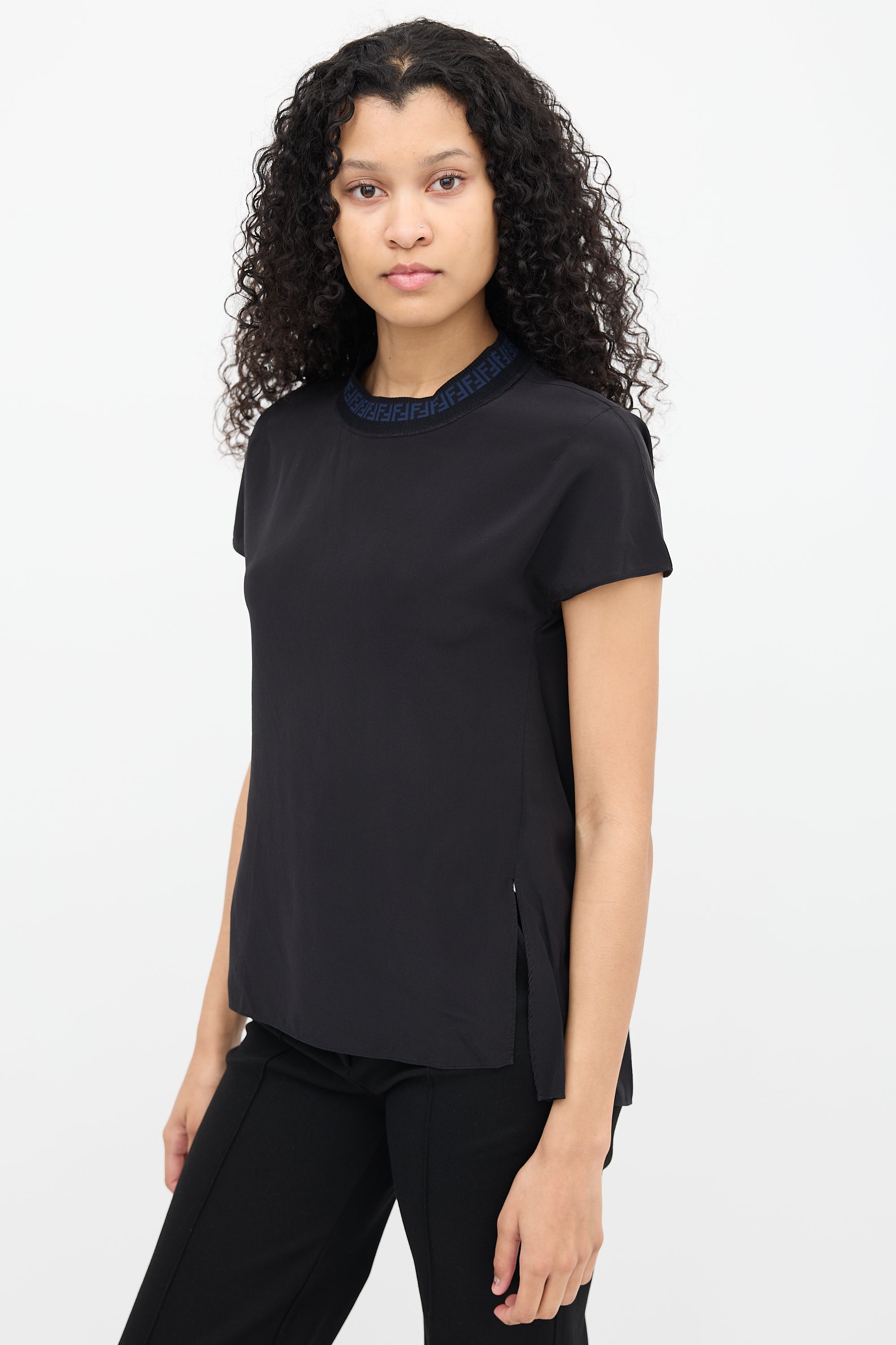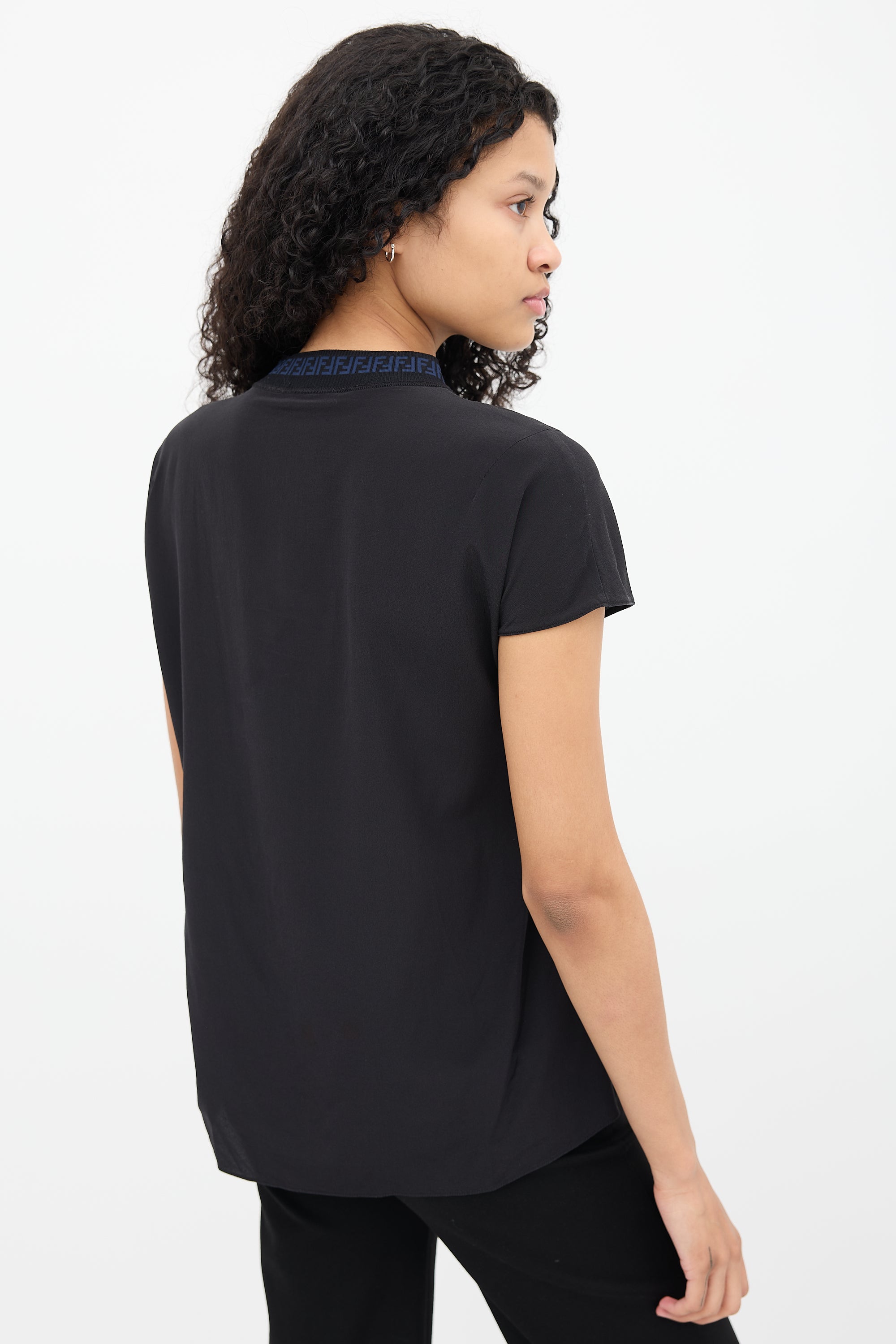 Pre-owned Fendi black silk blouse featuring a crew neckline with FF logo knit, cap sleeves, and two side vents.