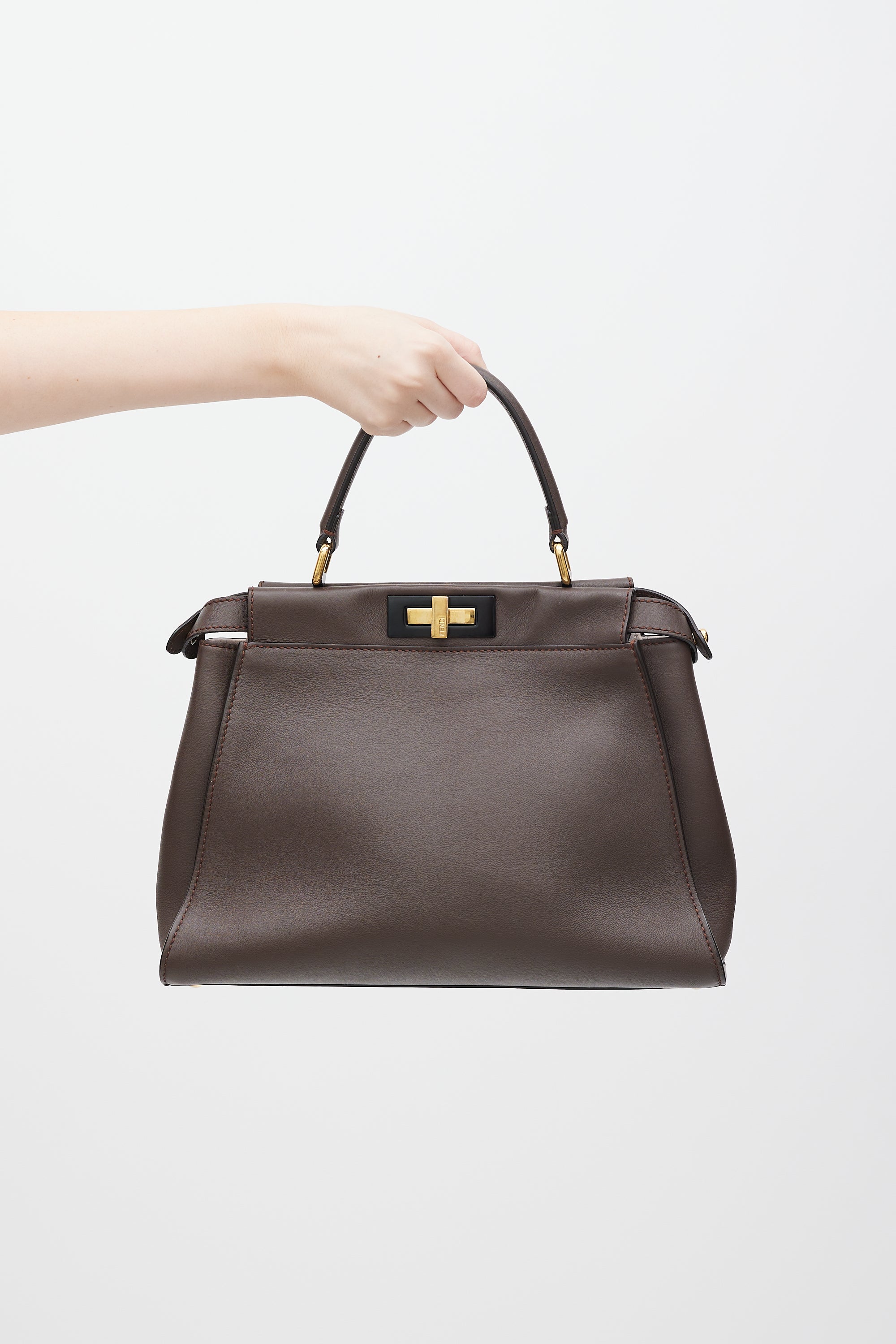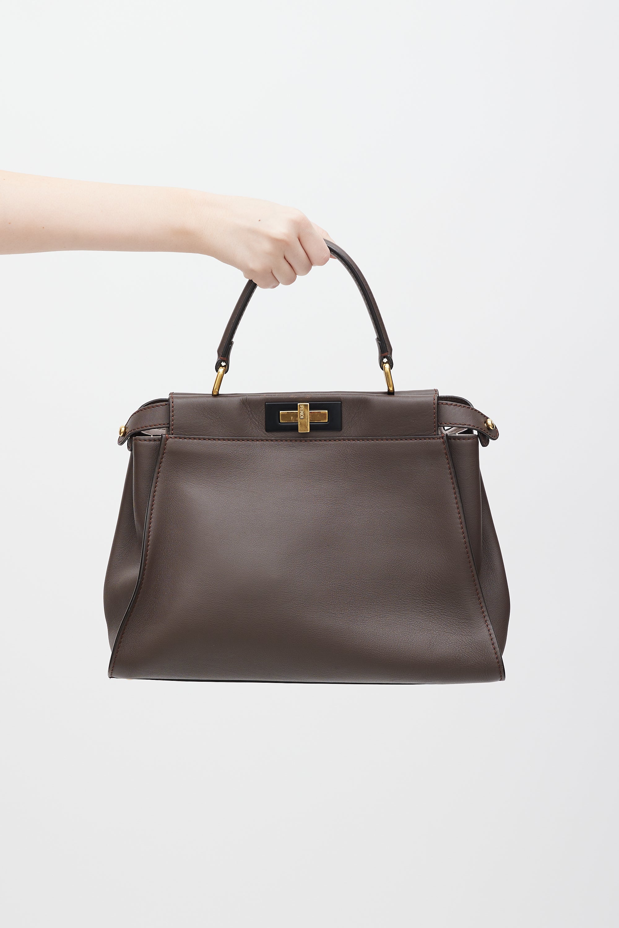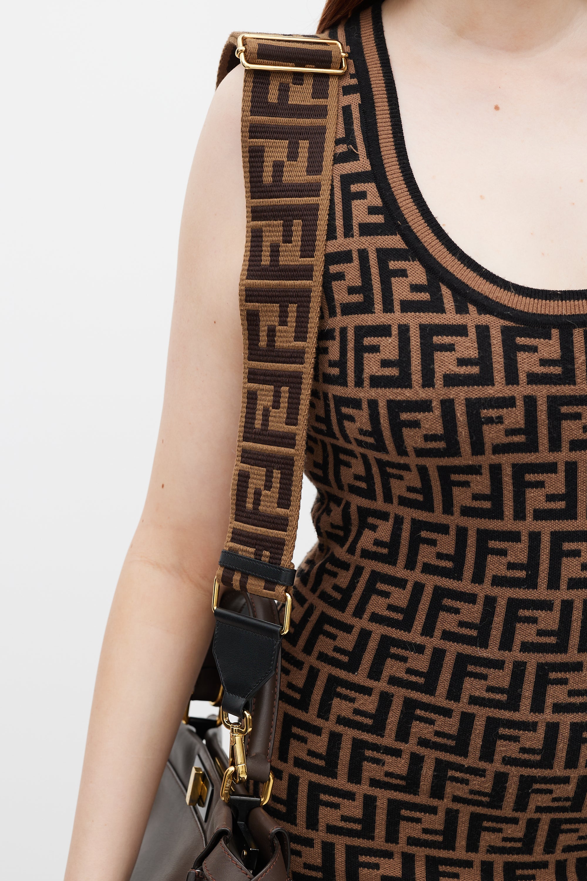 Pre-owned Fendi brown medium Peekaboo bag featuring single top handle, tonal stitching, gold tone hardware, five protective feet at base, detachable and adjustable leather shoulder strap, detachable and adjustable wide canvas strap with FF monogram intarsia throughout, dual turn lock closures, pink interior, and two main compartments with single interior zip pocket.