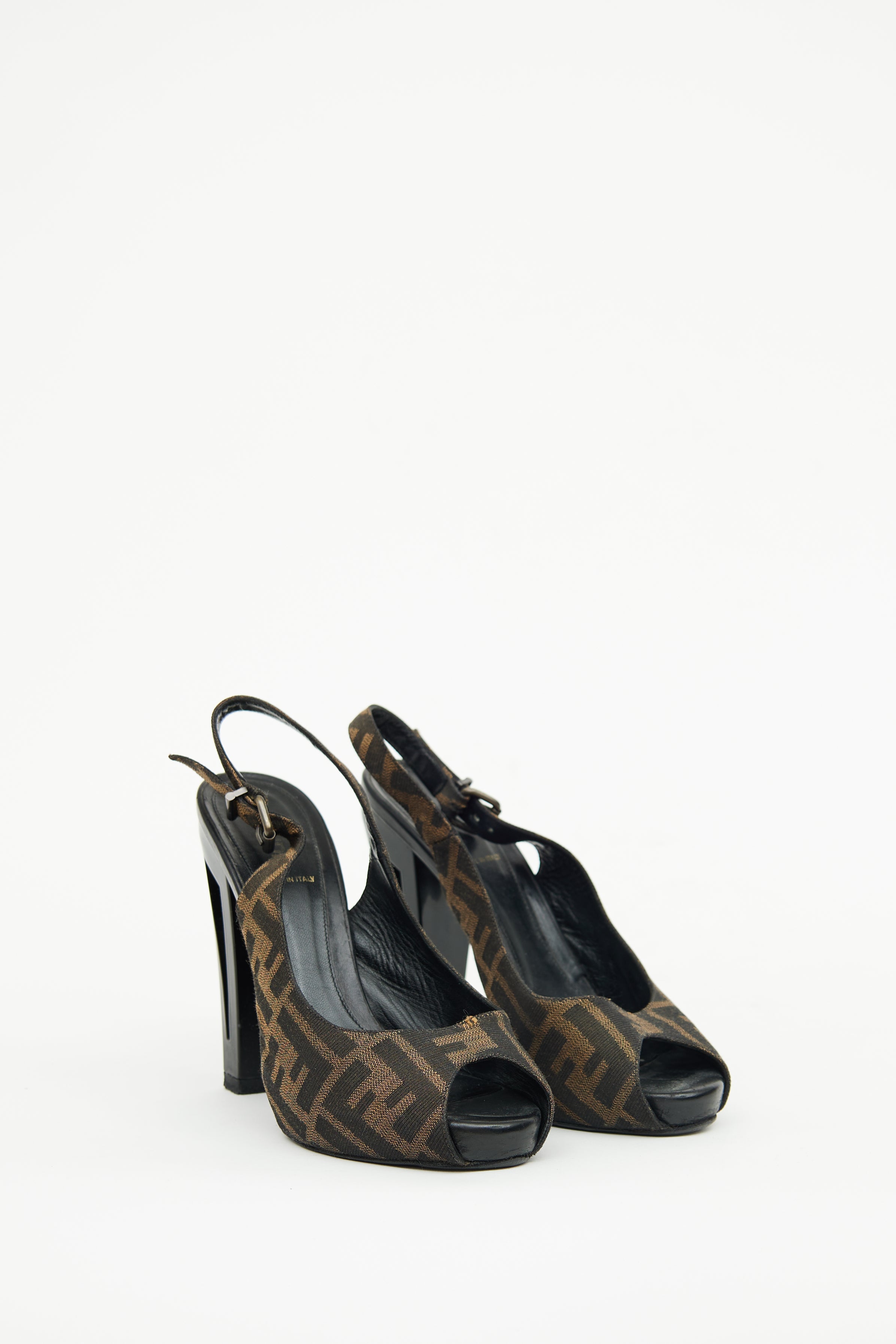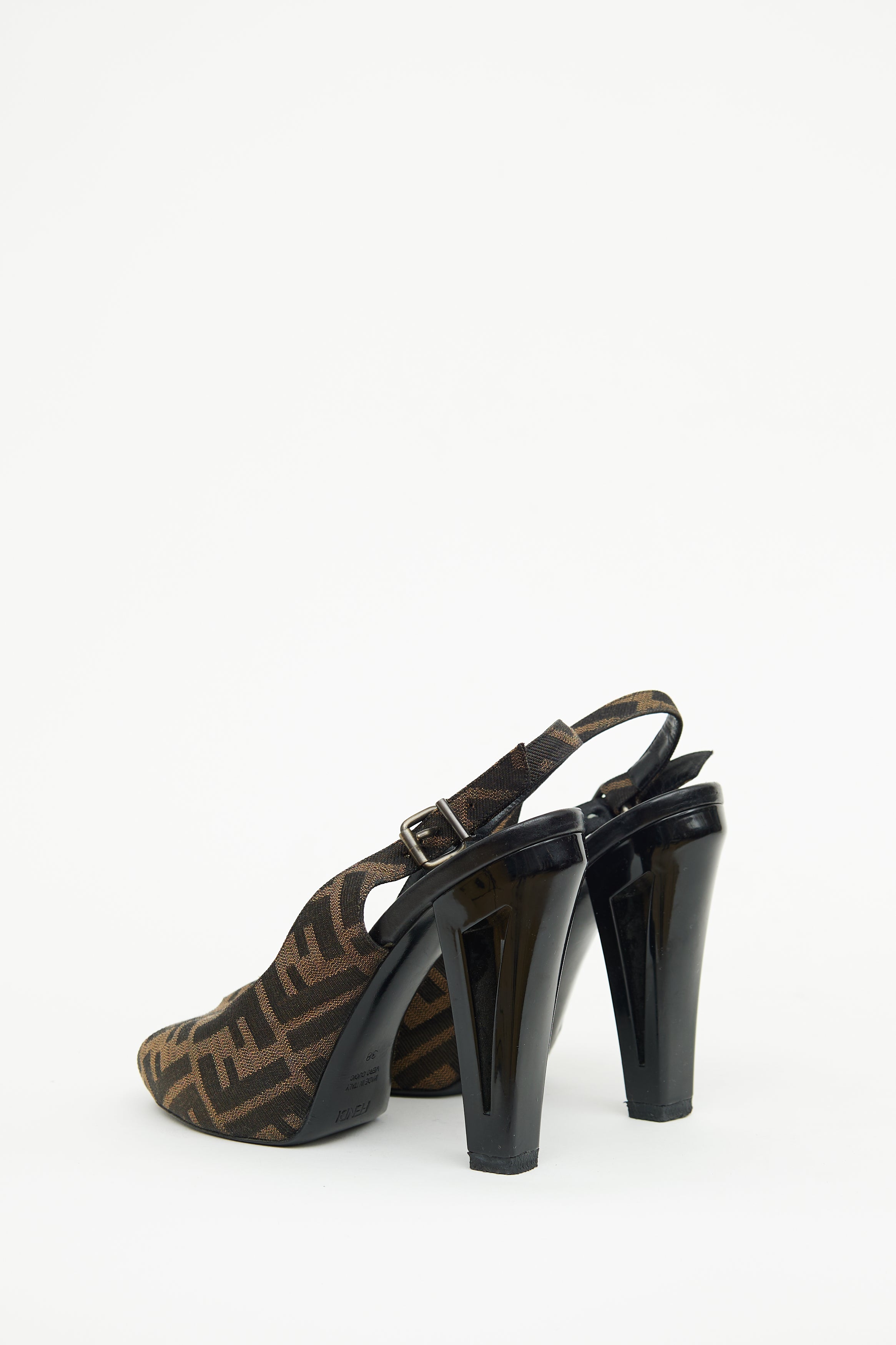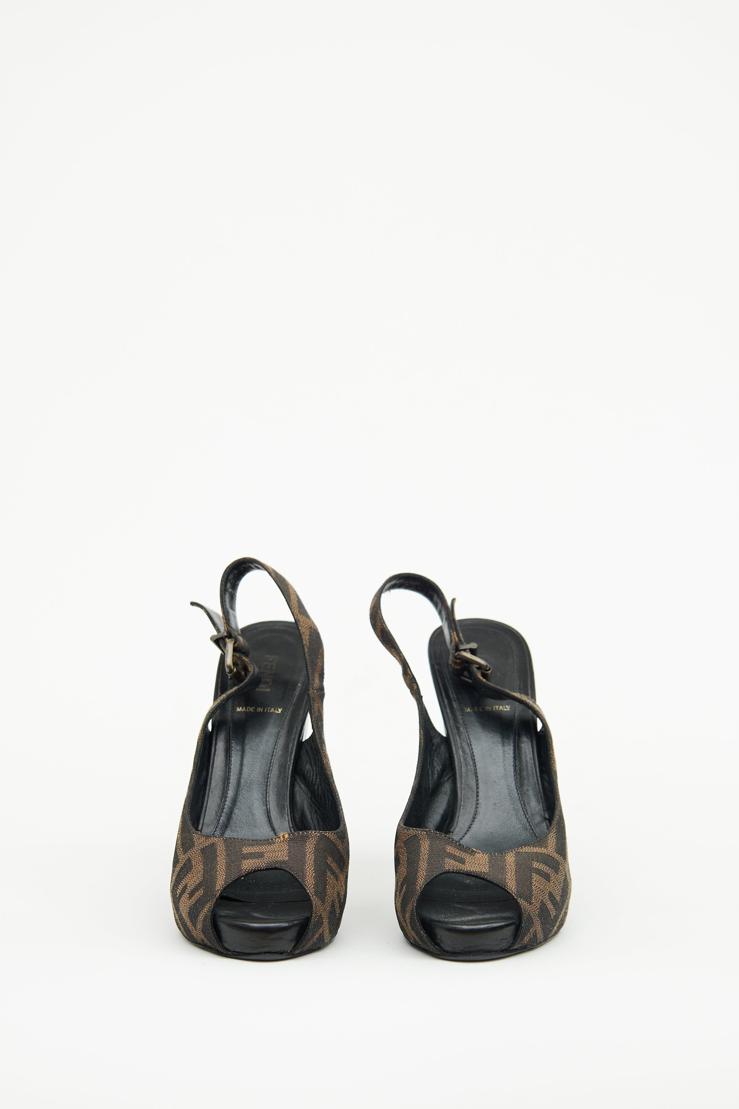 Pre-owned Fendi brown Zucca heels featuring peep toe, canvas logo print upper, adjustable slingback strap with bronze gunmetal tone hardware, patent leather block heel with cut out detail FF logo and leather outsole.