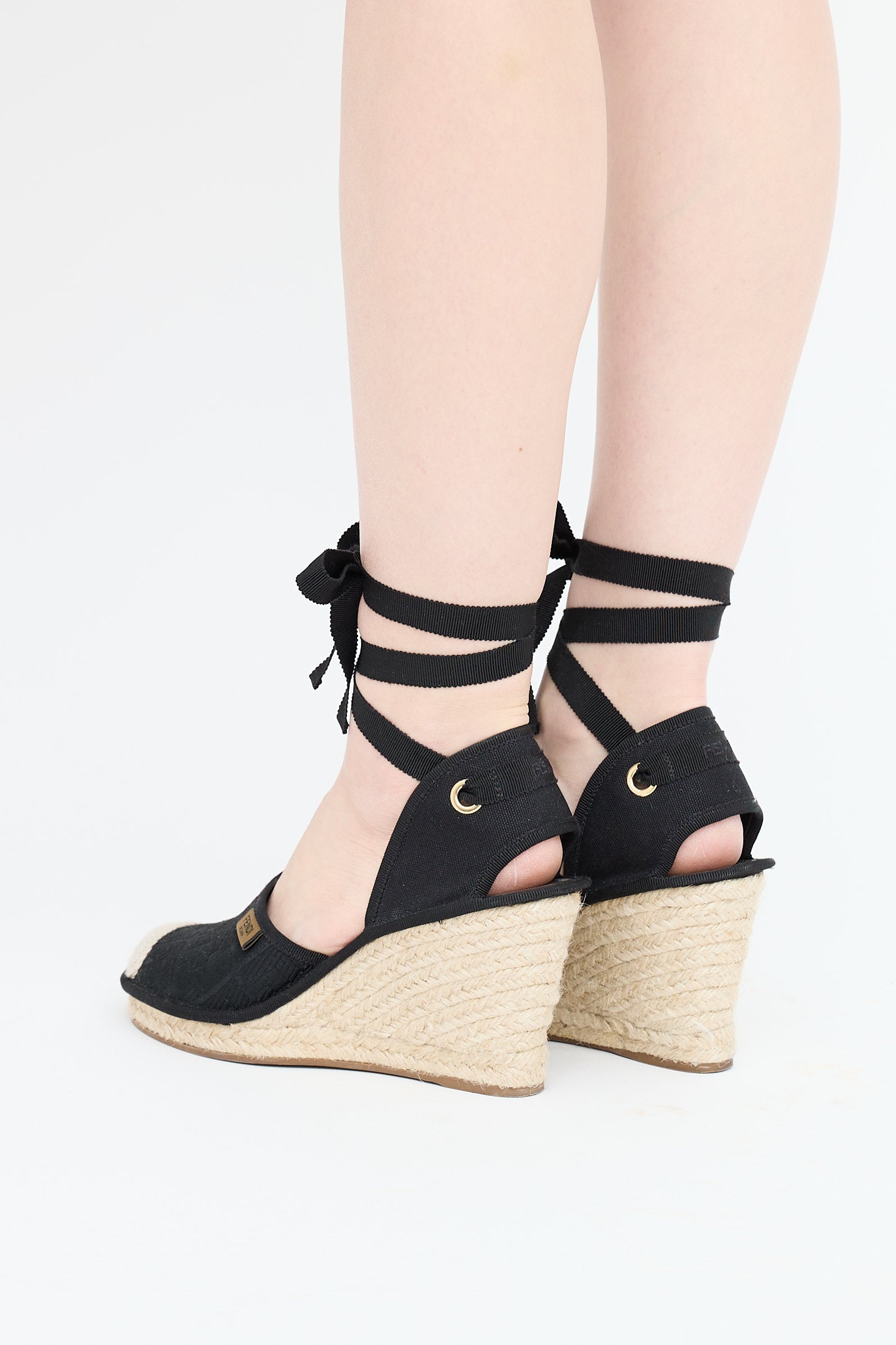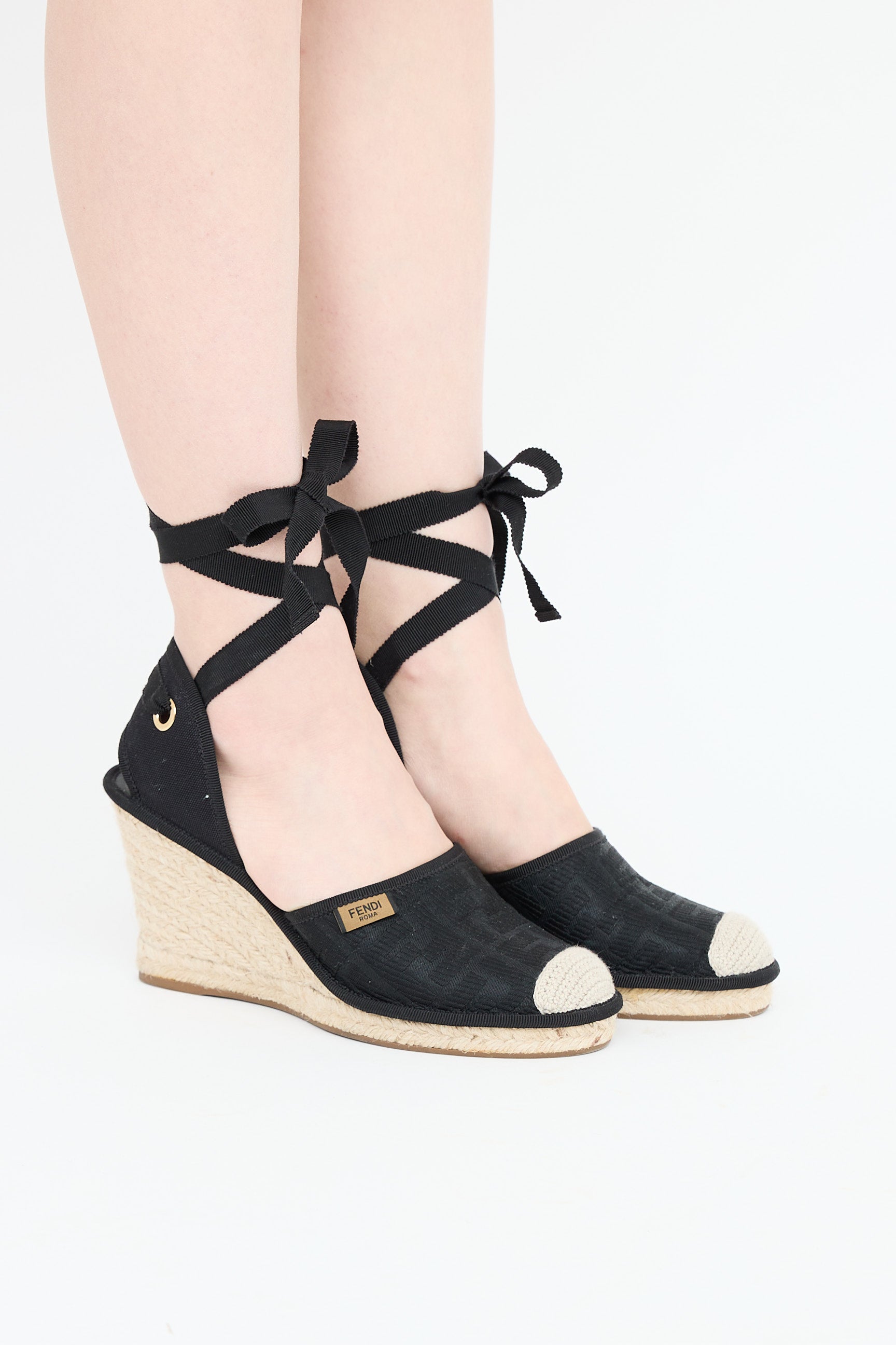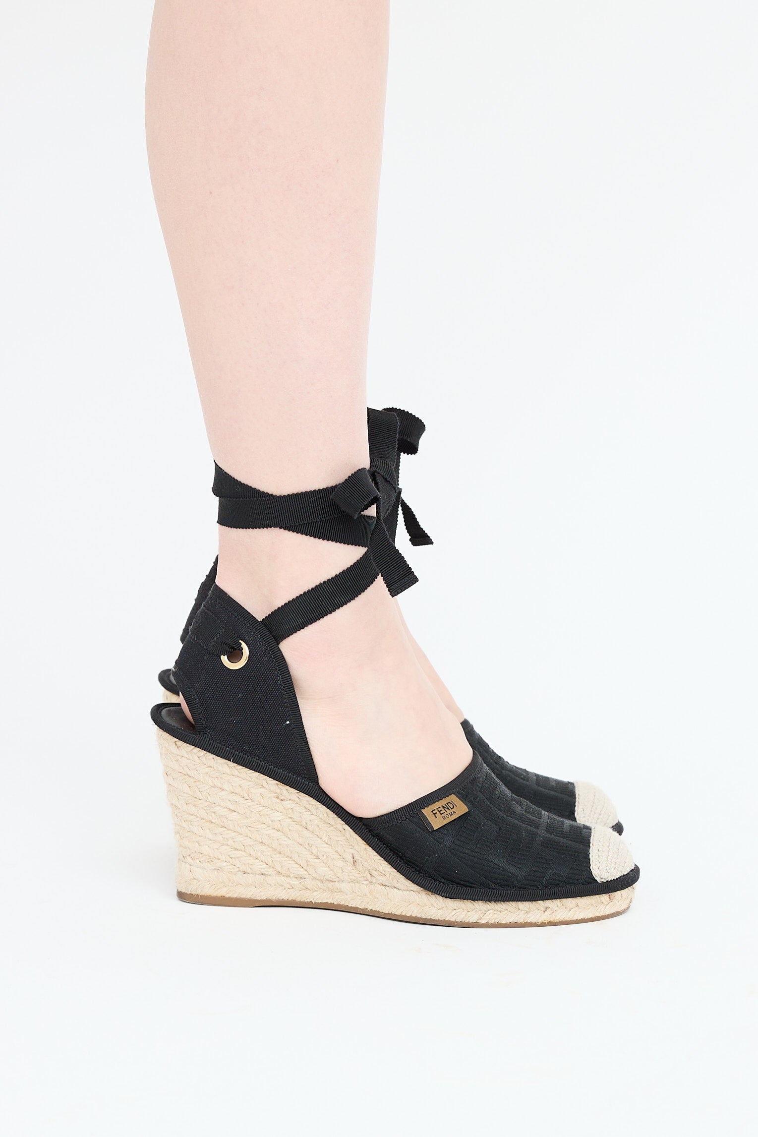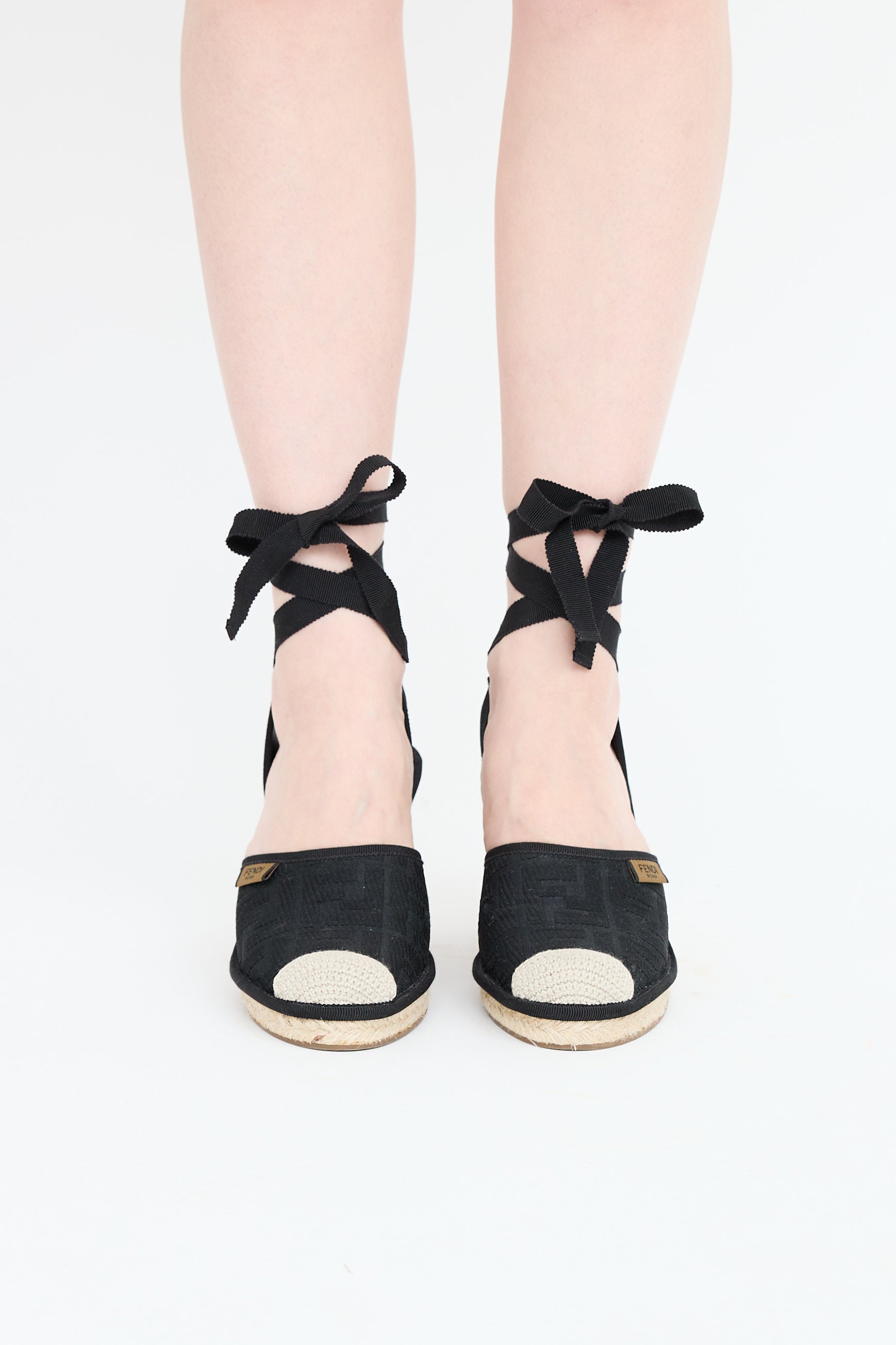 Pre-owned Fendi black espadrille sandals featuring rounded toe with crochet toe cap, black FF embroidered vamp, logo tag at topline, lace up closure, leather insole, and rubber outsole.