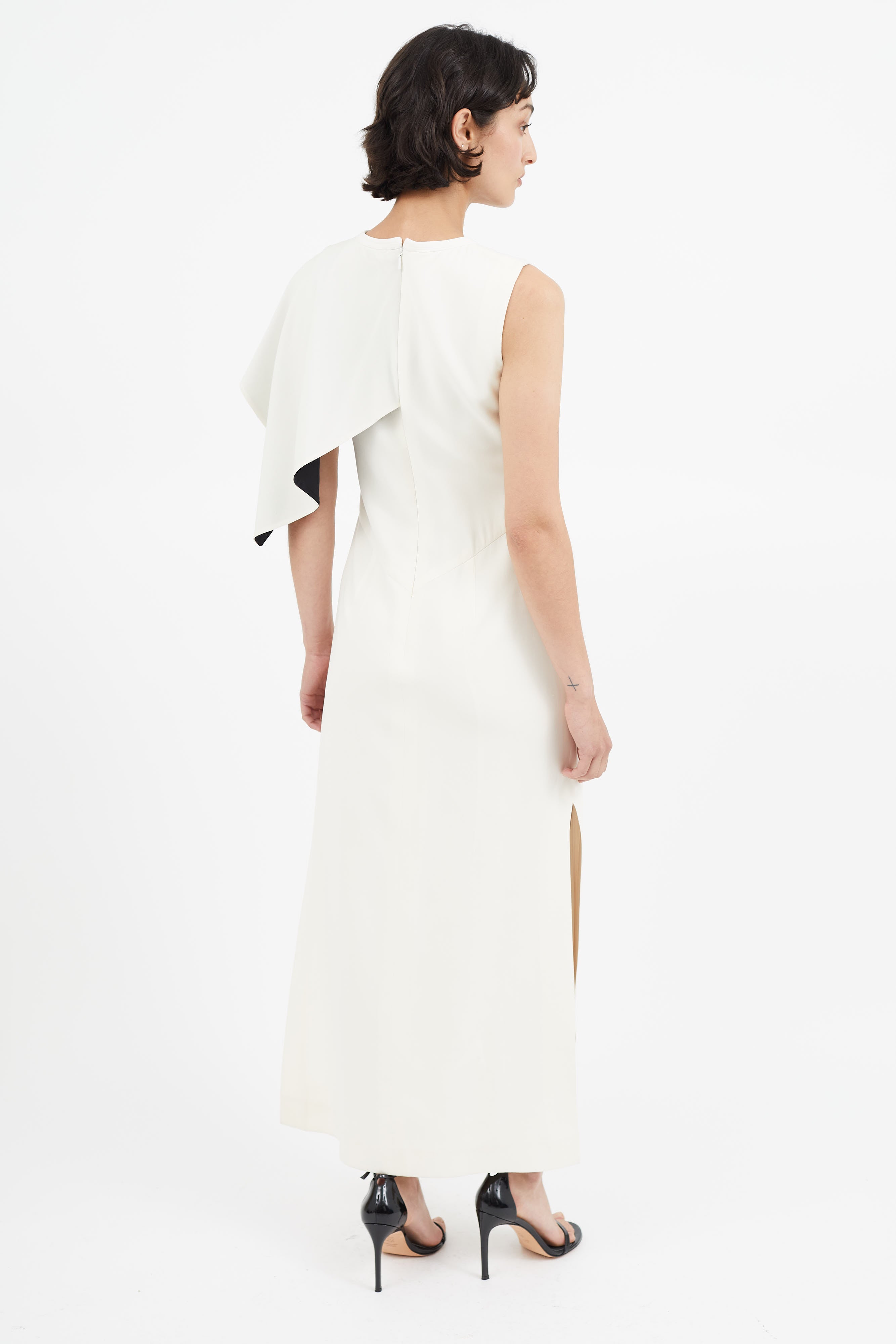 Pre-owned Fendi cream dress featuring a crew neckline, bodice overlay with one ruffled sleeve, slits at hem, and zip at back with hook and eye closure. Lined.