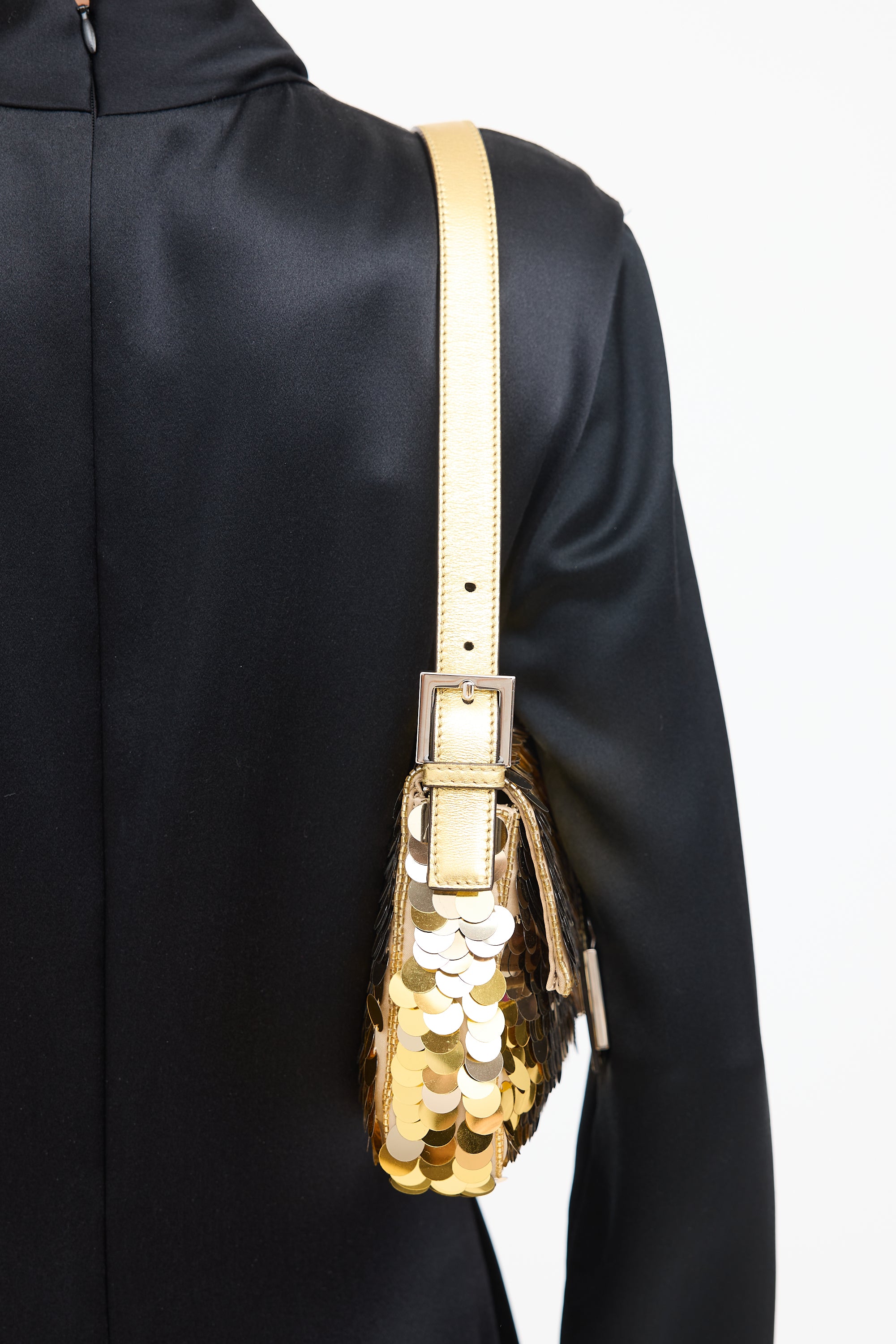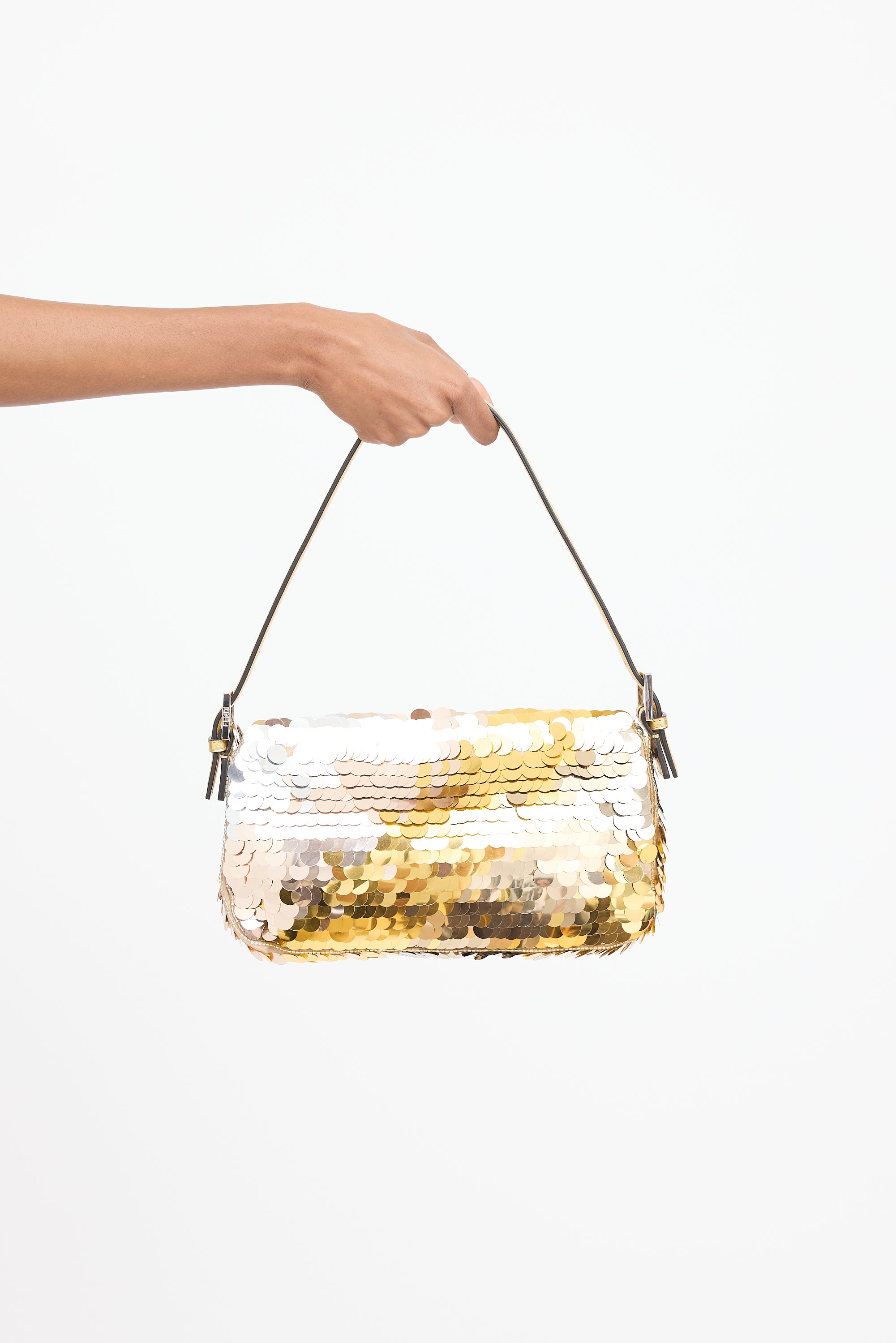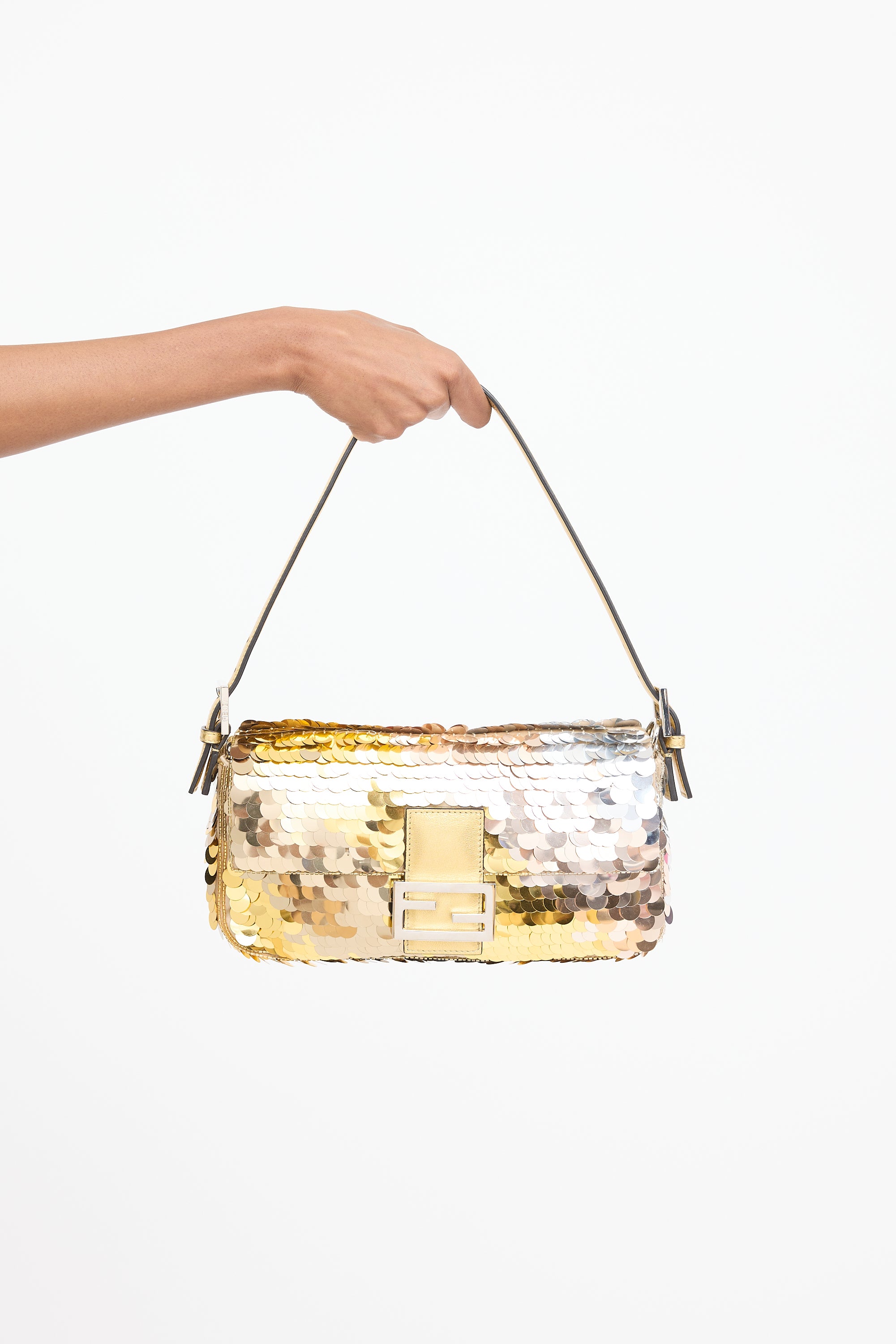 Pre-owned Fendi gold Re-Edition baguette bag featuring single adjustable flat top handle with buckle detailing, sequin exterior, top flap with gold tone strap and silver tone logo hardware, and snap button closure. Silk lined main compartment with single zip pocket.