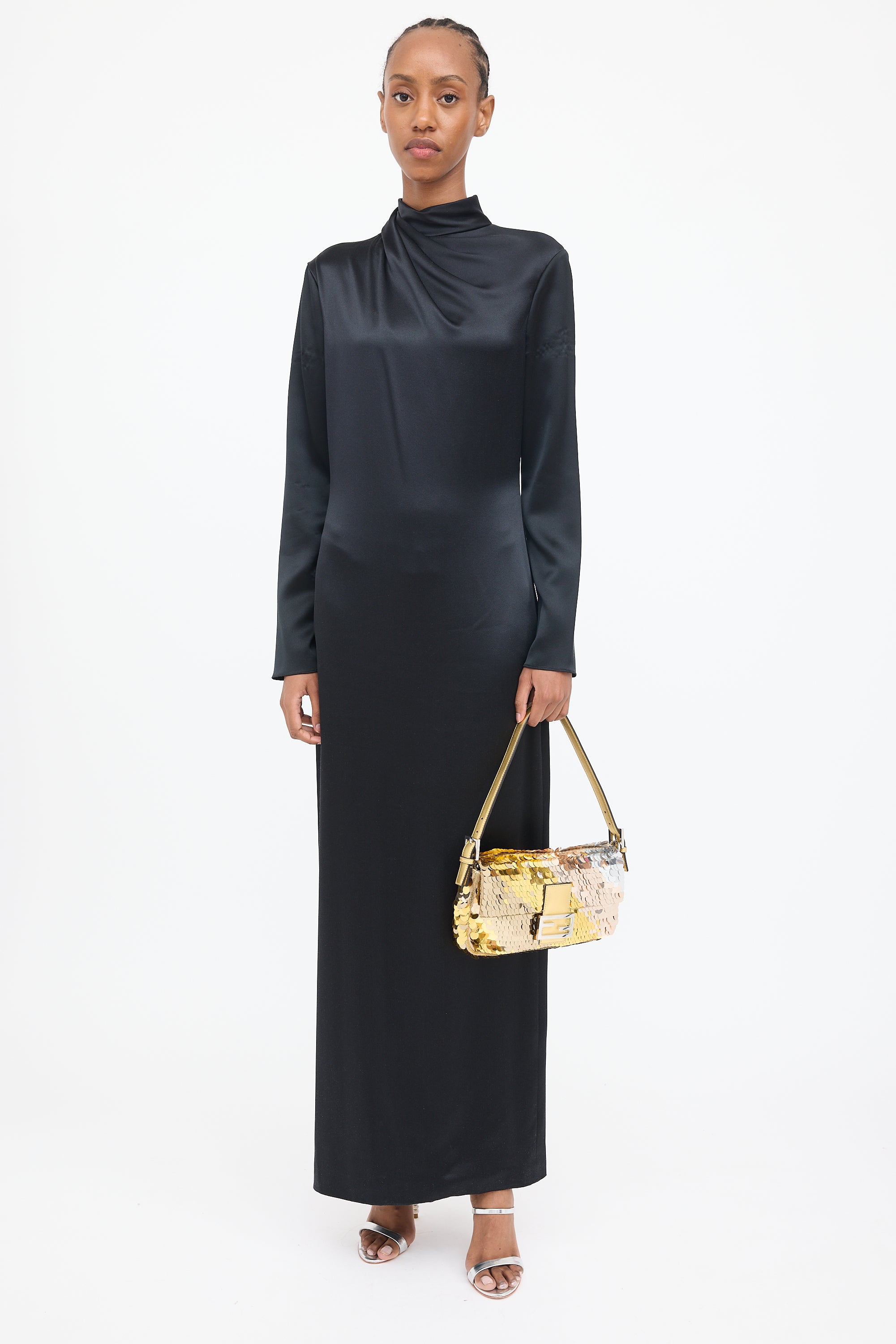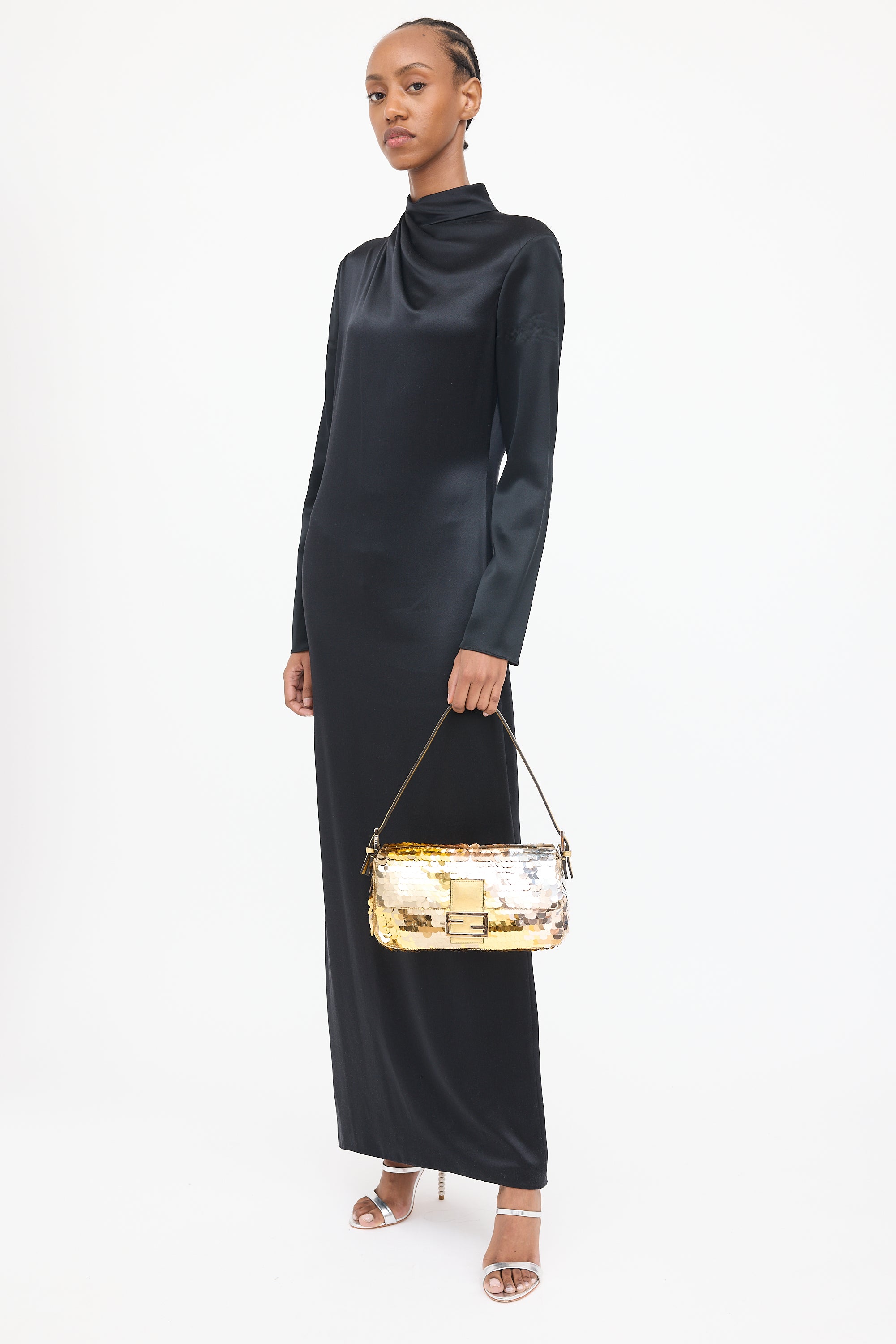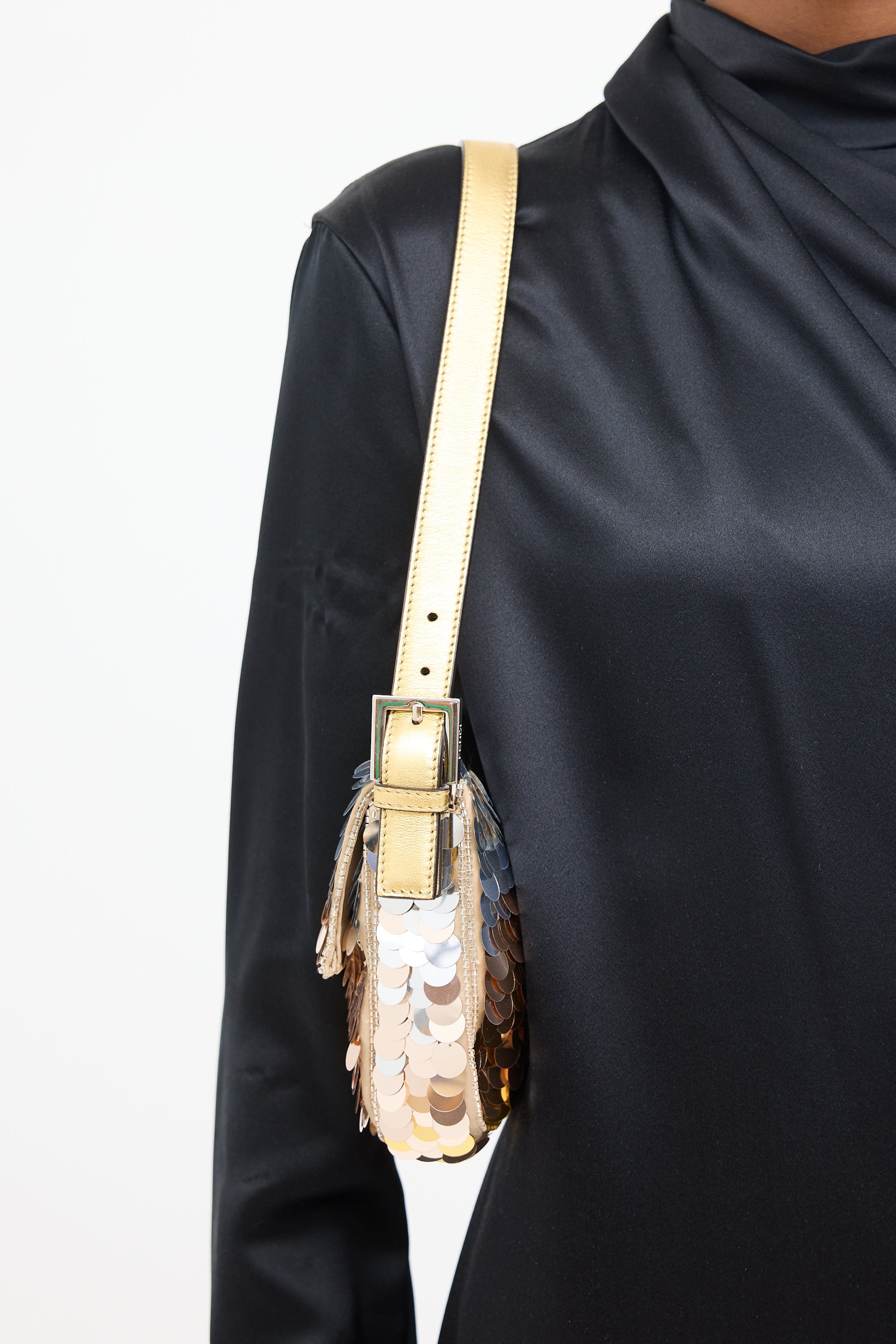 Pre-owned Fendi gold Re-Edition baguette bag featuring single adjustable flat top handle with buckle detailing, sequin exterior, top flap with gold tone strap and silver tone logo hardware, and snap button closure. Silk lined main compartment with single zip pocket.