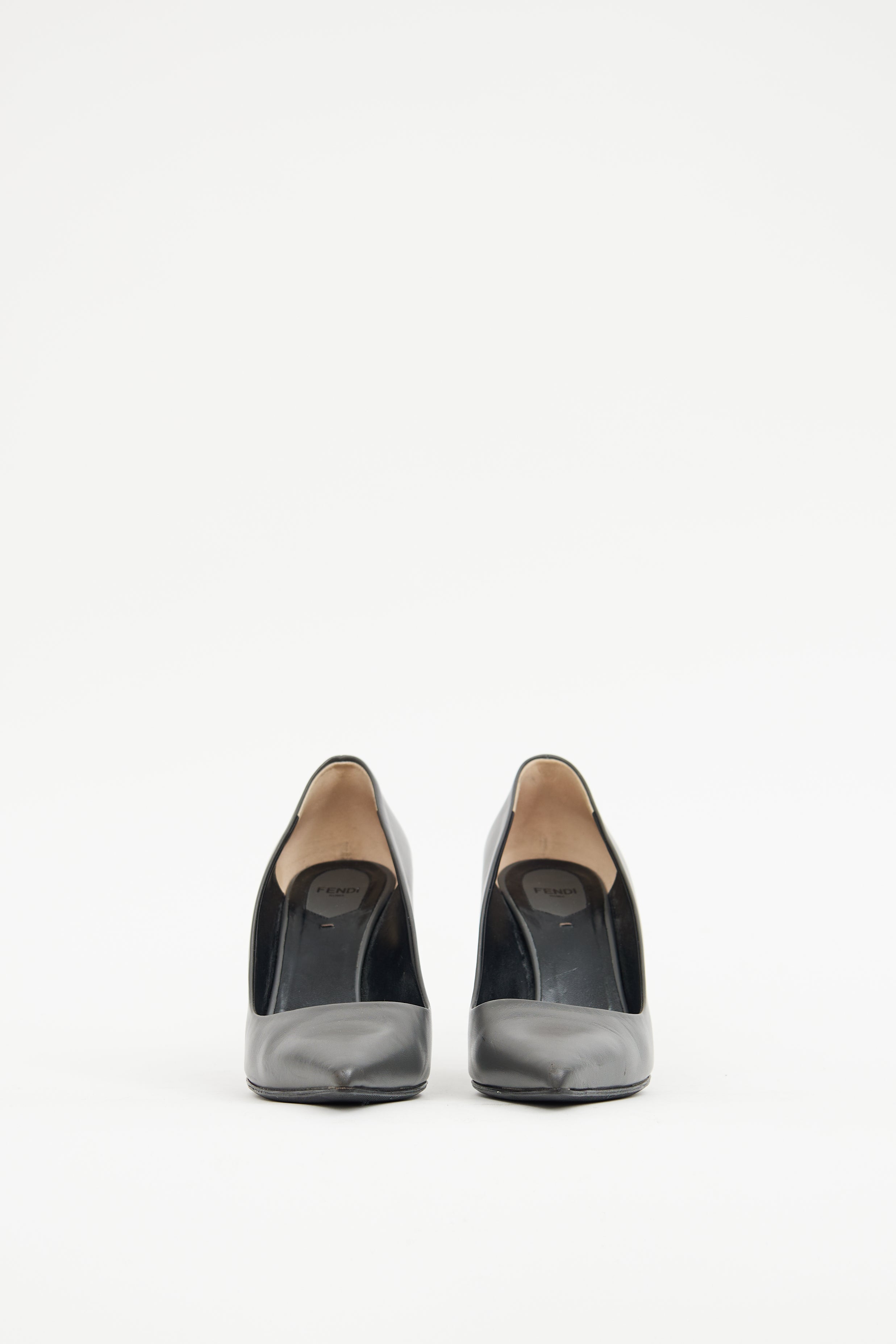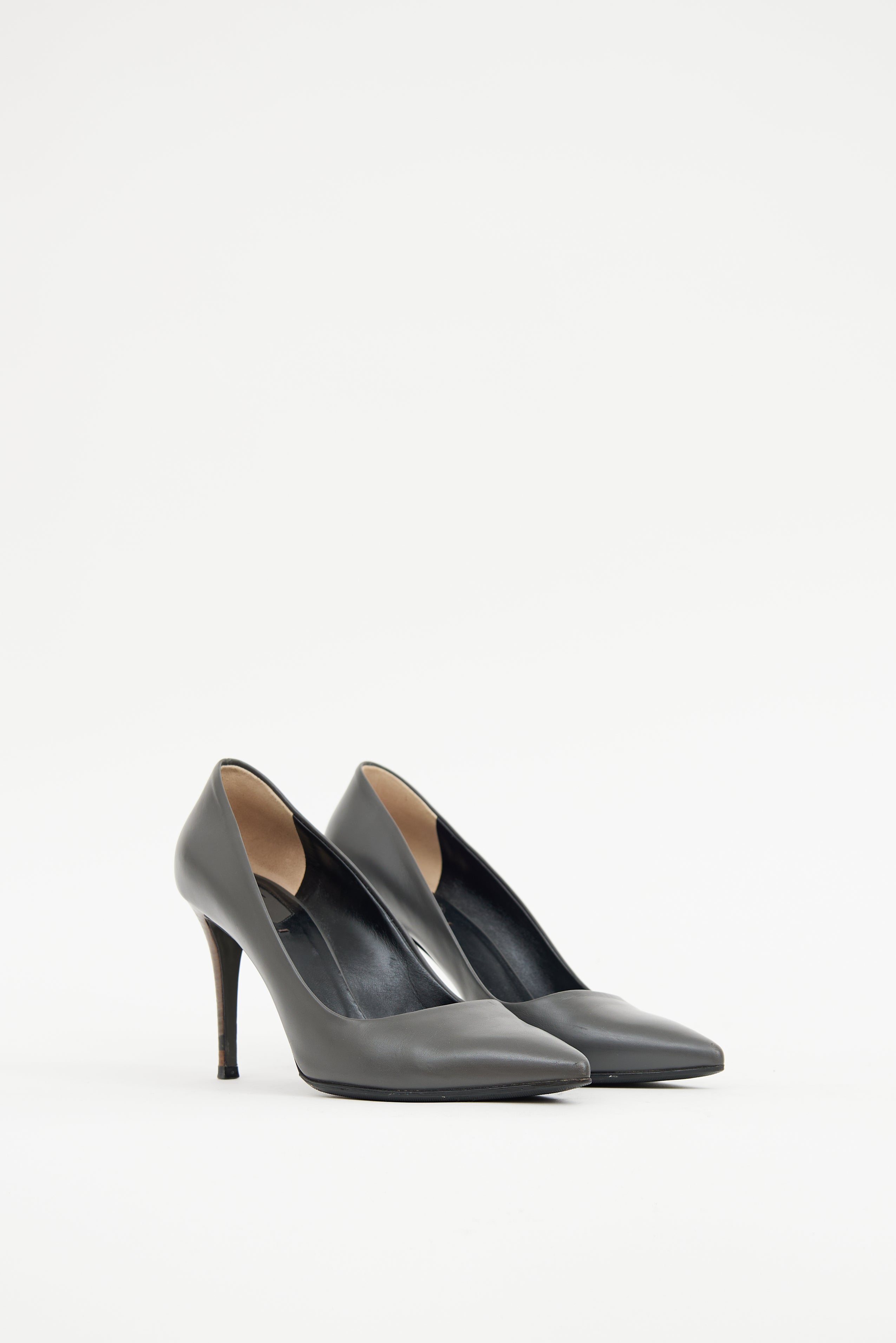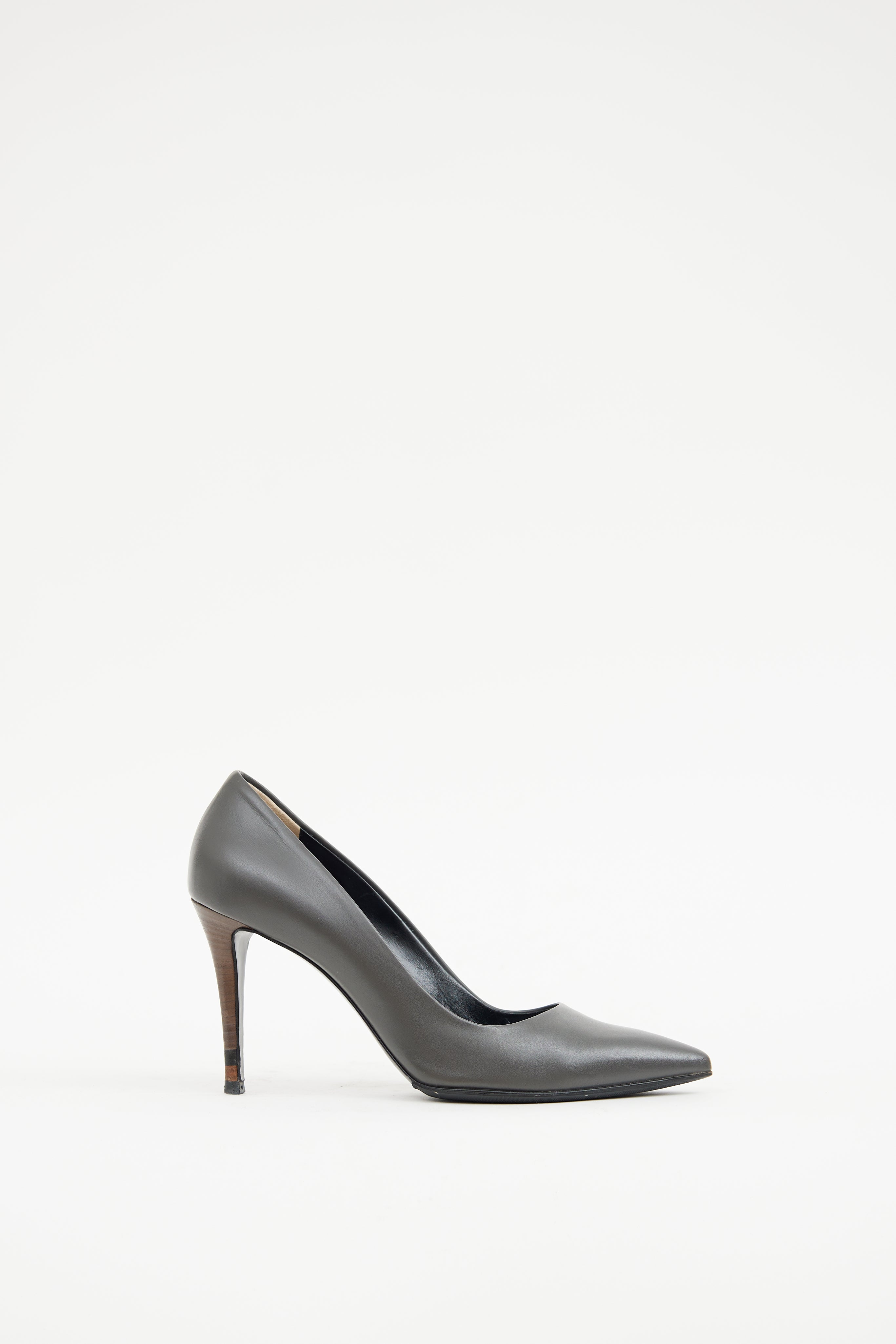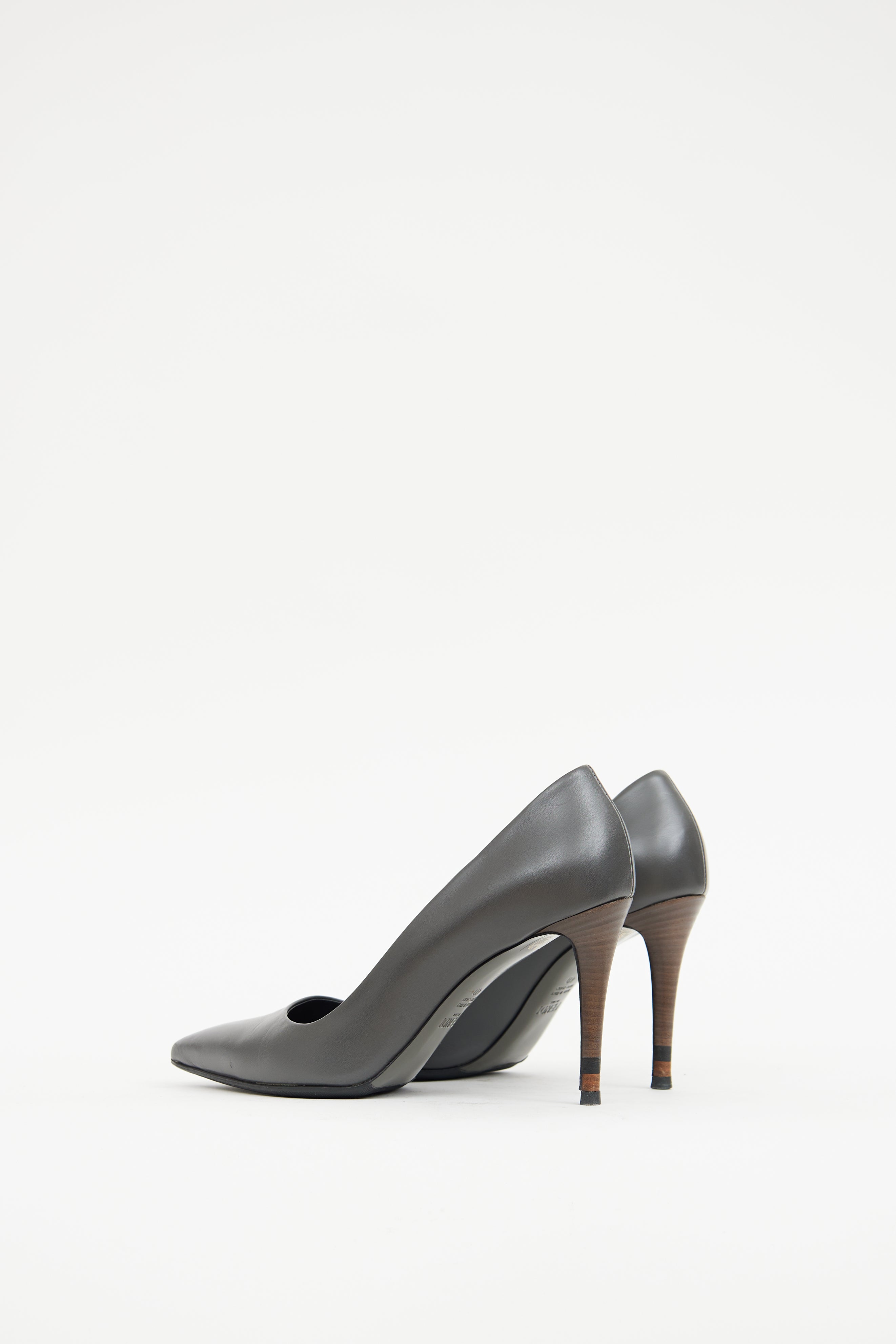 Pre-owned Fendi grey leather heels featuring a pointed toe, wrapped stiletto heel, and slip on entry. Includes original dust bag.