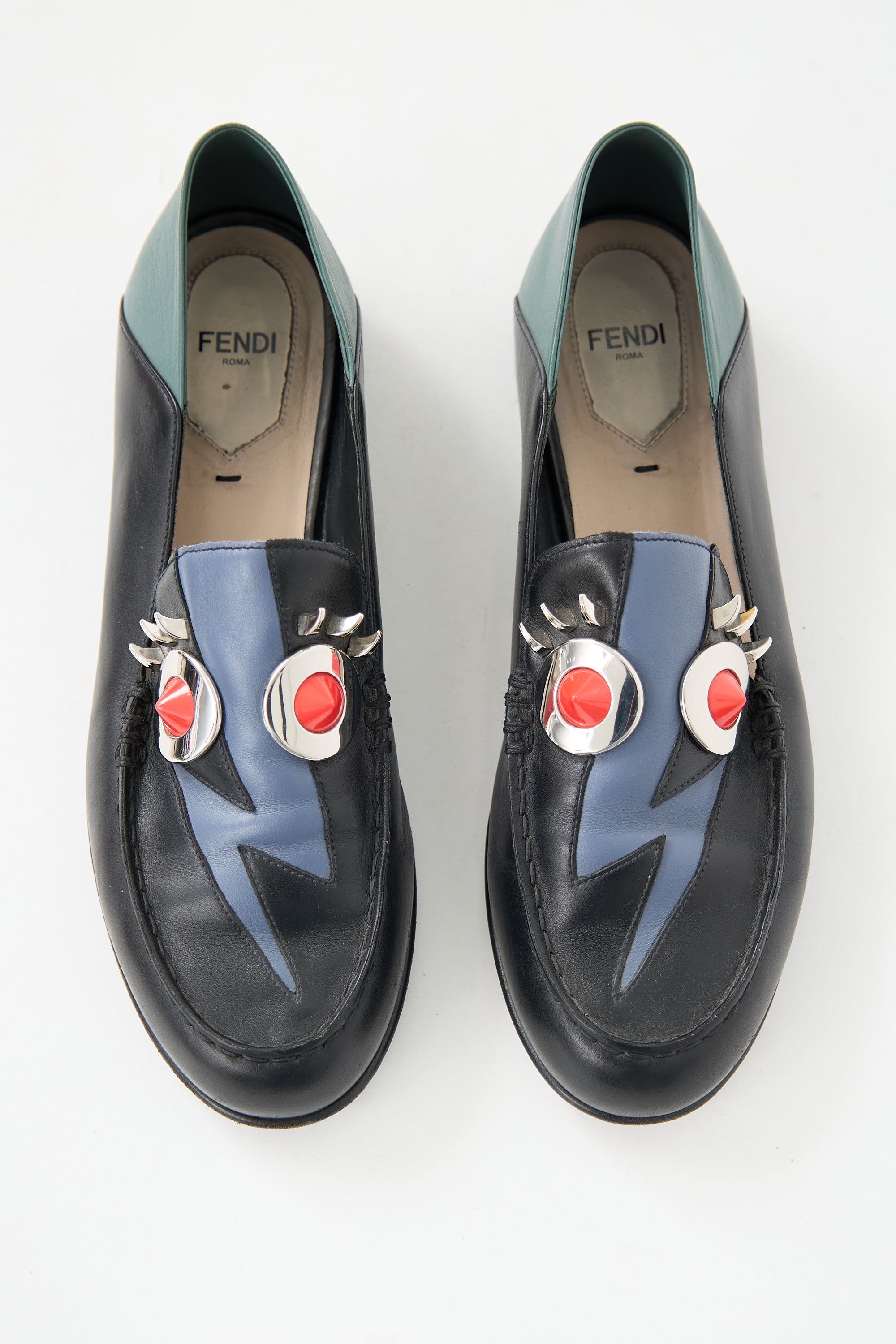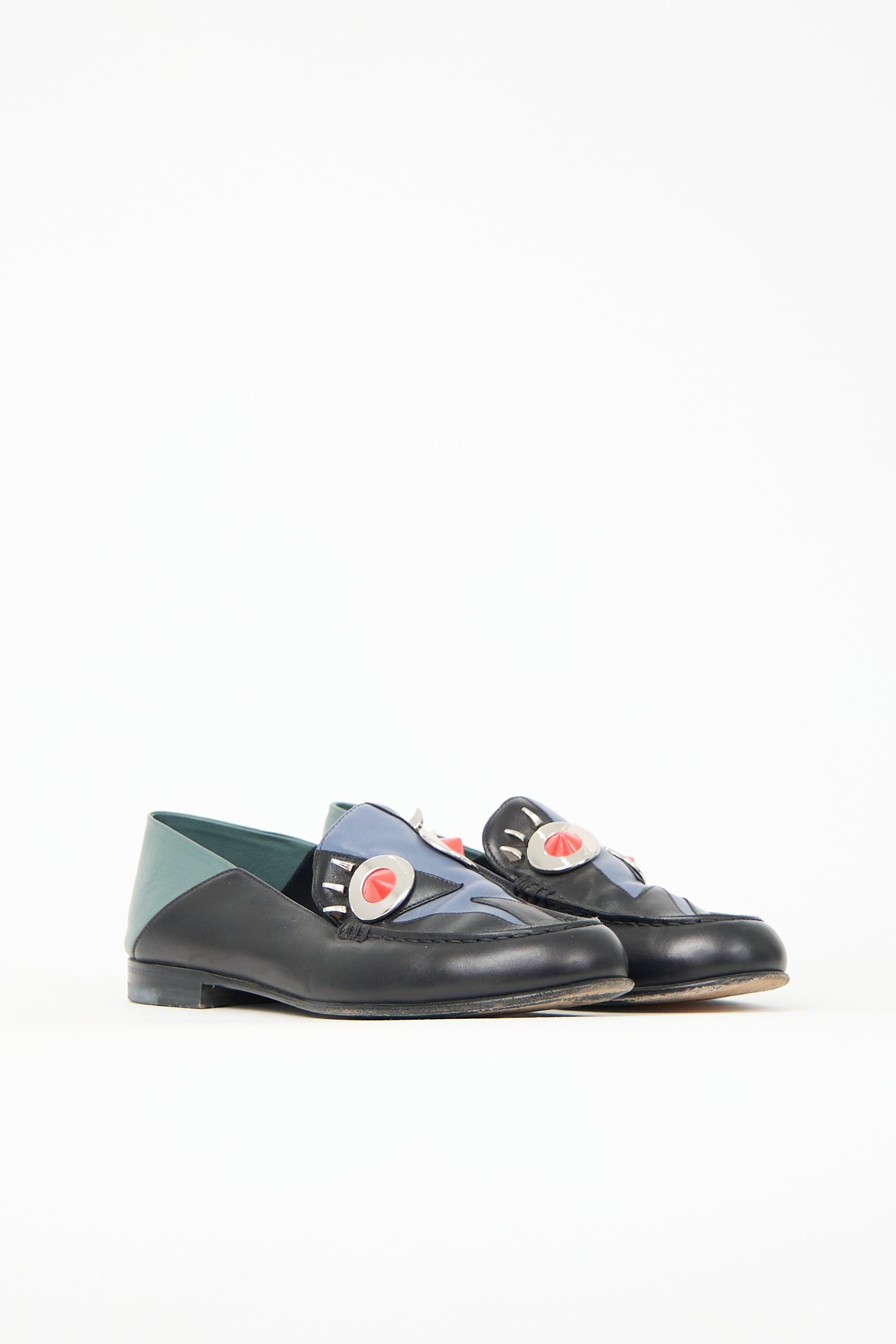 Pre-owned Fendi black and multicolour leather loafers featuring rounded toe, Monster and lightning motif at vamp, and silver tone metal hardware. Comes with original dust bag.
