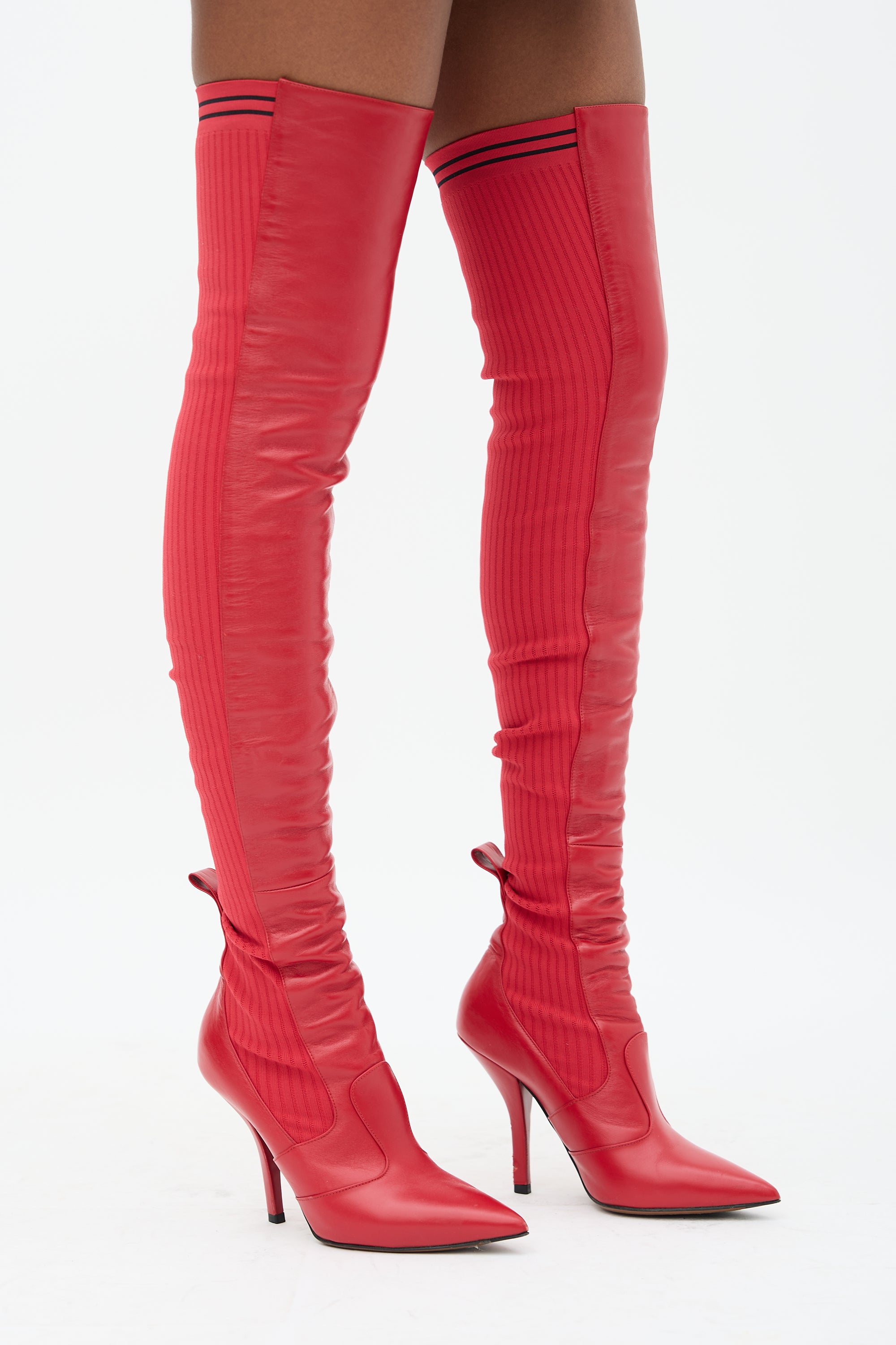 Pre-owned Fendi red leather Rockoko 100mm thigh high boots featuring pointed toe, elasticized shaft panel with thin stripe trim, pull tab at counter, and covered continental heel.