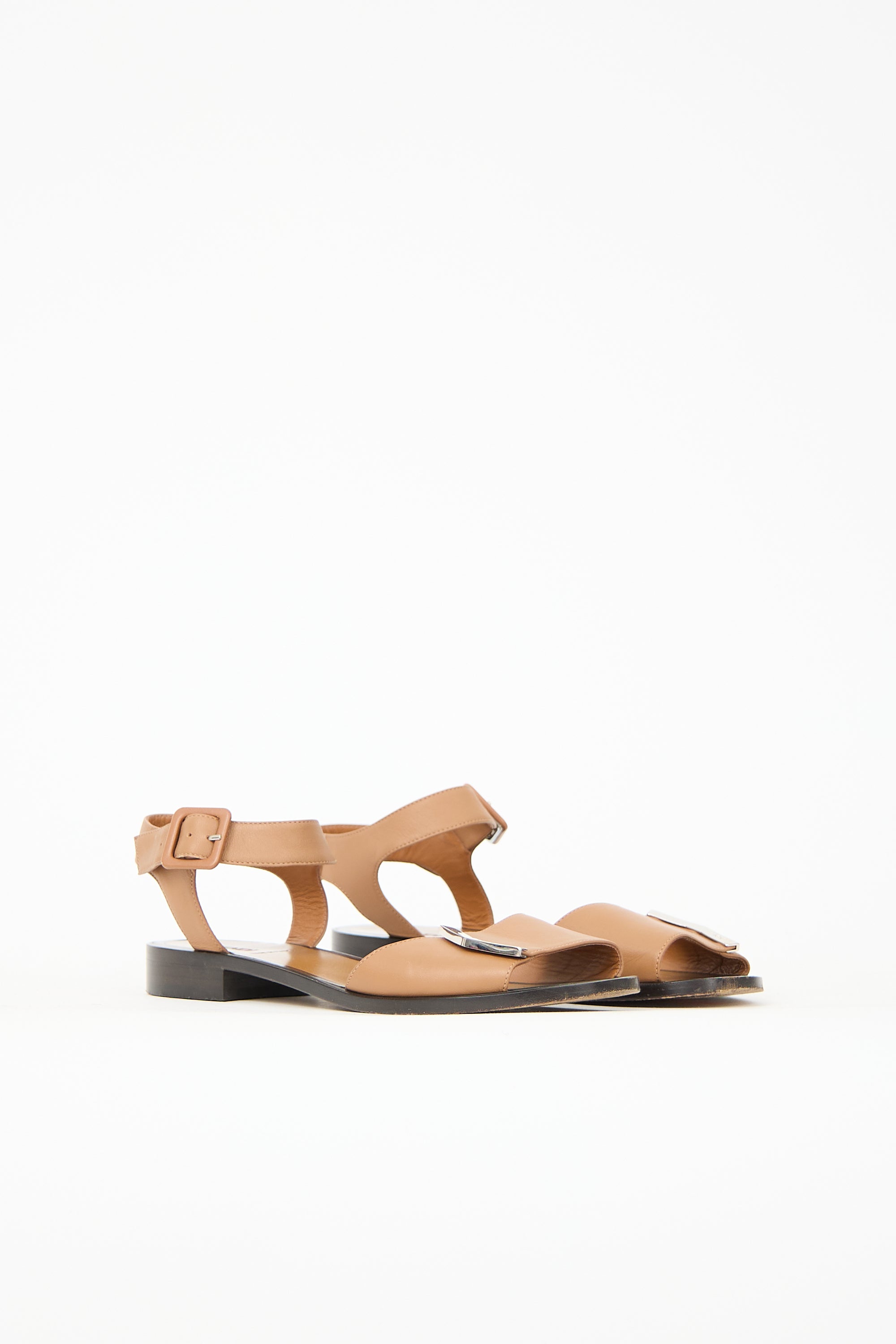 Pre-owned Fendi brown leather sandals featuring front strap with silver tone logo hardware, adjustable ankle strap, and short stacked heel.