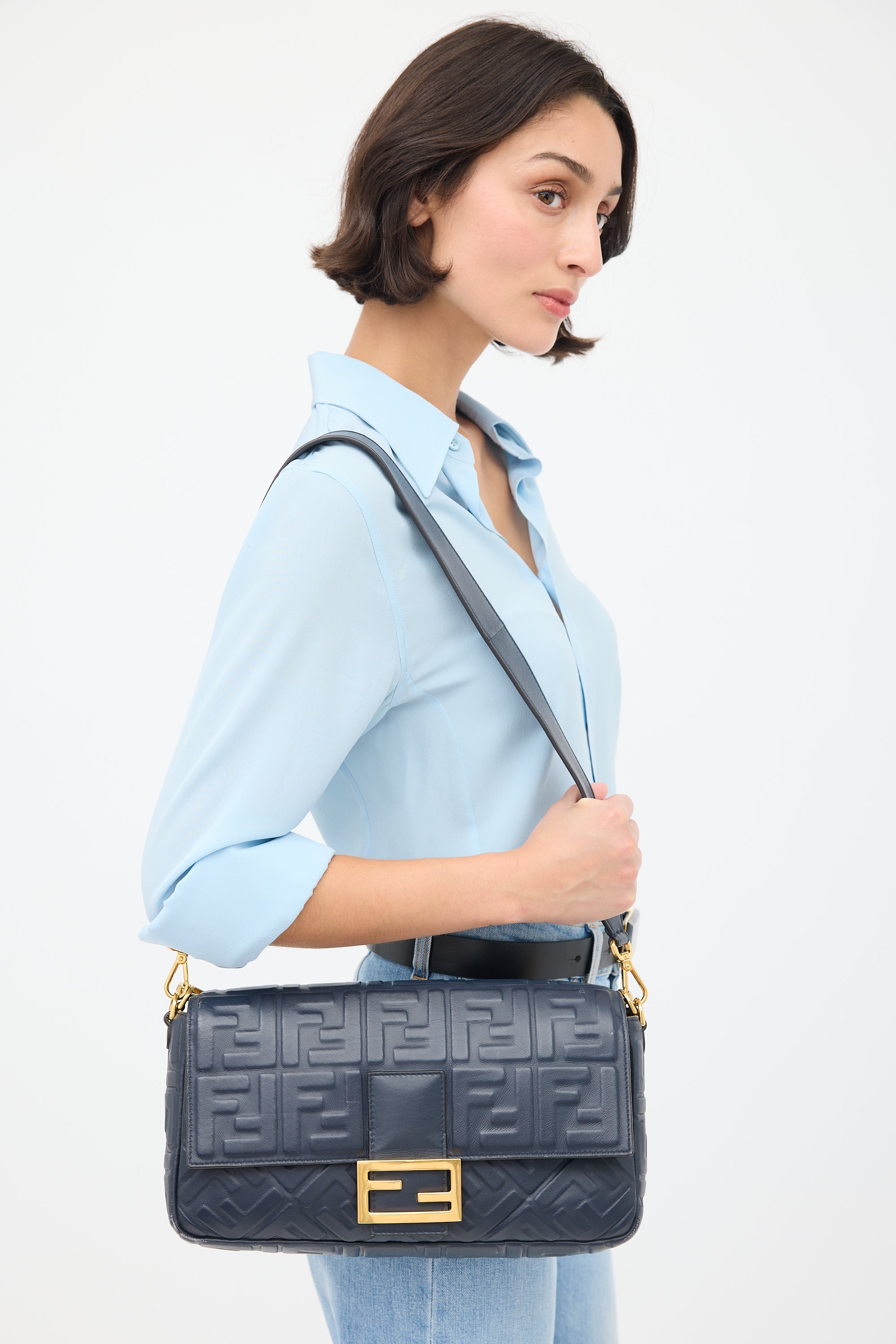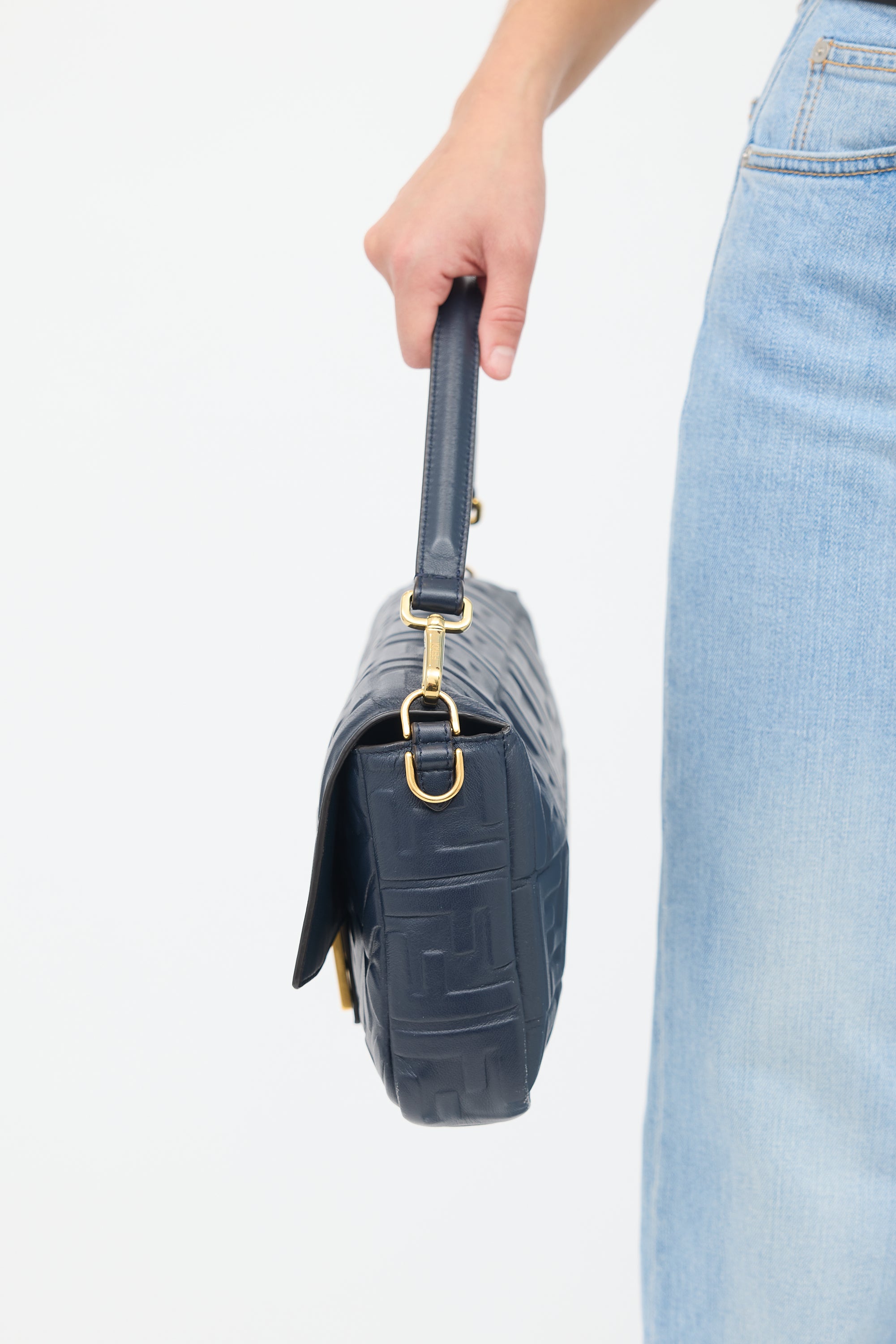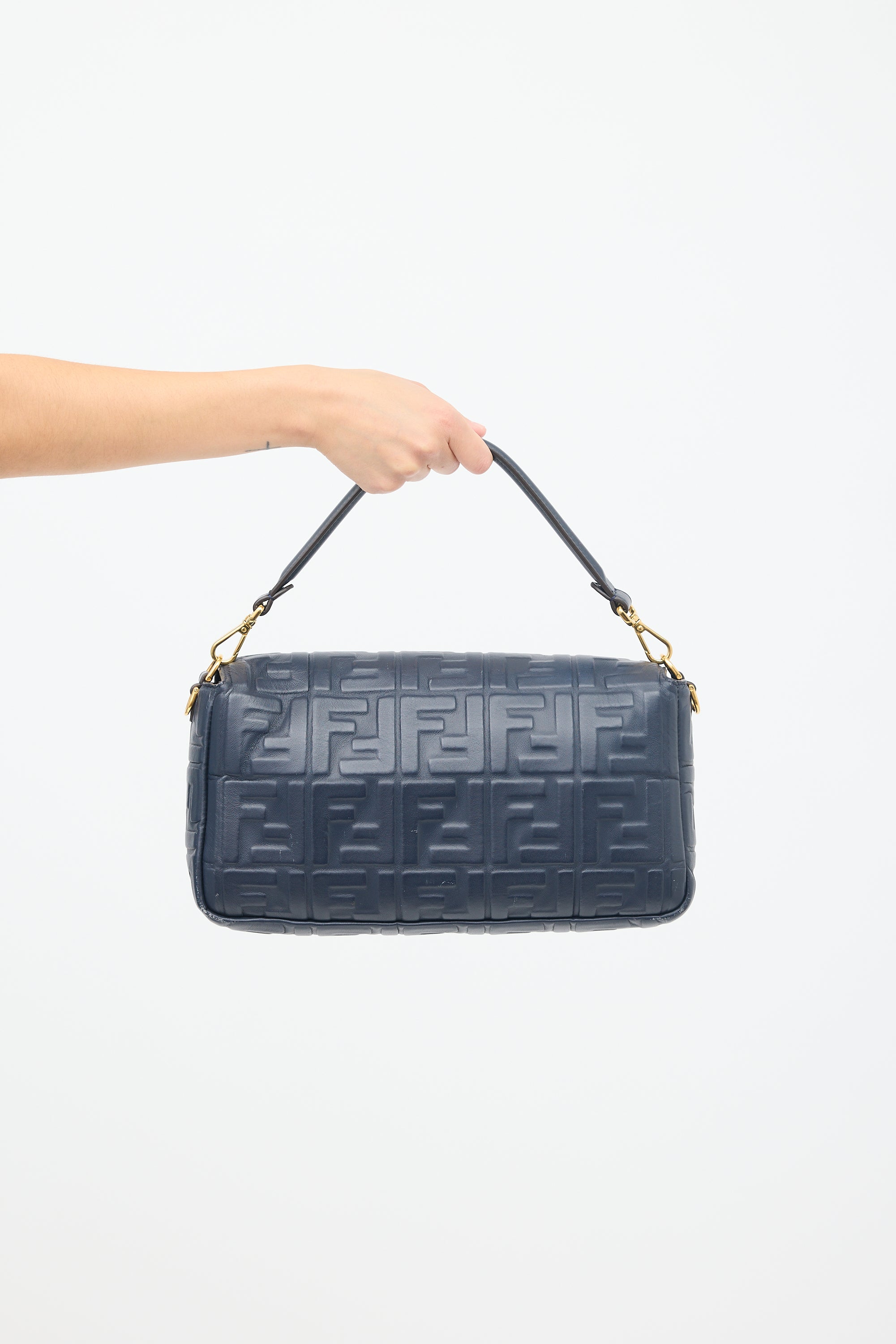 Pre-owned Fendi midnight blue leather Baguette shoulder bag featuring FF monogram throughout, gold tone FF logo hardware at front, detachable fixed top handle and shoulder strap, magnetic button closure, lined main compartment, and one zip pocket inside. Comes with original dust bag.