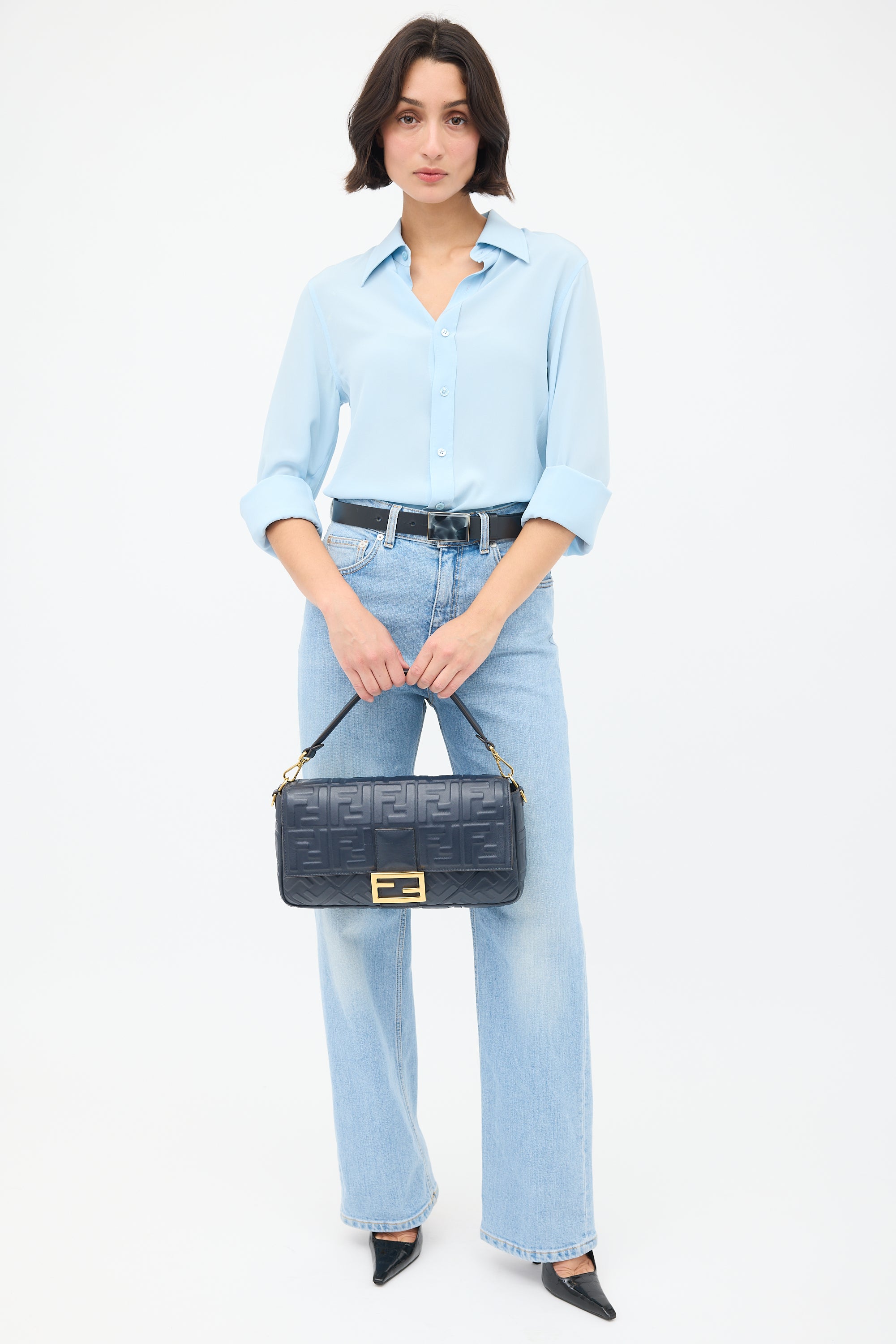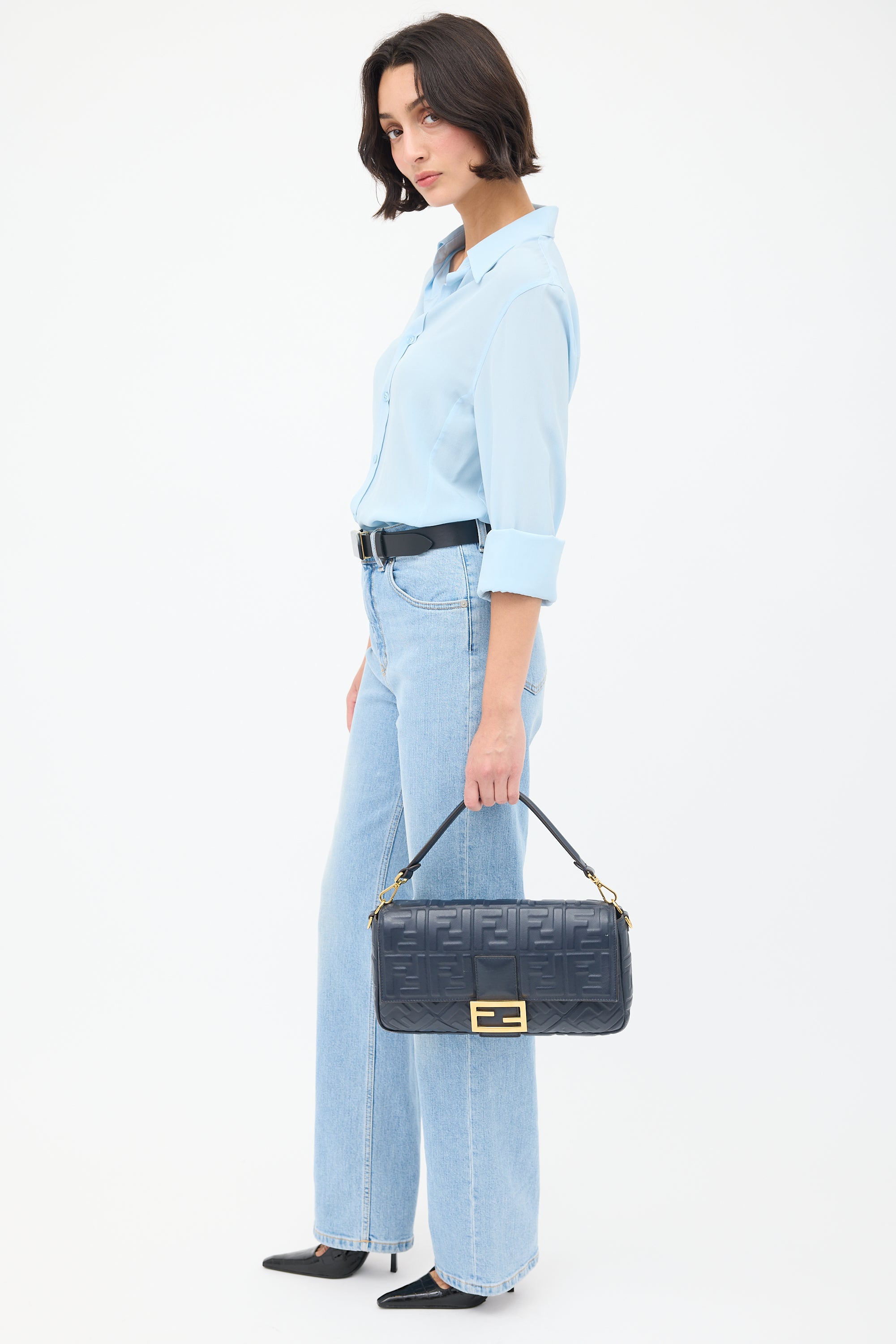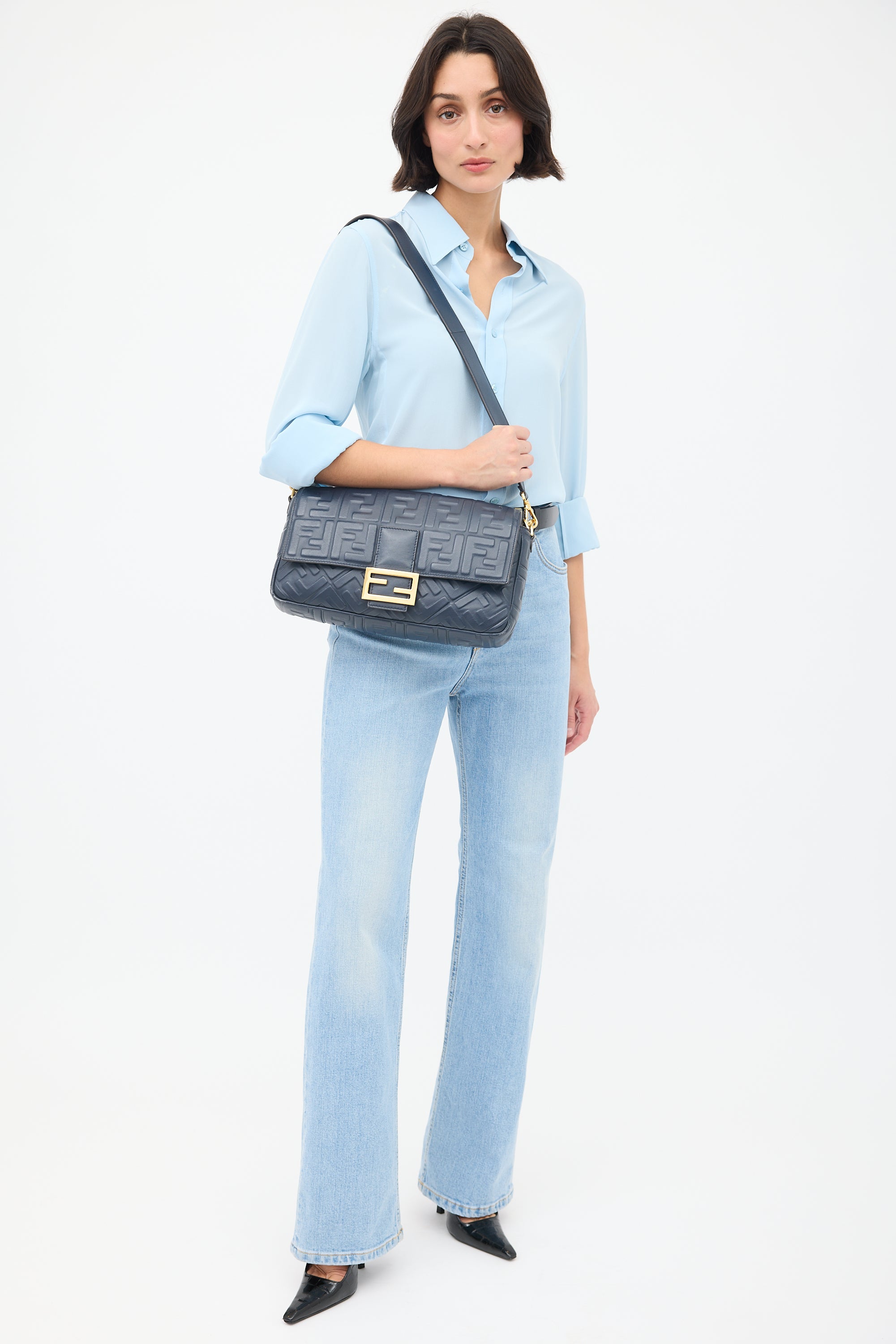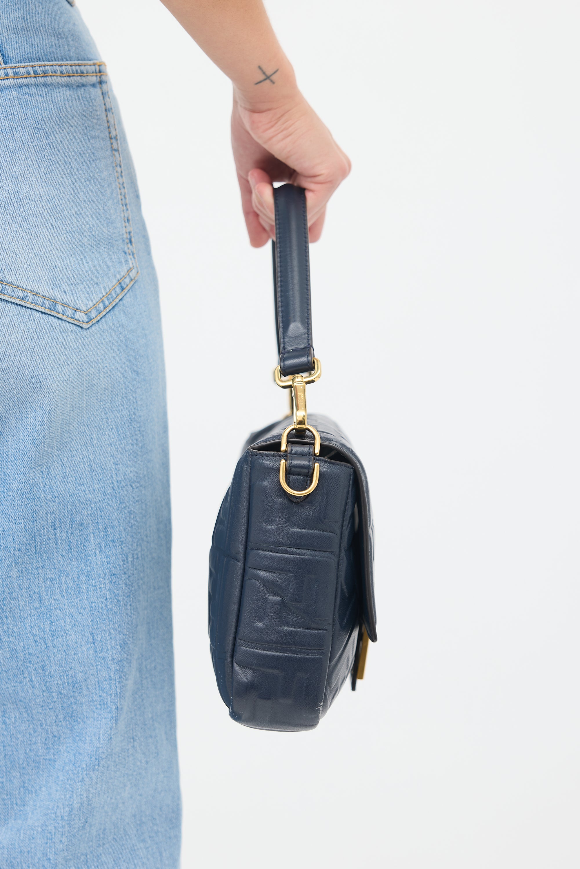 Pre-owned Fendi midnight blue leather Baguette shoulder bag featuring FF monogram throughout, gold tone FF logo hardware at front, detachable fixed top handle and shoulder strap, magnetic button closure, lined main compartment, and one zip pocket inside. Comes with original dust bag.