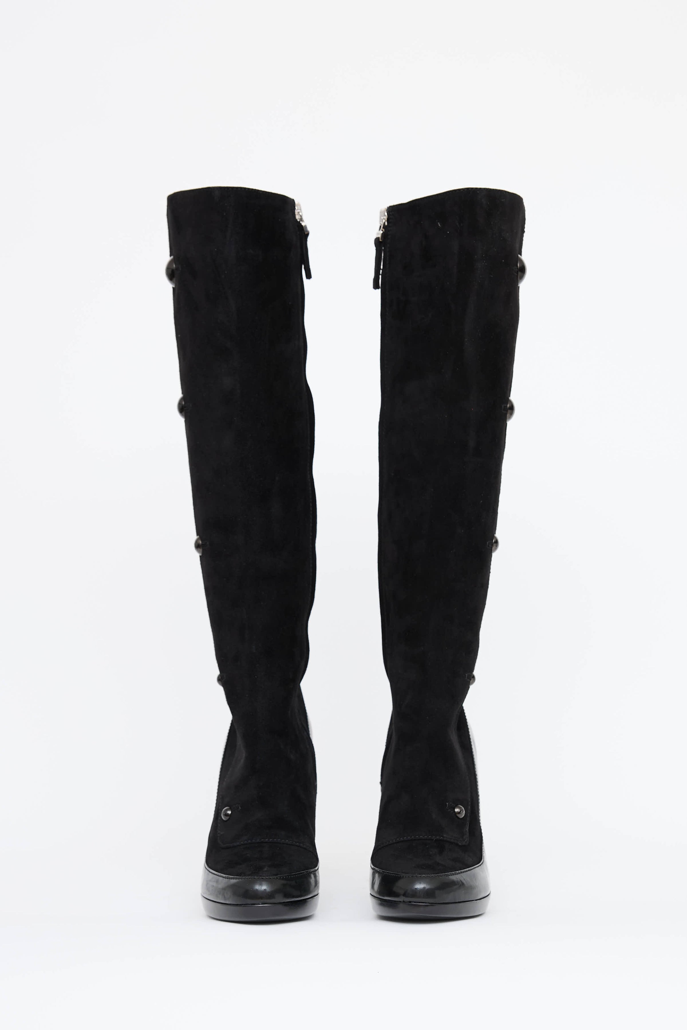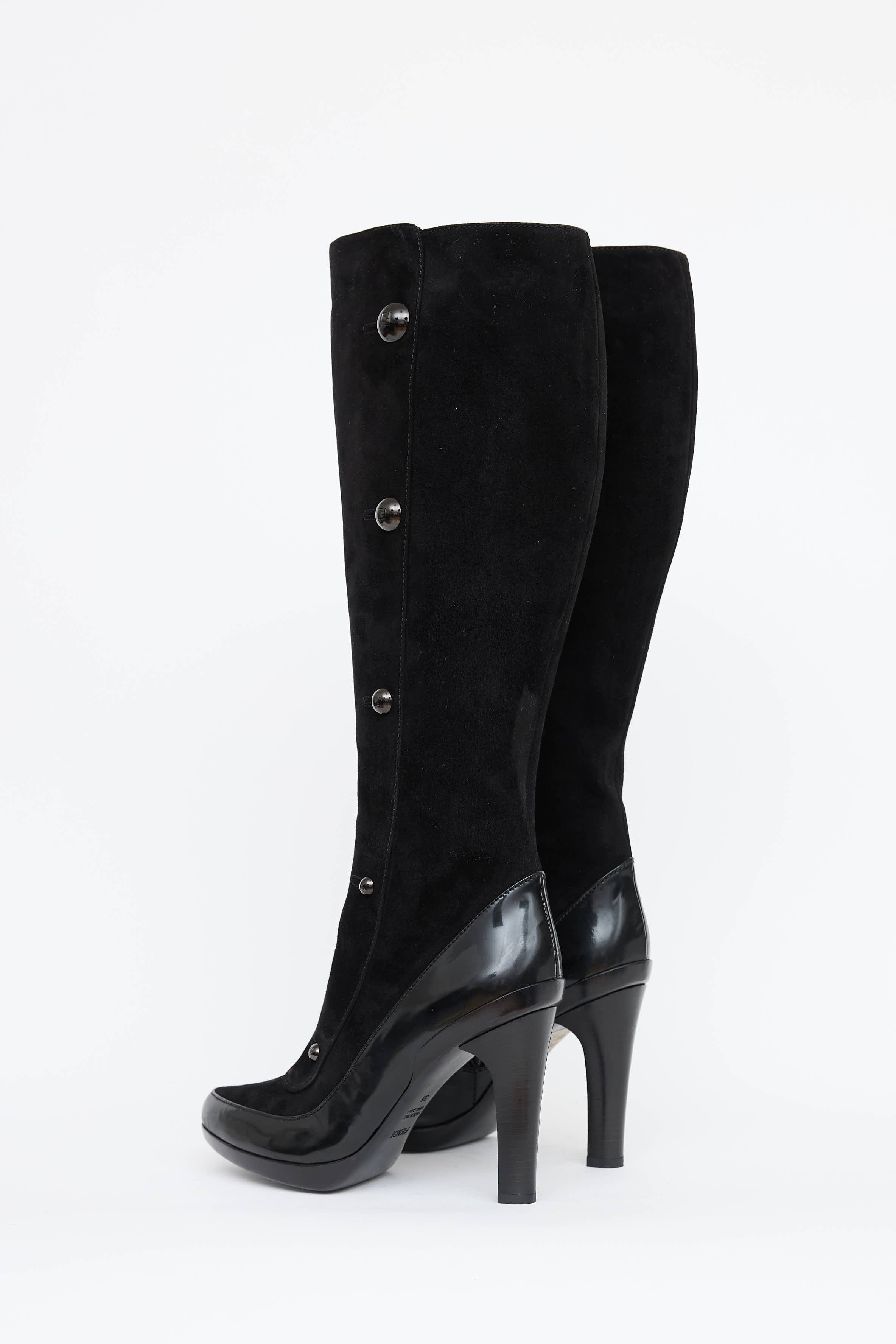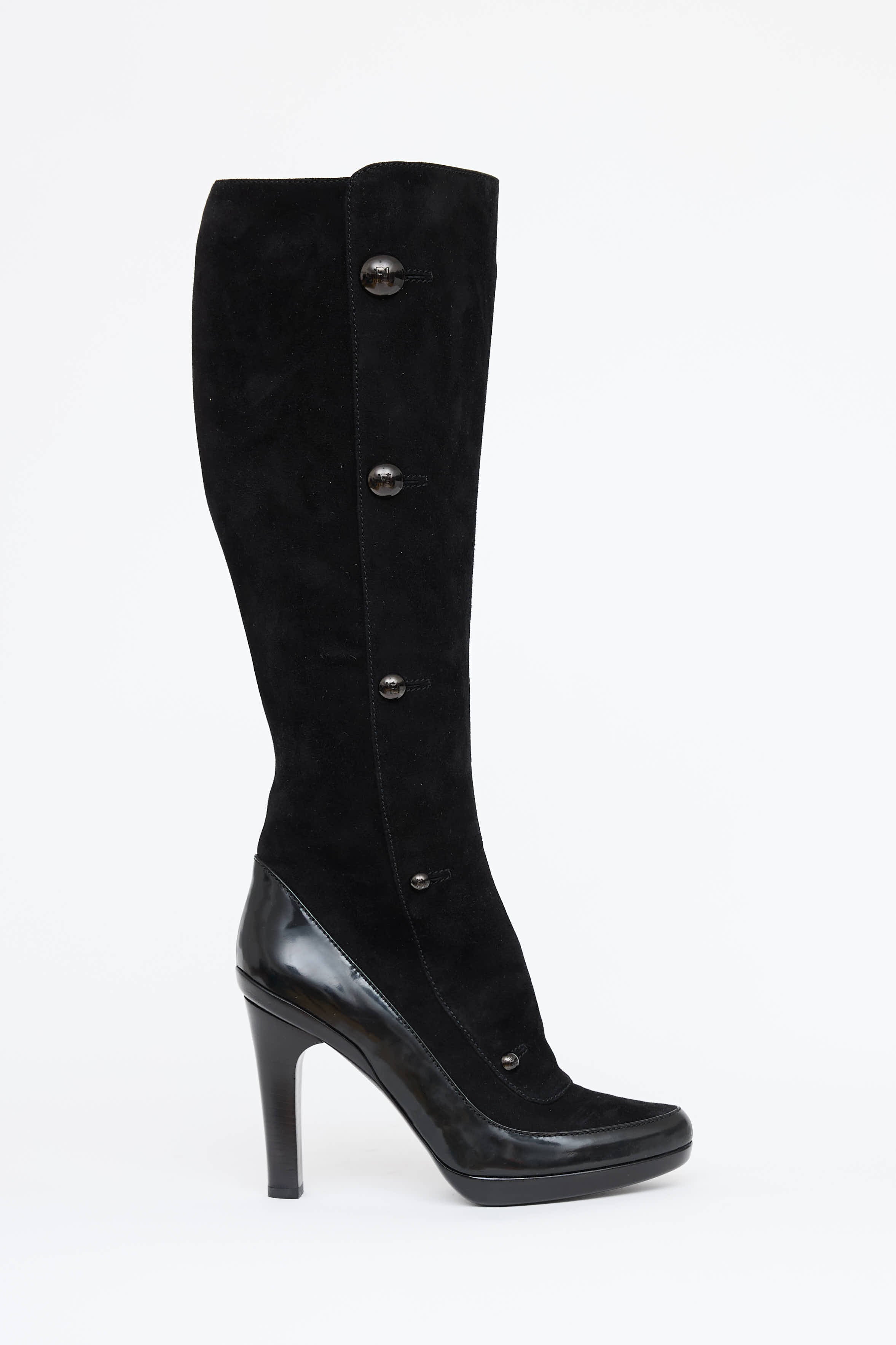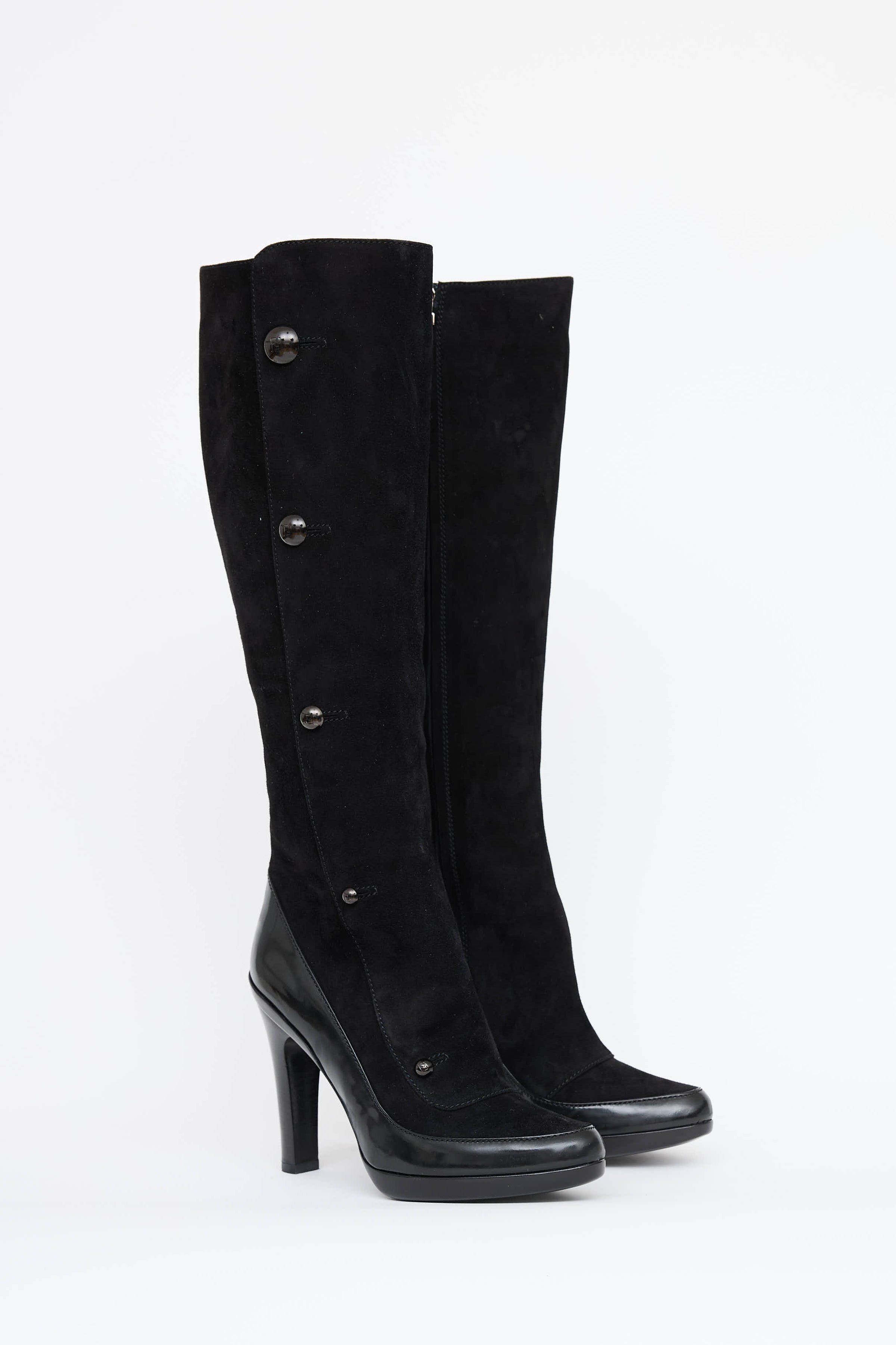 Pre-owned Fendi black boot featuring almond toe, stacked heel, suede upper, zip closure, and buttons at side.
