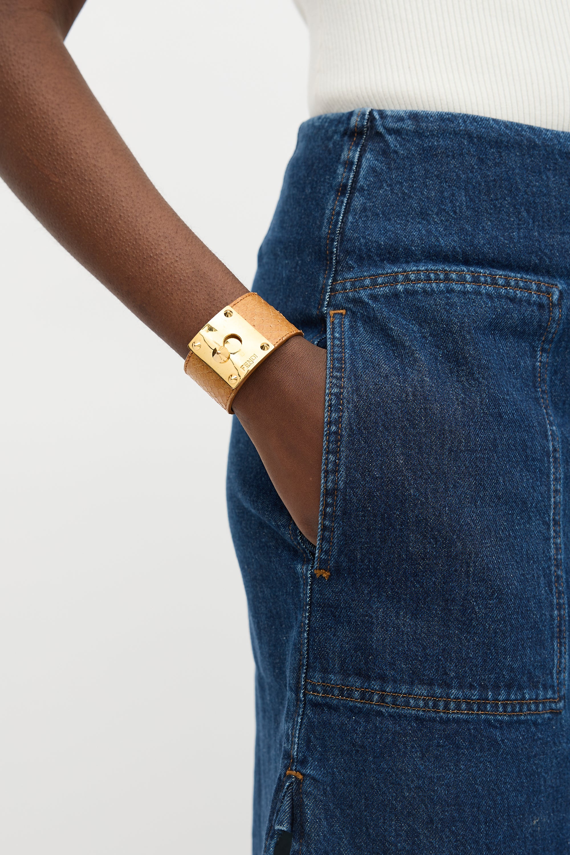 Pre-owned Fendi cuff bracelet featuring wide brown snakeskin leather band, stamped logo at reverse, gold tone metal plate with stud details and debossed logo, and slide closure.