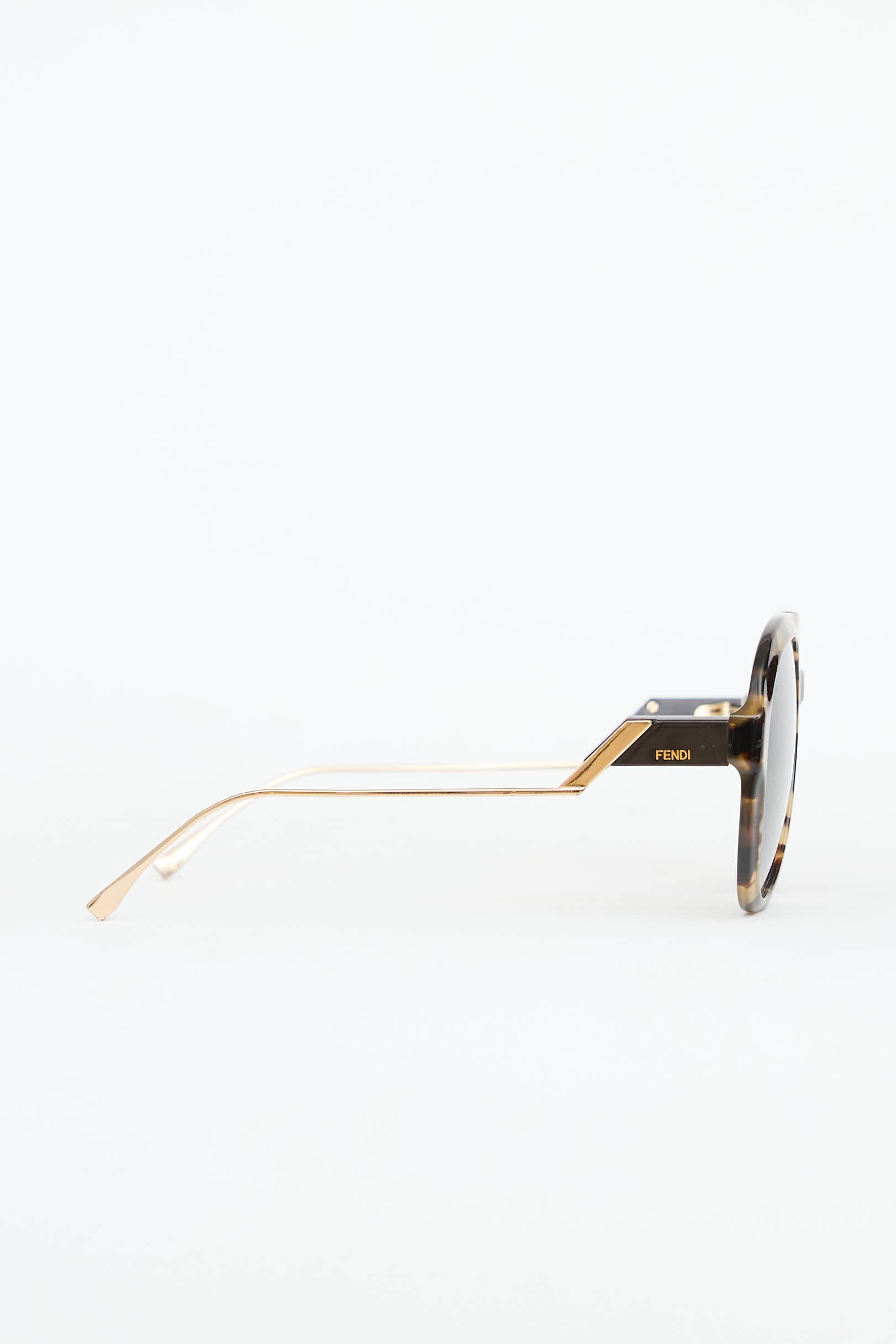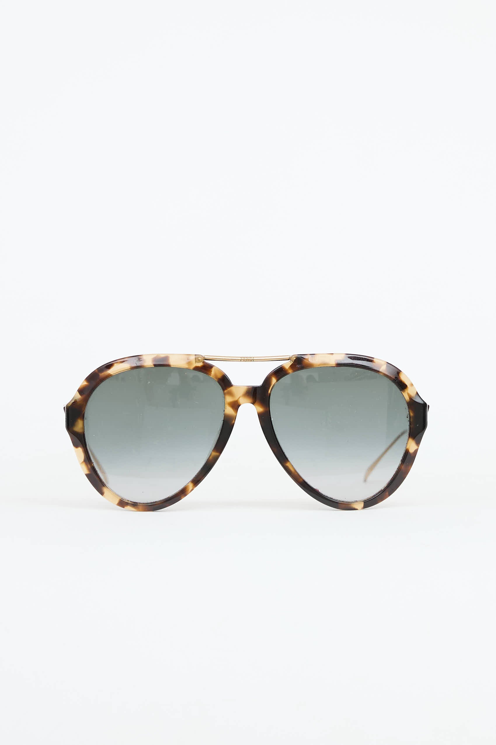 Pre-owned Fendi UKTO4BNLQH sunglasses featuring tortoise aviator frames, brow bar, logo at temples, gold tone hardware, and wire arms.