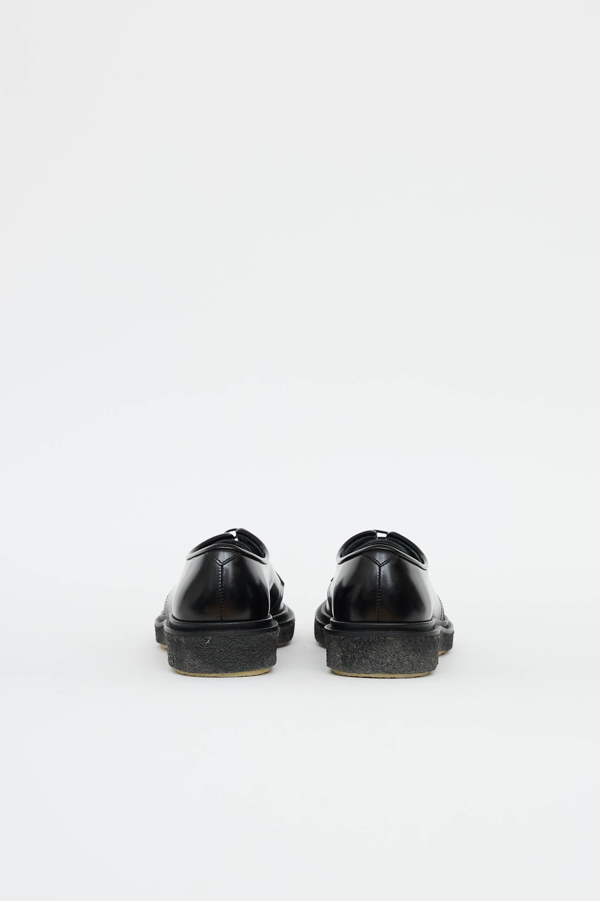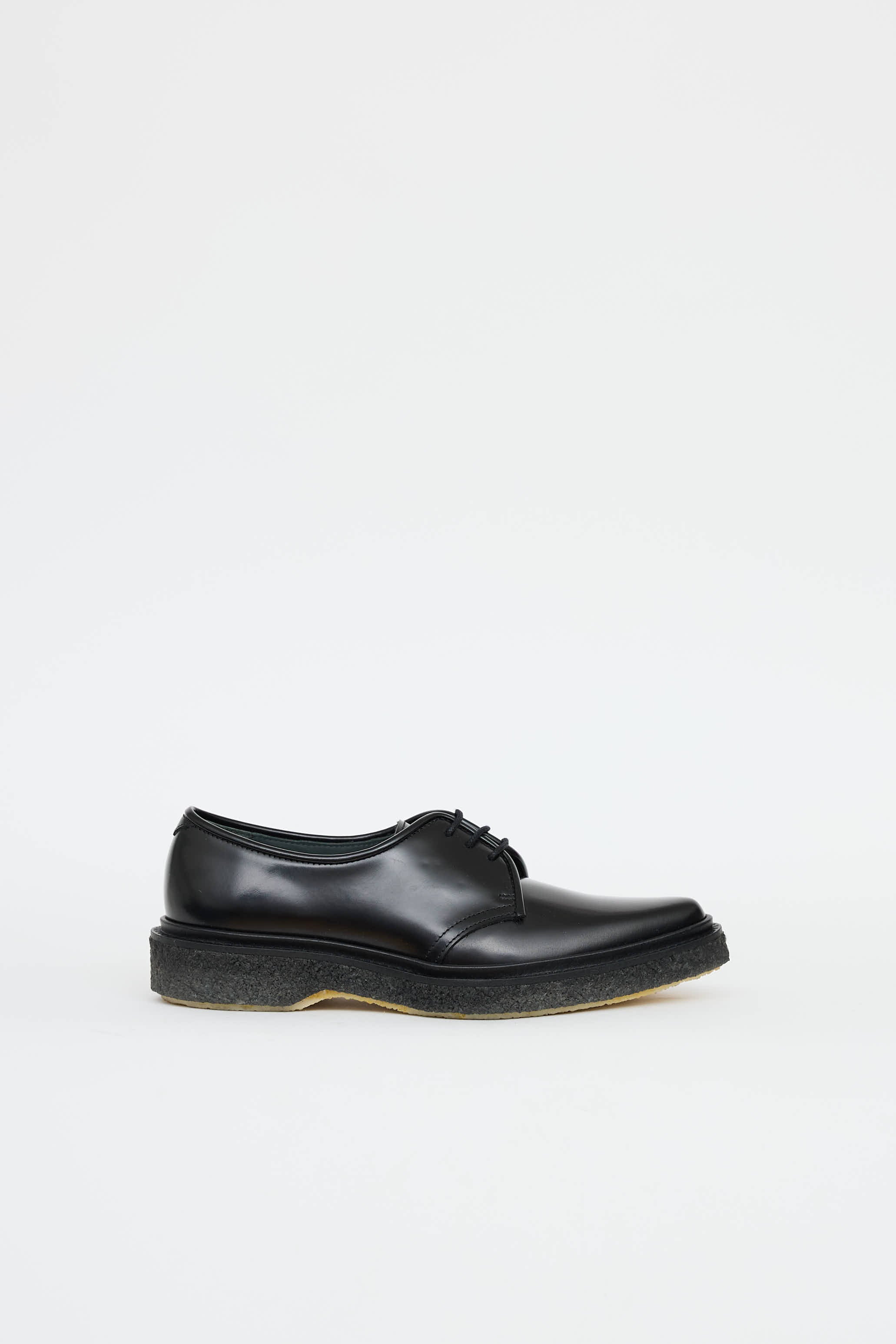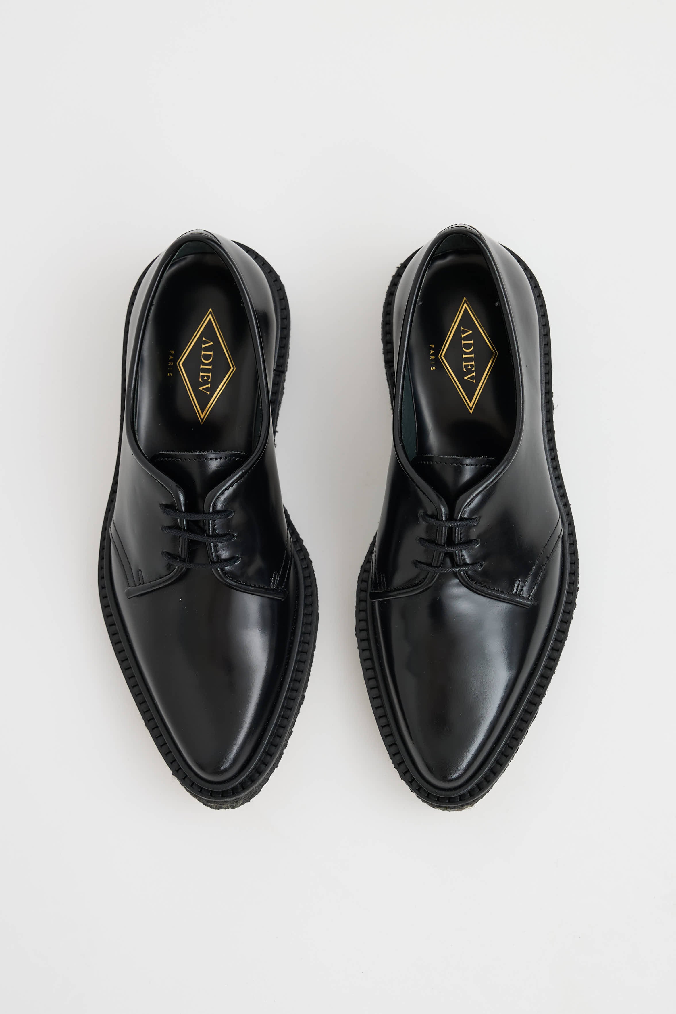 Pre-owned Adieu black leather derby featuring a pointed toe, lace up vamp, and textured gum sole.