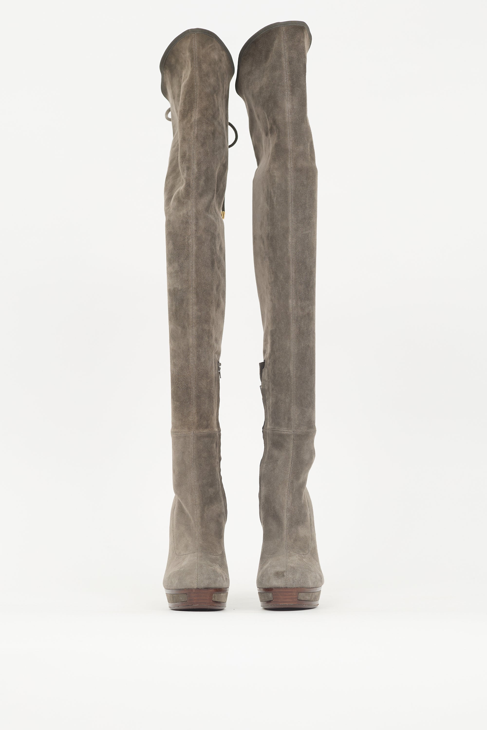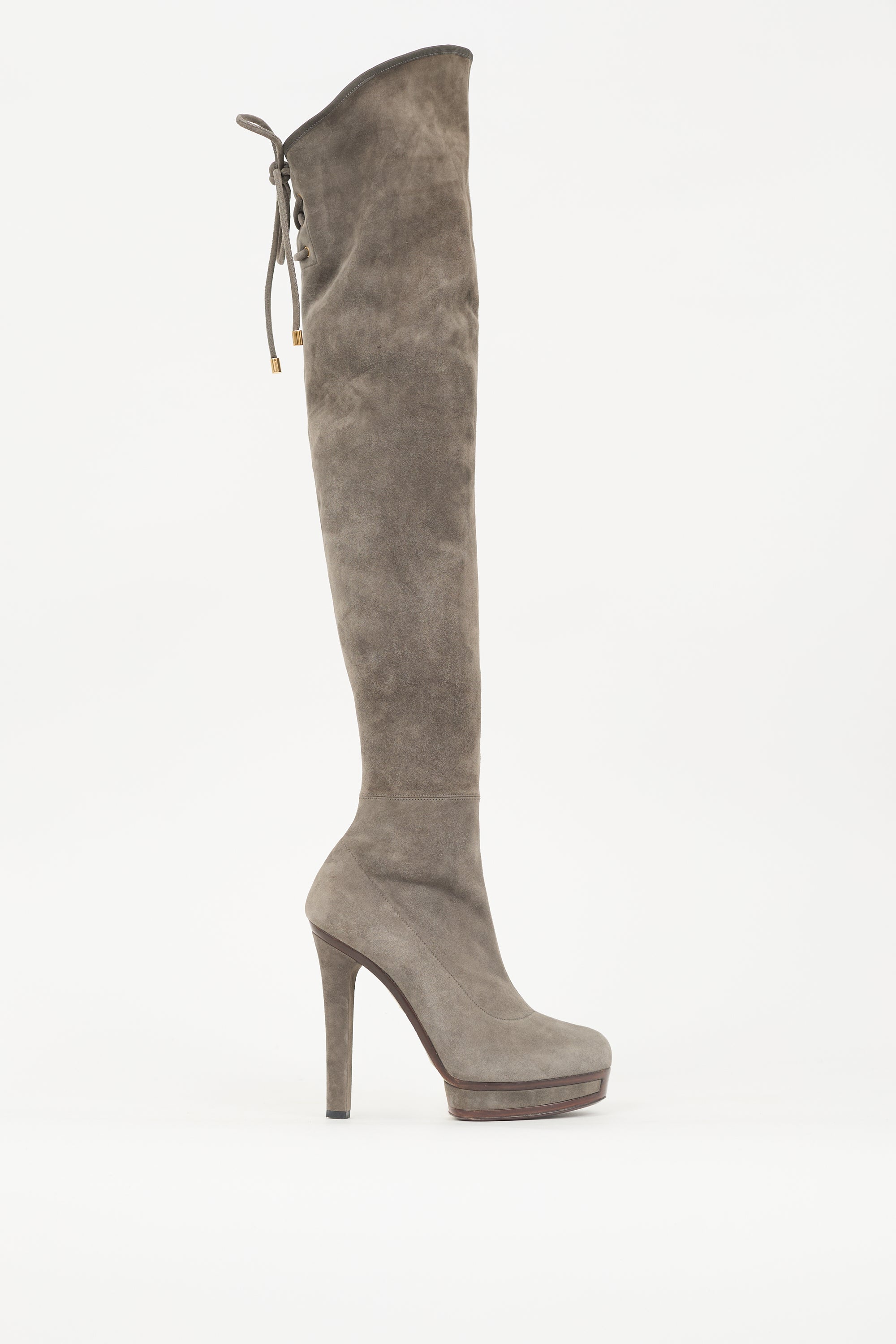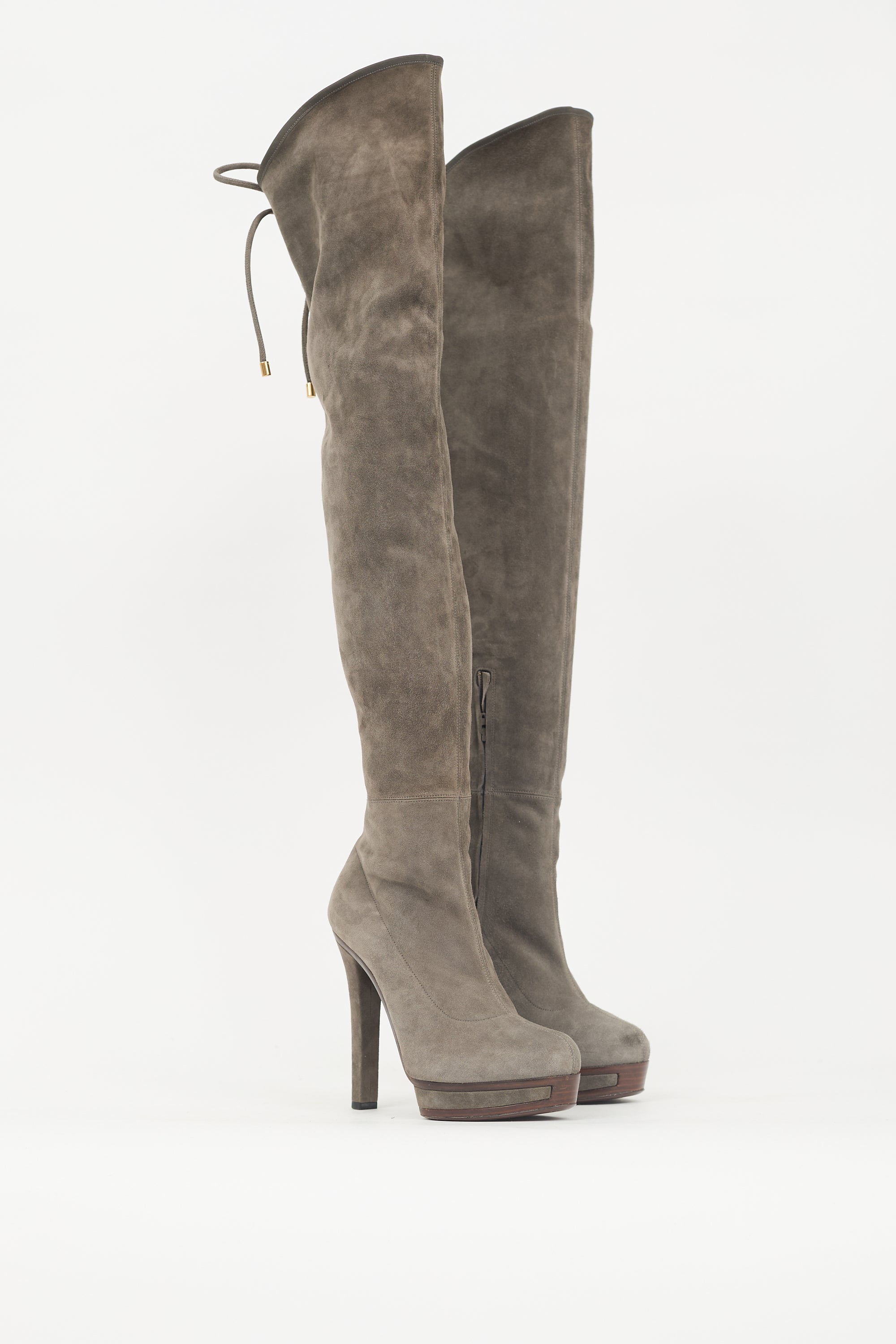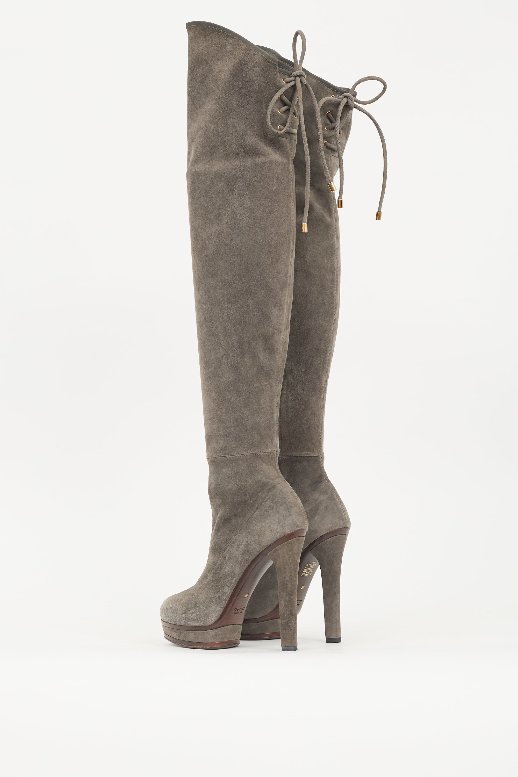 Pre-owned Gucci grey suede over the knee boots featuring a rounded toe, platform midsole, side zip, lace up detail at collar, pull on entry, and covered continental heel.