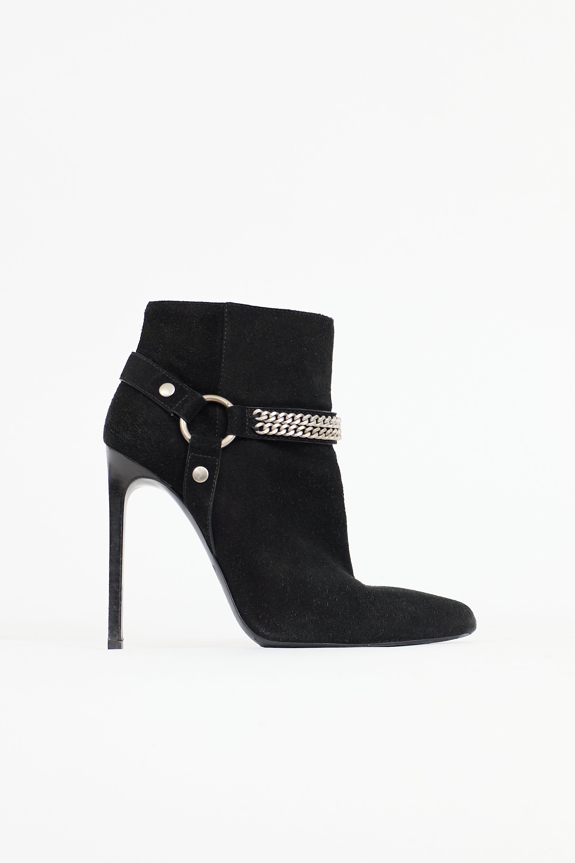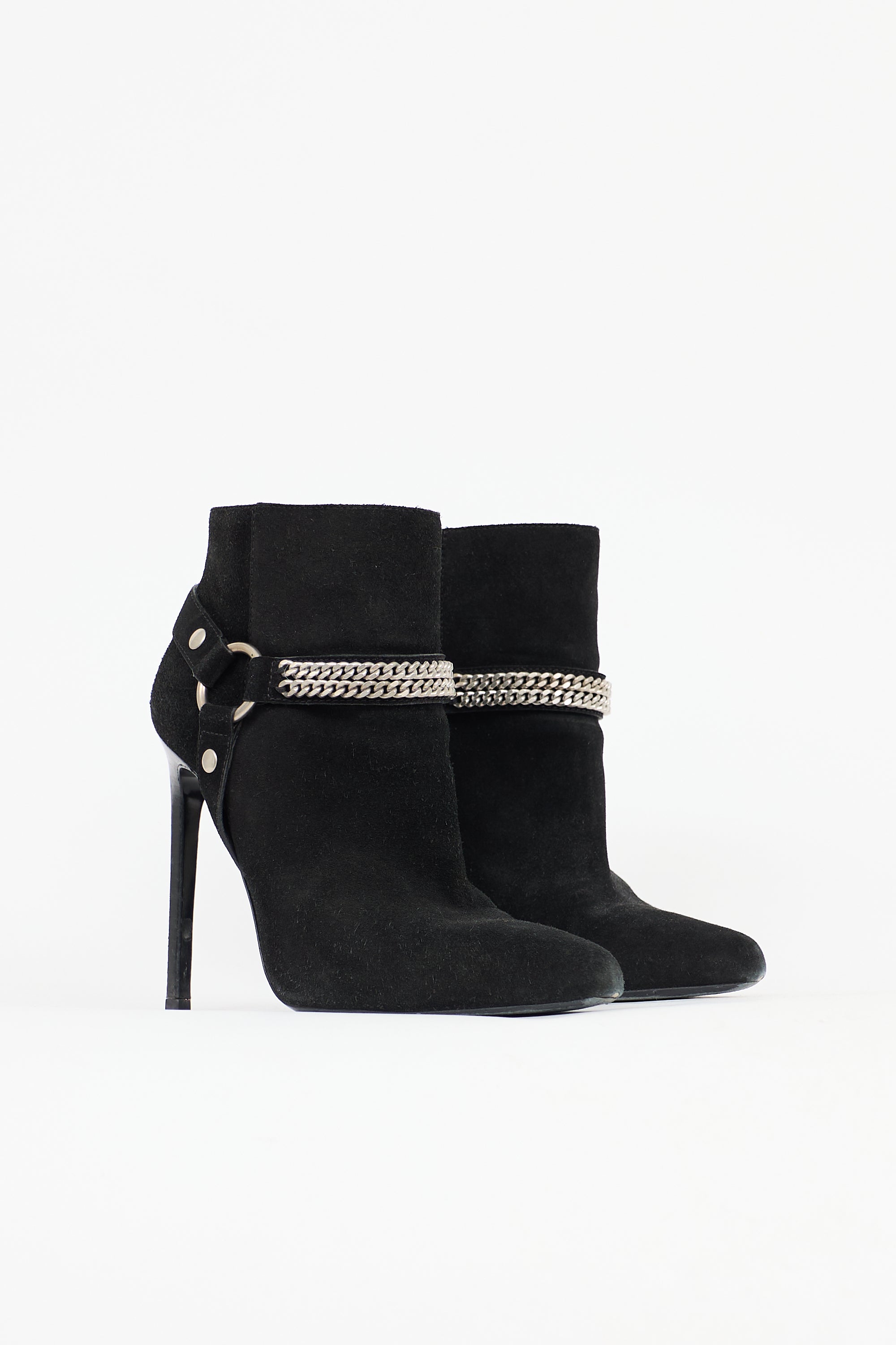 Pre-owned Saint Laurent black suede ankle boots featuring a pointed toe, wrap around strap at instep with silver tone grommets and chainlink, inner zip closure, and a stacked stiletto heel.