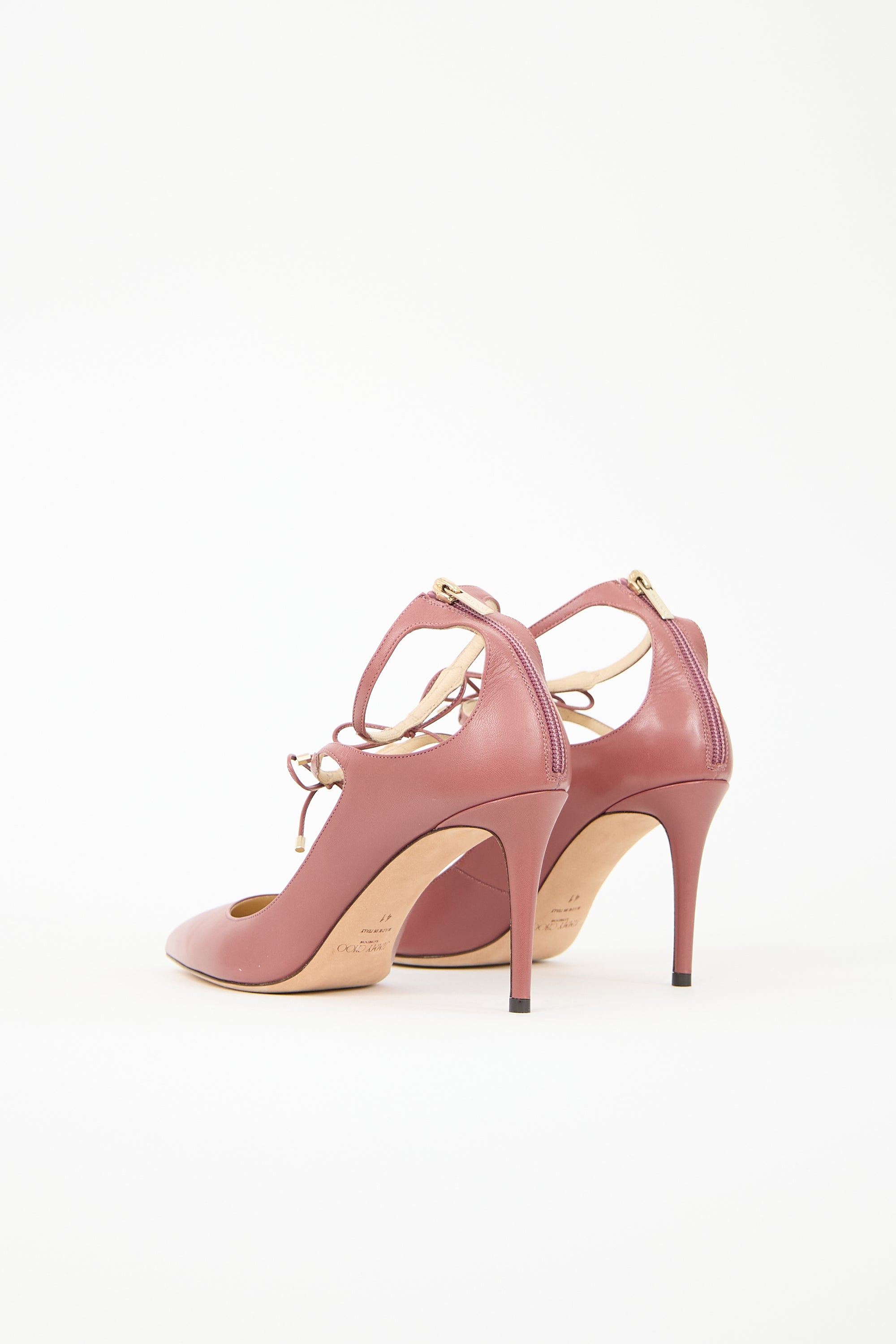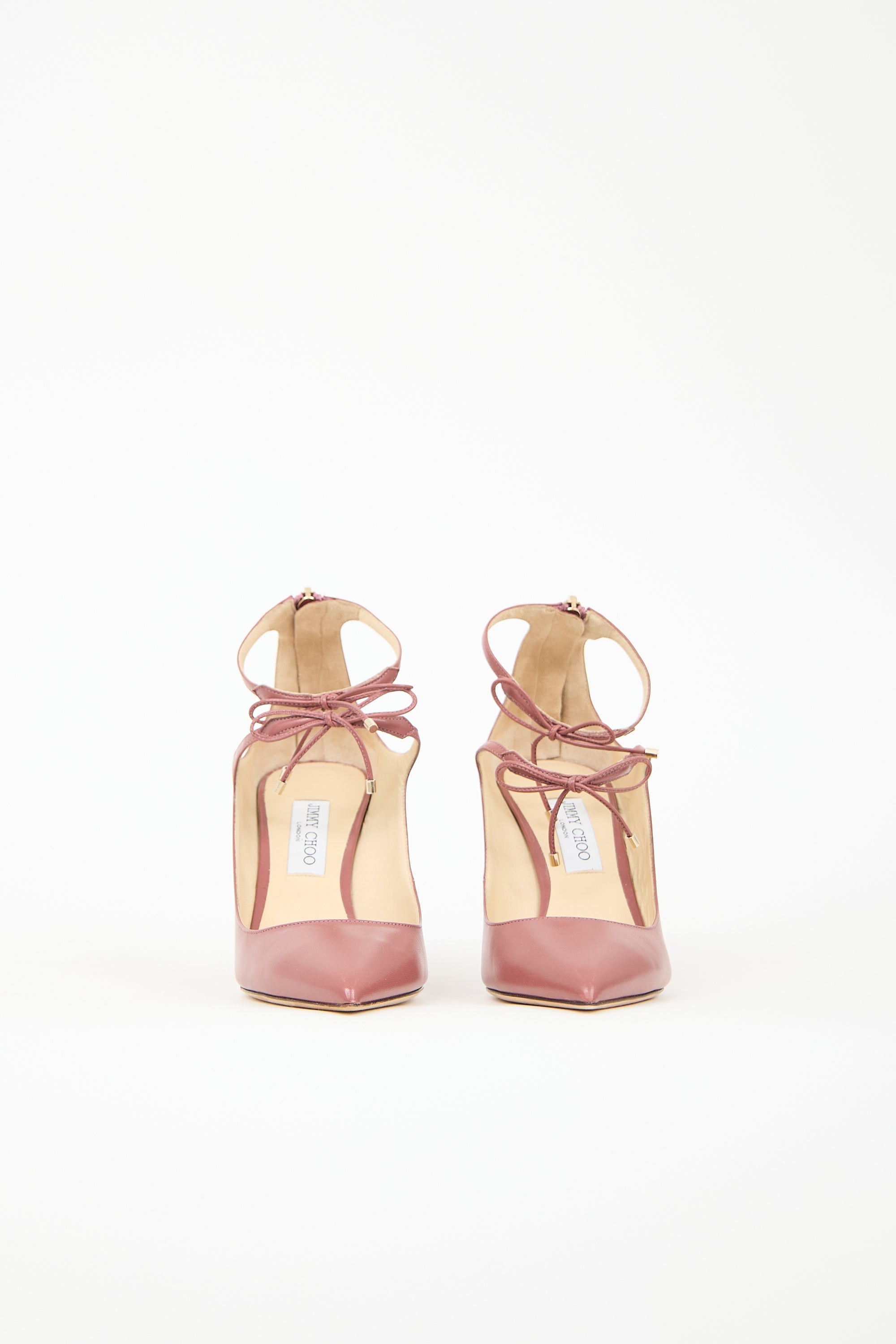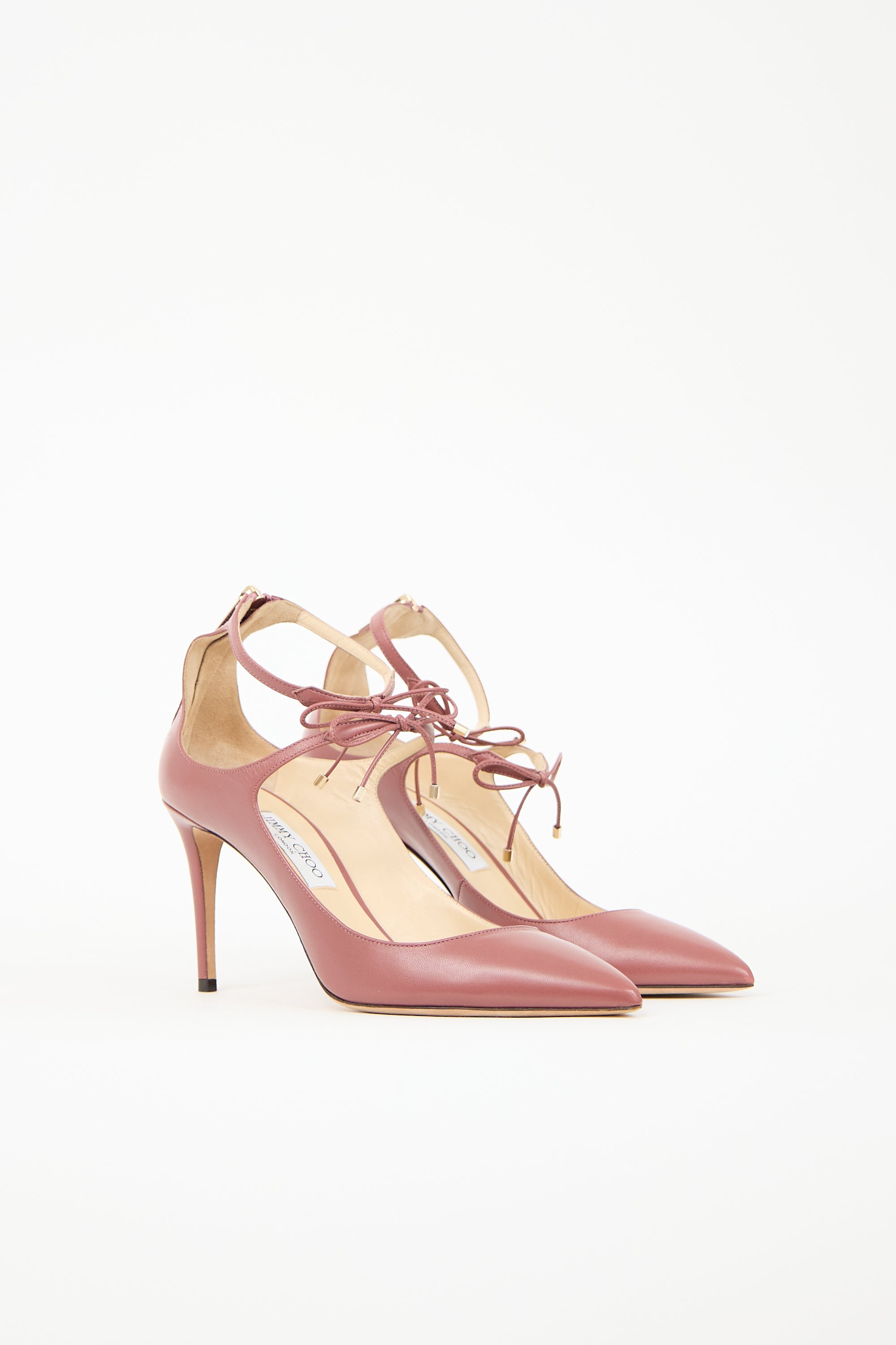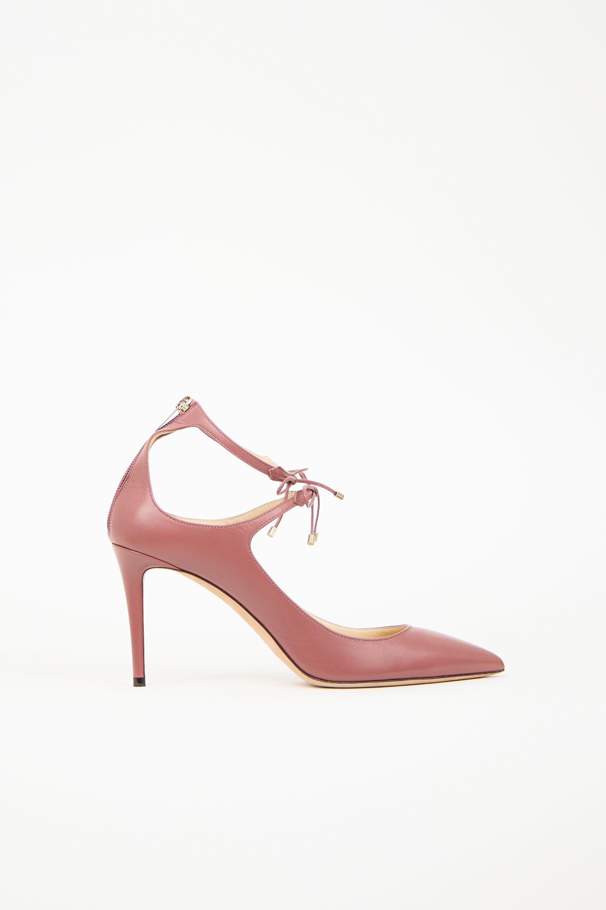 Pre-owned Jimmy Choo dusty pink leather Sage heels featuring pointed toe, decorative bow straps across ankle and front, zip closure at counter, and stiletto heel. Original box and dust bag included.