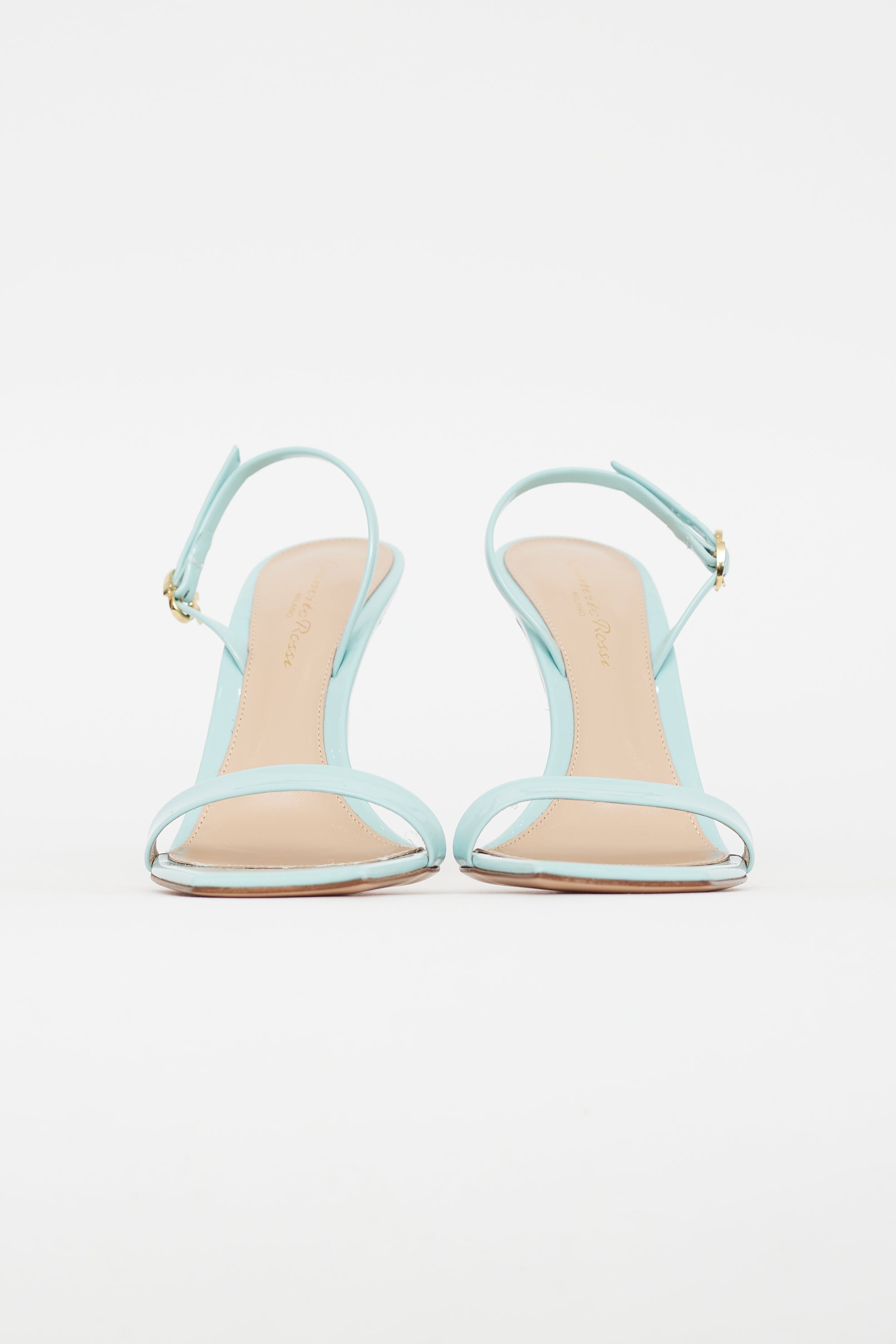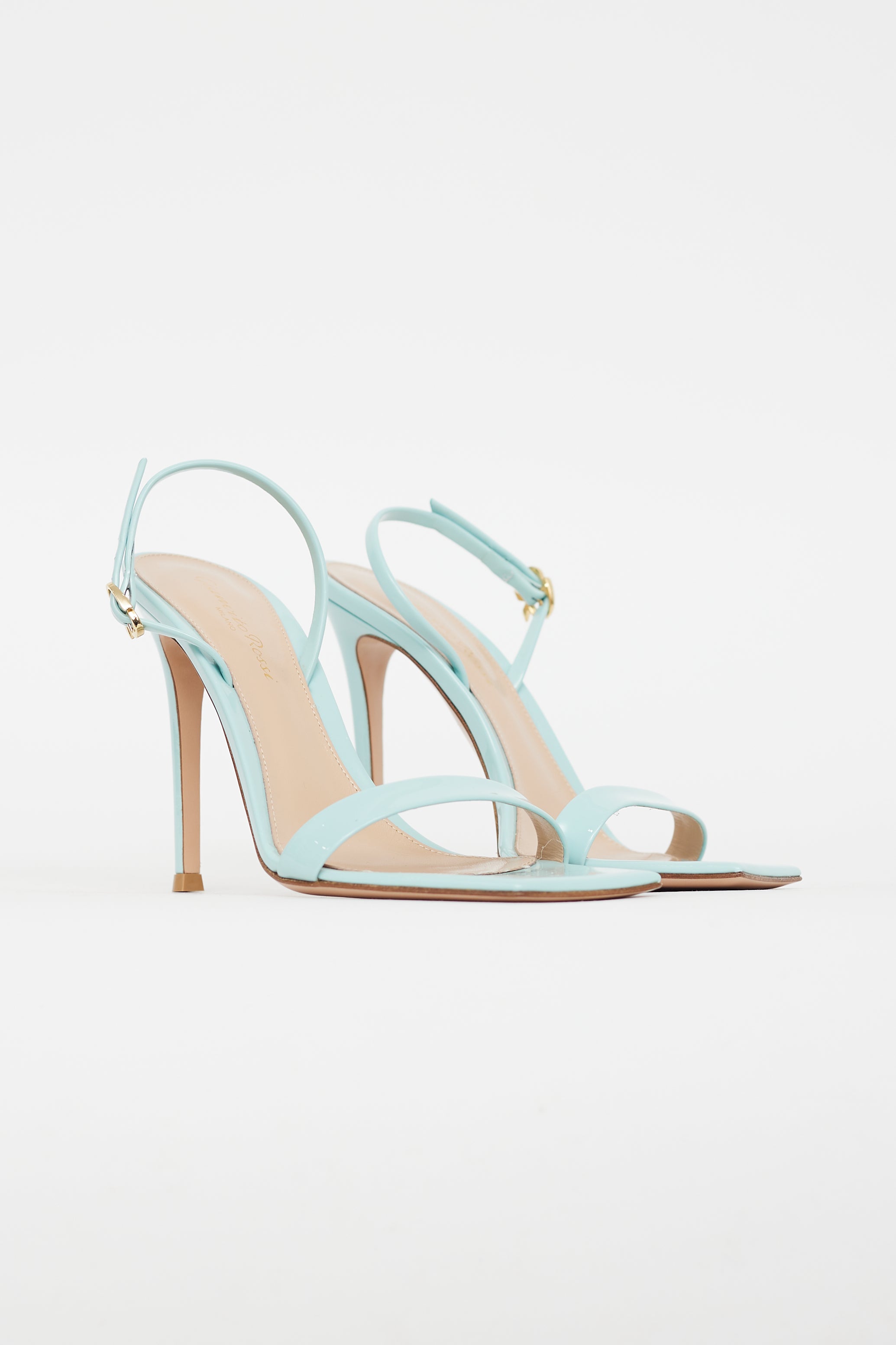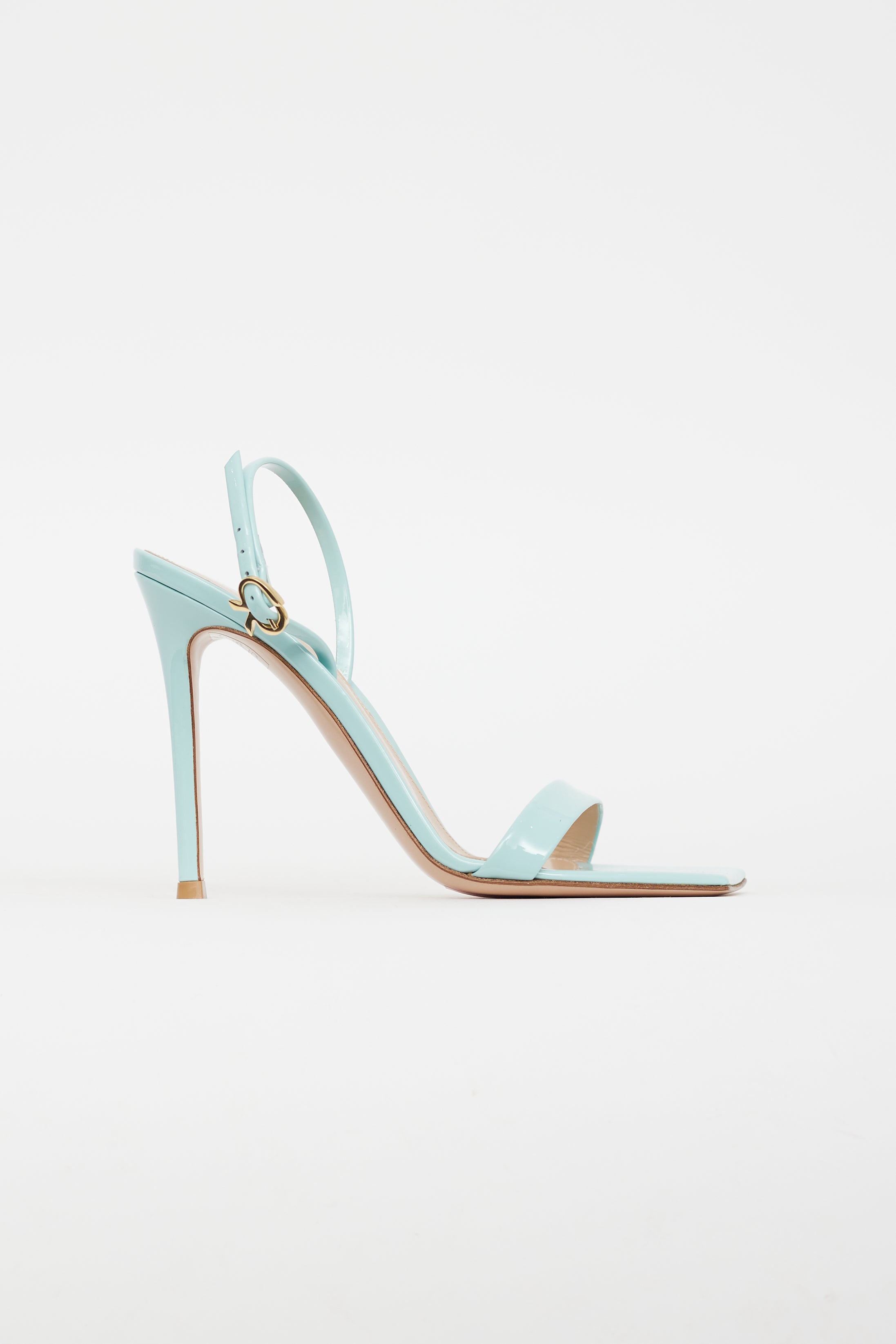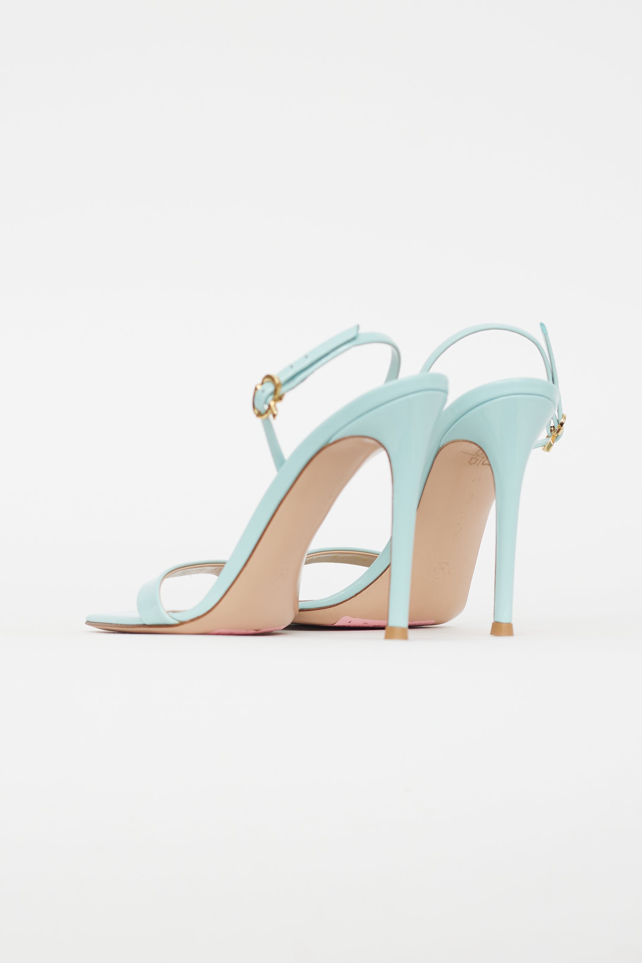 Pre-owned Gianvito Rossi teal patent leather heels featuring square toe, covered stiletto heel, adjustable strap with gold tone buckle at ankle, and leather insoles. Comes with original dust bag.