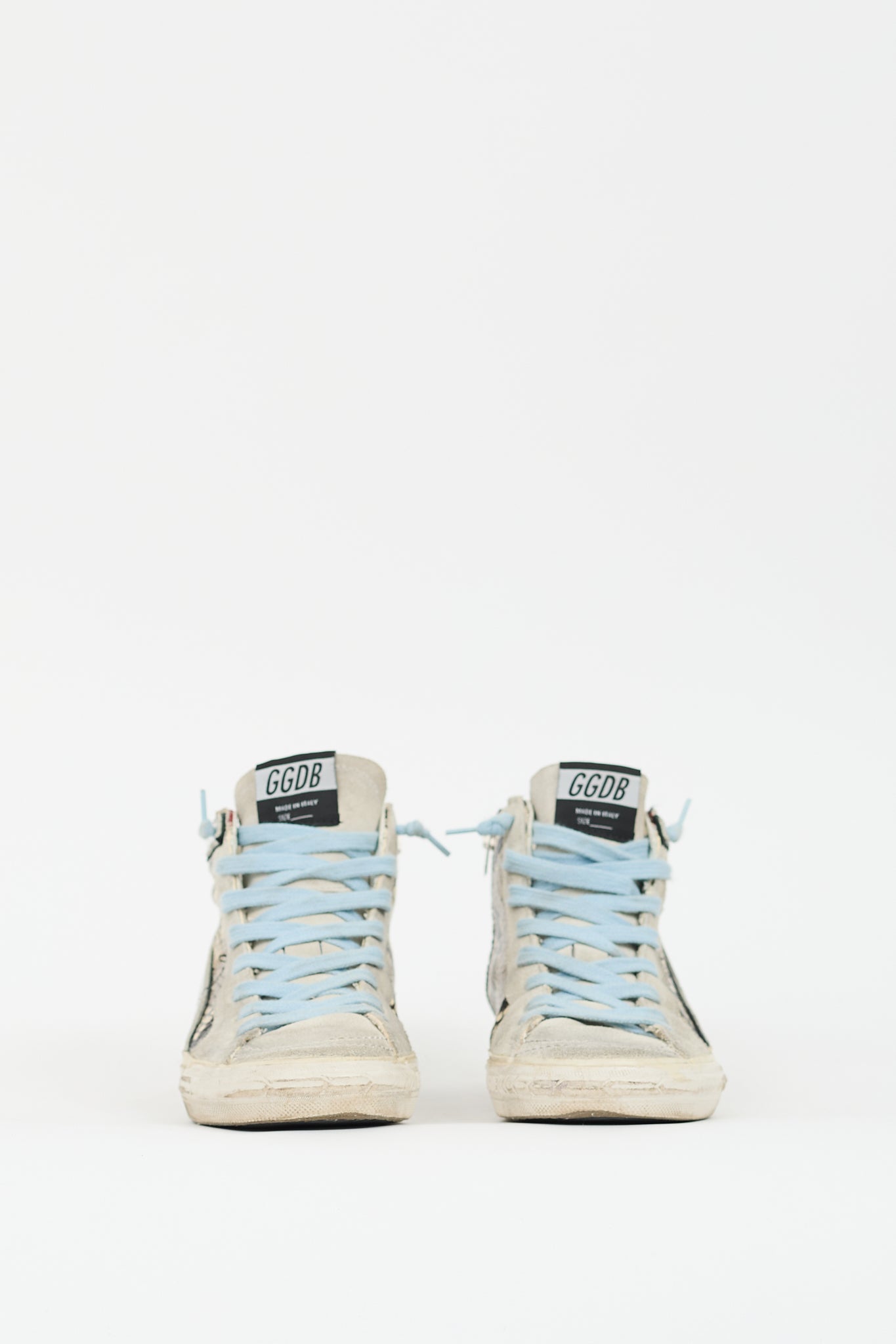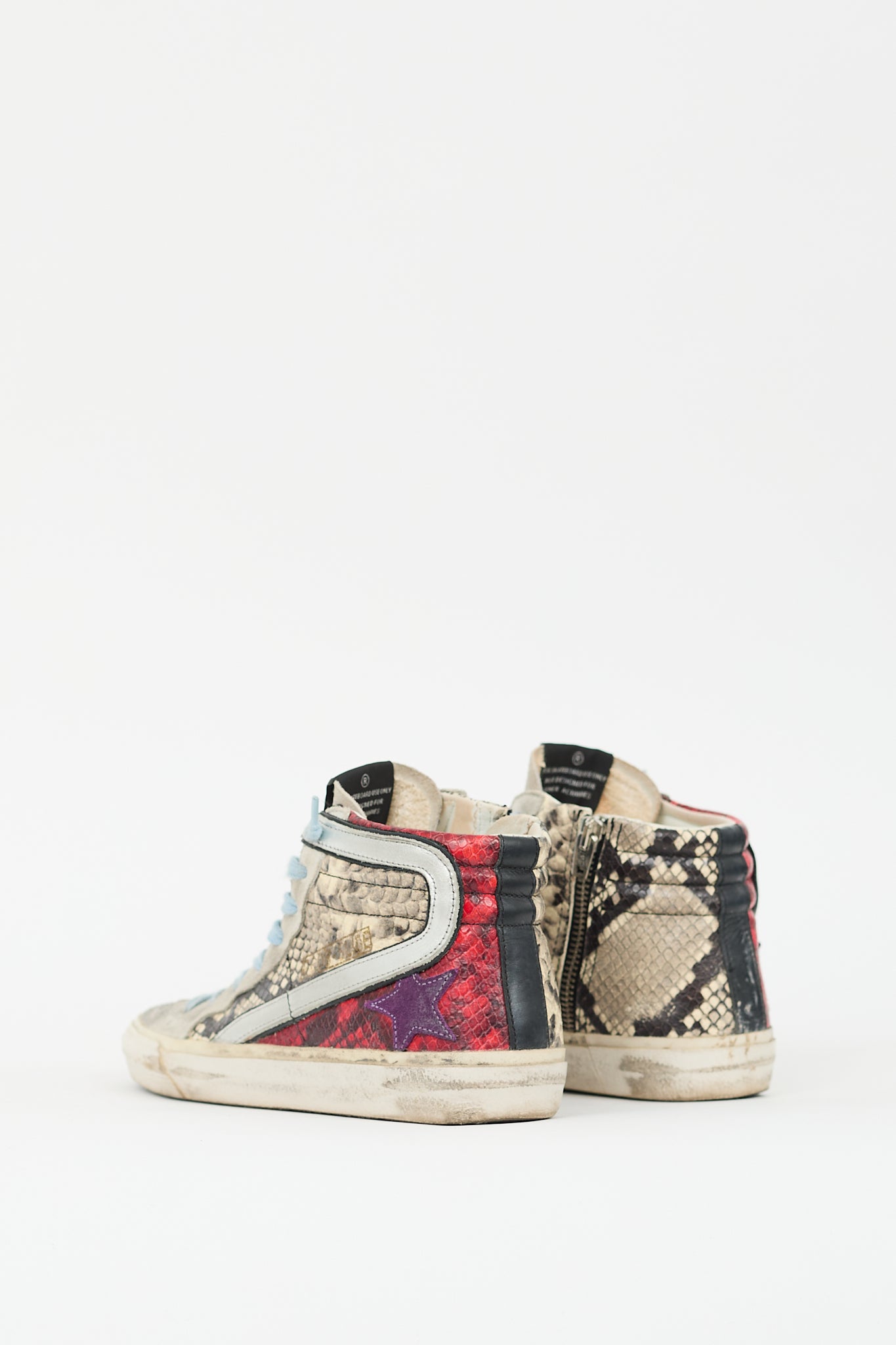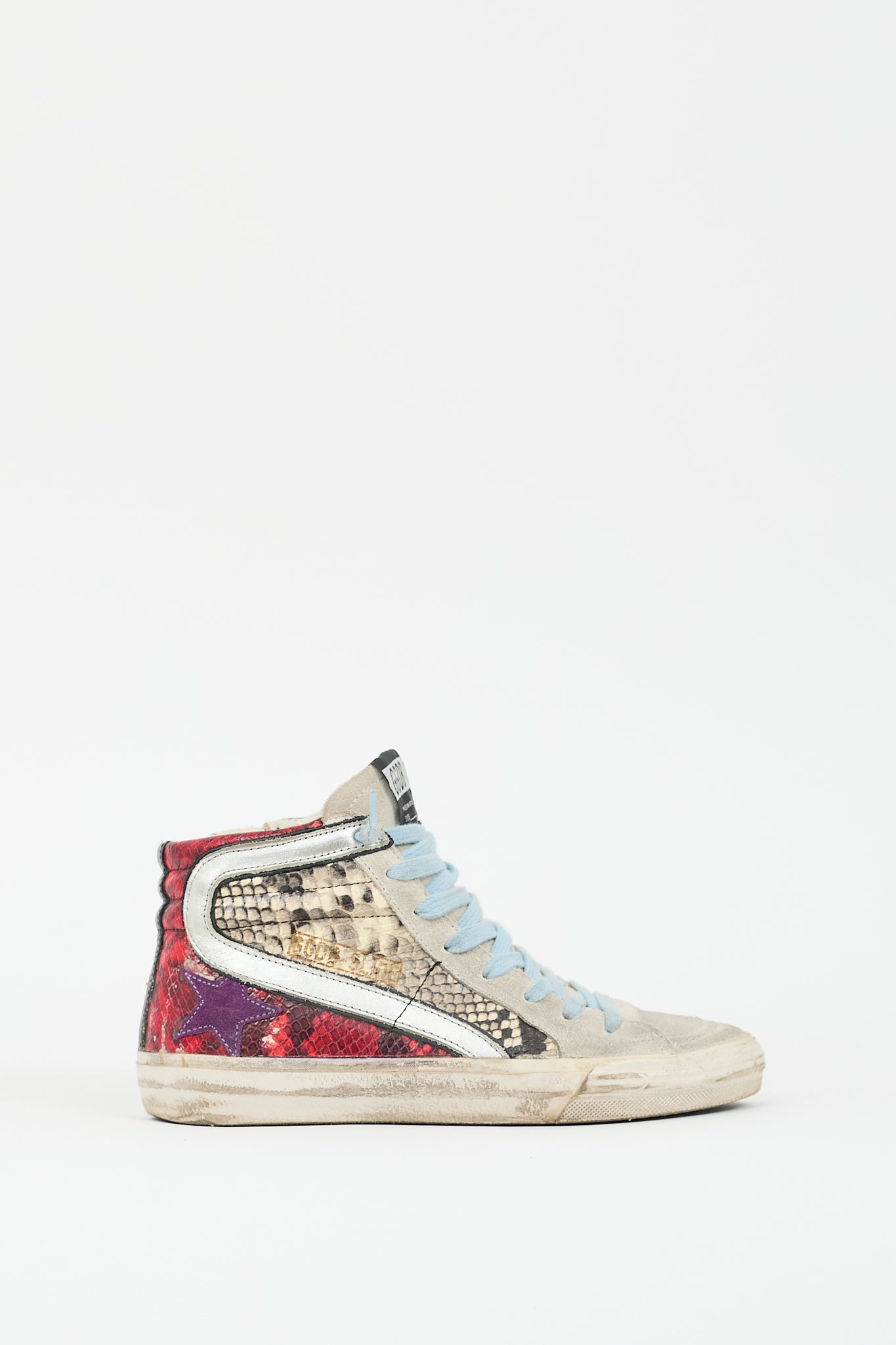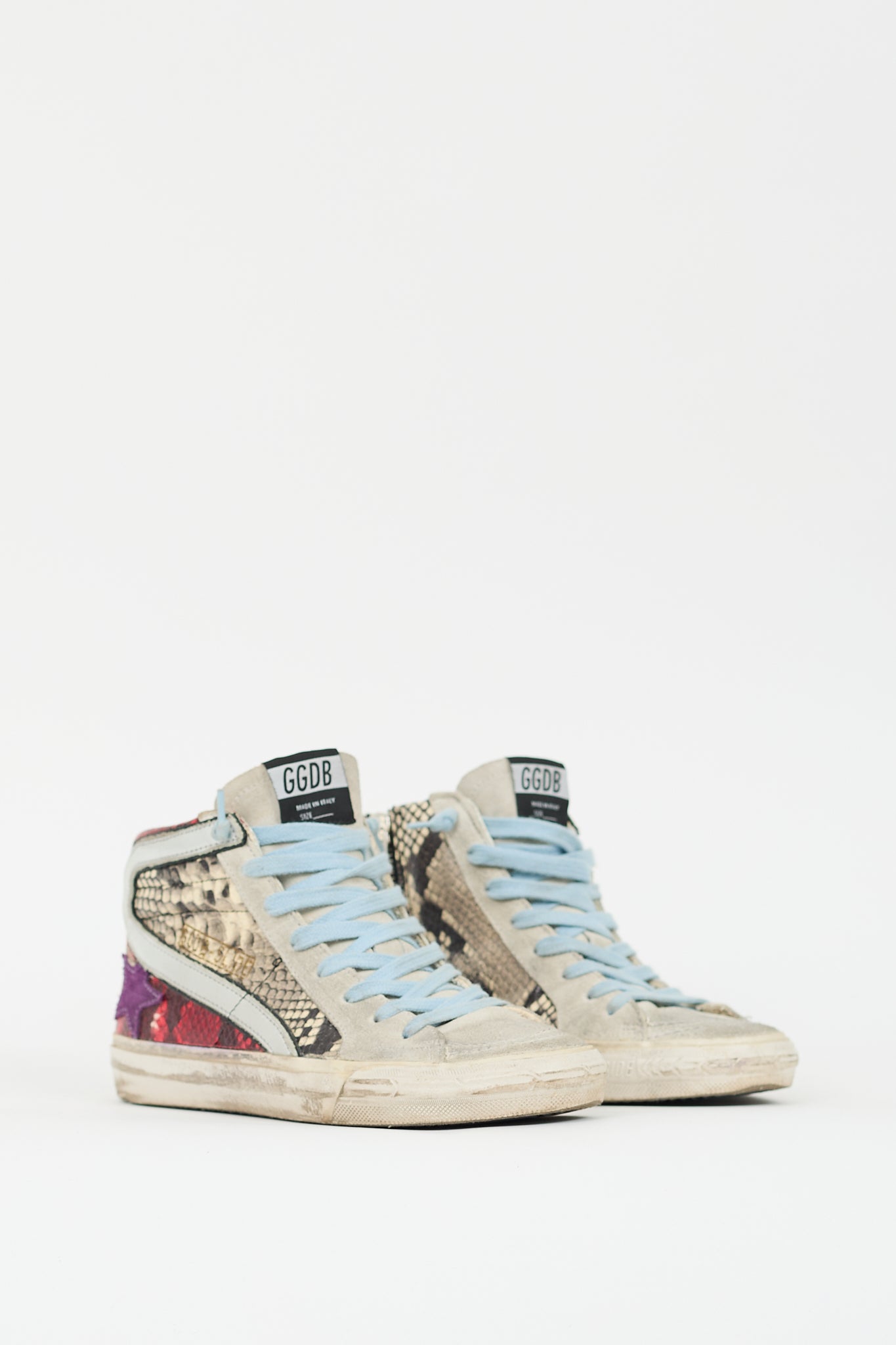 Pre-owned Golden Goose beige Slide sneakers featuring intentional distressing throughout, rounded toe, suede panelling, multicolour snakeskin effect leather, intentional distressing, blue lace up front, metallic silver panelling throughout, purple star appliqué, inner zip closure and rubber sole.