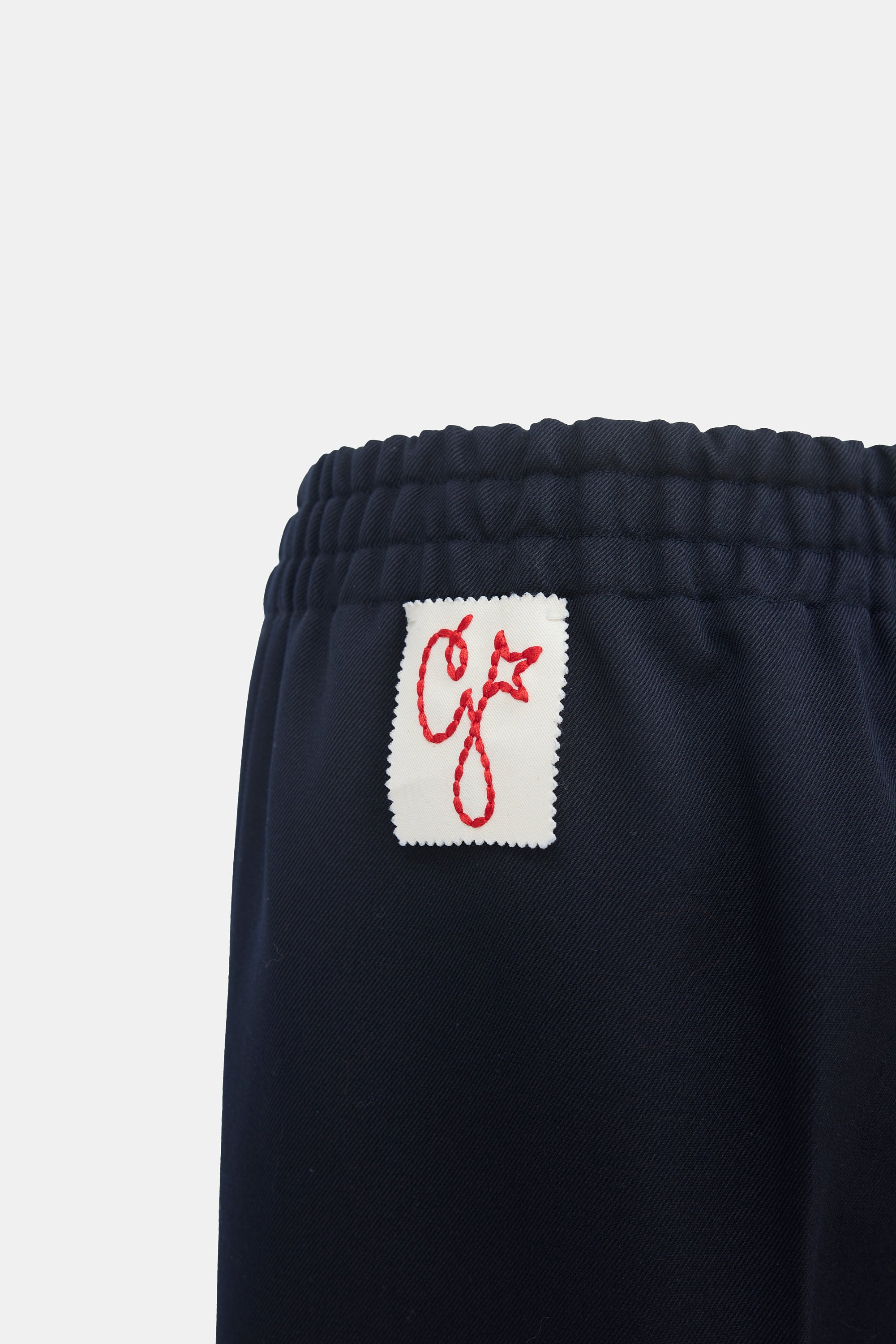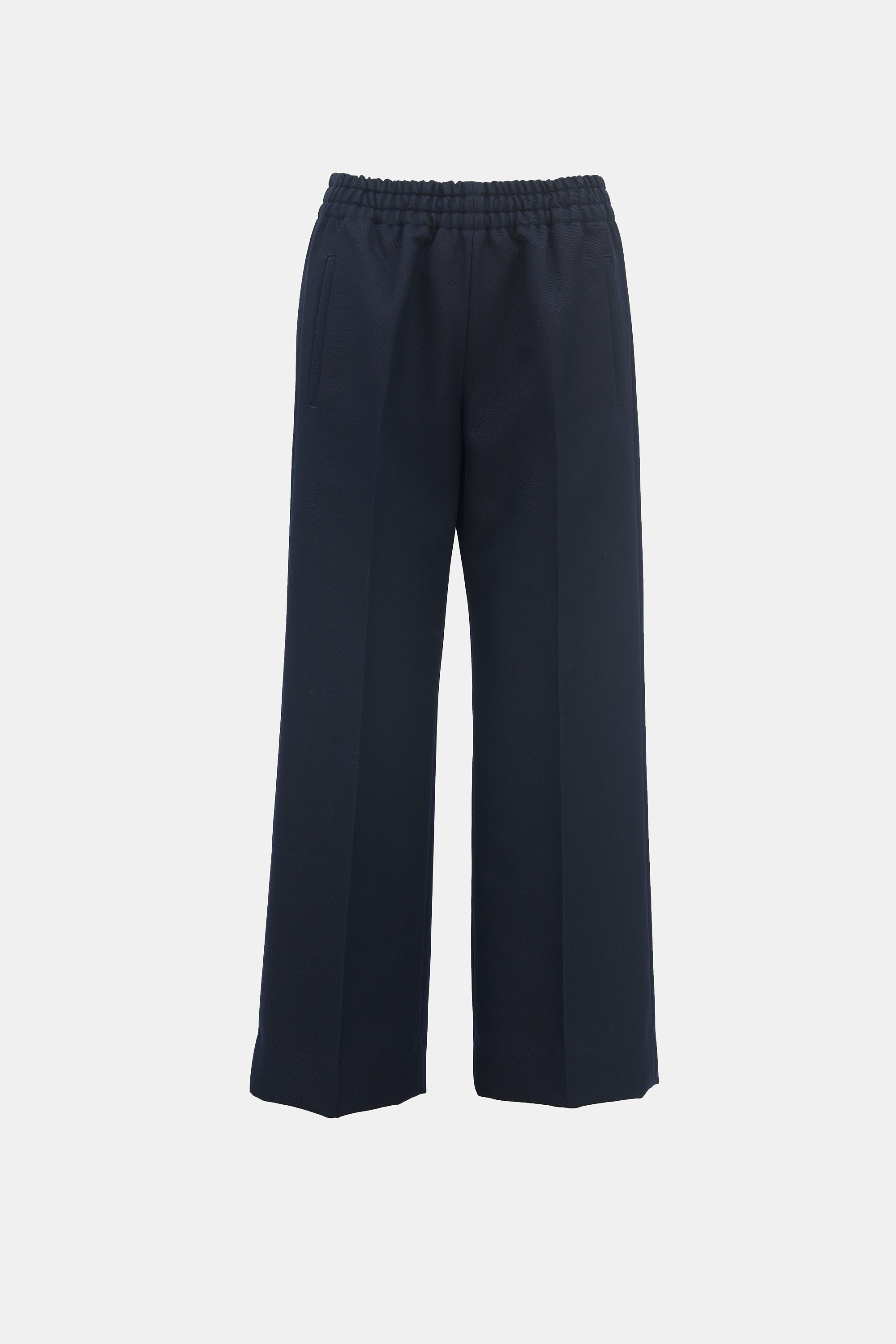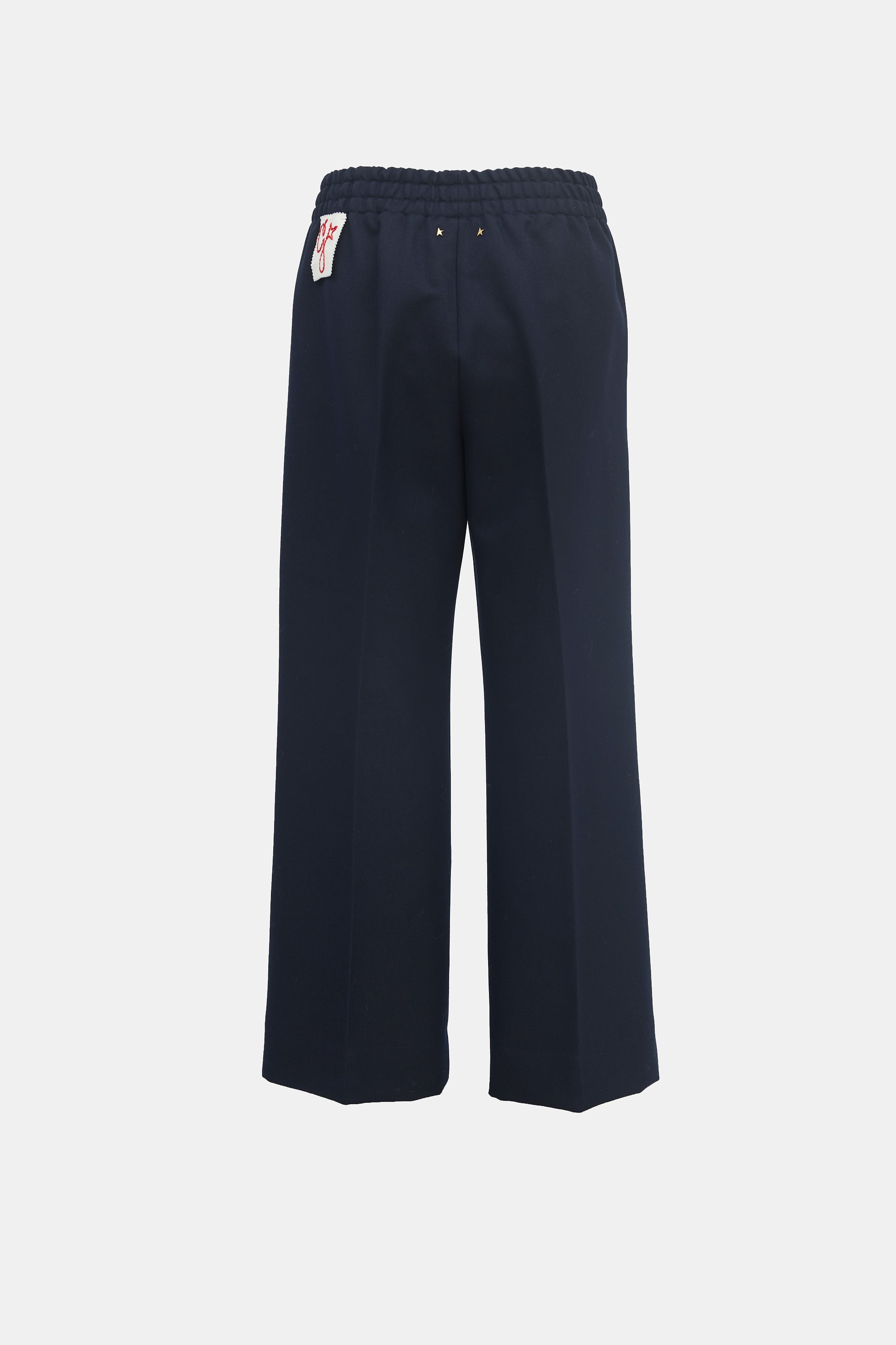 Pre-owned Golden Goose navy high waist trouser featuring an elasticized waistband, two welt pockets at front, logo patch at back waist, and pressed seams at a straight leg.