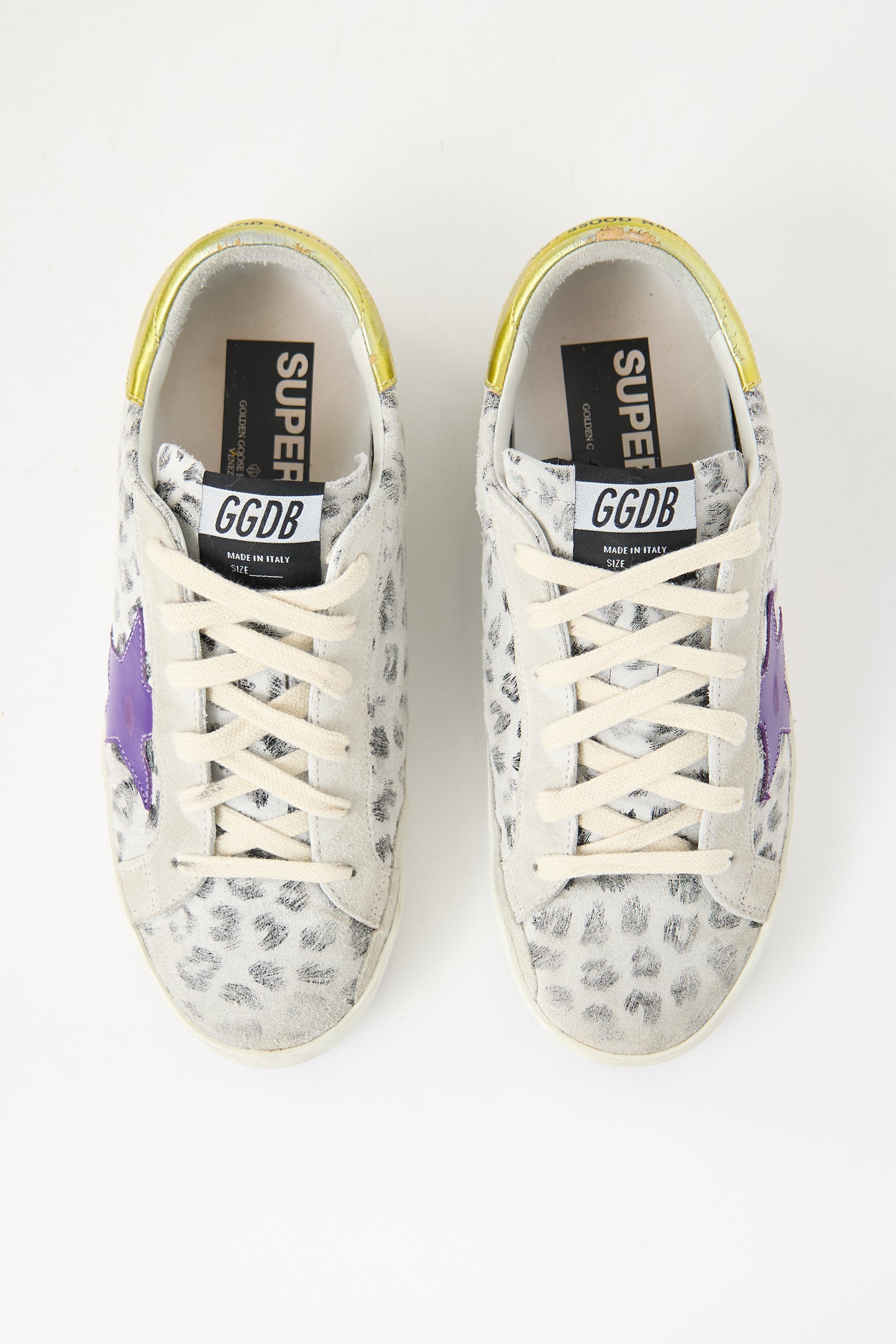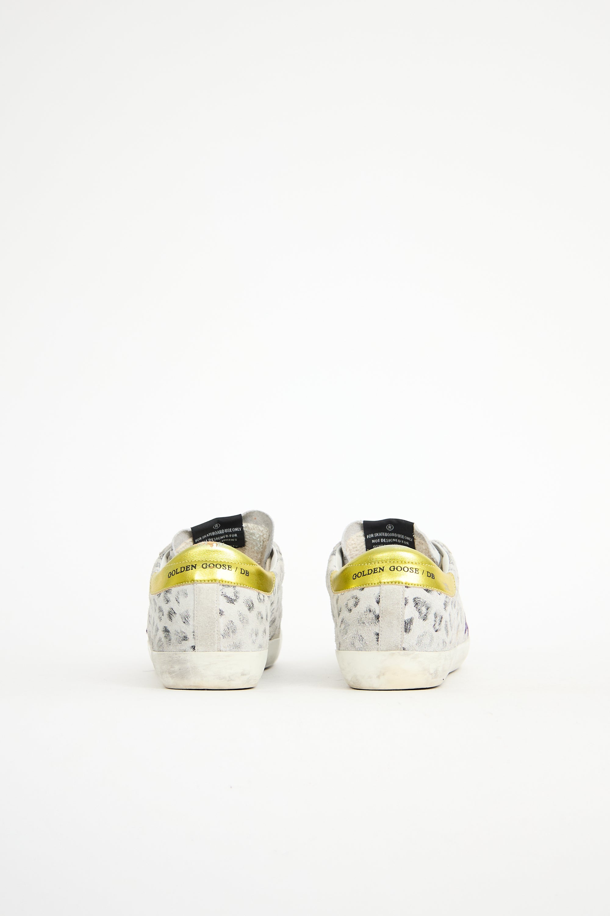 Pre-owned Golden Goose grey suede Superstar sneakers featuring rounded toe, black leopard print, lace up vamp, label at tongue, purple leather signature star patch at outer side, yellow metallic leather counter panel with printed logo, rubber sole, and distressing.