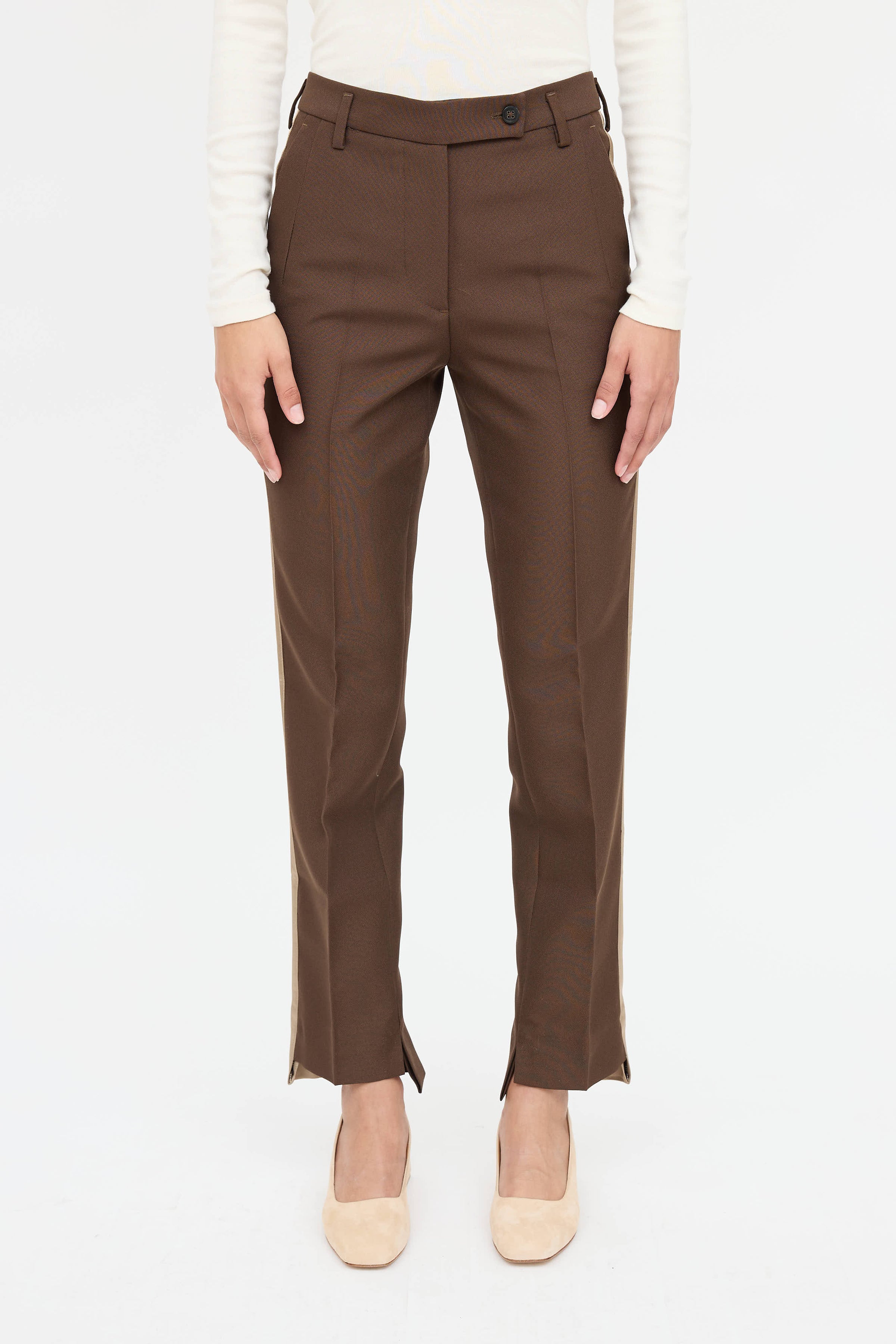 Pre-owned Golden Goose brown trousers featuring two slip pockets at hip, two welt pockets at back, satin tuxedo stripe at sides, tapered leg, and zip fly with hook and eye closure.