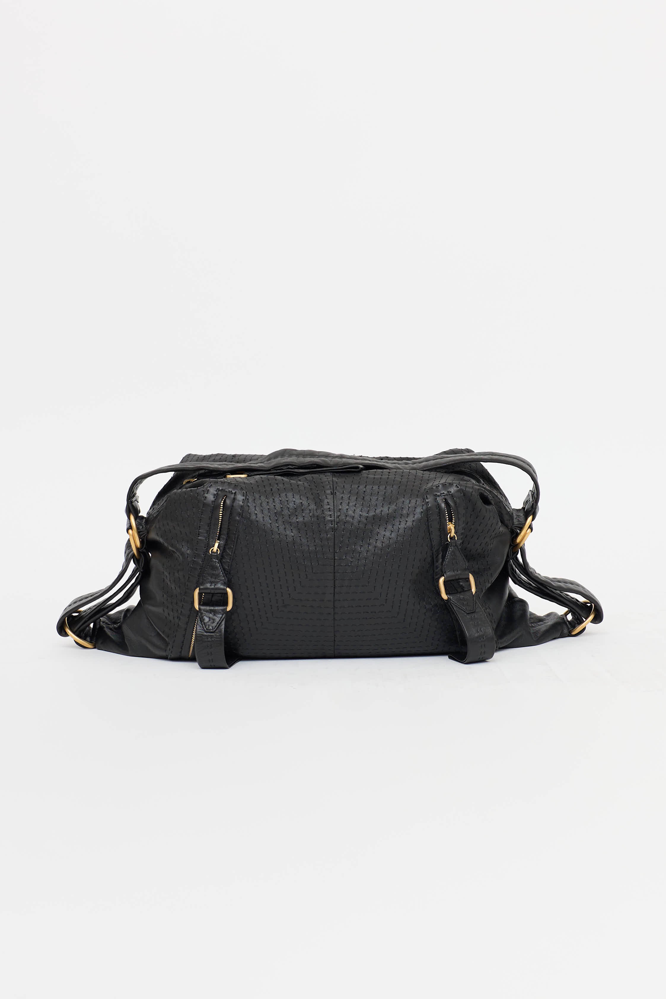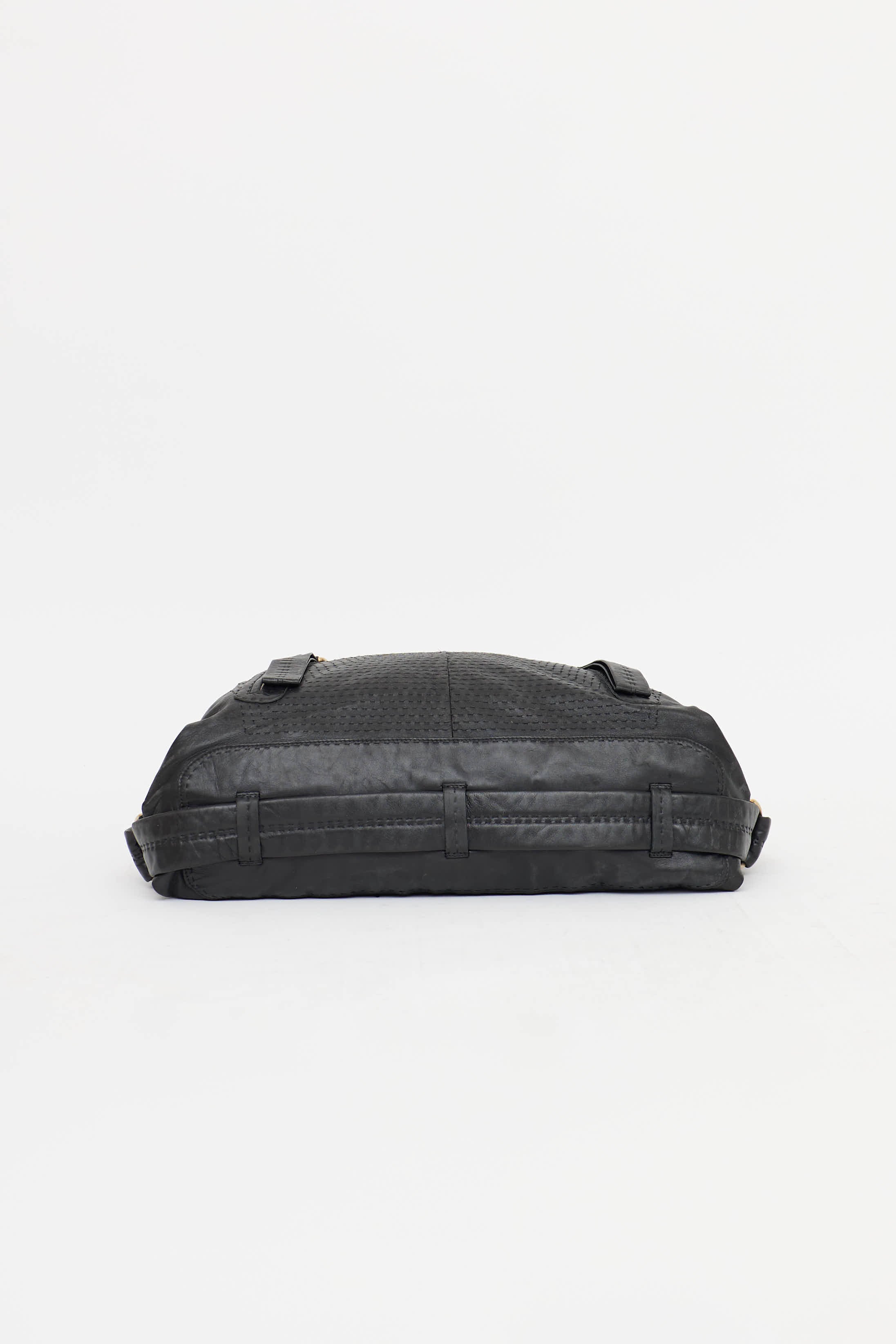 Pre-owned Loewe black leather shoulder bag featuring adjustable flat crossbody strap, tonal stitching throughout, zip pockets at front, top zip closure, one main compartment with two slip pockets, and one zip pocket.