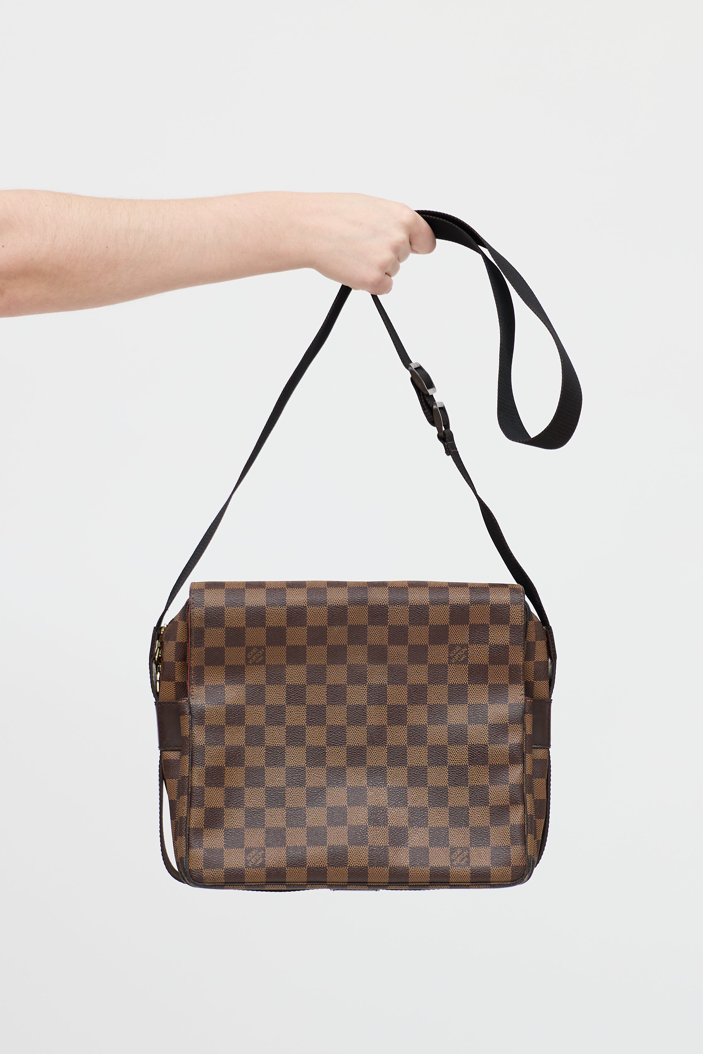 Pre-owned Louis Vuitton 2003 brown Naviglio bag in Damier Ebene coated canvas featuring an adjustable webbed logo shoulder strap, one main compartment with one slip pocket, two slip pockets at front and back, gold tone hardware, and top zip with flap closure.