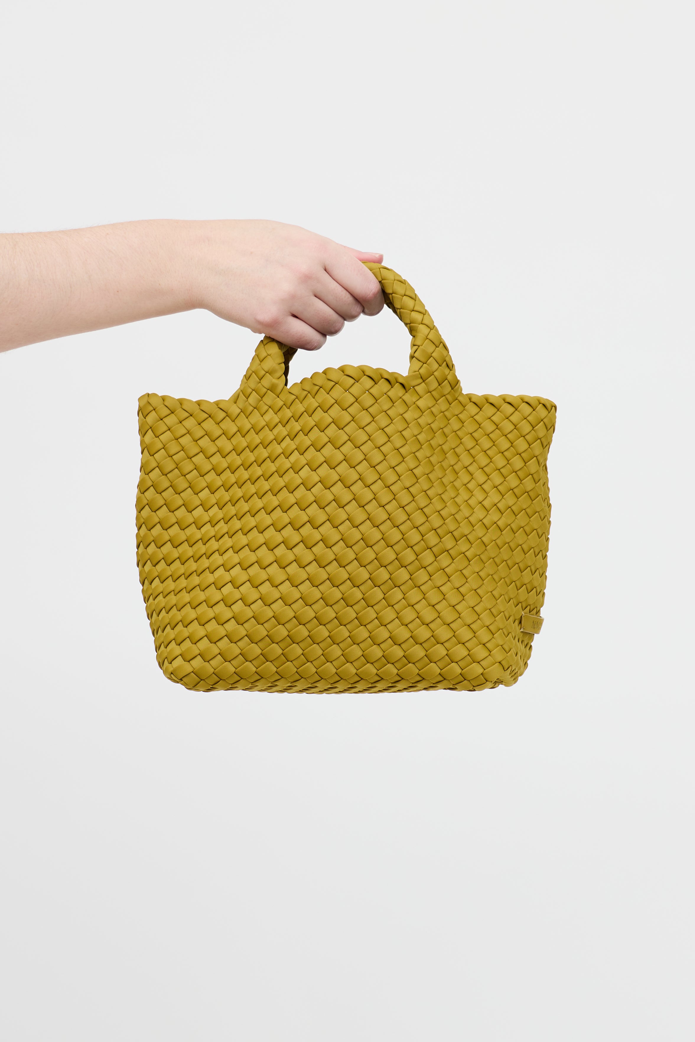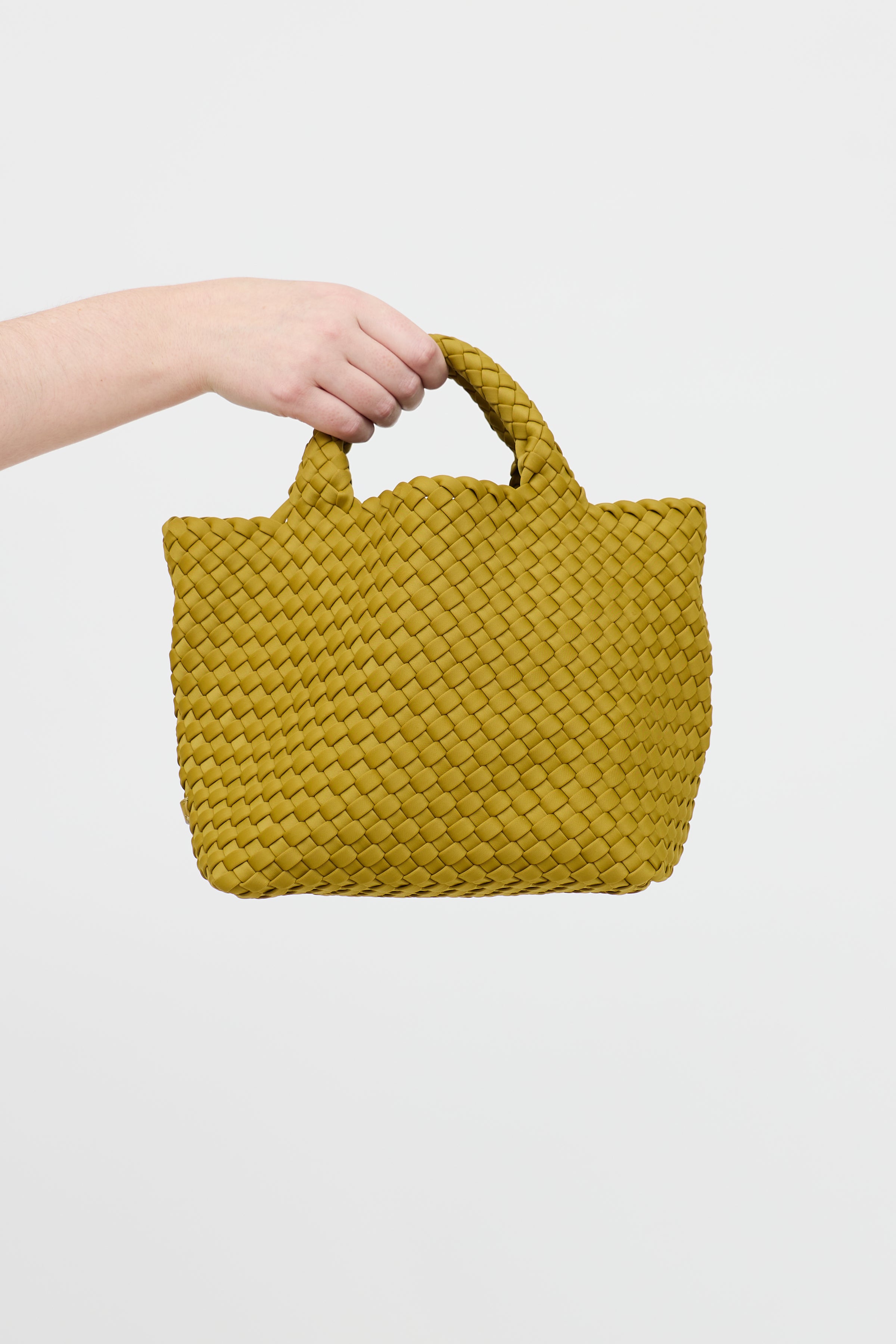 Pre-owned Naghedi green woven St.Barths' tote bag featuring detachable webbed crossbody strap, dual rolled top handles, open top, and one main compartment.