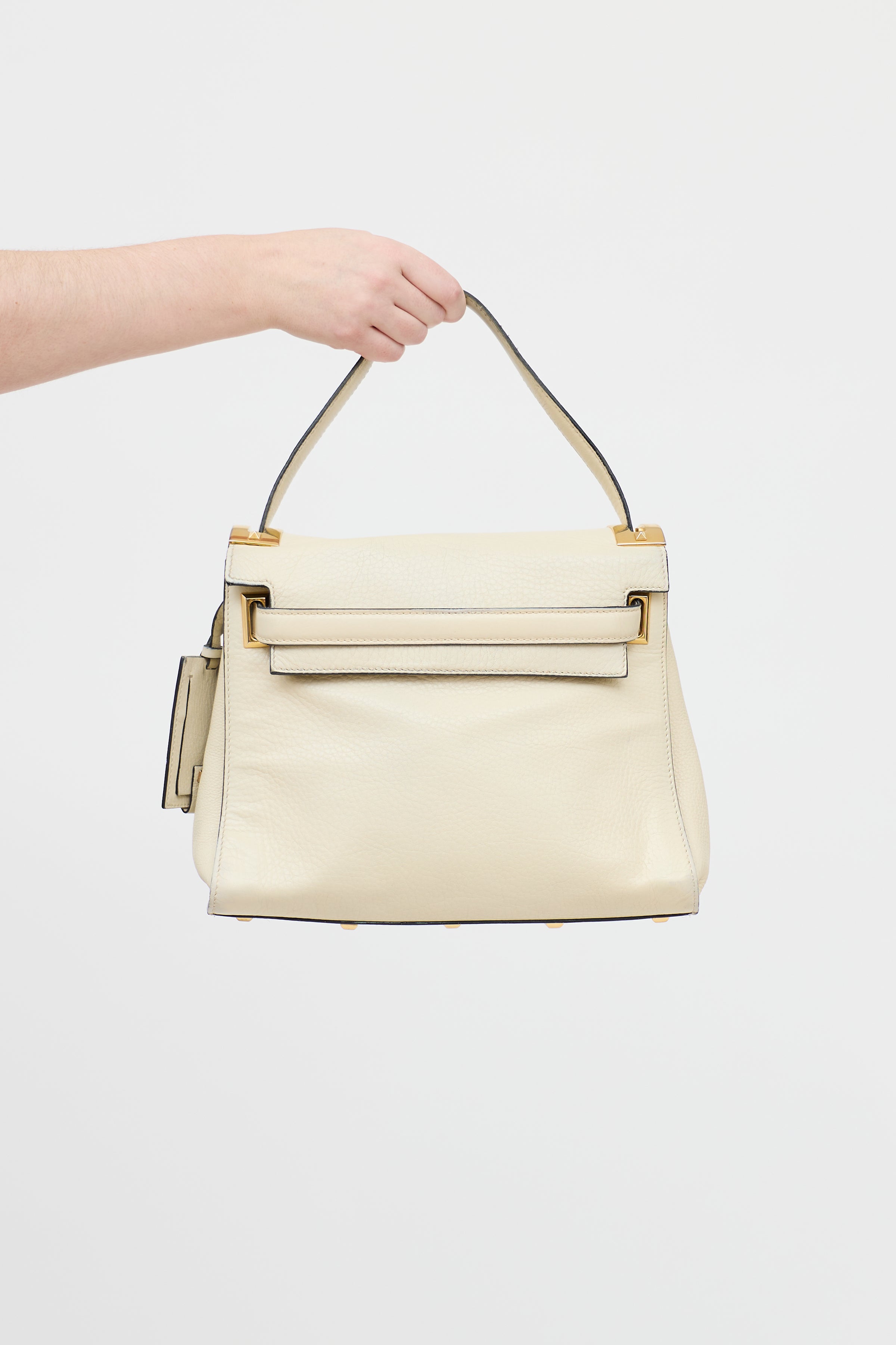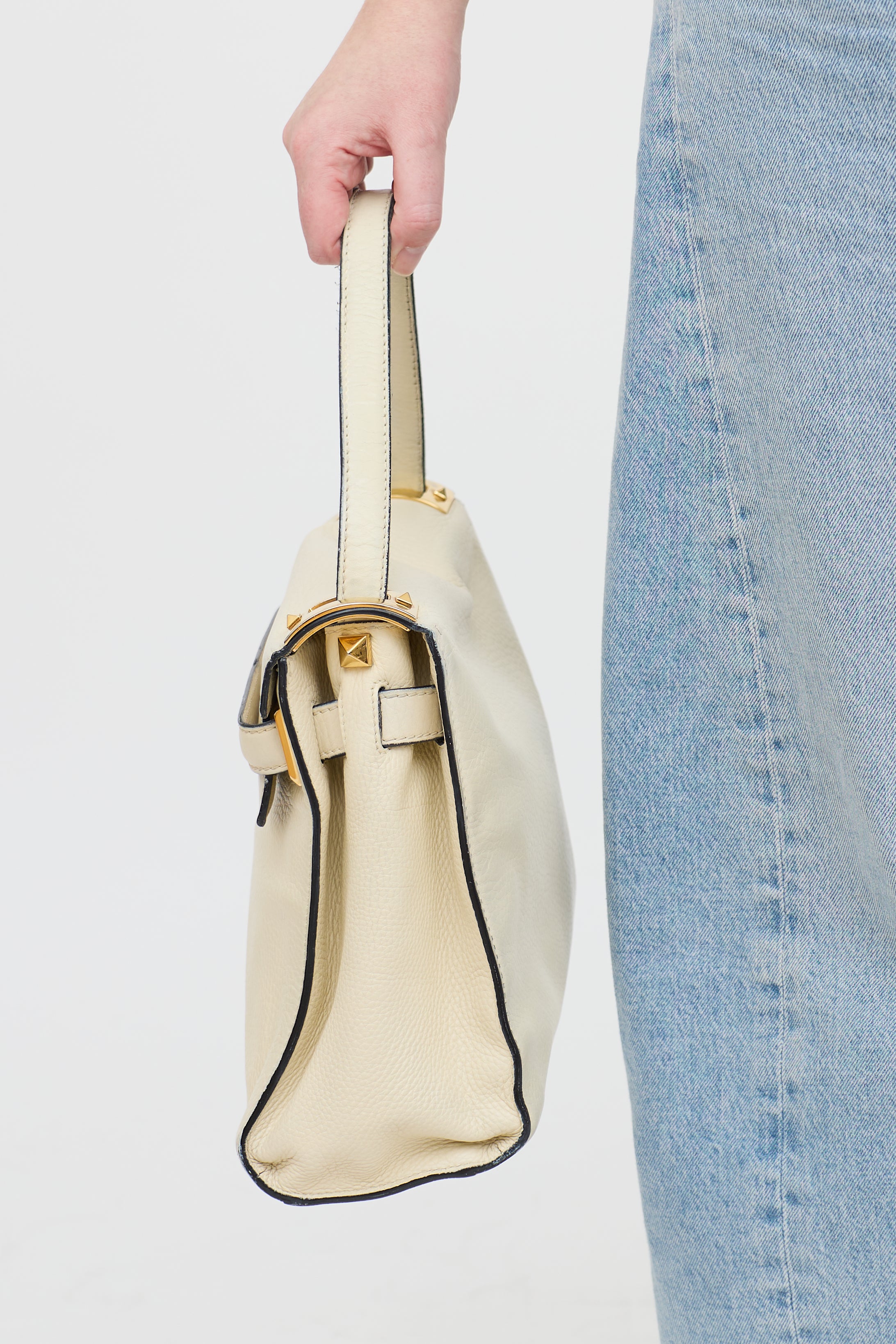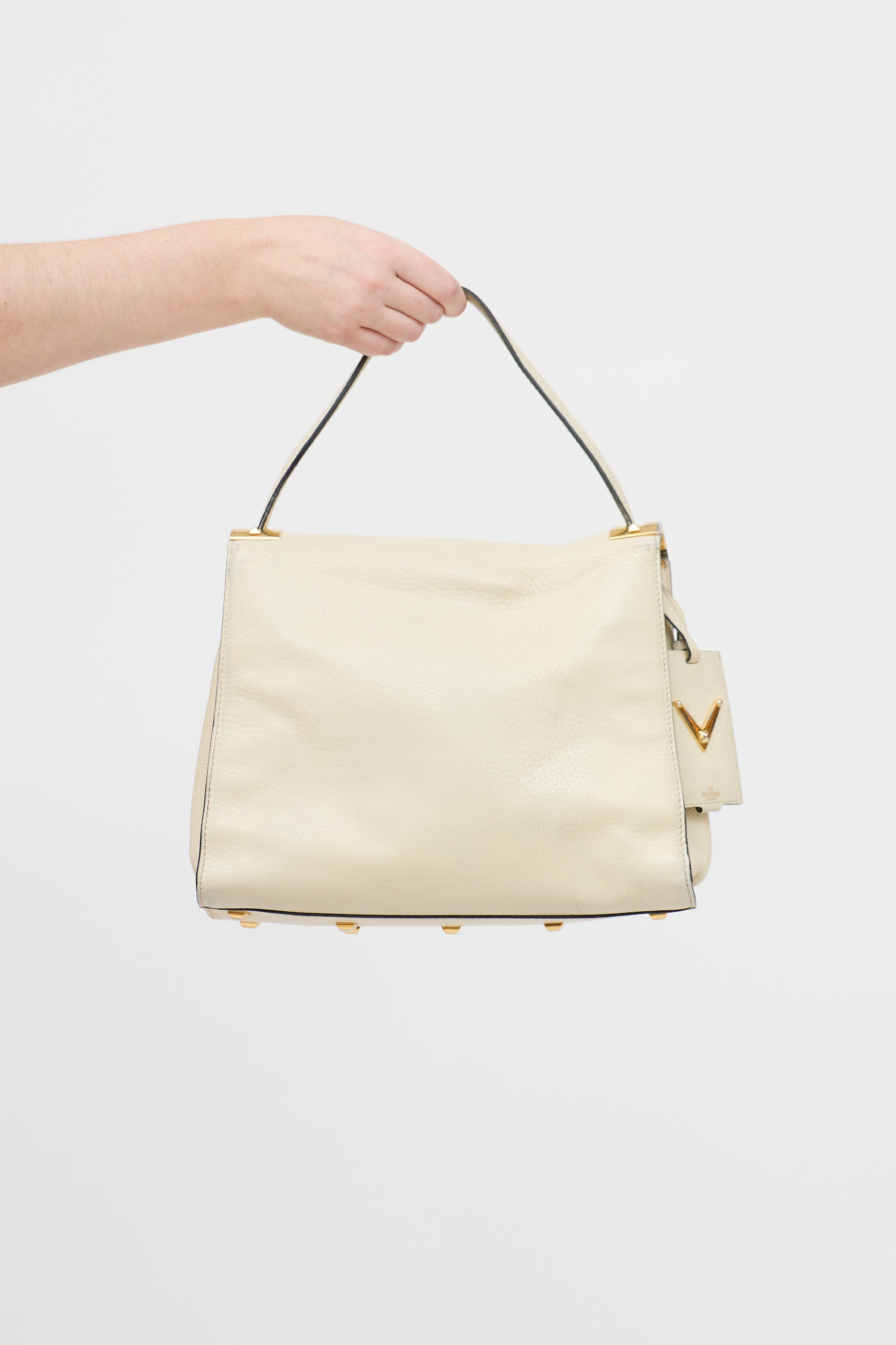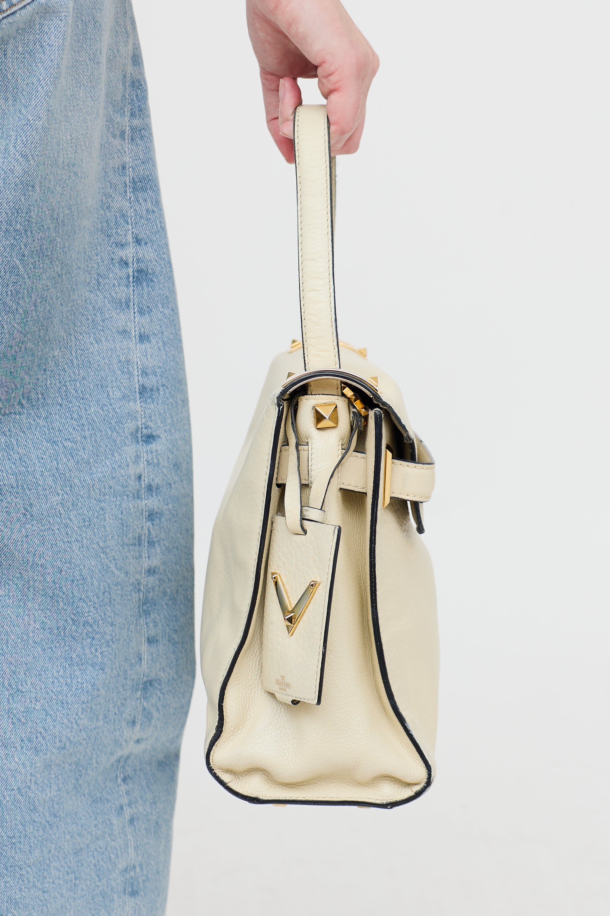 Pre-owned Valentino cream My Rockstud leather tote bag featuring flat leather top handle, gold tone hardware with Rockstud detailing, top flap with magnetic closure, metal feel at base, and removable luggage tag. Interior features suede lining, two flat pockets and one zip pocket.